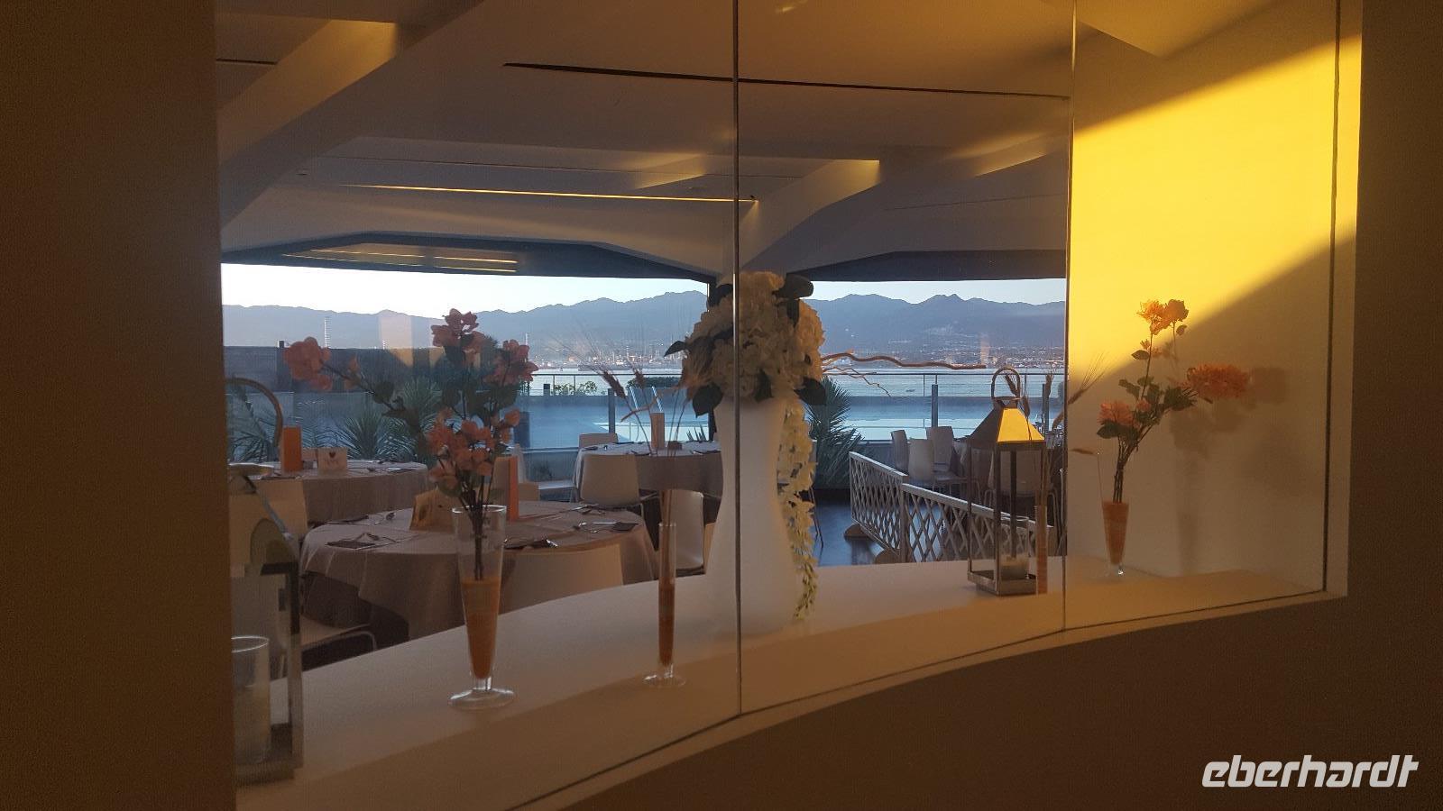 Ebenfalls direkt in der Nähe des Meeres liegt unser drittes Hotel auf dieser Reise, das "Eolian Milazzo". Und erneut ist auch dieses Hotel wieder ganz anders, als die zwei zuvor. Es besticht mit einer modernen, komfortablen Einrichtung und beim Essen gibt es einen wunderschönen Blick auf den beleuchteten Hafen von Milazzo.