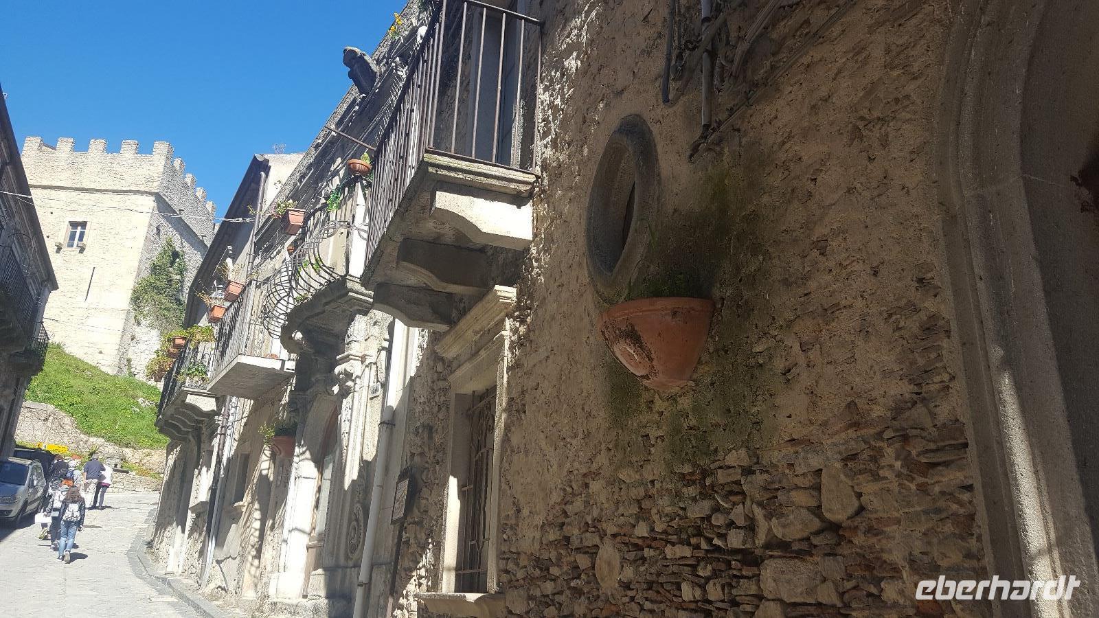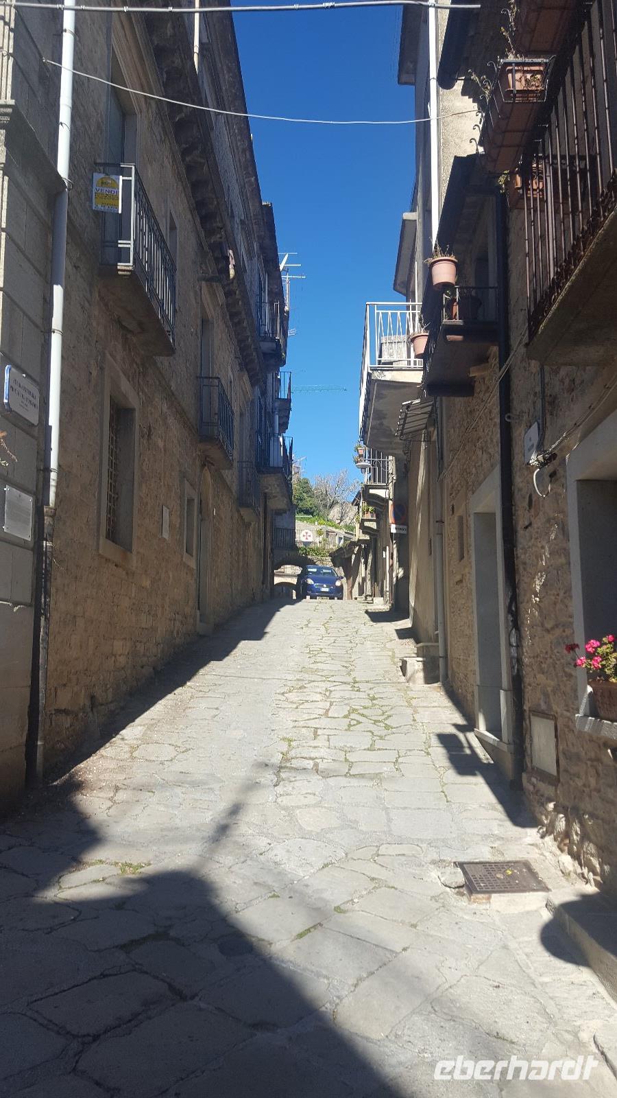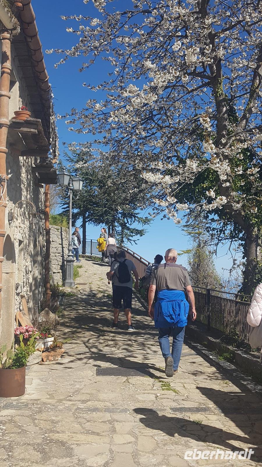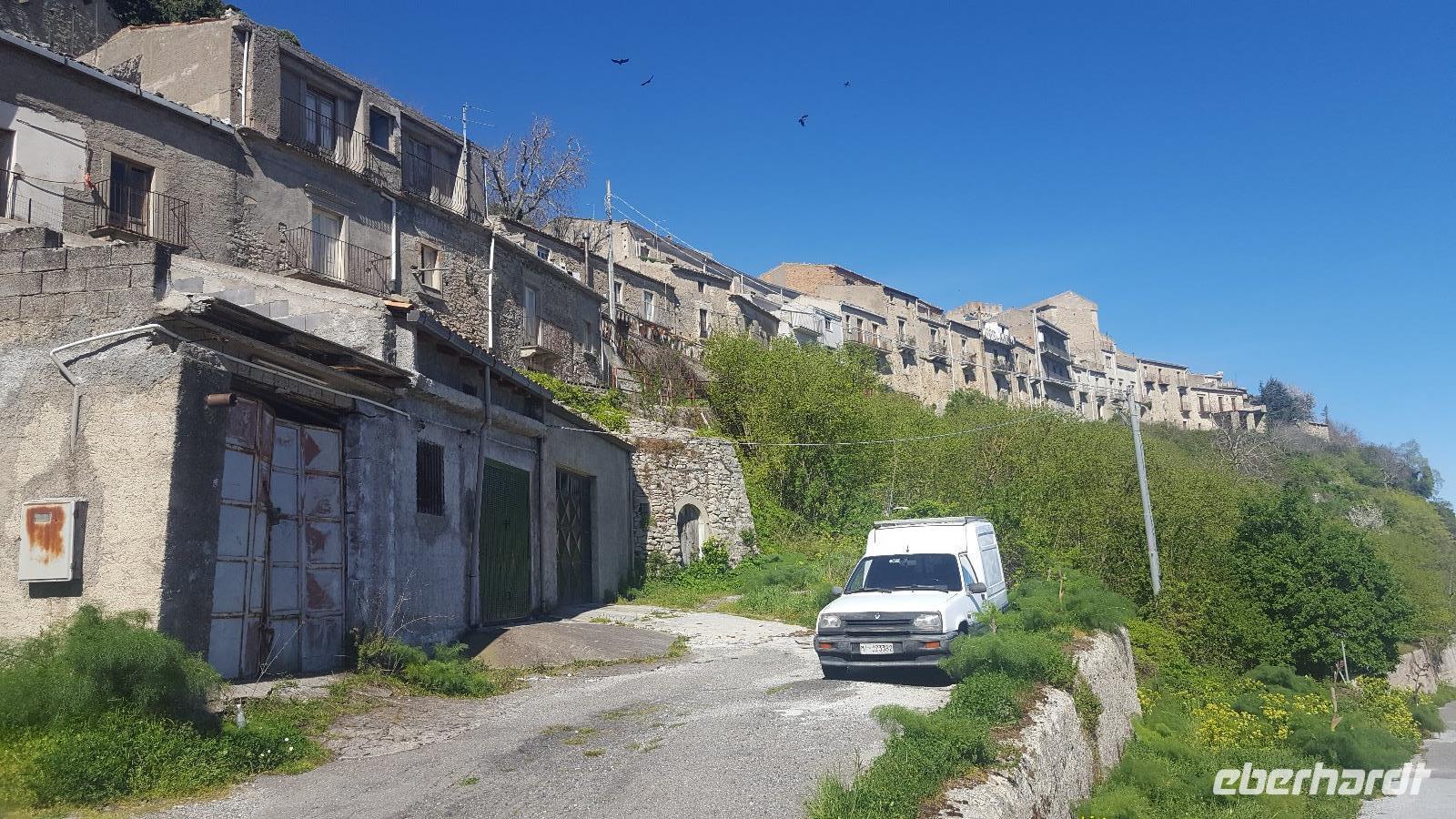 Auch heute müssen wir wieder feststellen, wie gebirgig Sizilien doch ist. Nicht enden wollende kleine kurvige Straßen führen uns heute nach Montalbano Elicona, eine Gemeinde ca. 80 km von Messina entfernt. Heute ist nach Ostern für viele der erste Arbeitstag und so sieht man auch in diesem Örtchen noch nicht so viele Menschen. Ein Café hat aber schon geöffnet und so legen wir ein zweites kleines Frühstück ein, mit ein bisschen Gebäck und Kaffee.