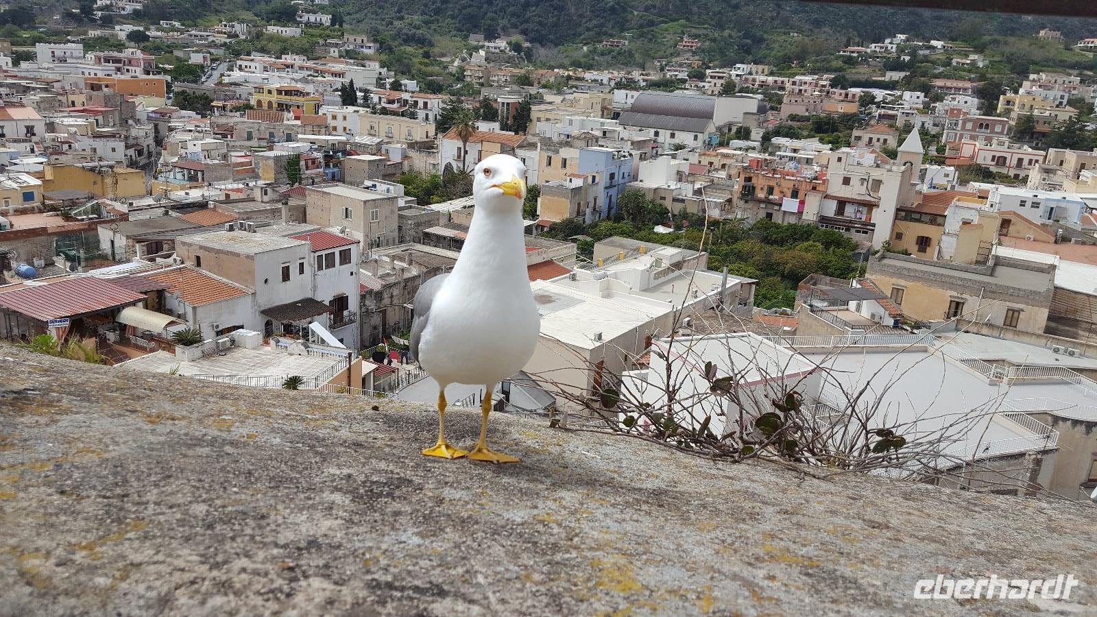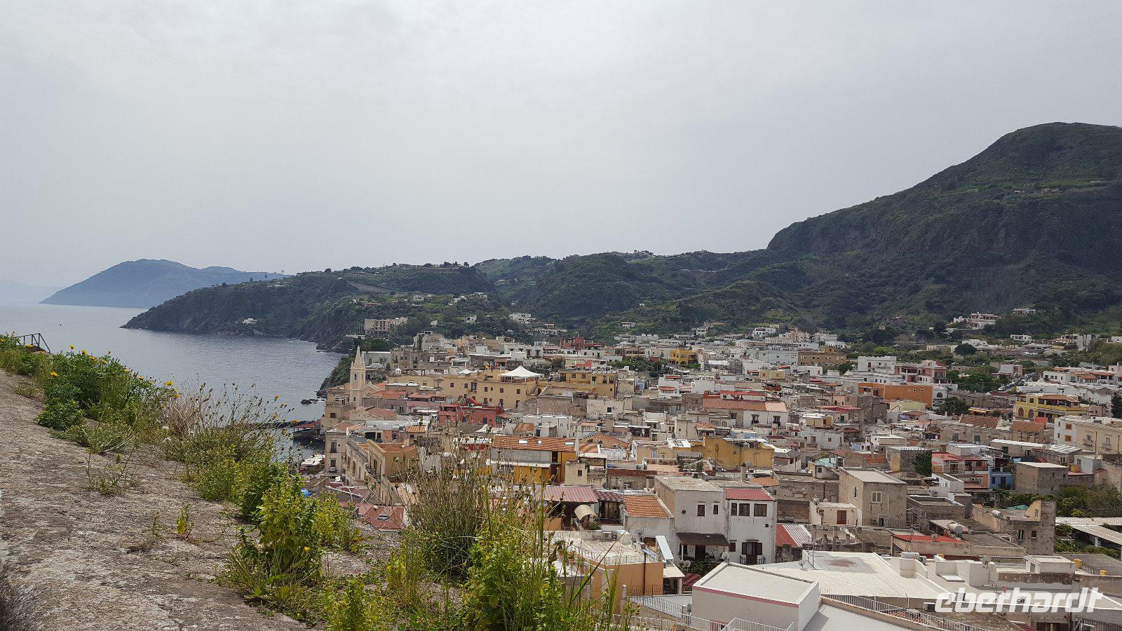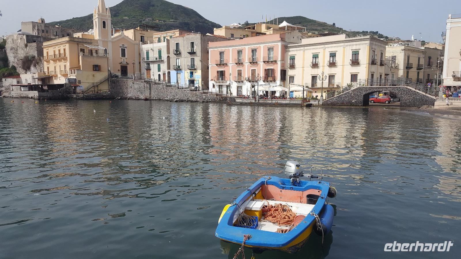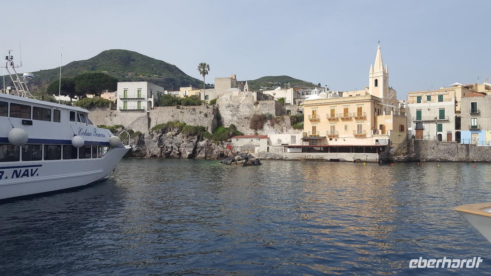 Auf dieser Reise sind wir schon geflogen und wir haben große Strecken mit dem Bus absolviert, fehlt nur noch das Schiff. Dies wartet heute am Hafen von Milazzo auf uns, denn heute geht es auf die Liparischen Inseln. Da der erste Teil der Schifffahrt durch lärmende Studenten sehr nervenaufreibend ist, sind wir sehr froh endlich wieder festen Boden unter den Füßen zu haben, als wir auf Lipari ankommen. Sie ist mit ca. 30 Quadratkilometern die größte Insel der Liparischen Inseln und auch die fruchtbarste.