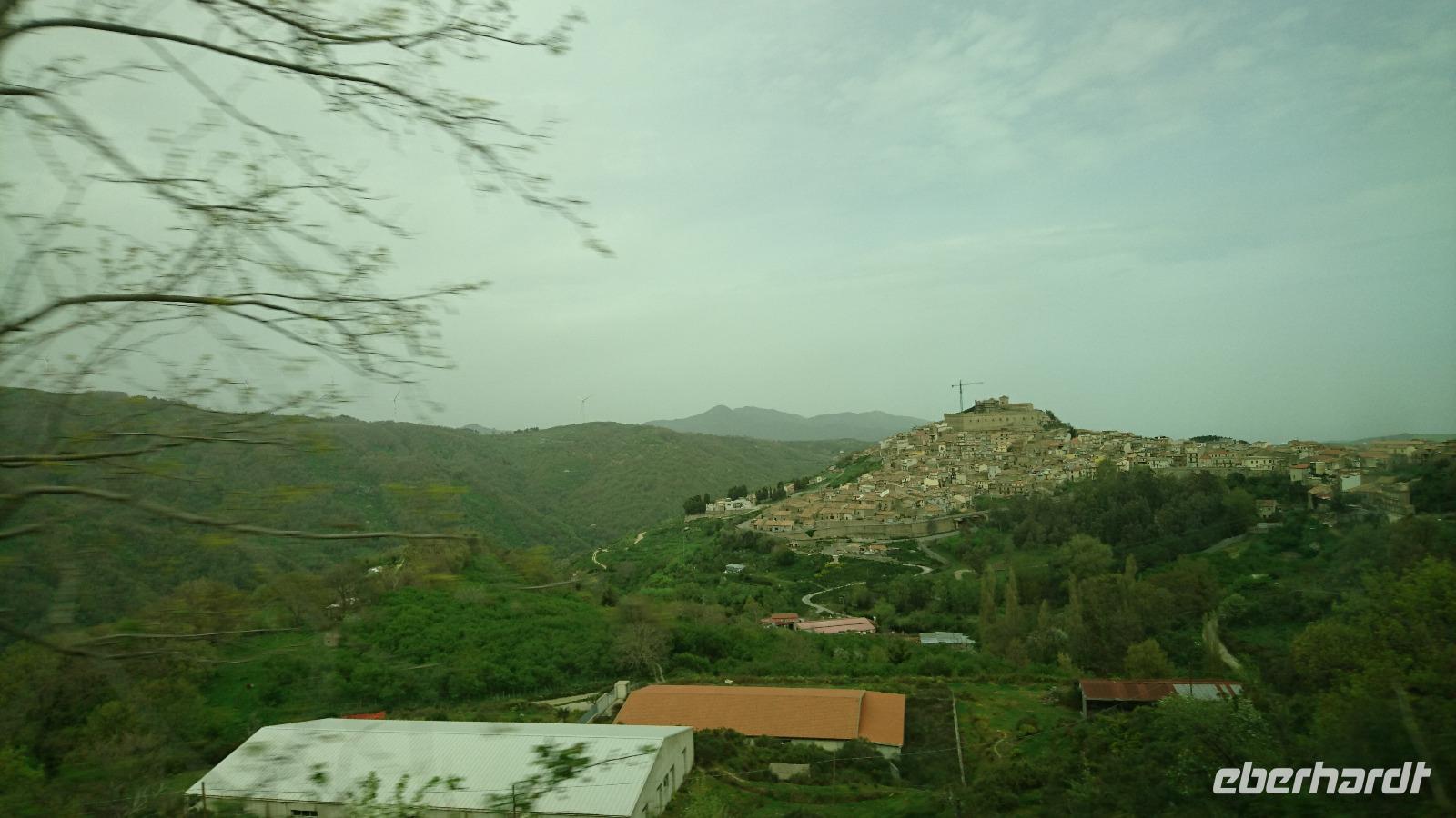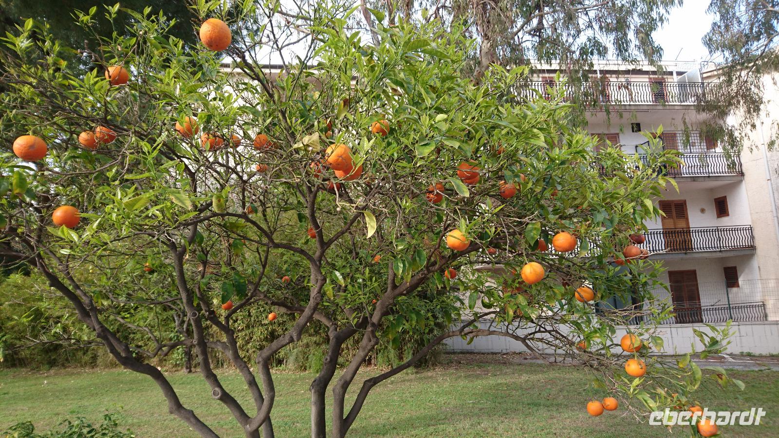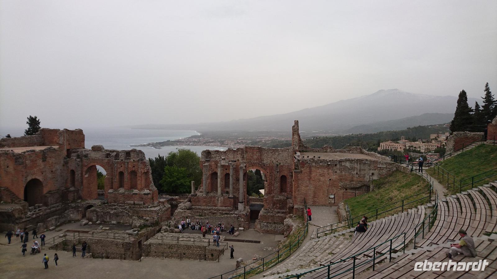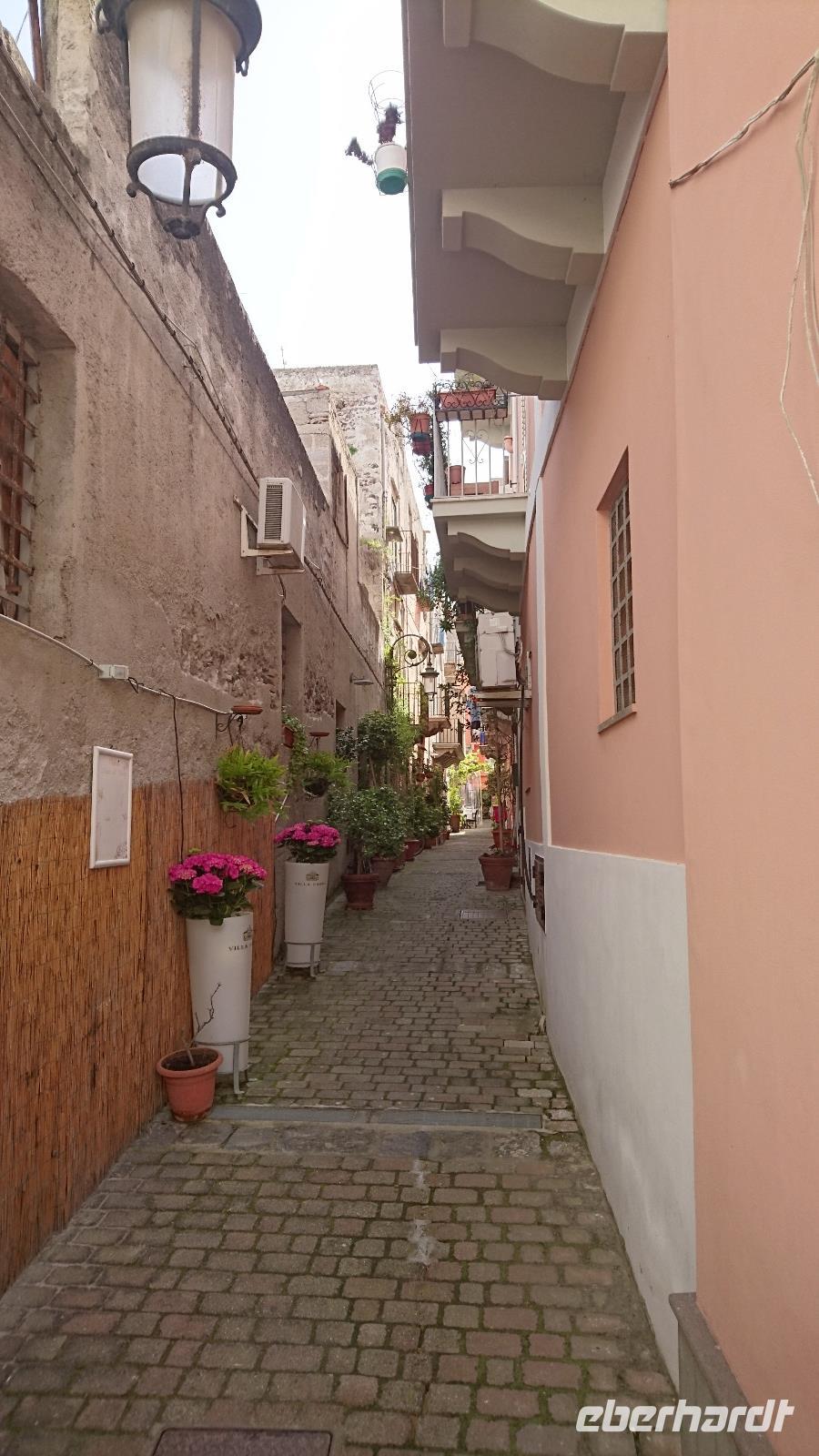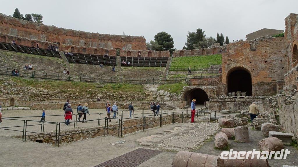 Schon nach Hause? Ach was, noch ein Tag blieb uns auf Sizilien und das war auch gut so! Quer durch die Ebene bei Catania fuhren wir mit ständigem Blick auf den leider etwas umwölkten Ätna, sahen noch einmal viele Orangen- und Zitronenplantagen, mussten auch erkennen, dass Gertraudes Worte, der Tourismus ist heute in Sizilien die Haupteinnahmequelle, wirklich zutraf, denn schon die Apfelsinenbäume mit Früchten und Blüten zeugten davon, dass man mit den Früchten keine den Lebensunterhalt bestimmenden Gewinne mehr machen kann. Verlassene und dem Verfall preisgegebene einst herrschaftliche Landgüter oder auch leere Läden und Häuser in den kleinen durchquerten Orten stellten die Schwierigkeit des Lebens auf Sizilien in unseren so fortschrittlichen und zivilisierten Tagen klar und deutlich dar. Und doch gefiel uns der darauf besuchte kleine Ort Montalbano Elicona mit seinen schmalen Gassen, Wappen an den alten Häusern und dem alles überthronenden Castel. Gern kauften wir etwas Süßes oder ein Waser, tranken einen Espresso und nutzten dafür die Toilette in einer kleinen Bar, in der Weihnachtsschmuck neben Osterhasen zu finden war, ehe wir wieder in unseren Bus stiegen und weiter über Land zu einem kleinen Gut fuhren, wo seit Jahrhunderten Wein angebaut und Käse hergestellt wird. Sturm kam auf und wir waren froh, jetzt eine mittägliche Verkostung im Haupthaus beginnen zu können. Selbst hergestellte Wurst, verschiedene Käse, Hauswein, eingelegte Früchte vermittelten uns noch einmal mehr einen tollen Eindruck der sizilianischen Küche. Später wurde der Wind einsichtig und ruhiger. So konnten wir mit dem Bauern einen kleinen Hofrundgang unternehmen. Er berichtete, dass erst kürzlich ein Fuchs den Hühnerstall aufbrach und 80 seiner Hühner riss, ehe er, ohne wirklich etwas gefressen zu haben, wieder von Dannen zog. Im Käselager sahen wir, wie die großen, runden Käse entstehen und die alte Weinpresse wurde uns ebenso erklärt. Wer wollte, konnte noch etwas Käse für zuhause kaufen. Dann ging es weiter über die Ebene. Ein Zwischenstopp an interessanten vulkanisch entstandenen Felsformationen entlang eines Flusses zeigte uns, welch Naturwunder ohne jegliches Zutun des Menschen existieren... und wie der Mensch, in diesem Fall ein Einzelner, daraus als Landbesitzer Gewinn mit Touristen schlagen kann. Nun, das gehört heute allerorts auf der Welt zusammen. Später erreichten wir den mittleren Parkplatz von Taormina und wir stiegen von Paolos Bus um in einen kleinen Shuttlebus, der uns in die Altstadt von Taormina brachte. Hier bestaunten wir hoch oben auf den Felsen ein griechisch-römisches und fast vollständig erhaltenes Theater, bummelten dann individuell durch den Ort und ließen so unsere Reise schon etwas ausklingen. Dann ging es per Bus zurück zum Hotel, wo wir Gertraude und Paolo herzlich verabschiedeten, und bald gab es unser vorerst letztes sizilianisches Abendessen am Buffet, danach packten wir schon einmal unsere Koffer vor und schliefen dem Abreisetag entgegen.