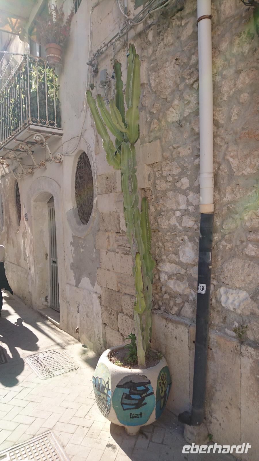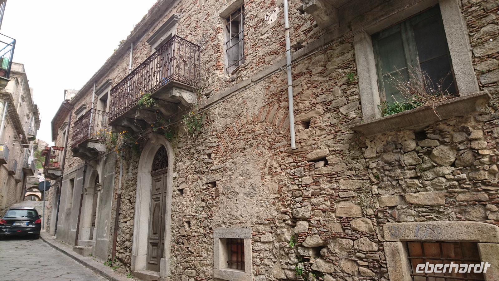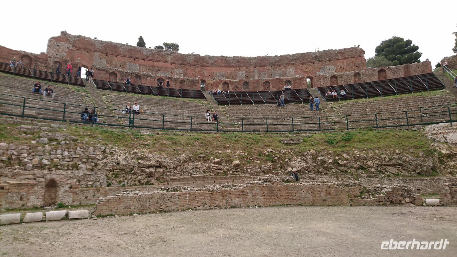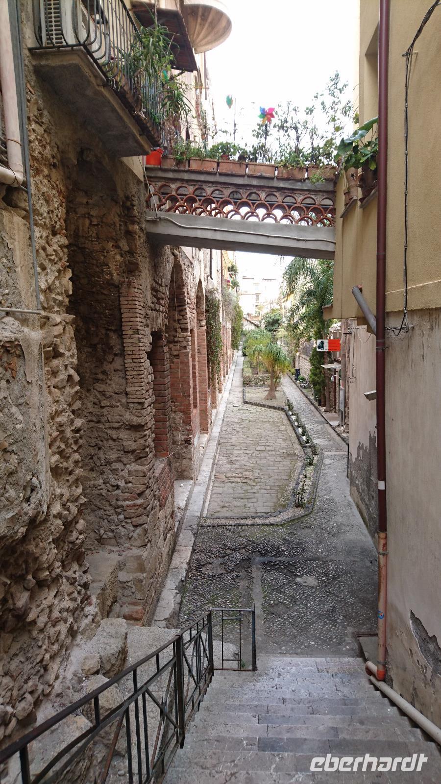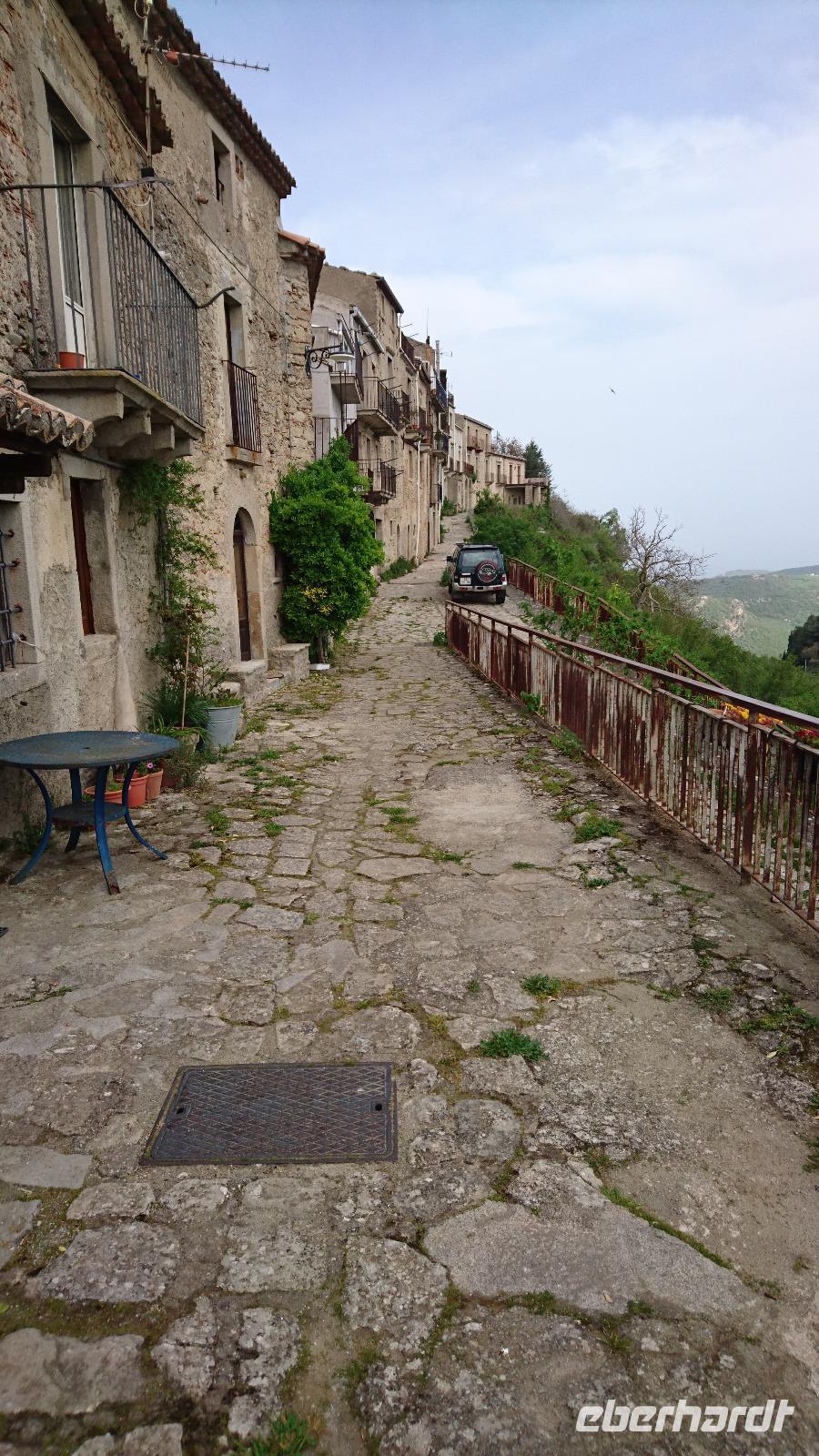Schon nach Hause? Ach was, noch ein Tag blieb uns auf Sizilien und das war auch gut so! Quer durch die Ebene bei Catania fuhren wir mit ständigem Blick auf den leider etwas umwölkten Ätna, sahen noch einmal viele Orangen- und Zitronenplantagen, mussten auch erkennen, dass Gertraudes Worte, der Tourismus ist heute in Sizilien die Haupteinnahmequelle, wirklich zutraf, denn schon die Apfelsinenbäume mit Früchten und Blüten zeugten davon, dass man mit den Früchten keine den Lebensunterhalt bestimmenden Gewinne mehr machen kann. Verlassene und dem Verfall preisgegebene einst herrschaftliche Landgüter oder auch leere Läden und Häuser in den kleinen durchquerten Orten stellten die Schwierigkeit des Lebens auf Sizilien in unseren so fortschrittlichen und zivilisierten Tagen klar und deutlich dar. Und doch gefiel uns der darauf besuchte kleine Ort Montalbano Elicona mit seinen schmalen Gassen, Wappen an den alten Häusern und dem alles überthronenden Castel. Gern kauften wir etwas Süßes oder ein Waser, tranken einen Espresso und nutzten dafür die Toilette in einer kleinen Bar, in der Weihnachtsschmuck neben Osterhasen zu finden war, ehe wir wieder in unseren Bus stiegen und weiter über Land zu einem kleinen Gut fuhren, wo seit Jahrhunderten Wein angebaut und Käse hergestellt wird. Sturm kam auf und wir waren froh, jetzt eine mittägliche Verkostung im Haupthaus beginnen zu können. Selbst hergestellte Wurst, verschiedene Käse, Hauswein, eingelegte Früchte vermittelten uns noch einmal mehr einen tollen Eindruck der sizilianischen Küche. Später wurde der Wind einsichtig und ruhiger. So konnten wir mit dem Bauern einen kleinen Hofrundgang unternehmen. Er berichtete, dass erst kürzlich ein Fuchs den Hühnerstall aufbrach und 80 seiner Hühner riss, ehe er, ohne wirklich etwas gefressen zu haben, wieder von Dannen zog. Im Käselager sahen wir, wie die großen, runden Käse entstehen und die alte Weinpresse wurde uns ebenso erklärt. Wer wollte, konnte noch etwas Käse für zuhause kaufen. Dann ging es weiter über die Ebene. Ein Zwischenstopp an interessanten vulkanisch entstandenen Felsformationen entlang eines Flusses zeigte uns, welch Naturwunder ohne jegliches Zutun des Menschen existieren... und wie der Mensch, in diesem Fall ein Einzelner, daraus als Landbesitzer Gewinn mit Touristen schlagen kann. Nun, das gehört heute allerorts auf der Welt zusammen. Später erreichten wir den mittleren Parkplatz von Taormina und wir stiegen von Paolos Bus um in einen kleinen Shuttlebus, der uns in die Altstadt von Taormina brachte. Hier bestaunten wir hoch oben auf den Felsen ein griechisch-römisches und fast vollständig erhaltenes Theater, bummelten dann individuell durch den Ort und ließen so unsere Reise schon etwas ausklingen. Dann ging es per Bus zurück zum Hotel, wo wir Gertraude und Paolo herzlich verabschiedeten, und bald gab es unser vorerst letztes sizilianisches Abendessen am Buffet, danach packten wir schon einmal unsere Koffer vor und schliefen dem Abreisetag entgegen.