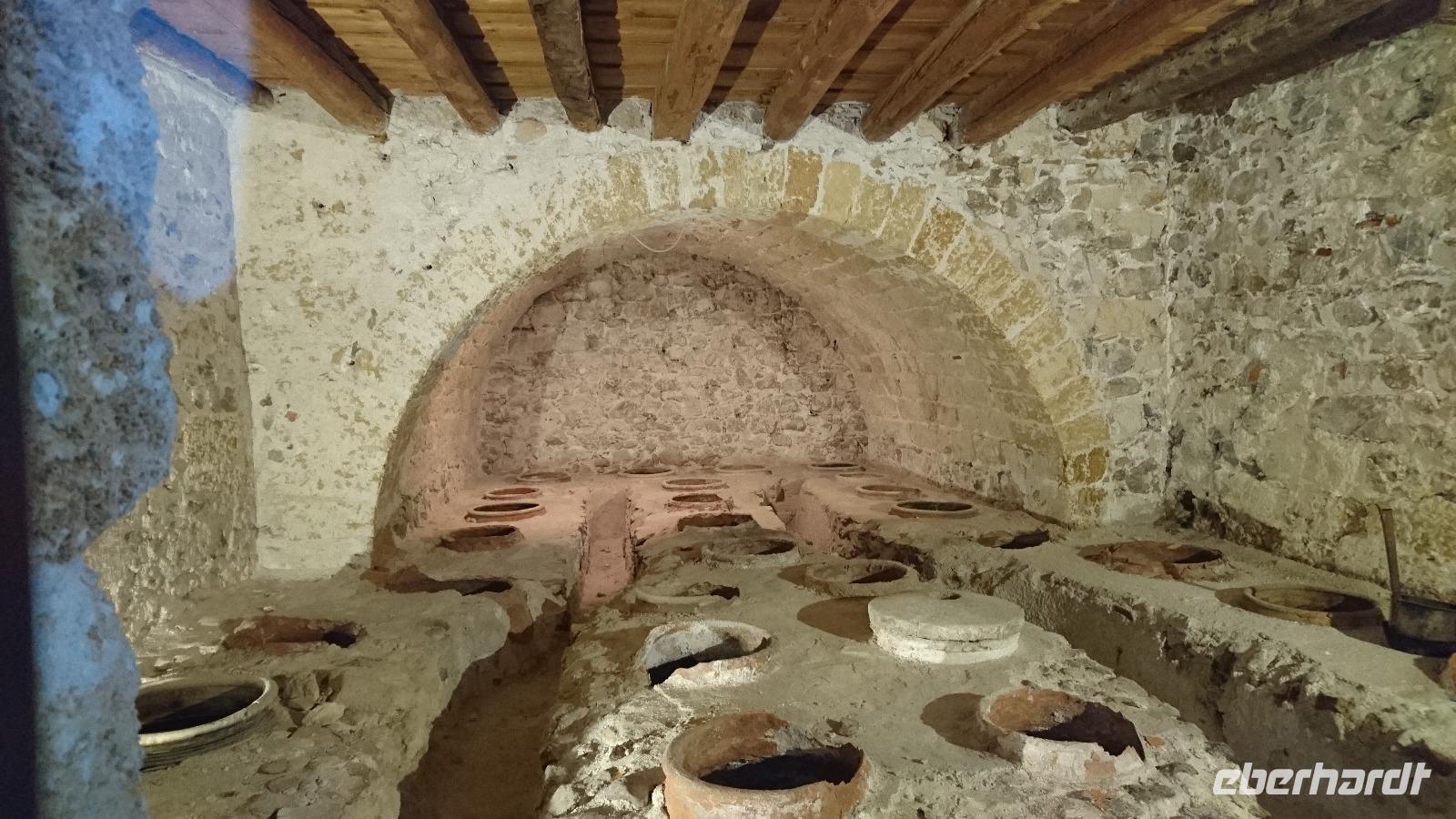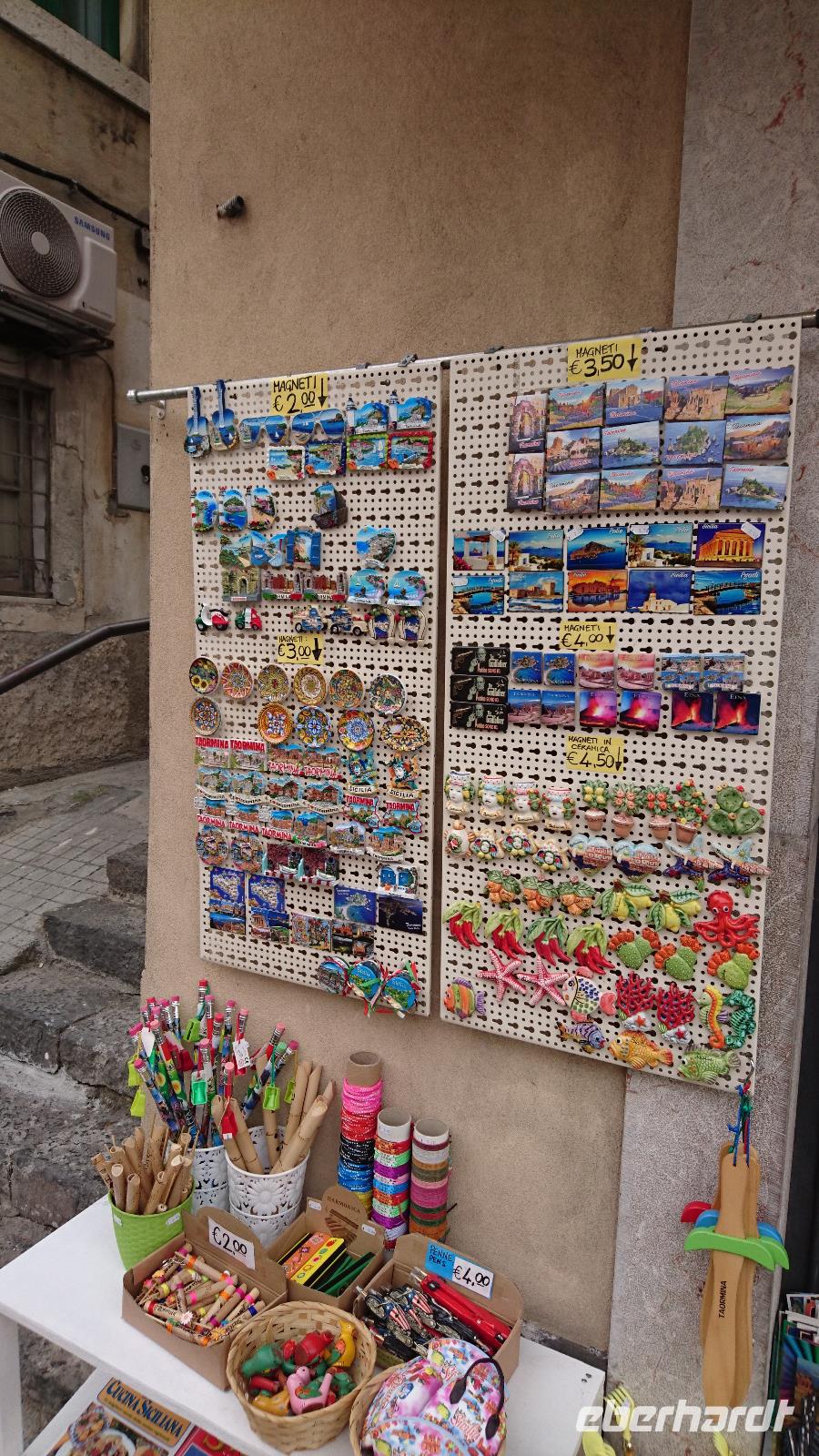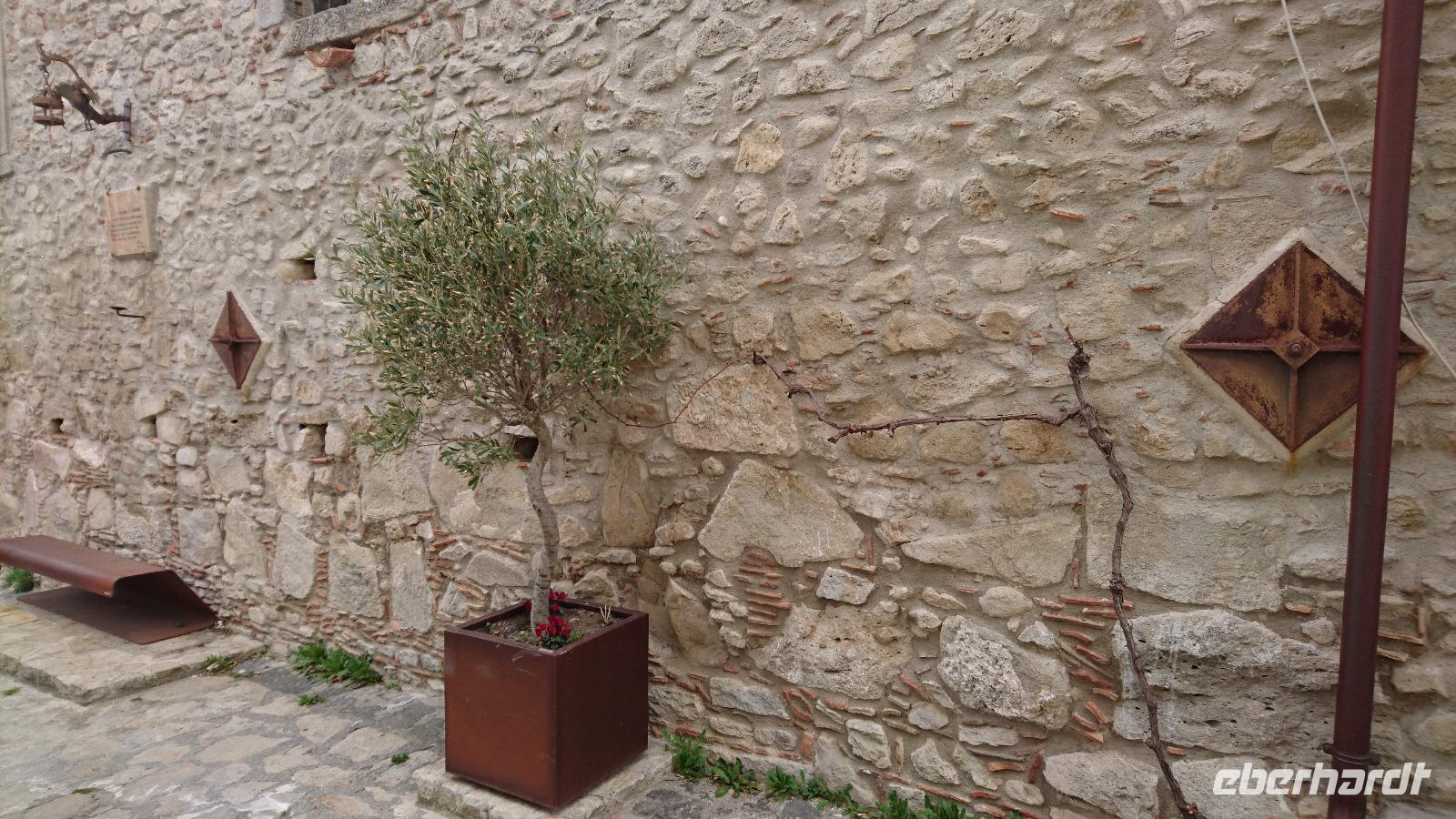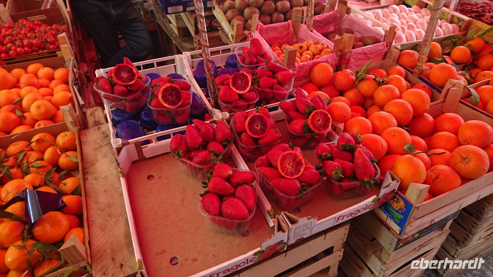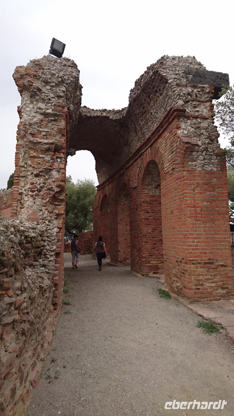 Schon nach Hause? Ach was, noch ein Tag blieb uns auf Sizilien und das war auch gut so! Quer durch die Ebene bei Catania fuhren wir mit ständigem Blick auf den leider etwas umwölkten Ätna, sahen noch einmal viele Orangen- und Zitronenplantagen, mussten auch erkennen, dass Gertraudes Worte, der Tourismus ist heute in Sizilien die Haupteinnahmequelle, wirklich zutraf, denn schon die Apfelsinenbäume mit Früchten und Blüten zeugten davon, dass man mit den Früchten keine den Lebensunterhalt bestimmenden Gewinne mehr machen kann. Verlassene und dem Verfall preisgegebene einst herrschaftliche Landgüter oder auch leere Läden und Häuser in den kleinen durchquerten Orten stellten die Schwierigkeit des Lebens auf Sizilien in unseren so fortschrittlichen und zivilisierten Tagen klar und deutlich dar. Und doch gefiel uns der darauf besuchte kleine Ort Montalbano Elicona mit seinen schmalen Gassen, Wappen an den alten Häusern und dem alles überthronenden Castel. Gern kauften wir etwas Süßes oder ein Waser, tranken einen Espresso und nutzten dafür die Toilette in einer kleinen Bar, in der Weihnachtsschmuck neben Osterhasen zu finden war, ehe wir wieder in unseren Bus stiegen und weiter über Land zu einem kleinen Gut fuhren, wo seit Jahrhunderten Wein angebaut und Käse hergestellt wird. Sturm kam auf und wir waren froh, jetzt eine mittägliche Verkostung im Haupthaus beginnen zu können. Selbst hergestellte Wurst, verschiedene Käse, Hauswein, eingelegte Früchte vermittelten uns noch einmal mehr einen tollen Eindruck der sizilianischen Küche. Später wurde der Wind einsichtig und ruhiger. So konnten wir mit dem Bauern einen kleinen Hofrundgang unternehmen. Er berichtete, dass erst kürzlich ein Fuchs den Hühnerstall aufbrach und 80 seiner Hühner riss, ehe er, ohne wirklich etwas gefressen zu haben, wieder von Dannen zog. Im Käselager sahen wir, wie die großen, runden Käse entstehen und die alte Weinpresse wurde uns ebenso erklärt. Wer wollte, konnte noch etwas Käse für zuhause kaufen. Dann ging es weiter über die Ebene. Ein Zwischenstopp an interessanten vulkanisch entstandenen Felsformationen entlang eines Flusses zeigte uns, welch Naturwunder ohne jegliches Zutun des Menschen existieren... und wie der Mensch, in diesem Fall ein Einzelner, daraus als Landbesitzer Gewinn mit Touristen schlagen kann. Nun, das gehört heute allerorts auf der Welt zusammen. Später erreichten wir den mittleren Parkplatz von Taormina und wir stiegen von Paolos Bus um in einen kleinen Shuttlebus, der uns in die Altstadt von Taormina brachte. Hier bestaunten wir hoch oben auf den Felsen ein griechisch-römisches und fast vollständig erhaltenes Theater, bummelten dann individuell durch den Ort und ließen so unsere Reise schon etwas ausklingen. Dann ging es per Bus zurück zum Hotel, wo wir Gertraude und Paolo herzlich verabschiedeten, und bald gab es unser vorerst letztes sizilianisches Abendessen am Buffet, danach packten wir schon einmal unsere Koffer vor und schliefen dem Abreisetag entgegen.