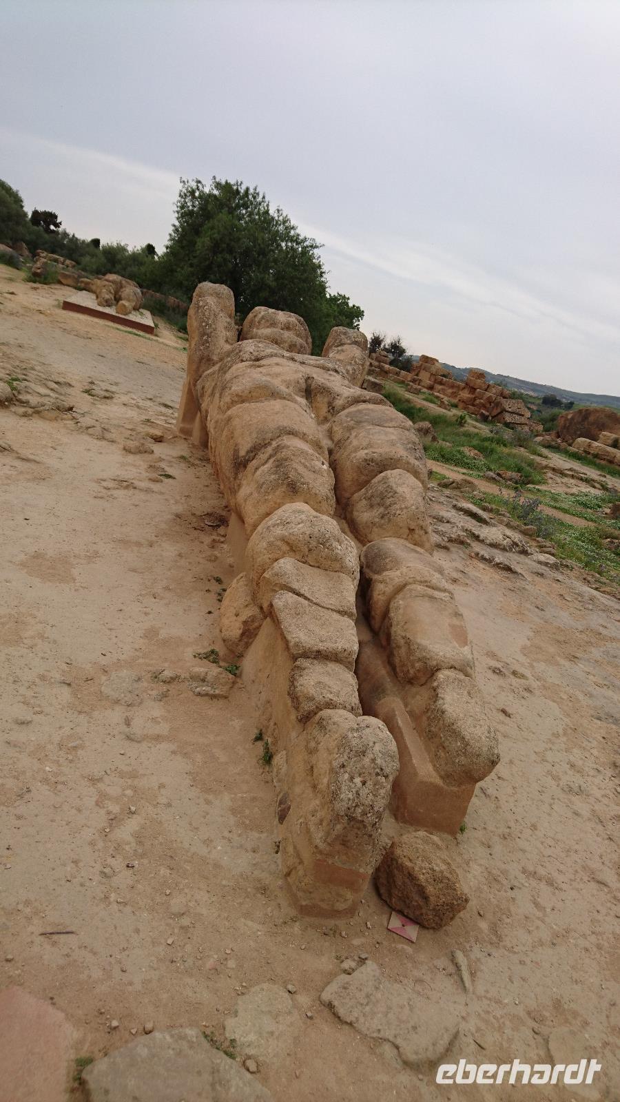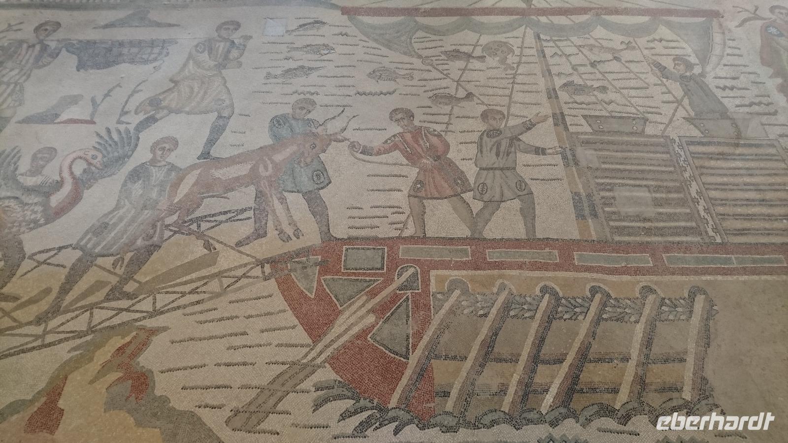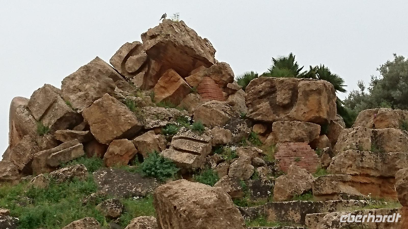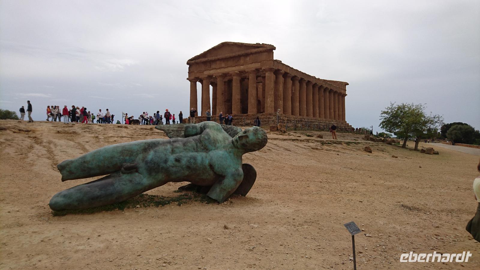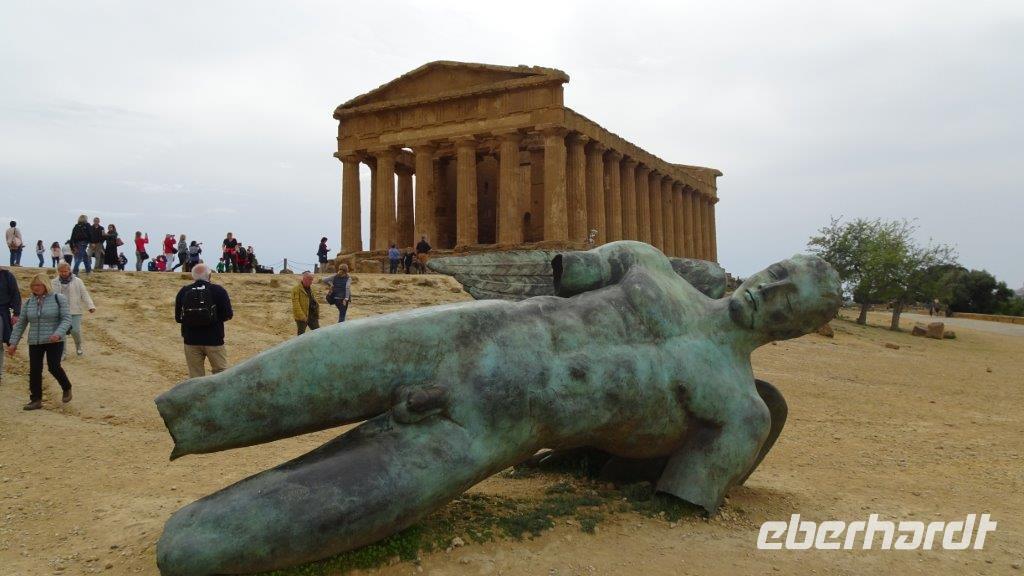 Der frühe Vogel... war kaum eher wach als wir. Das Frühstück am Buffet schmeckte hervorragend und das Kofferladen in Paolos Bus verlief darum recht schnell. Dann begann die lange Fahrt zur Villa Romana. Vulkanasche, Lava und das schnelle Vergessen der Menschen im heute recht abgeschiedenen Tal der Villa führten einst dazu, dass dieses römische Herrschaftshaus nicht geplündert, sondern fast vollständig erhalten uns, also der Nachwelt erhalten blieb. Wir staunten über die alte Fußbodenheizanlage, die knapp 2.000 Jahre alte Kanalisation, die zugehörigen Sitztoiletten, die klare Struktur der Raumaufteilungen und vor allem die sehr gut erhaltenen Mosaike auf den Raumböden. Gertraude führte uns mit viel historischem Wissen und erläuterte uns Bau, Erweiterung, Auszug, Vergessen und Wiederfund der Villa, ehe wir noch einmal mehr in die sizilianische Geschichte eintauchen würden. Doch vorher gab es eine kleine Mittagspause am Museum und dann wieder einige Kilometer Fahrt zum legendären Tal der Tempel, wo über Kilometer hin einst der große und bedeutende Ort Agrigento existierte, von dem heute nur noch Ruinen zeugen. Jedoch die dort angelegten Straßen, die gewaltige Größe der Säulen der meist verfallenen Tempel, aber auch der fast vollständig erhaltene Concordia-Tempel zeugen heute noch von der Macht der Erbauer, jedoch auch vom Untergang jener Macht. Vielleicht symbolisiert dies die absichtlich liegend angelegte Figur des gefallenen Ikarus sehr deutlich. Dass der Mensch auch einst Mächtiges leicht zerstören kann, zeigte die hiesige Nekropole, die man in die meterdicke Stadtmauer einbrachte und die dadurch eben diese Mauer wie einen Käse durchlöcherte, was deren Schutzfunktion arg schmälerte. Mit vielen tollen Eindrücken im Gepäck, die uns immer wieder in Gedanken nach Griechenland zu versetzen schienen, ging es nun von der Küste ins Landesinnere zu unserer nächsten Unterkunft, einem Landgut mit Olivenbäumen, zugehöriger Ölproduktion und ländlich-sittlichem Charme. Hier checkten wir bald in unsere Zimmer ein und trafen uns nach einer kleinen Ruhepause zum Abendessen wieder. Es erwartete uns ein Feuerwerk der sizilianischen Küche, schmackhafte Vorspeisen, leckere Hauptgänge, ein süßes Dessert und dazu die Atmosphäre des Landgutes. Das passte irgendwie alles prima zusammen. Nach dem Essen war es schon dunkel und wir legten uns bald zur Ruhe.