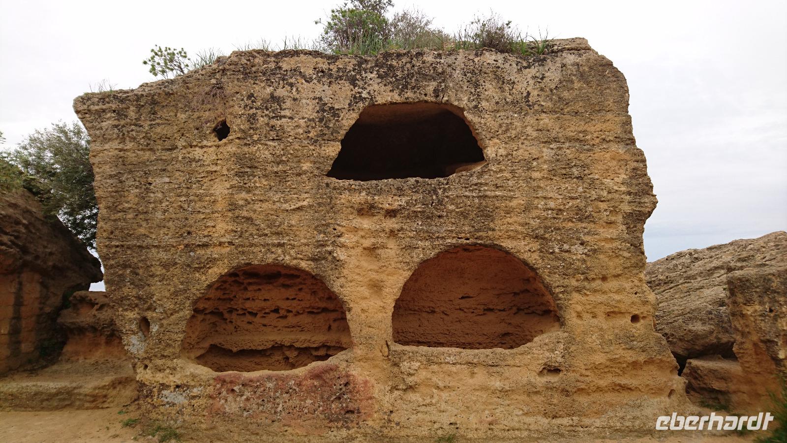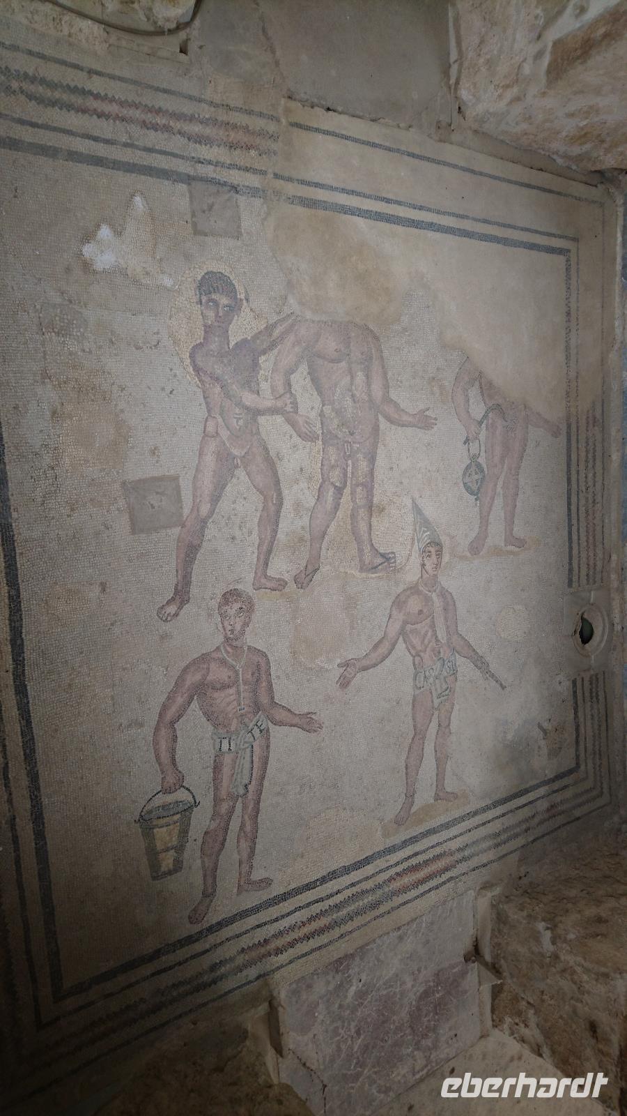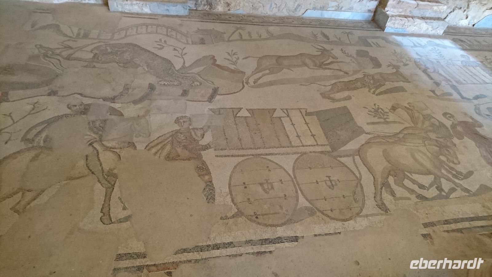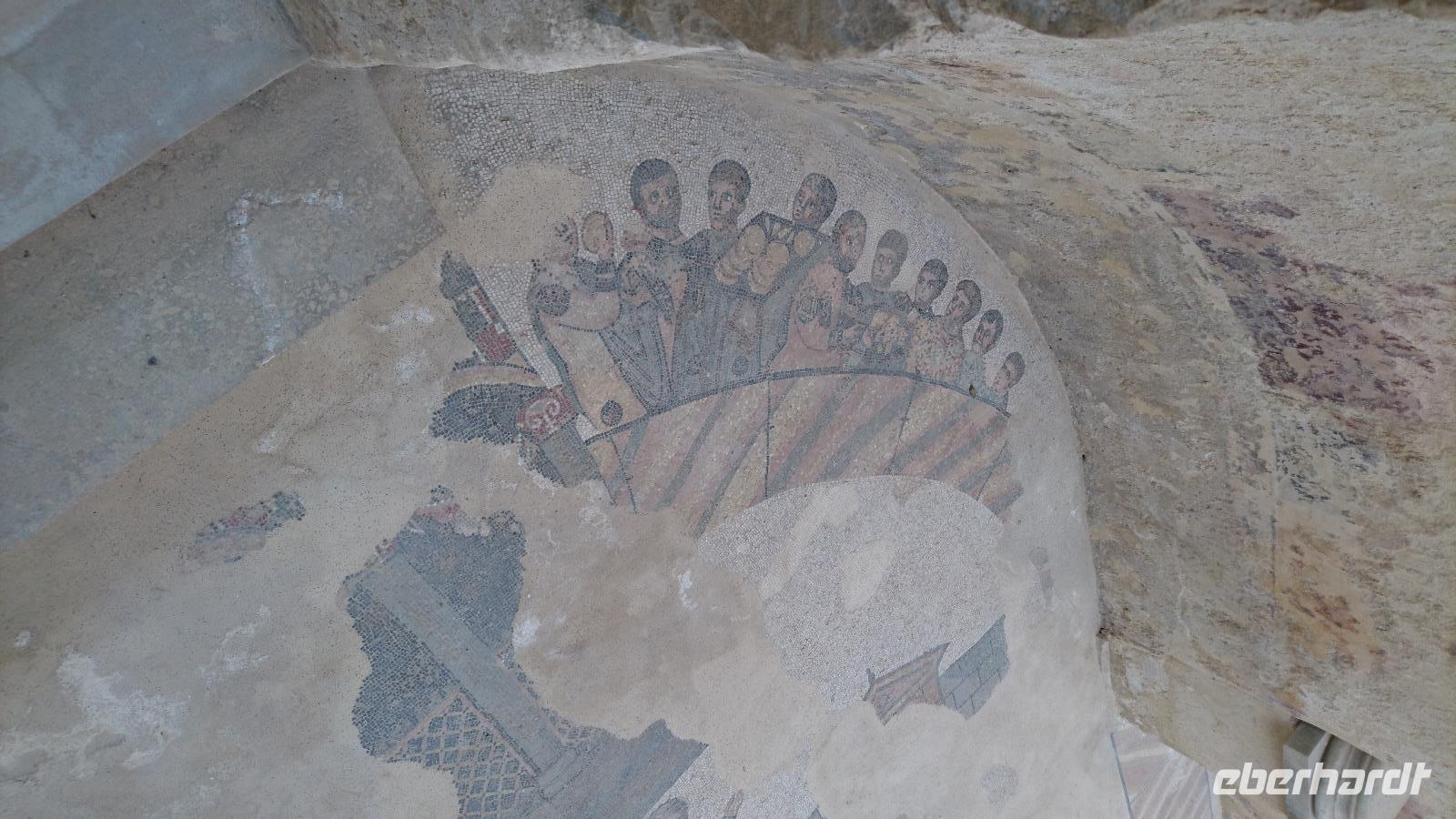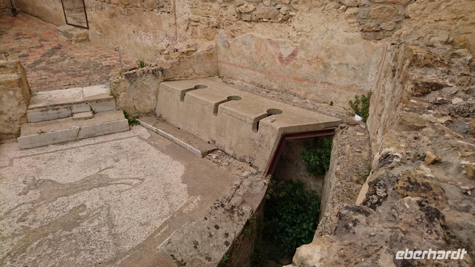 Der frühe Vogel... war kaum eher wach als wir. Das Frühstück am Buffet schmeckte hervorragend und das Kofferladen in Paolos Bus verlief darum recht schnell. Dann begann die lange Fahrt zur Villa Romana. Vulkanasche, Lava und das schnelle Vergessen der Menschen im heute recht abgeschiedenen Tal der Villa führten einst dazu, dass dieses römische Herrschaftshaus nicht geplündert, sondern fast vollständig erhalten uns, also der Nachwelt erhalten blieb. Wir staunten über die alte Fußbodenheizanlage, die knapp 2.000 Jahre alte Kanalisation, die zugehörigen Sitztoiletten, die klare Struktur der Raumaufteilungen und vor allem die sehr gut erhaltenen Mosaike auf den Raumböden. Gertraude führte uns mit viel historischem Wissen und erläuterte uns Bau, Erweiterung, Auszug, Vergessen und Wiederfund der Villa, ehe wir noch einmal mehr in die sizilianische Geschichte eintauchen würden. Doch vorher gab es eine kleine Mittagspause am Museum und dann wieder einige Kilometer Fahrt zum legendären Tal der Tempel, wo über Kilometer hin einst der große und bedeutende Ort Agrigento existierte, von dem heute nur noch Ruinen zeugen. Jedoch die dort angelegten Straßen, die gewaltige Größe der Säulen der meist verfallenen Tempel, aber auch der fast vollständig erhaltene Concordia-Tempel zeugen heute noch von der Macht der Erbauer, jedoch auch vom Untergang jener Macht. Vielleicht symbolisiert dies die absichtlich liegend angelegte Figur des gefallenen Ikarus sehr deutlich. Dass der Mensch auch einst Mächtiges leicht zerstören kann, zeigte die hiesige Nekropole, die man in die meterdicke Stadtmauer einbrachte und die dadurch eben diese Mauer wie einen Käse durchlöcherte, was deren Schutzfunktion arg schmälerte. Mit vielen tollen Eindrücken im Gepäck, die uns immer wieder in Gedanken nach Griechenland zu versetzen schienen, ging es nun von der Küste ins Landesinnere zu unserer nächsten Unterkunft, einem Landgut mit Olivenbäumen, zugehöriger Ölproduktion und ländlich-sittlichem Charme. Hier checkten wir bald in unsere Zimmer ein und trafen uns nach einer kleinen Ruhepause zum Abendessen wieder. Es erwartete uns ein Feuerwerk der sizilianischen Küche, schmackhafte Vorspeisen, leckere Hauptgänge, ein süßes Dessert und dazu die Atmosphäre des Landgutes. Das passte irgendwie alles prima zusammen. Nach dem Essen war es schon dunkel und wir legten uns bald zur Ruhe.