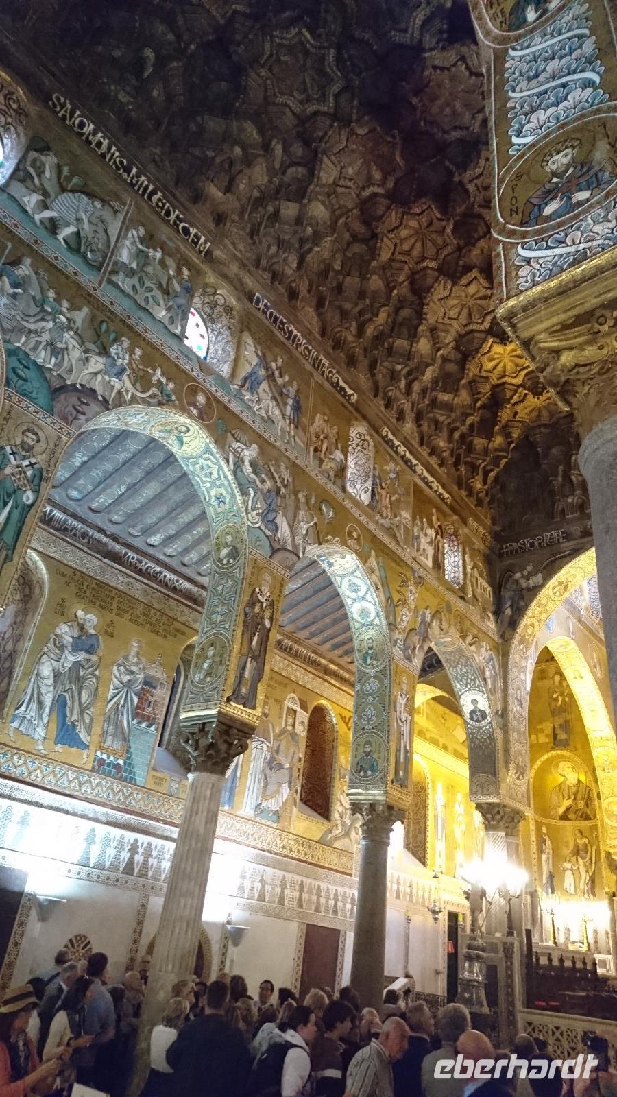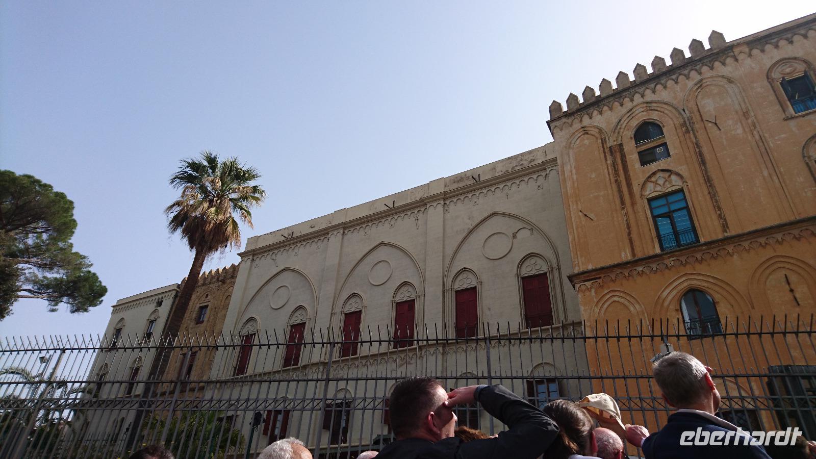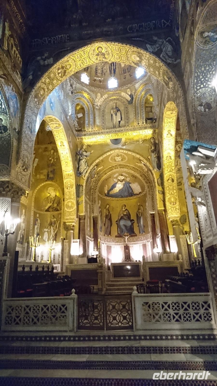 Palermo. Hochburg der Mafia? Wir bemerkten davon nichts. Gertraude berichtete uns auf einer unserer Fahrten etwas über diese Organisation, ihre Entstehung und ihre heutige Bedeutung. Trotzdem oder gerade darum fühlten wir uns in Palermo gut, auch wenn wir zum ersten Mal nach dem Flughafen sehr intensiv kontrolliert wurden, als wir den königlich-kaiserlichen Staufer-Palast mit der berühmten Capella Palatina besuchen wollten. Der palastbau an sich ist schon sehr sehenswert, die vorhandenen Wandgemälde zeugen von viel Kunstverstand vergangener Zeiten und die Kapelle selbst, über und über mit Gold versehen und mit einer sehr ungewöhnlichen Deckenkonstruktion, war allein schon eine Reise nach Sizilien wert. Nach ausgiebiger Besichtigung spazierten wir durch die nun fast vollständig zur Fußgängerzone gewordenen Innenstadt, besichtigten die Kathedrale, in der auch die Staufergräber z.B. von Friedrich Barbarossa, dem schlafenden Wächter des Kyffhäusers am Deutschen Harzrand, befinden. Durch schmale Gassen, vorbei an grünen Plätzen, immer freundlich angestrahlt von Einheimischen und gemeinsam mit vielen anderen Touristen, schlenderten wir später über den ‚Arabischen Markt', hatten dann in der Nähe des Theaters Zeit für individuellen Bummel und Mittagessen, ehe wir später an der Uferpromenade wieder in unseren Bus stiegen und in den kleinen Ort Cefalu fuhren. Nach einem Besuch des dortigen Domes, hatten wir Zeit, ein altes Öllager und einen ehemaligen Waschplatz der Frauen zu besichtigen, genossen etwas Freizeit im Ort und fuhren weiter in unser nächstes Rundfahrt-Hotel in Milazzo. Hier würden wir nur eine Nacht bleiben, waren jedoch mit Ambiente, Sicht und Essen sehr zufrieden. So ging wieder ein ereignis- und eindrucksreicher Tag zu Ende.