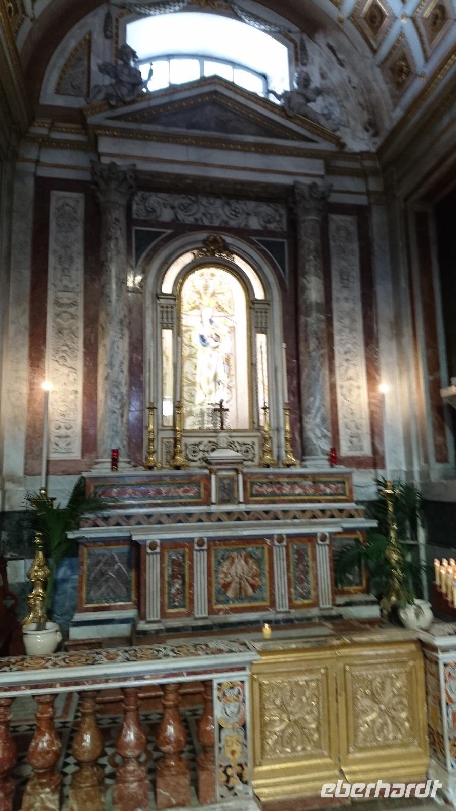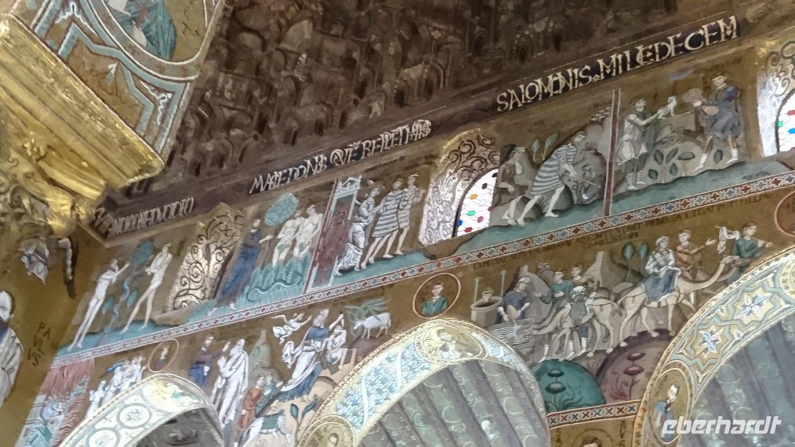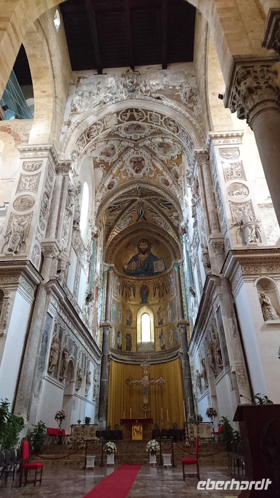 Palermo. Hochburg der Mafia? Wir bemerkten davon nichts. Gertraude berichtete uns auf einer unserer Fahrten etwas über diese Organisation, ihre Entstehung und ihre heutige Bedeutung. Trotzdem oder gerade darum fühlten wir uns in Palermo gut, auch wenn wir zum ersten Mal nach dem Flughafen sehr intensiv kontrolliert wurden, als wir den königlich-kaiserlichen Staufer-Palast mit der berühmten Capella Palatina besuchen wollten. Der palastbau an sich ist schon sehr sehenswert, die vorhandenen Wandgemälde zeugen von viel Kunstverstand vergangener Zeiten und die Kapelle selbst, über und über mit Gold versehen und mit einer sehr ungewöhnlichen Deckenkonstruktion, war allein schon eine Reise nach Sizilien wert. Nach ausgiebiger Besichtigung spazierten wir durch die nun fast vollständig zur Fußgängerzone gewordenen Innenstadt, besichtigten die Kathedrale, in der auch die Staufergräber z.B. von Friedrich Barbarossa, dem schlafenden Wächter des Kyffhäusers am Deutschen Harzrand, befinden. Durch schmale Gassen, vorbei an grünen Plätzen, immer freundlich angestrahlt von Einheimischen und gemeinsam mit vielen anderen Touristen, schlenderten wir später über den ‚Arabischen Markt', hatten dann in der Nähe des Theaters Zeit für individuellen Bummel und Mittagessen, ehe wir später an der Uferpromenade wieder in unseren Bus stiegen und in den kleinen Ort Cefalu fuhren. Nach einem Besuch des dortigen Domes, hatten wir Zeit, ein altes Öllager und einen ehemaligen Waschplatz der Frauen zu besichtigen, genossen etwas Freizeit im Ort und fuhren weiter in unser nächstes Rundfahrt-Hotel in Milazzo. Hier würden wir nur eine Nacht bleiben, waren jedoch mit Ambiente, Sicht und Essen sehr zufrieden. So ging wieder ein ereignis- und eindrucksreicher Tag zu Ende.
