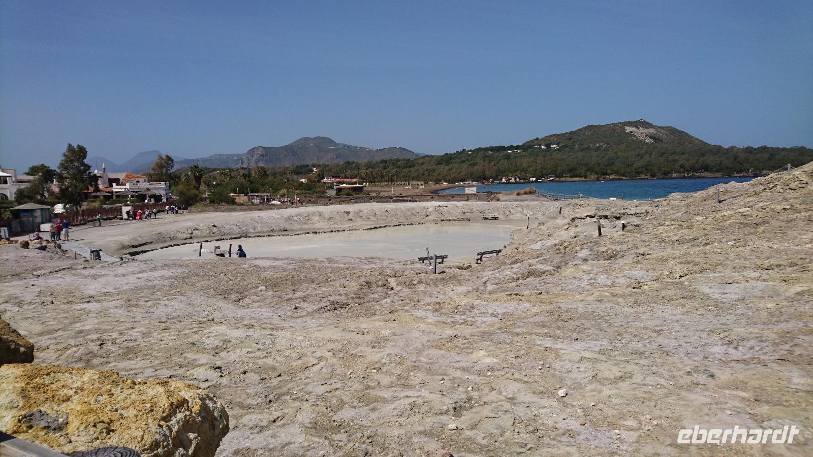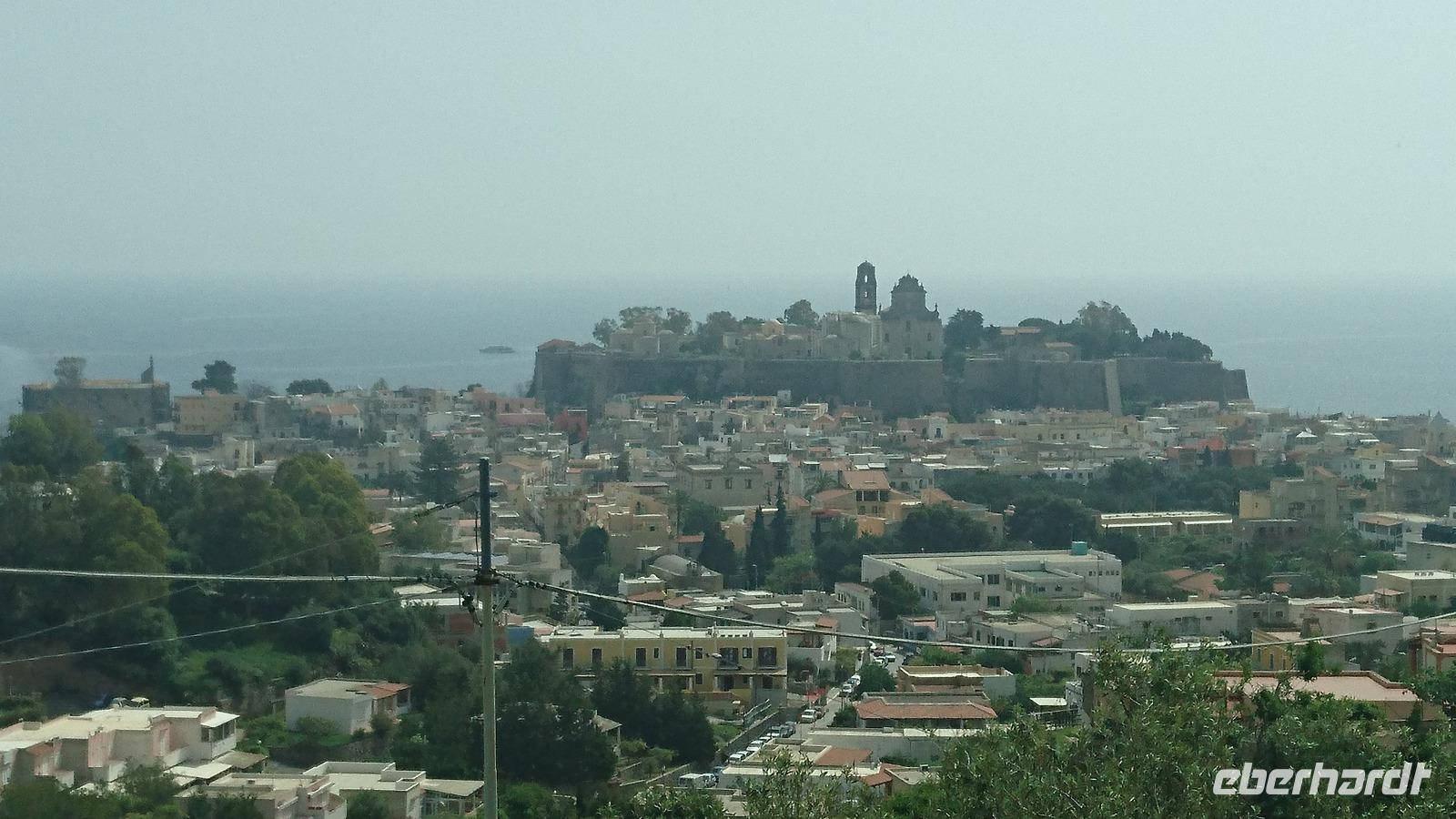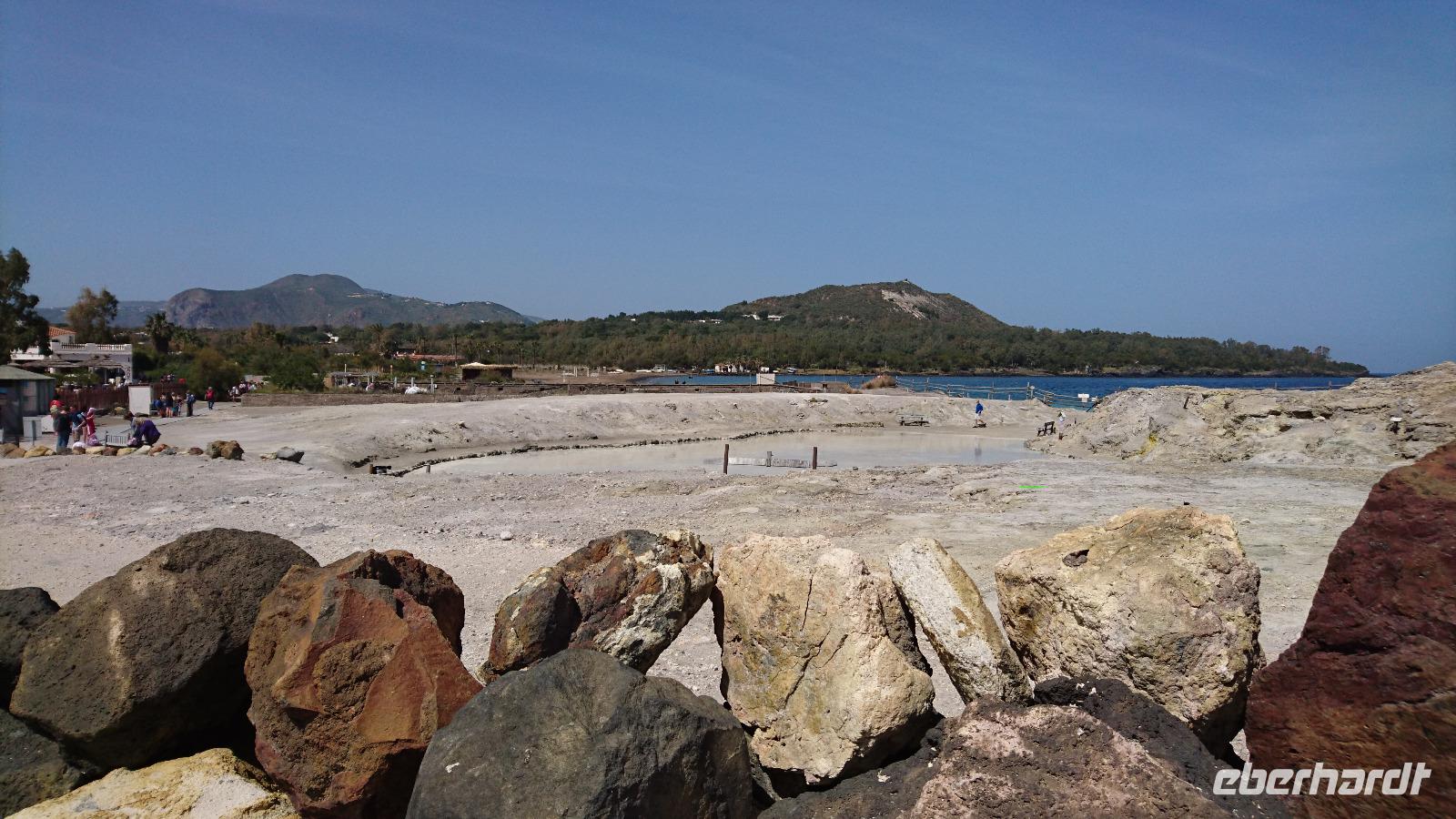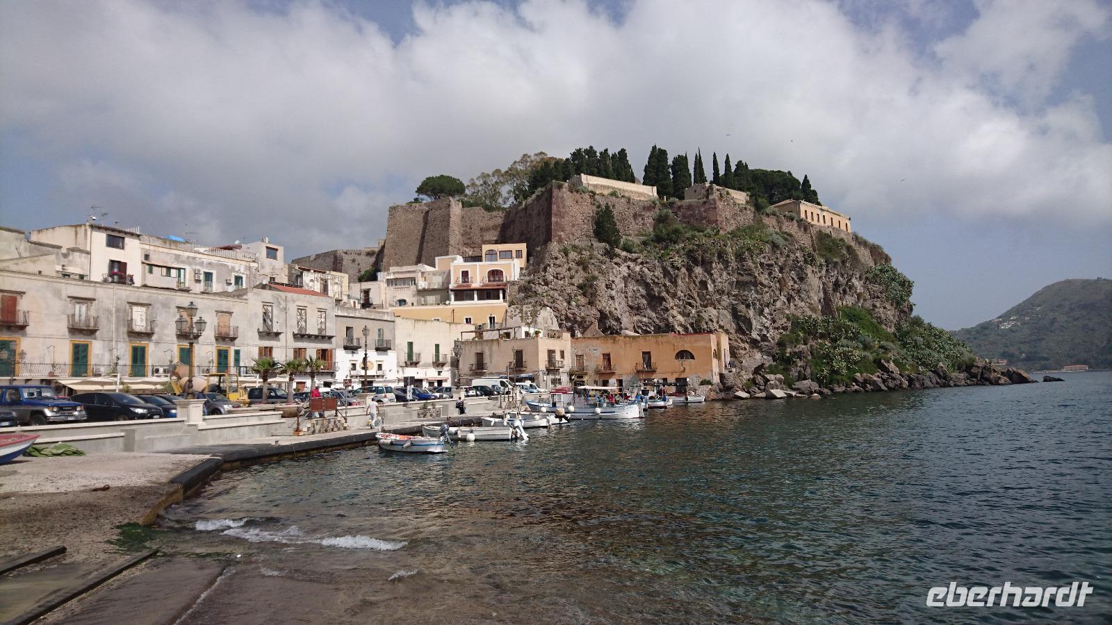 Will man an Land von A nach B, kann man zur Not auch laufen. Über Wasser könnte man schwimmen, doch im April ist das Meerwasser noch nicht sehr warm. So nahmen wir nach Frühstück und Kofferladen doch erst einmal Paolos Bus, der uns zum Hafen von Milazzo brachte. Hier bestiegen wir unser Schiff nach Lipari, bekamen zur einfachen Identifikation kleine gelbe Armbänder angeklebt und schauten bald aufs Land zurück, während unser Boot sich recht schnell der ersten und größten Äolischen Insel näherte. Ein befestigter Berg zeugte von alten Verteidigungswünschen der nördlich von Sizilien gelegenen Inselgruppe. Im Hafen angekommen, begann unser Fußweg durch den Hauptort zum Ausflugsbus, denn in rd. 1,5 Stunden wollten wir die Schönheiten der Insel erkunden. Dass auch hier die Erde laufend in Bewegung ist, erfuhren wir von Gertraude, denn zum Glück hatten wir einen kleinen und genau auf unsere Gruppengröße zugeschnittenen Bus. Größere mussten nach dreiviertel der Strecke wieder zurück. Wir konnten eine schmale Straße zurück zum Ausgangspunkt nehmen. Denn ein Erdrutsch hatte die eigentlich zu nutzende Straße natürlich gesperrt. Interessante Sichten hinüber nach Vulkano und Salina, spannende Geschichten rund um die Inseln und ihre Bewohner und neue Erkenntnisse zu verschiedensten von den Vulkanen ausgestoßenen Gesteinsarten begleiteten uns, ehe wir wieder im Hafen von Lipari ankamen und später nach einem individuellen Imbiss an Bord gingen. Doch noch ging es nicht zurück auf die sizilianische Hauptinsel. Wir sahen uns von Bord aus verschiedene Gesteinsformationen an den Inselkanten an, ehe wir Vulkano erreichten. Hier hatten wir wieder die Qual der Wahl. Einige wählten den Aufstieg auf den Vulkan von Vulkano, einige schauten sich die Schlammbäder der Insel an und wieder andere genossen Ruhe und ein gutes Mittagessen in einem der kleinen Restaurants im Ort oder im Hafen. Später am Nachmittag ging es dann wieder an Bord und wir erreichten später Milazzo, stiegen um in unseren Bus und fuhren zurück ins Naxos Beach Hotel, unserem ersten Hotel auf der Insel, welches nun auch die letzten beiden Nächte auf Sizilien unser Reise-Zuhause war. Gewohnte Atmosphäre umfing uns und wir bedienten uns vor der Nacht noch ausgiebig am Abendbuffet.