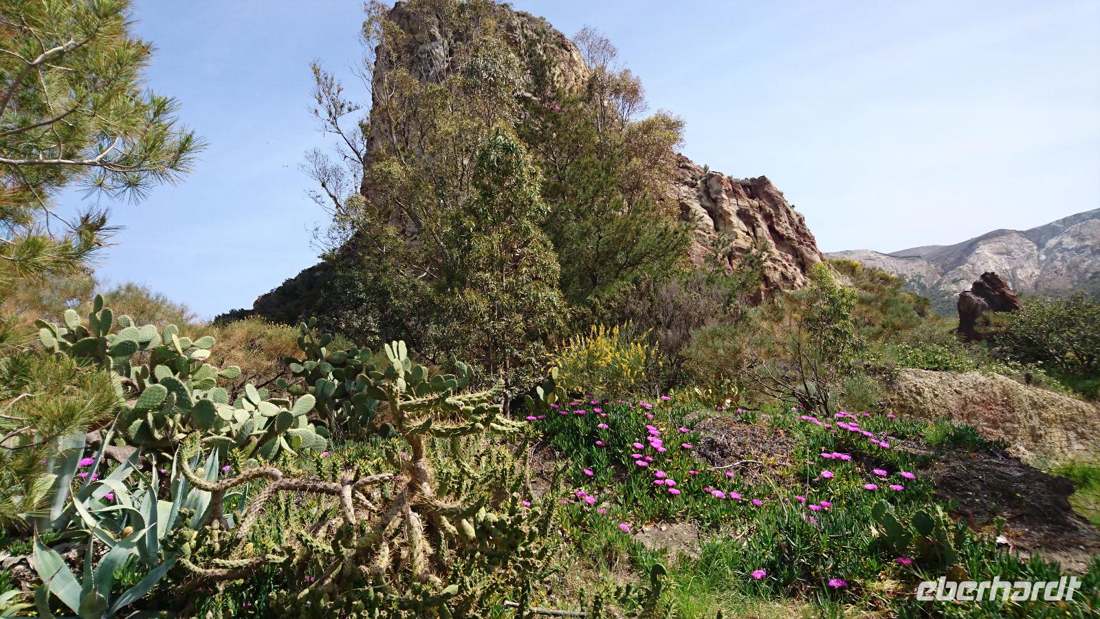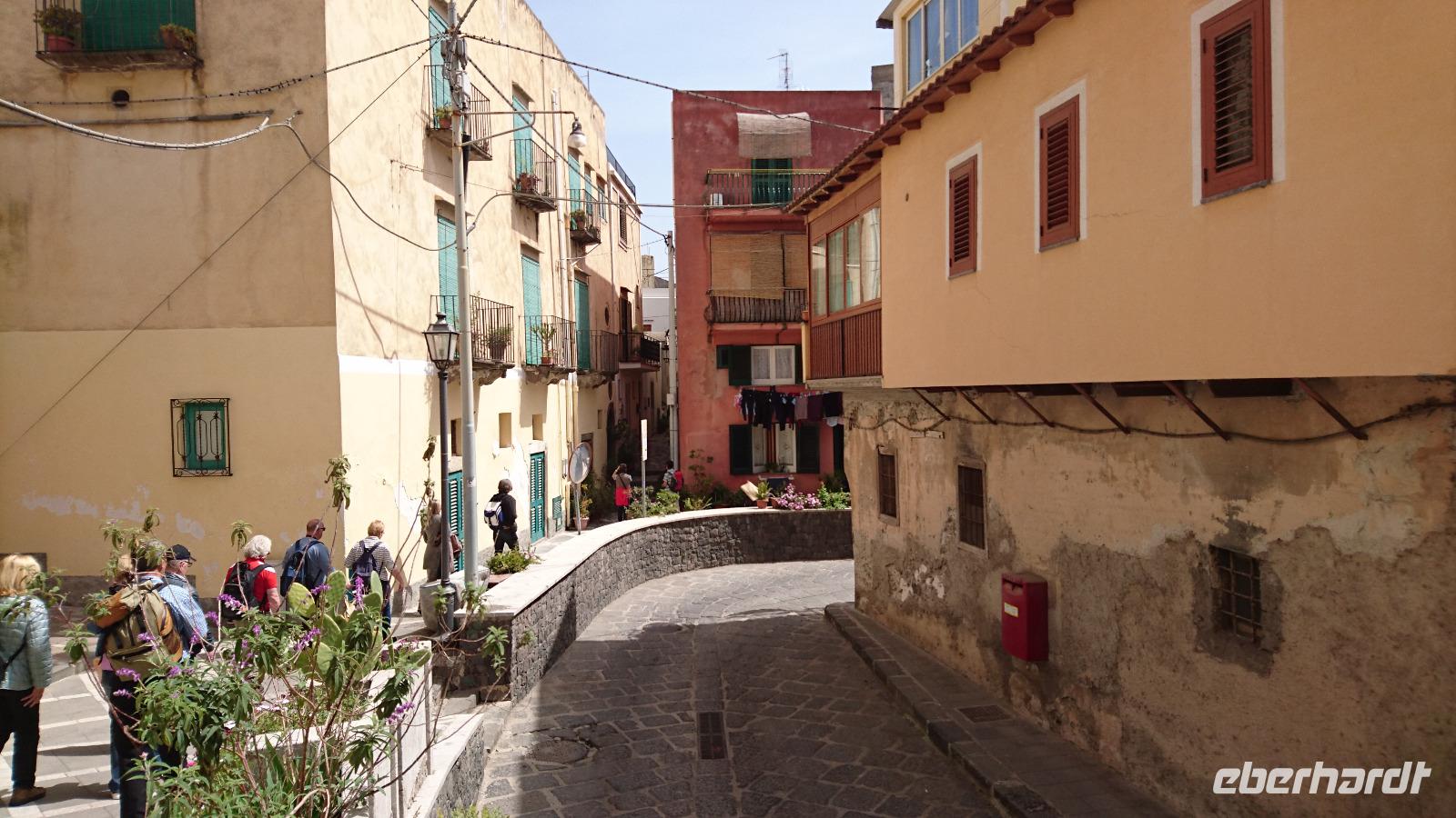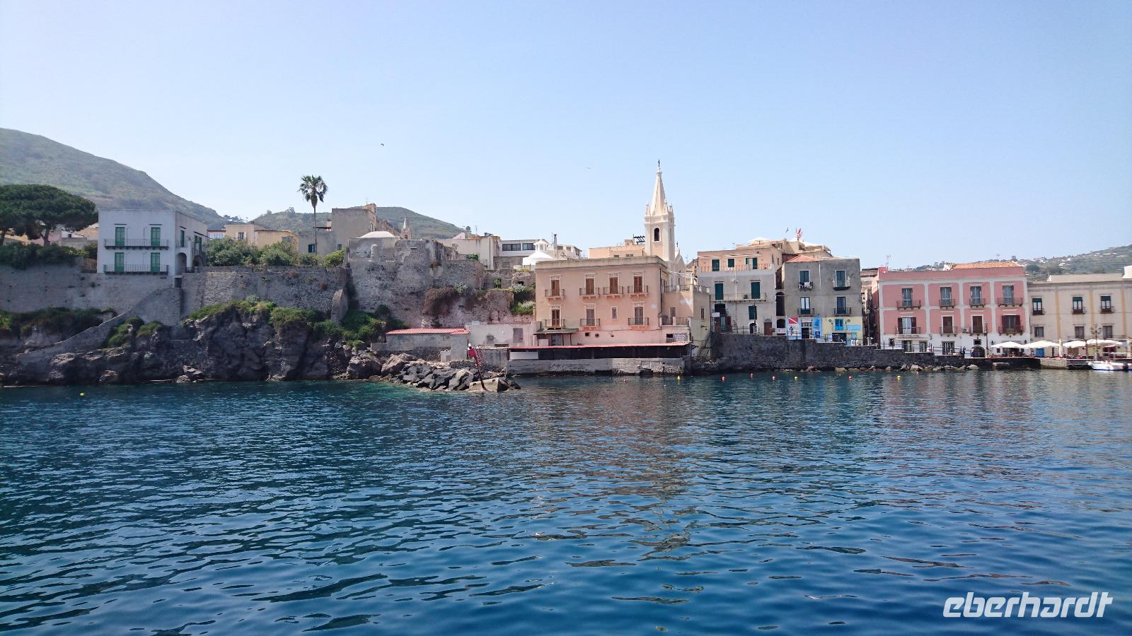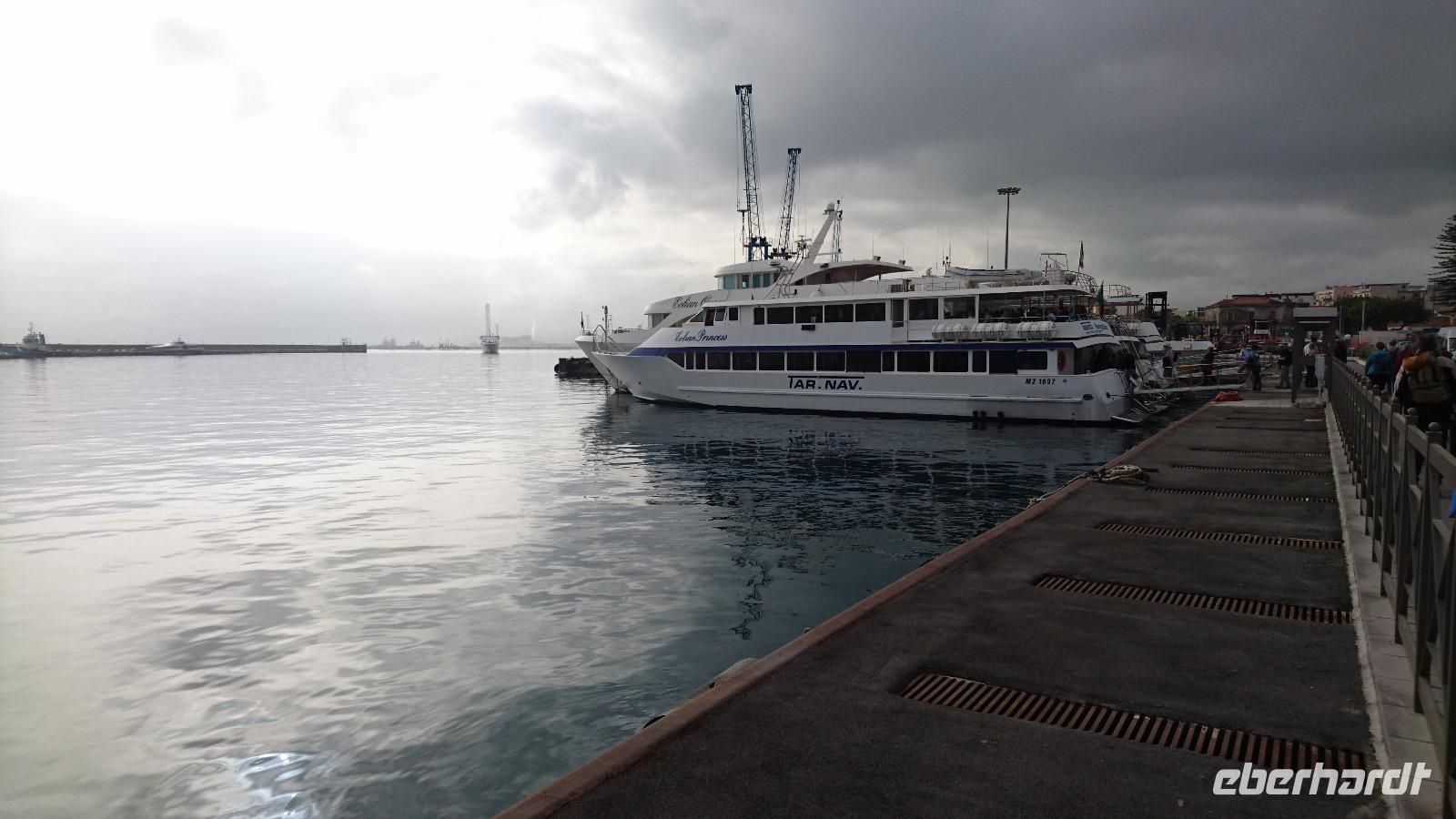 Will man an Land von A nach B, kann man zur Not auch laufen. Über Wasser könnte man schwimmen, doch im April ist das Meerwasser noch nicht sehr warm. So nahmen wir nach Frühstück und Kofferladen doch erst einmal Paolos Bus, der uns zum Hafen von Milazzo brachte. Hier bestiegen wir unser Schiff nach Lipari, bekamen zur einfachen Identifikation kleine gelbe Armbänder angeklebt und schauten bald aufs Land zurück, während unser Boot sich recht schnell der ersten und größten Äolischen Insel näherte. Ein befestigter Berg zeugte von alten Verteidigungswünschen der nördlich von Sizilien gelegenen Inselgruppe. Im Hafen angekommen, begann unser Fußweg durch den Hauptort zum Ausflugsbus, denn in rd. 1,5 Stunden wollten wir die Schönheiten der Insel erkunden. Dass auch hier die Erde laufend in Bewegung ist, erfuhren wir von Gertraude, denn zum Glück hatten wir einen kleinen und genau auf unsere Gruppengröße zugeschnittenen Bus. Größere mussten nach dreiviertel der Strecke wieder zurück. Wir konnten eine schmale Straße zurück zum Ausgangspunkt nehmen. Denn ein Erdrutsch hatte die eigentlich zu nutzende Straße natürlich gesperrt. Interessante Sichten hinüber nach Vulkano und Salina, spannende Geschichten rund um die Inseln und ihre Bewohner und neue Erkenntnisse zu verschiedensten von den Vulkanen ausgestoßenen Gesteinsarten begleiteten uns, ehe wir wieder im Hafen von Lipari ankamen und später nach einem individuellen Imbiss an Bord gingen. Doch noch ging es nicht zurück auf die sizilianische Hauptinsel. Wir sahen uns von Bord aus verschiedene Gesteinsformationen an den Inselkanten an, ehe wir Vulkano erreichten. Hier hatten wir wieder die Qual der Wahl. Einige wählten den Aufstieg auf den Vulkan von Vulkano, einige schauten sich die Schlammbäder der Insel an und wieder andere genossen Ruhe und ein gutes Mittagessen in einem der kleinen Restaurants im Ort oder im Hafen. Später am Nachmittag ging es dann wieder an Bord und wir erreichten später Milazzo, stiegen um in unseren Bus und fuhren zurück ins Naxos Beach Hotel, unserem ersten Hotel auf der Insel, welches nun auch die letzten beiden Nächte auf Sizilien unser Reise-Zuhause war. Gewohnte Atmosphäre umfing uns und wir bedienten uns vor der Nacht noch ausgiebig am Abendbuffet.