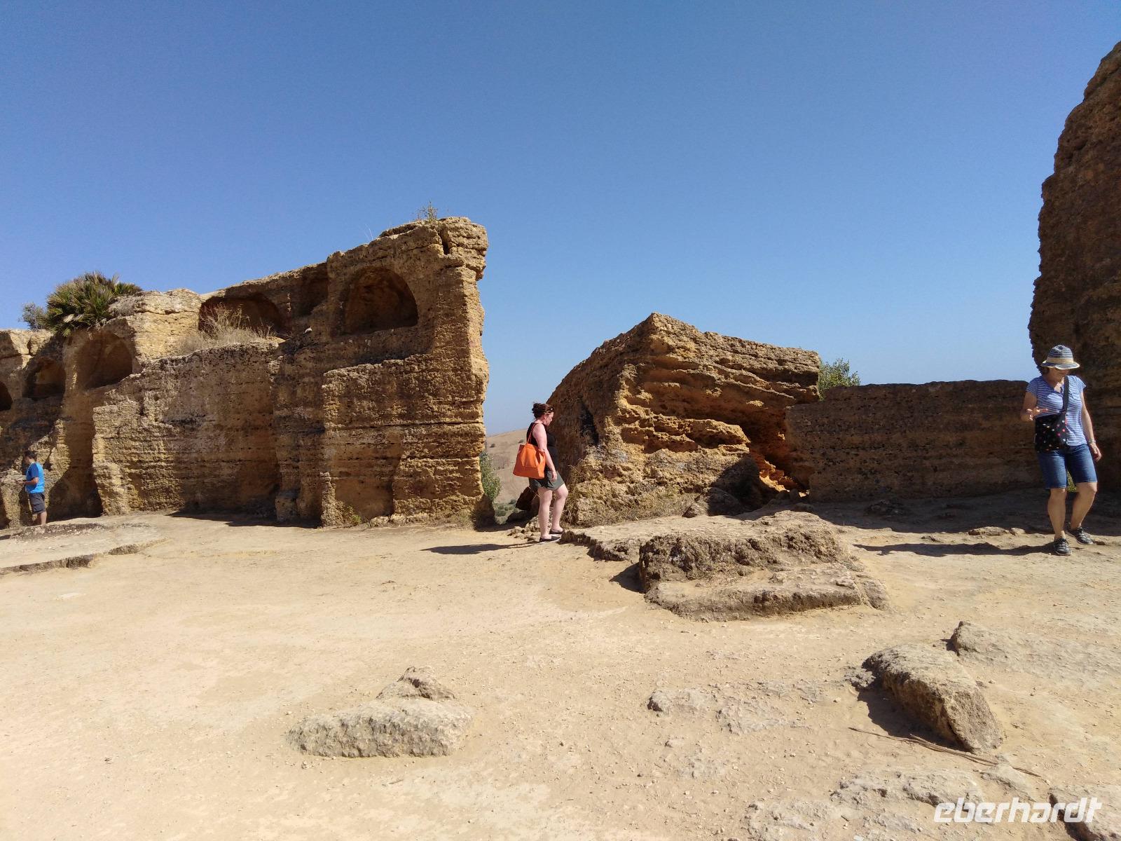 Nach einer Fahrt quer über die Insel erreichten wir die Villa Romana bei Piazza Amerina und schauten uns die architektonische Gesamtkomposition des antiken Landgutes an sowie seinen besonderen Schatz, die antiken Fußbodenmosaike, die infolge ihrere herausragenden Qualität zum UNESCO-Weltkulturerbe zählen. Das vielgliedrige Gebäude liefert noch heute genaue Vorstellungen, wie sich in der nachaugustäischen Zeit das Leben in dem Gutshof strukturierte. Nach diesem ausführlichen Rundgang durch die Villa, bei dem wir auch viel über sizilianische Lebensweise erfuhren, setzten wir unsere Reise mit der Besichtigung des Tempelareals von Agrigent fort. Vor unseren Augen erstand der Hera-Tempel, der Juno-, Concordia- und Jupiter-Tempel neu, denn Christiane erläuterte uns genau, wie sie entstanden und welche Funktionen sie seinerzeit erfüllten. Seit längerer Zeit gehört diese Tempel- und Weihestätte zum UNESCO-Weltkulturerbe.