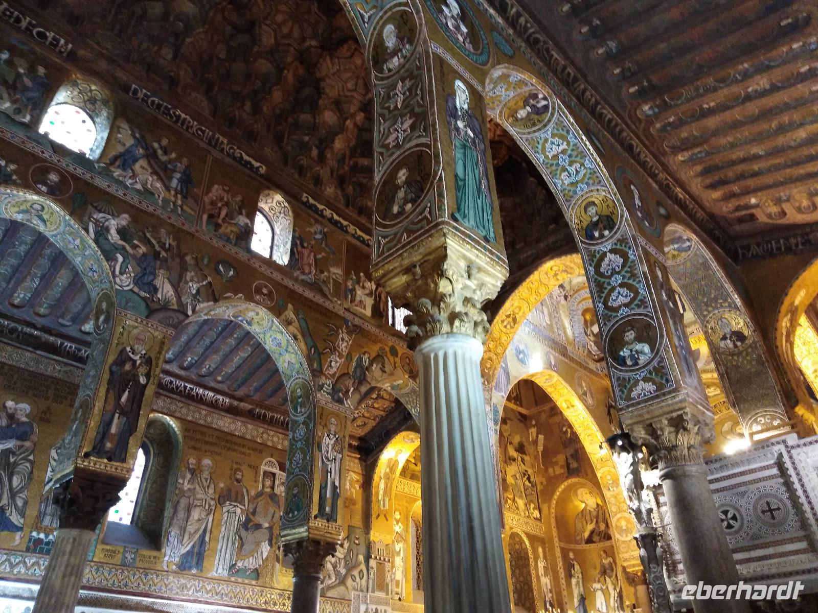 Gegen 10.30 Uhr erreichten wir Palermo und zunächst kämpften wir uns durch Besuchermassen, um im Palazzo Reale (Normanni) die Cappella Palatina, die Palastkapelle von Roger II., anzusehen. Dieses Schmuckstück normannischer Architektur und Innengestaltung vermittelt dem Betrachter eine Harmonie und Herrlichkeit der Gestaltung, wie sie selten anzutreffen ist. Die Cappella ist ein internationaler Besuchermagnet.