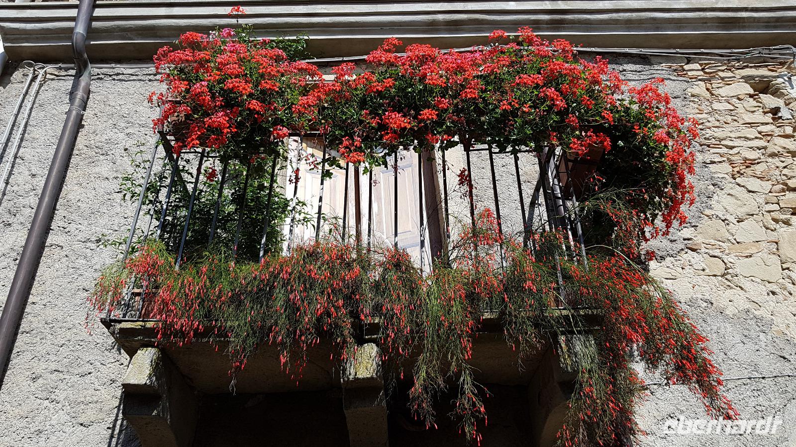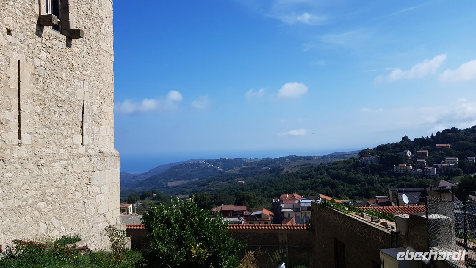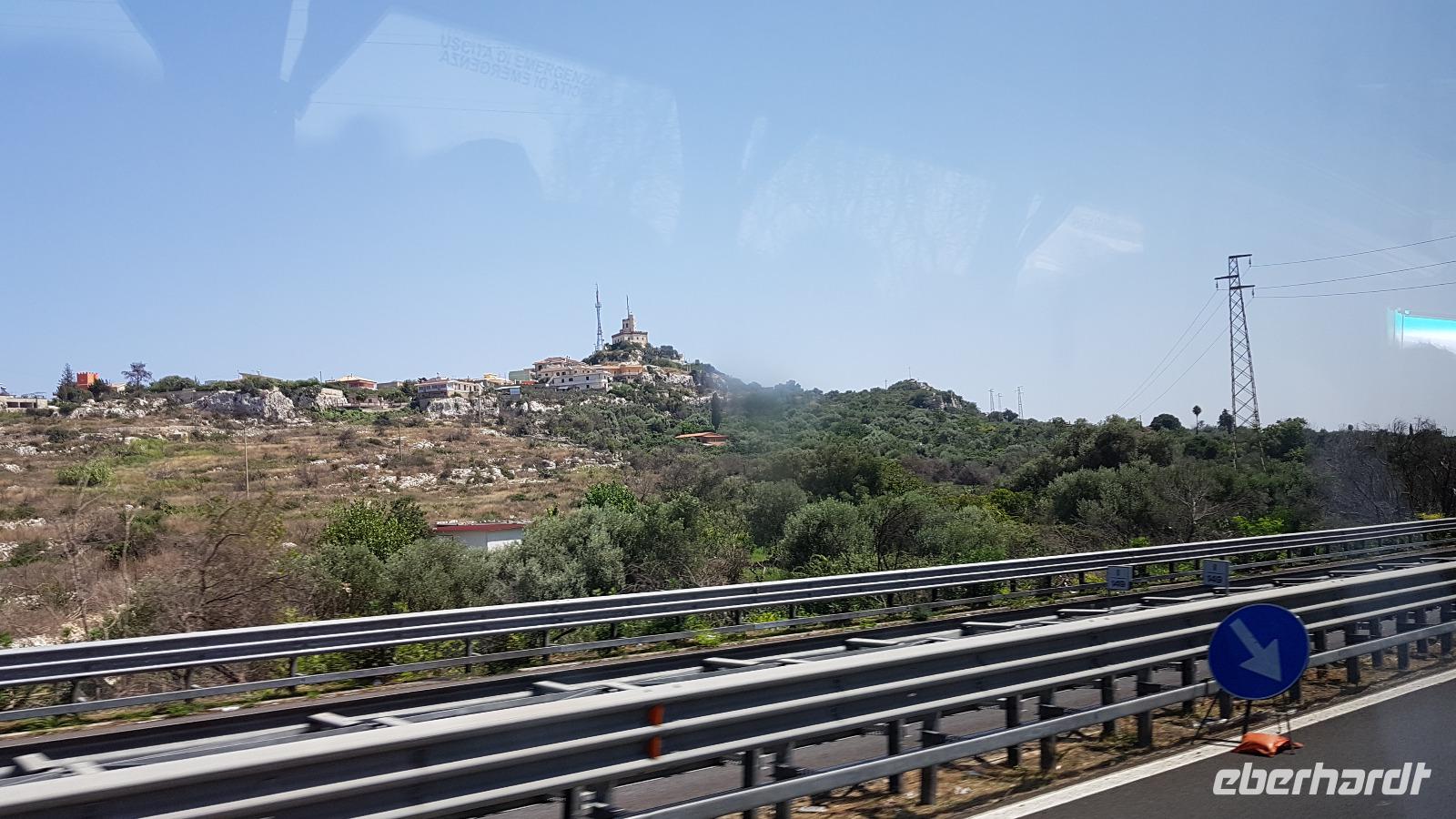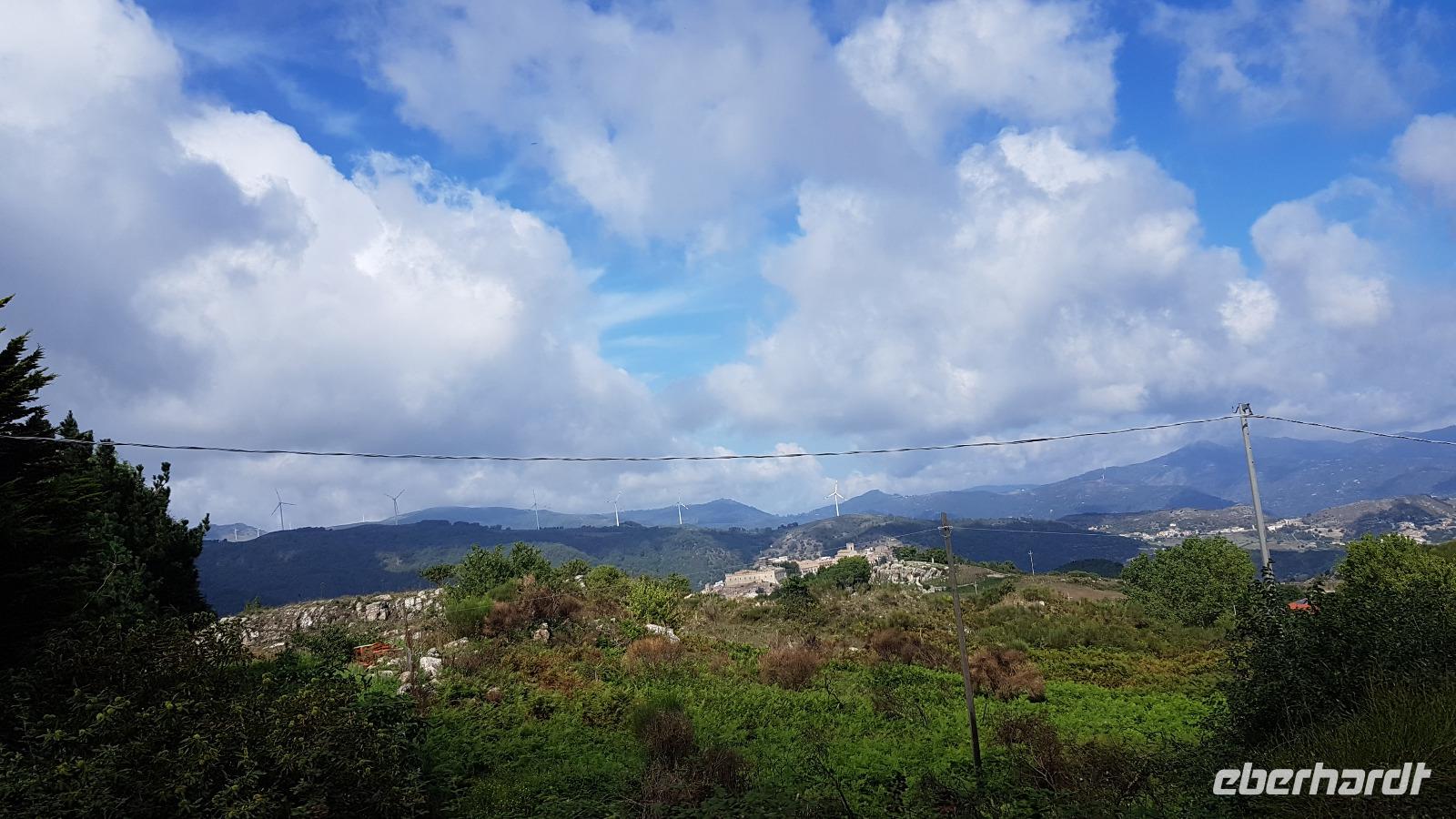 Heute nehmen wir Abschied von der Nordküste, unsere Reise führt uns durch das Nebrodi Gebirge zurück nach Giardini Naxos. Dunkle Wolken sind aufgezogen und wir verabschieden uns von Milazzo mit Blitz und Donner. Unser erstes Ziel dann heißt Montalbano Elicona. Einst eines der schönsten Dörfer Siziliens wird es heute zunehmend ruhiger im Ort. Viele ziehen weg, es fehlt an Arbeit und Perspektiven für junge Leute. In einem Cafe genießen wir erst einmal einen leckeren Espresso, dann geht es weiter. Leider wird das Castell gerade gebaut, so können wir es nicht besuchen, nutzen aber die Zeit für einen Spaziergang durch den Ort. Auf den Straßen sind zum Teil Ornamente aufgemalt und Renate erzählt uns, dass das quasi Vorlagen sind für die Blumenteppiche, die einmal im Jahr ausgelegt werden. Dann treffen sich traditionelle Gruppen hier, alle haben ihr eigenes Enblem und Wappen, das sehen wir auch an vielen Balkonen. Dann geht es weiter und Luca fährt uns sicher durch das Nebrodi-Gebirge mit seinen engen Serpentinen. Dann halten wir und ein kurzer Spaziergang führt uns zum Adlerfelsen.