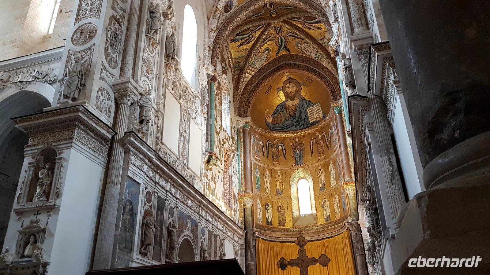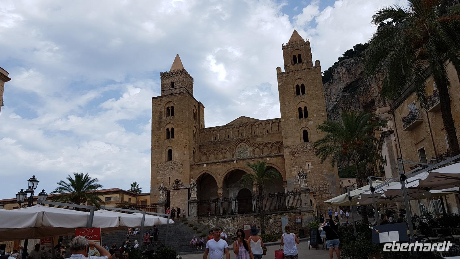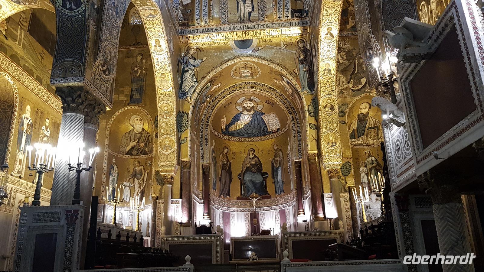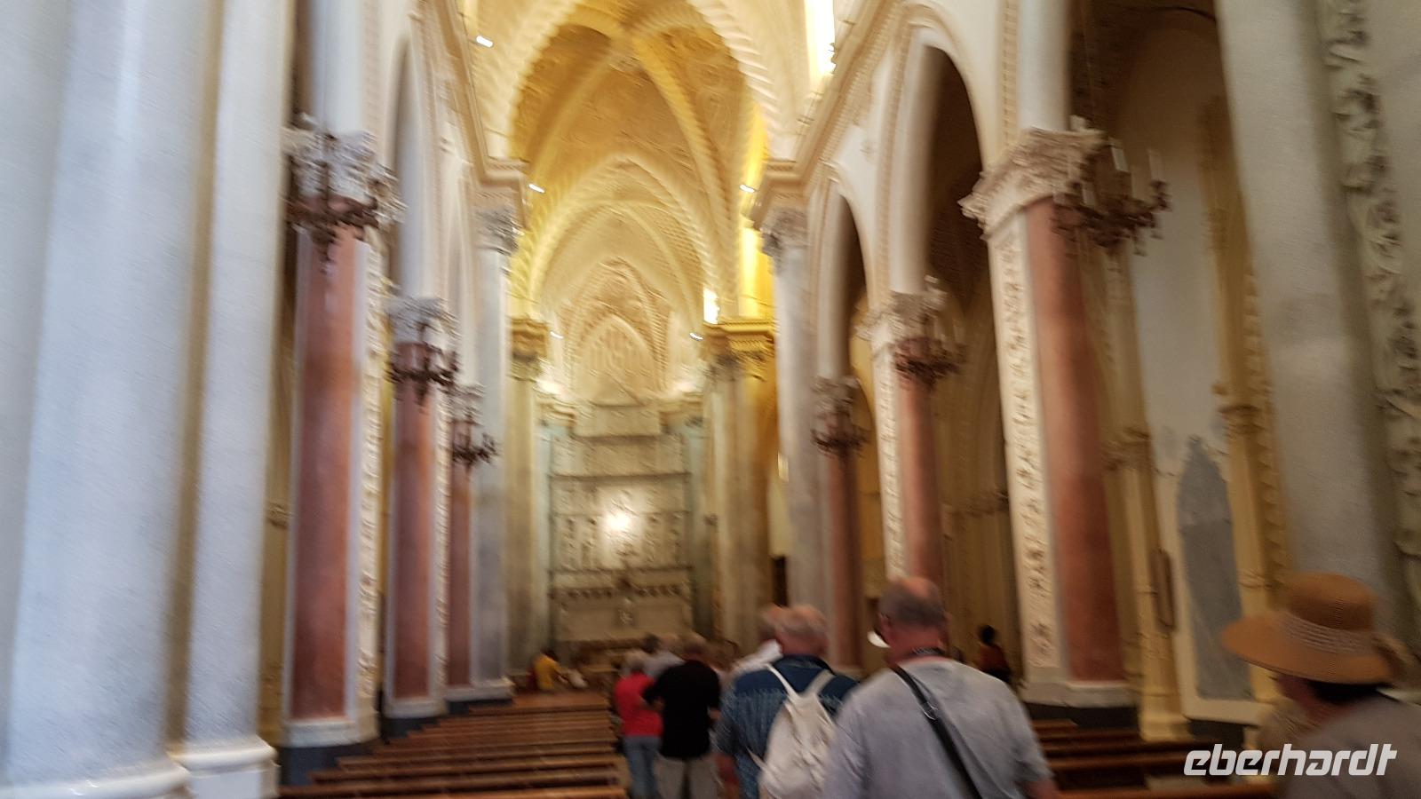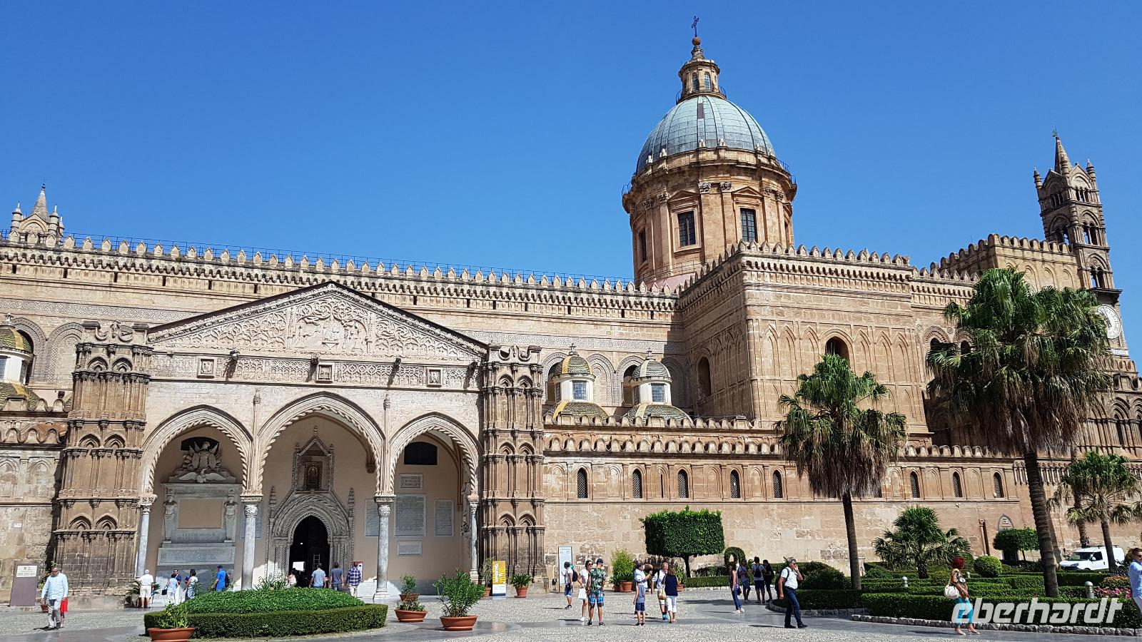 Heute heißt es wieder Koffer packen. Unsere Reise durch Sizilien führt uns in die Hauptstadt und an die Nordküste der Insel. Wir fahren an den Obelisken vorbei, Mahnmale für die von der Mafia ermordeten Richter und hoch über der Attentatsstelle prangt groß "No Mafia". Ein Hoffnungszeichen. Dann grüßt bereits der Monte Pellegrino und erstaunlich gut kommen wir in Palermo voran. Man merkt, dass Ferien sind, der Verkehr sei noch erträglich, meint Renate. Zuerst besuchen wir die Capella Palatina. Da im Normannenpalast auch das sizilianische Parlament untergebracht ist mussten wir durch eine Sicherheitskontrolle und konnten dann ohne Wartezeiten gleich die Capella betreten. Was für ein Glanz! Renate erzählte uns zu den Mosaiken, wie sie ringsumher die Szenen der Bibel darstellten, auch die arabischen Spuren sind noch sichtbar, die Mosaiken im Fußboden zum Beispiel oder an den Wänden. Da sie keine Menschen oder Gott bildlich darstellen können wir phantastische Ornamente bestaunen. Dann spazieren wir weiter zur Kathedrale und auch hier erfahren wir viel über den Bau, wie über die Jahrhunderte immer wieder Anbauten vorgenommen wurden bis sie ihre heutigen Ausmaße erreichte. Im Inneren dann überraschte ein Meridian mit Tierkreiszeichen. Immer 13 Uhr fällt ein Sonnenstrahl durch einen Spalt in der Kuppel genau auf das Zeichen, das gerade aktuell ist. Renate erzählt uns von der heiligen Rosalia, deren Schrein hier das wichtigste Ziel vieler Sizilianer ist. Interessant dann auch der Schrein für den Pater, der sich um Kinder und Jugendliche kümmerte, damit sie nicht in die Szene der Mafia abrutschten. Dafür wurde er von der Mafia ermordet. Natürlich- Eberhardt Travel macht´s möglich- besuchten wir auch die Staufergräber. Renate erzählt uns von den Königen um Friedrich II und ihren Sarkophagen hier. Dann war Zeit für ein wenig Ruhe bevor wir weiter durch Palermo spazieren. Am Rathaus stoppen wir kurz und können den sogenannten Schambrunnen sehen. Der war eigentlich für eine große Villa erbaut worden, deren Besitzer sich den dann aber doch nicht leisten konnte. So kaufte die Stadt diesen Brunnen und man sagt, dass daher der Name käme- eine Schande- es gäbe wichtigere Dinge in der Stadt, für die das Geld fehle, andere sagen, dass die Nonnen im gegenüberliegenden Kloster immer auf den Brunnen schauen mussten, der ja mit vielen unbekleideten Figuren geschmückt ist- nun ja. An der Quattro Canti (4 Ecken) genannten Kreuzung treffen sich die zwei Verkehrsachsen Corso Vittorio Emanuele und Via Maqueda, der Platz ist voller barocker Architektur und bereits geschmückt, da am 15. September der Papst in Palermo erwartet wird. Vom Teatro del Sole (so wird der Platz genannt, weil immer Sonne auf eine der 4 Ecken scheint) ging es weiter zum Teatro Massimo. Die drittgrößte Oper in Europa und die größte Italiens. Von hier aus konnte jeder individuell die Stadt erkunden und eine Kleinigkeit essen, dann trafen wir uns wieder und fuhren weiter nach Cefalu.