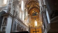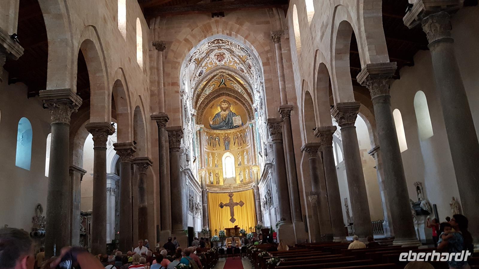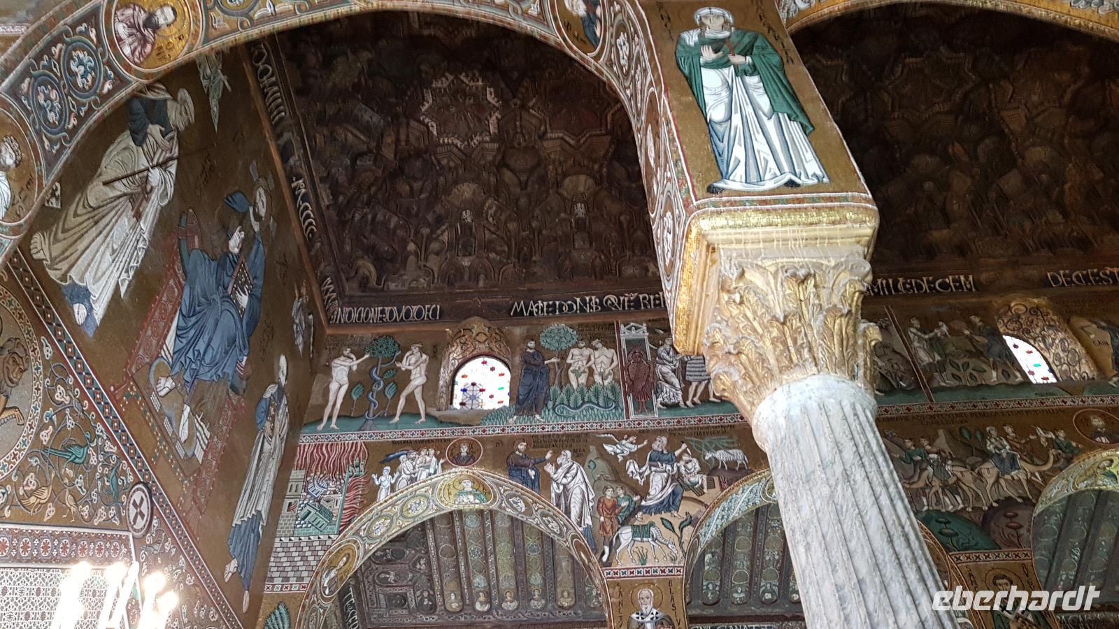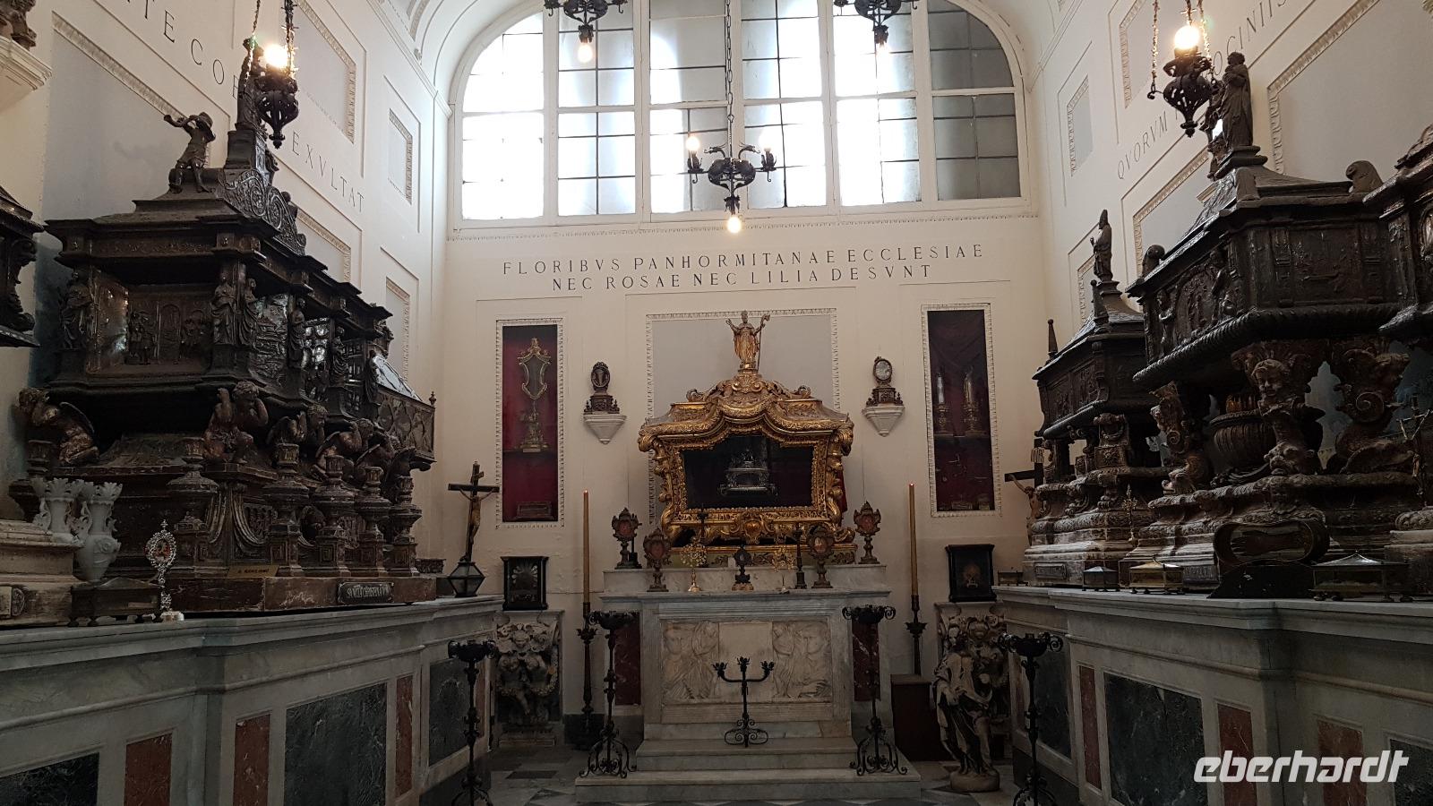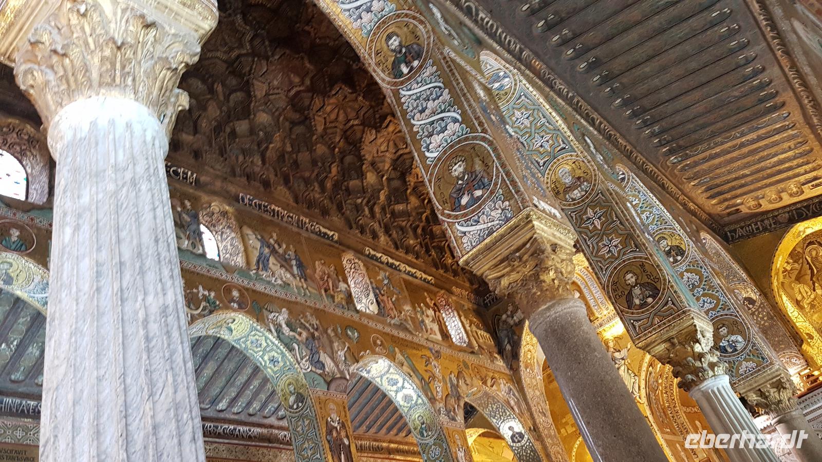 Heute heißt es wieder Koffer packen. Unsere Reise durch Sizilien führt uns in die Hauptstadt und an die Nordküste der Insel. Wir fahren an den Obelisken vorbei, Mahnmale für die von der Mafia ermordeten Richter und hoch über der Attentatsstelle prangt groß "No Mafia". Ein Hoffnungszeichen. Dann grüßt bereits der Monte Pellegrino und erstaunlich gut kommen wir in Palermo voran. Man merkt, dass Ferien sind, der Verkehr sei noch erträglich, meint Renate. Zuerst besuchen wir die Capella Palatina. Da im Normannenpalast auch das sizilianische Parlament untergebracht ist mussten wir durch eine Sicherheitskontrolle und konnten dann ohne Wartezeiten gleich die Capella betreten. Was für ein Glanz! Renate erzählte uns zu den Mosaiken, wie sie ringsumher die Szenen der Bibel darstellten, auch die arabischen Spuren sind noch sichtbar, die Mosaiken im Fußboden zum Beispiel oder an den Wänden. Da sie keine Menschen oder Gott bildlich darstellen können wir phantastische Ornamente bestaunen. Dann spazieren wir weiter zur Kathedrale und auch hier erfahren wir viel über den Bau, wie über die Jahrhunderte immer wieder Anbauten vorgenommen wurden bis sie ihre heutigen Ausmaße erreichte. Im Inneren dann überraschte ein Meridian mit Tierkreiszeichen. Immer 13 Uhr fällt ein Sonnenstrahl durch einen Spalt in der Kuppel genau auf das Zeichen, das gerade aktuell ist. Renate erzählt uns von der heiligen Rosalia, deren Schrein hier das wichtigste Ziel vieler Sizilianer ist. Interessant dann auch der Schrein für den Pater, der sich um Kinder und Jugendliche kümmerte, damit sie nicht in die Szene der Mafia abrutschten. Dafür wurde er von der Mafia ermordet. Natürlich- Eberhardt Travel macht´s möglich- besuchten wir auch die Staufergräber. Renate erzählt uns von den Königen um Friedrich II und ihren Sarkophagen hier. Dann war Zeit für ein wenig Ruhe bevor wir weiter durch Palermo spazieren. Am Rathaus stoppen wir kurz und können den sogenannten Schambrunnen sehen. Der war eigentlich für eine große Villa erbaut worden, deren Besitzer sich den dann aber doch nicht leisten konnte. So kaufte die Stadt diesen Brunnen und man sagt, dass daher der Name käme- eine Schande- es gäbe wichtigere Dinge in der Stadt, für die das Geld fehle, andere sagen, dass die Nonnen im gegenüberliegenden Kloster immer auf den Brunnen schauen mussten, der ja mit vielen unbekleideten Figuren geschmückt ist- nun ja. An der Quattro Canti (4 Ecken) genannten Kreuzung treffen sich die zwei Verkehrsachsen Corso Vittorio Emanuele und Via Maqueda, der Platz ist voller barocker Architektur und bereits geschmückt, da am 15. September der Papst in Palermo erwartet wird. Vom Teatro del Sole (so wird der Platz genannt, weil immer Sonne auf eine der 4 Ecken scheint) ging es weiter zum Teatro Massimo. Die drittgrößte Oper in Europa und die größte Italiens. Von hier aus konnte jeder individuell die Stadt erkunden und eine Kleinigkeit essen, dann trafen wir uns wieder und fuhren weiter nach Cefalu.