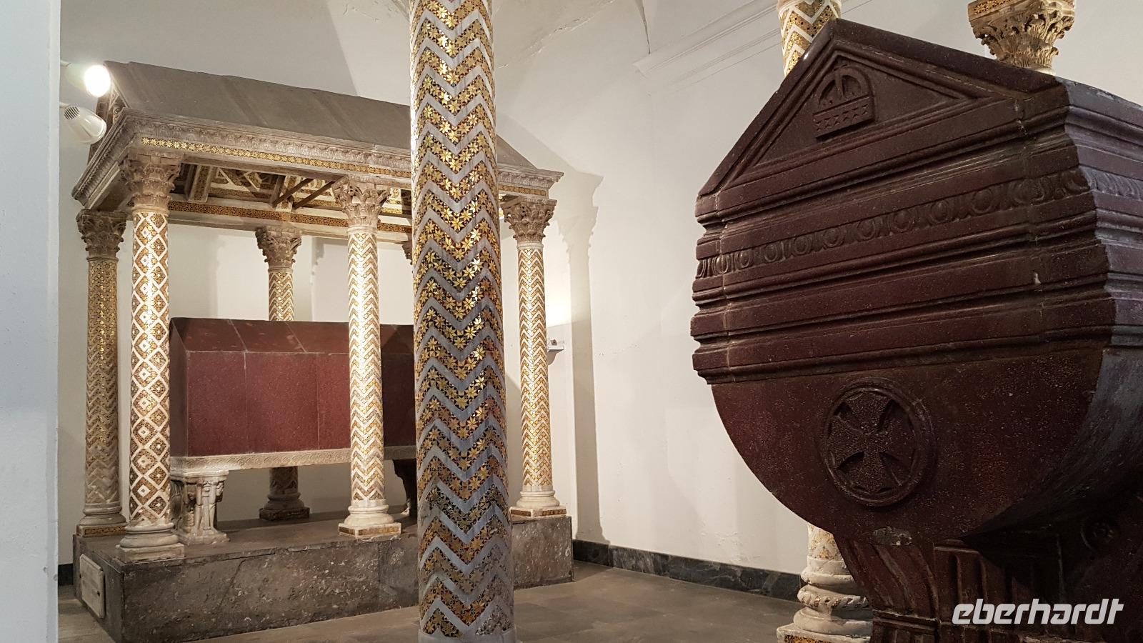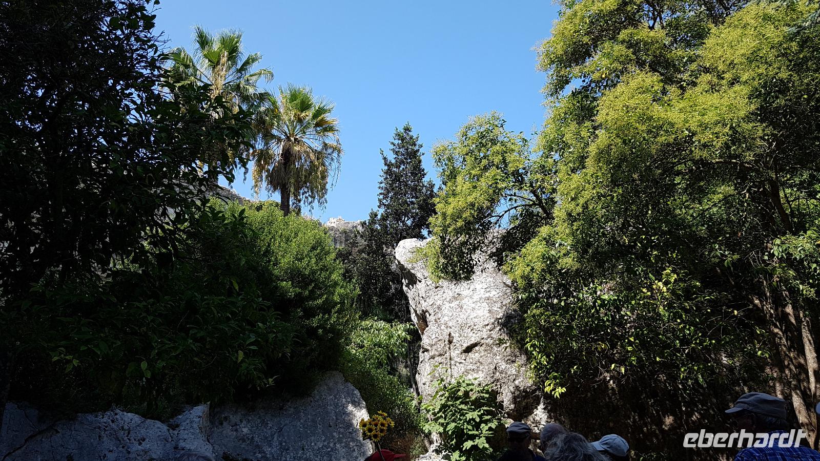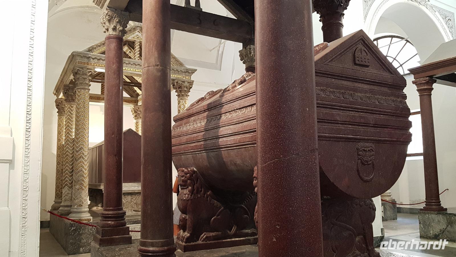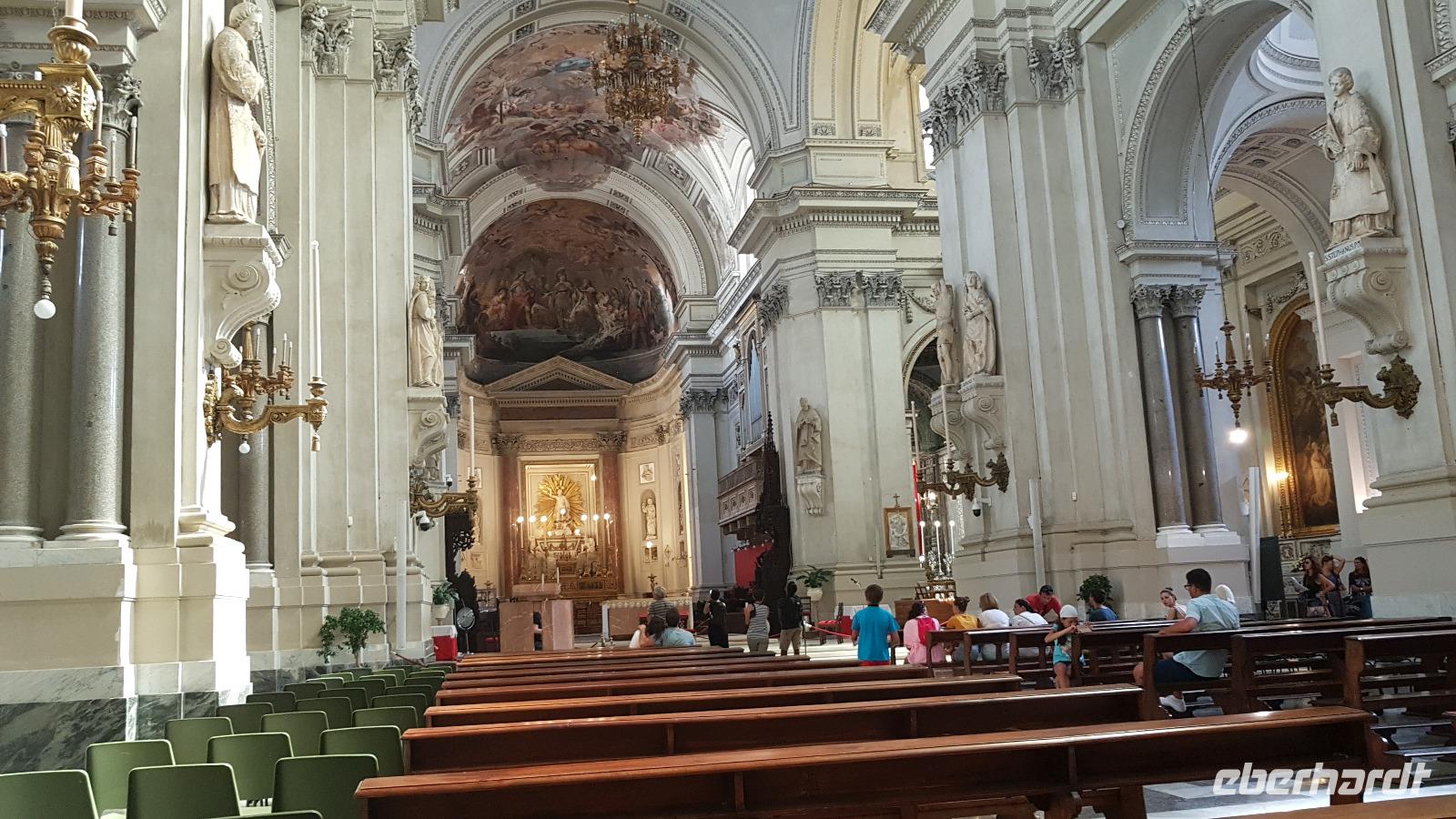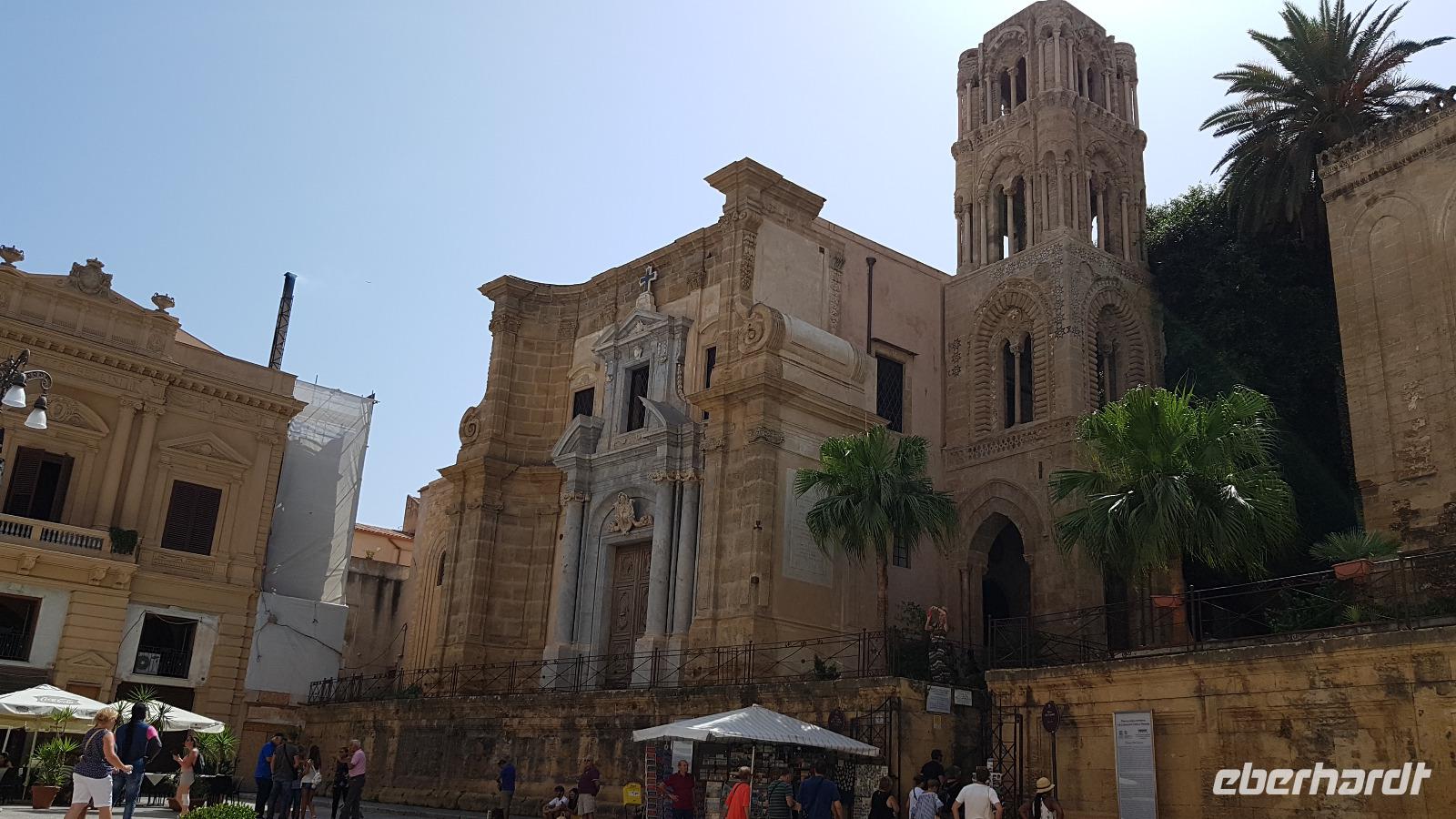 Heute heißt es wieder Koffer packen. Unsere Reise durch Sizilien führt uns in die Hauptstadt und an die Nordküste der Insel. Wir fahren an den Obelisken vorbei, Mahnmale für die von der Mafia ermordeten Richter und hoch über der Attentatsstelle prangt groß "No Mafia". Ein Hoffnungszeichen. Dann grüßt bereits der Monte Pellegrino und erstaunlich gut kommen wir in Palermo voran. Man merkt, dass Ferien sind, der Verkehr sei noch erträglich, meint Renate. Zuerst besuchen wir die Capella Palatina. Da im Normannenpalast auch das sizilianische Parlament untergebracht ist mussten wir durch eine Sicherheitskontrolle und konnten dann ohne Wartezeiten gleich die Capella betreten. Was für ein Glanz! Renate erzählte uns zu den Mosaiken, wie sie ringsumher die Szenen der Bibel darstellten, auch die arabischen Spuren sind noch sichtbar, die Mosaiken im Fußboden zum Beispiel oder an den Wänden. Da sie keine Menschen oder Gott bildlich darstellen können wir phantastische Ornamente bestaunen. Dann spazieren wir weiter zur Kathedrale und auch hier erfahren wir viel über den Bau, wie über die Jahrhunderte immer wieder Anbauten vorgenommen wurden bis sie ihre heutigen Ausmaße erreichte. Im Inneren dann überraschte ein Meridian mit Tierkreiszeichen. Immer 13 Uhr fällt ein Sonnenstrahl durch einen Spalt in der Kuppel genau auf das Zeichen, das gerade aktuell ist. Renate erzählt uns von der heiligen Rosalia, deren Schrein hier das wichtigste Ziel vieler Sizilianer ist. Interessant dann auch der Schrein für den Pater, der sich um Kinder und Jugendliche kümmerte, damit sie nicht in die Szene der Mafia abrutschten. Dafür wurde er von der Mafia ermordet. Natürlich- Eberhardt Travel macht´s möglich- besuchten wir auch die Staufergräber. Renate erzählt uns von den Königen um Friedrich II und ihren Sarkophagen hier. Dann war Zeit für ein wenig Ruhe bevor wir weiter durch Palermo spazieren. Am Rathaus stoppen wir kurz und können den sogenannten Schambrunnen sehen. Der war eigentlich für eine große Villa erbaut worden, deren Besitzer sich den dann aber doch nicht leisten konnte. So kaufte die Stadt diesen Brunnen und man sagt, dass daher der Name käme- eine Schande- es gäbe wichtigere Dinge in der Stadt, für die das Geld fehle, andere sagen, dass die Nonnen im gegenüberliegenden Kloster immer auf den Brunnen schauen mussten, der ja mit vielen unbekleideten Figuren geschmückt ist- nun ja. An der Quattro Canti (4 Ecken) genannten Kreuzung treffen sich die zwei Verkehrsachsen Corso Vittorio Emanuele und Via Maqueda, der Platz ist voller barocker Architektur und bereits geschmückt, da am 15. September der Papst in Palermo erwartet wird. Vom Teatro del Sole (so wird der Platz genannt, weil immer Sonne auf eine der 4 Ecken scheint) ging es weiter zum Teatro Massimo. Die drittgrößte Oper in Europa und die größte Italiens. Von hier aus konnte jeder individuell die Stadt erkunden und eine Kleinigkeit essen, dann trafen wir uns wieder und fuhren weiter nach Cefalu.