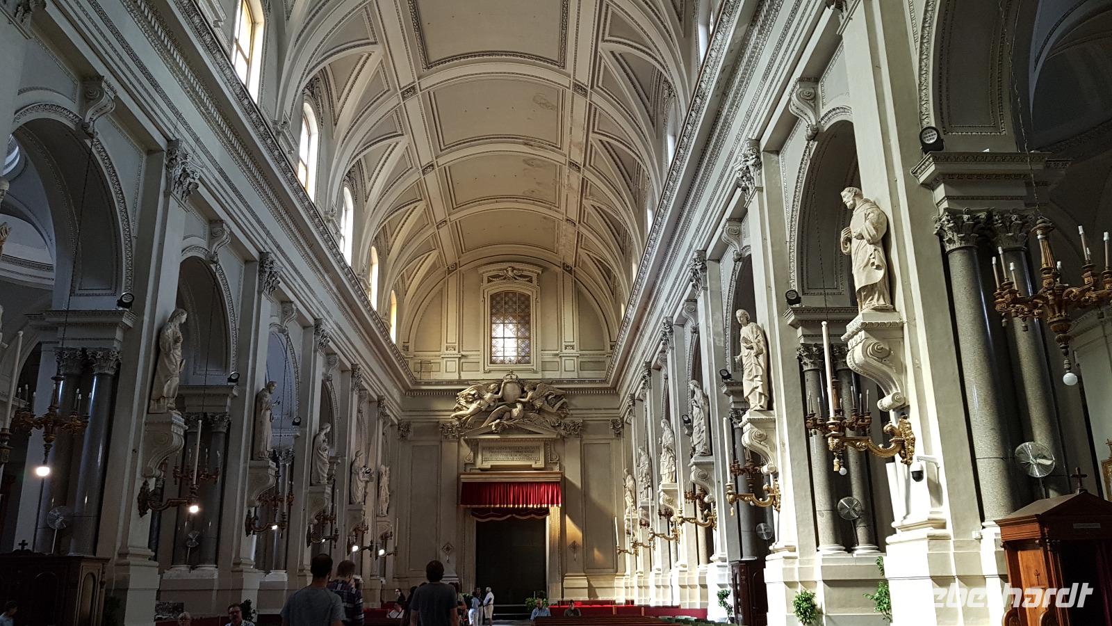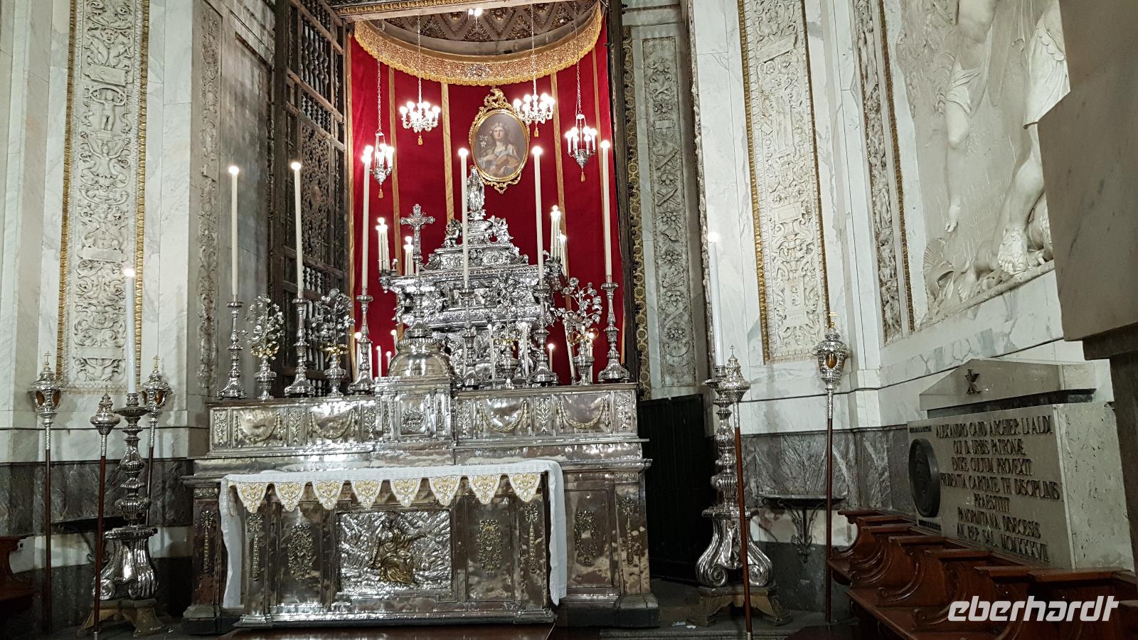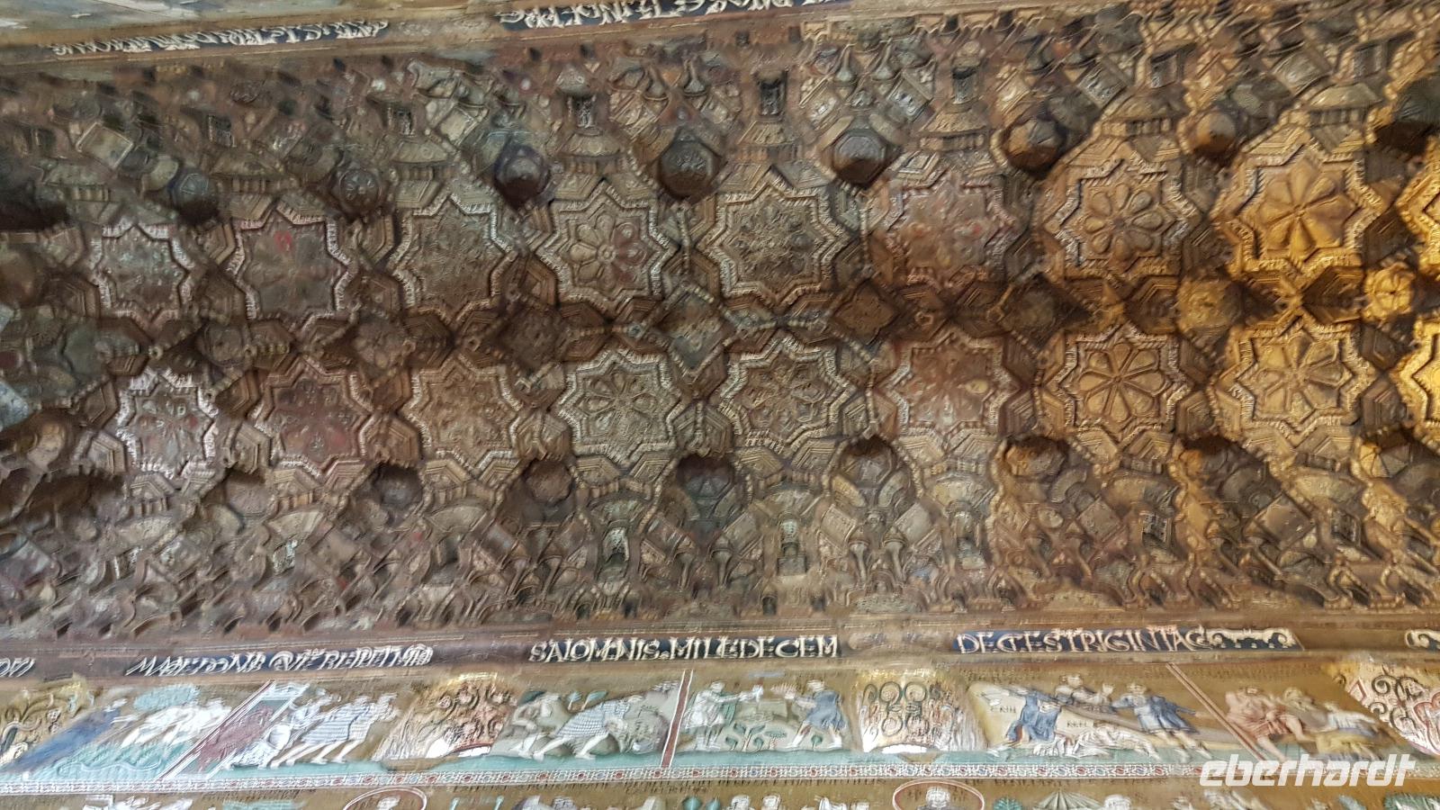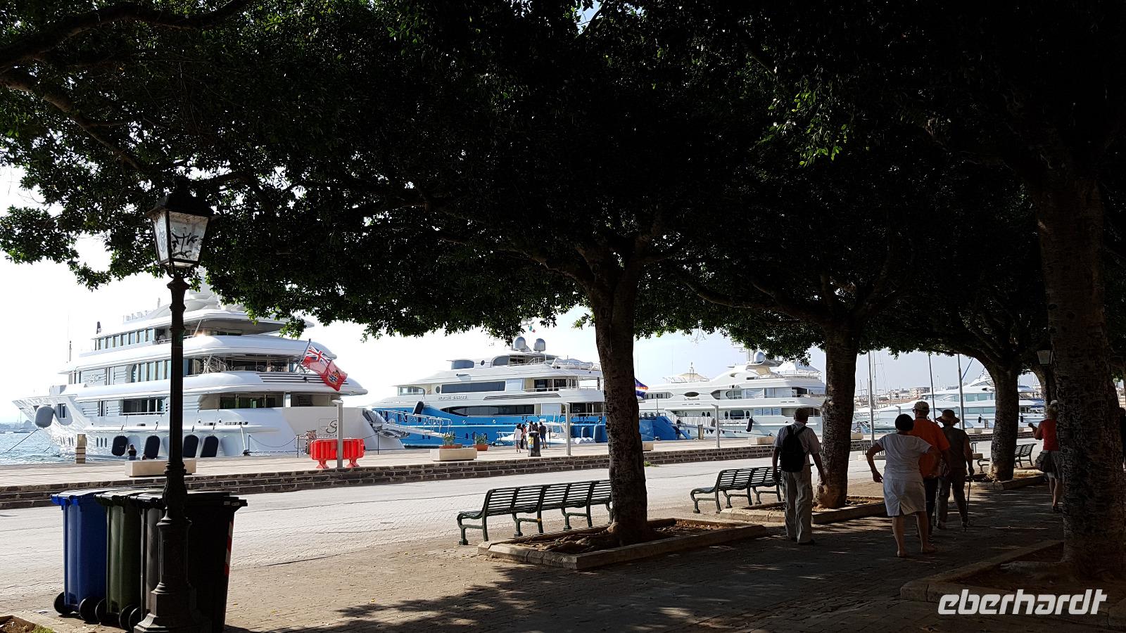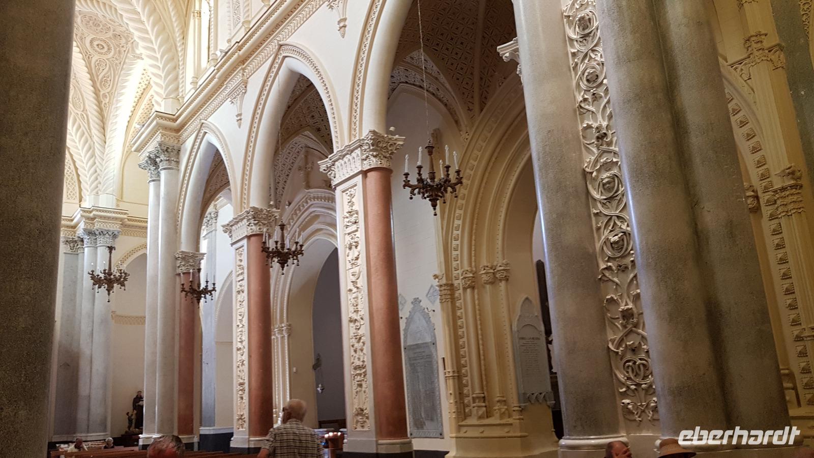 Heute heißt es wieder Koffer packen. Unsere Reise durch Sizilien führt uns in die Hauptstadt und an die Nordküste der Insel. Wir fahren an den Obelisken vorbei, Mahnmale für die von der Mafia ermordeten Richter und hoch über der Attentatsstelle prangt groß "No Mafia". Ein Hoffnungszeichen. Dann grüßt bereits der Monte Pellegrino und erstaunlich gut kommen wir in Palermo voran. Man merkt, dass Ferien sind, der Verkehr sei noch erträglich, meint Renate. Zuerst besuchen wir die Capella Palatina. Da im Normannenpalast auch das sizilianische Parlament untergebracht ist mussten wir durch eine Sicherheitskontrolle und konnten dann ohne Wartezeiten gleich die Capella betreten. Was für ein Glanz! Renate erzählte uns zu den Mosaiken, wie sie ringsumher die Szenen der Bibel darstellten, auch die arabischen Spuren sind noch sichtbar, die Mosaiken im Fußboden zum Beispiel oder an den Wänden. Da sie keine Menschen oder Gott bildlich darstellen können wir phantastische Ornamente bestaunen. Dann spazieren wir weiter zur Kathedrale und auch hier erfahren wir viel über den Bau, wie über die Jahrhunderte immer wieder Anbauten vorgenommen wurden bis sie ihre heutigen Ausmaße erreichte. Im Inneren dann überraschte ein Meridian mit Tierkreiszeichen. Immer 13 Uhr fällt ein Sonnenstrahl durch einen Spalt in der Kuppel genau auf das Zeichen, das gerade aktuell ist. Renate erzählt uns von der heiligen Rosalia, deren Schrein hier das wichtigste Ziel vieler Sizilianer ist. Interessant dann auch der Schrein für den Pater, der sich um Kinder und Jugendliche kümmerte, damit sie nicht in die Szene der Mafia abrutschten. Dafür wurde er von der Mafia ermordet. Natürlich- Eberhardt Travel macht´s möglich- besuchten wir auch die Staufergräber. Renate erzählt uns von den Königen um Friedrich II und ihren Sarkophagen hier. Dann war Zeit für ein wenig Ruhe bevor wir weiter durch Palermo spazieren. Am Rathaus stoppen wir kurz und können den sogenannten Schambrunnen sehen. Der war eigentlich für eine große Villa erbaut worden, deren Besitzer sich den dann aber doch nicht leisten konnte. So kaufte die Stadt diesen Brunnen und man sagt, dass daher der Name käme- eine Schande- es gäbe wichtigere Dinge in der Stadt, für die das Geld fehle, andere sagen, dass die Nonnen im gegenüberliegenden Kloster immer auf den Brunnen schauen mussten, der ja mit vielen unbekleideten Figuren geschmückt ist- nun ja. An der Quattro Canti (4 Ecken) genannten Kreuzung treffen sich die zwei Verkehrsachsen Corso Vittorio Emanuele und Via Maqueda, der Platz ist voller barocker Architektur und bereits geschmückt, da am 15. September der Papst in Palermo erwartet wird. Vom Teatro del Sole (so wird der Platz genannt, weil immer Sonne auf eine der 4 Ecken scheint) ging es weiter zum Teatro Massimo. Die drittgrößte Oper in Europa und die größte Italiens. Von hier aus konnte jeder individuell die Stadt erkunden und eine Kleinigkeit essen, dann trafen wir uns wieder und fuhren weiter nach Cefalu.