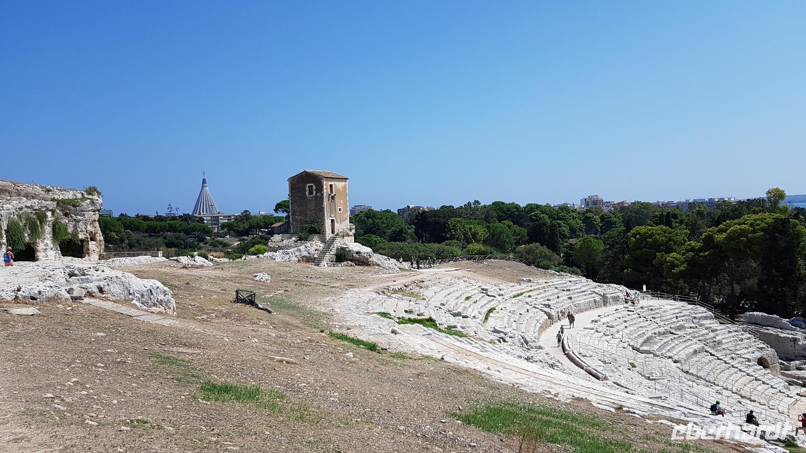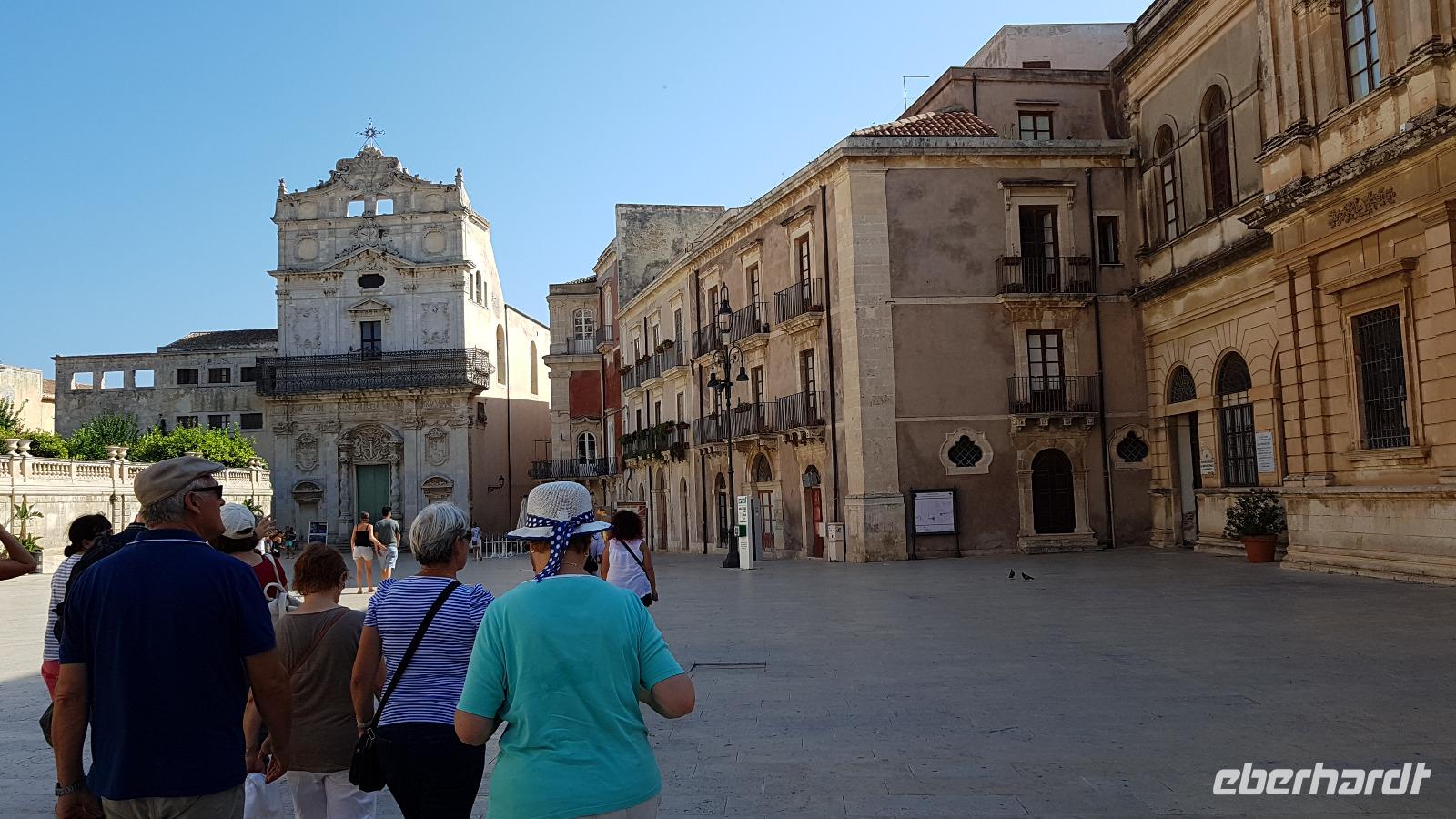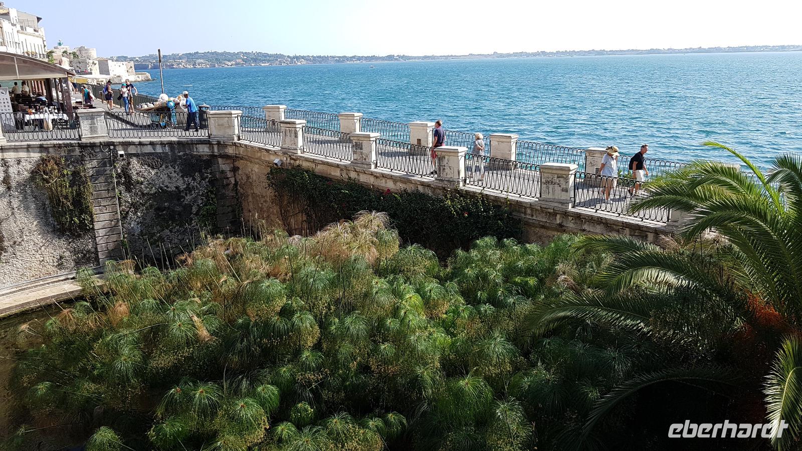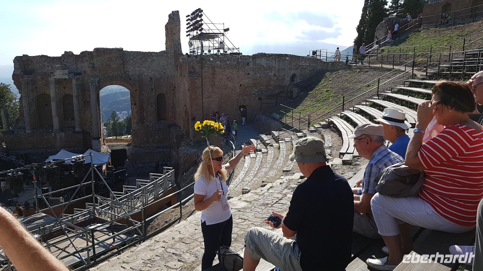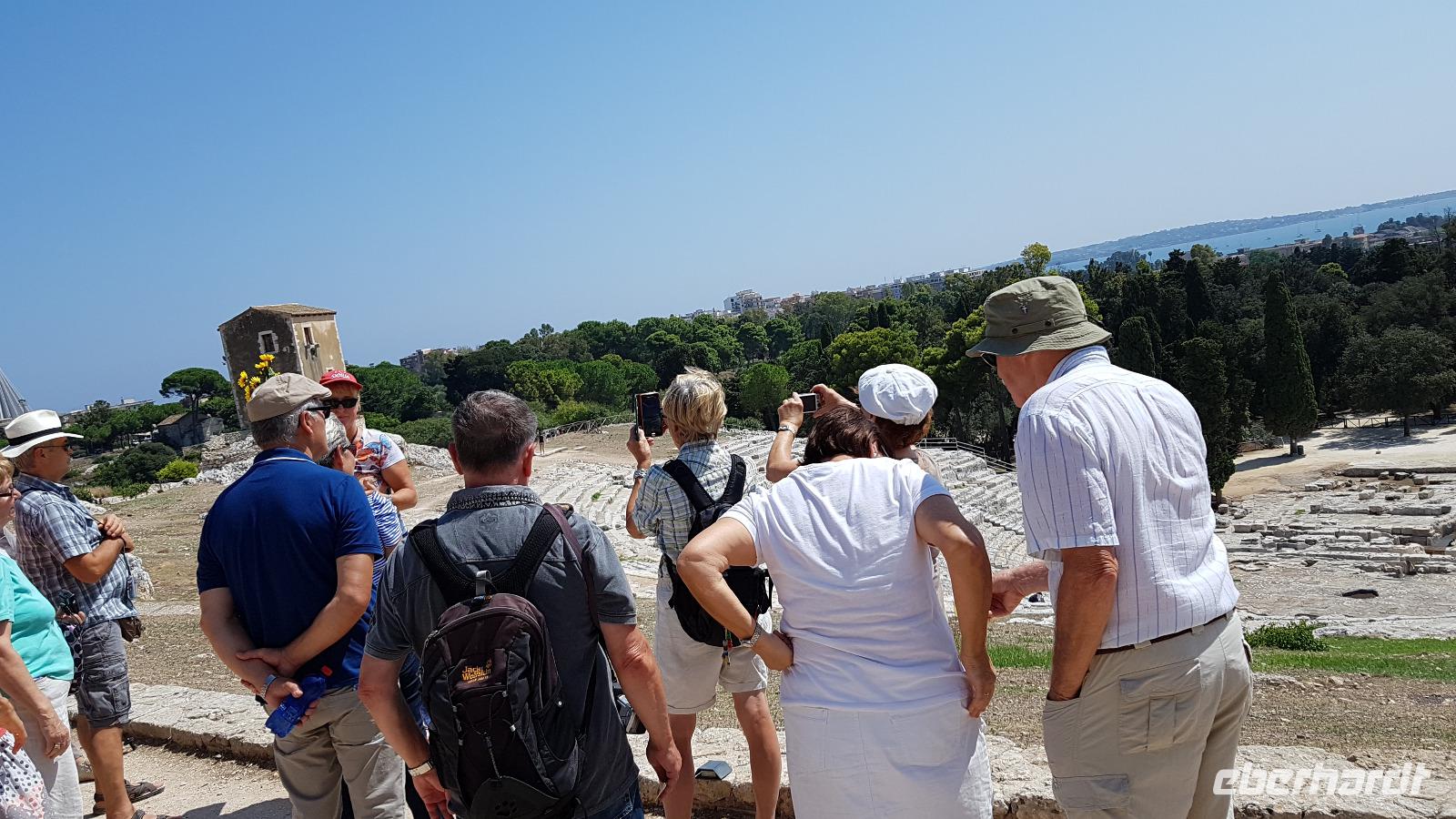 Dann setzten wir unsere Fahrt fort und sahen gegen Mittag schon die Festung Belvedere, bald hatten wir auch unser Ziel erreicht: den archäologischen Park mit dem griechischen Theater. Nachdem alle ihre Wasservorräte aufgefüllt hatten ging es zur Besichtigung, nicht so ganz einfach bei mehr als 35 °C. Doch wir hielten tapfer durch und genossen den Ausblick über das Theater hinunter zum Meer. Da gefiel es uns im alten Steinbruch schon besser, es war schattig und die üppige Vegetation hier brachte ihm den Namen "Paradies" ein. Da konnte man schon mal vergessen, dass hier einmal Sklaven geschuftet haben um die Steine herauszuhauen. Imposant dann die Grotte, das "Ohr des Dionysios" genannt. Die phänomenale Akkustik probierten wir gleich mit einem gemeinsamen Lied aus- es geht doch! Toll gemacht. Dann ging es vorbei am größten Opferaltar, fast 200 Meter lang ist er. Einmal im Jahr wurden hier mehr als 450 Stiere gleichzeitig geopfert- ein Fest für das Volk, denn dann gab es Fleisch für alle. Den Abschluss unseres Rundganges bildete das römische Theater, immerhin das drittgrößte in Italien. Randvoll mit Eindrücken ging es mit dem Bus dann in die Stadt, am Hafen parkten wir und spazierten zum Tempel des Apollo- der älteste aller Tempel hier. Durch malerische Gassen erreichten wir dem Domplatz, das gesamte Ensemble ist Weltkulturerbe der Unesco geworden und so wurden Kathedrale und Rathaus wieder hergerichtet. Die Kathedrale besuchten wir und Renate erzählte uns viel Interessantes über ihre wechselvolle Geschichte- fast 2500 Jahre ist dieses Gebäude nun schon alt und trotzte allen Veränderungen. Hier gibt es auch einen Altar für die heilige Lucretia, eine Märtyrerin, hier in Syrakus geboren, die ihrem Glauben nicht abschwor und der daraufhin die Augen ausgestochen wurden. Heute ist sie Beschützerin aller Menschen mit Augenproblemen. Dann war Zeit für individuelle Erkundungen, eine kleine Pause im Cafe oder einem weiteren Spaziergang die Gassen entlang. Gemeinsam ging es dann zur Arethusa-Quelle und wir erfuhren auch die Sage dahinter, dass Arethusa vom Flußgott begehrt wurde, ihn aber nicht wollte und sich an ihre Schutzgöttin wandte, diese verwandelte sie in diese Quelle. Der Flussgott ließ nicht von ihr ab und floß unter dem Meer zu ihr und hier vereinigten sie sich- heute der perfekte Platz für Liebespaare. Wir bestaunten den Papyrus in der Quelle und die scheinbar uralten Bäume daneben, so bizarr gewachsen! Dann ging es am Hafen entlang zurück zum Bus und der eine oder andere Hut landete noch vom Verkaufstisch auf den Köpfen unserer Gäste- es soll in den nächsten Tagen so heiß bleiben, da ist Schutz vor der Sonne viel wert. Über die neue Autobahn ging es dann zurück nach Giardini Naxos, allerdings ist sie so holperig, dass man meinte, sie müsse gleich wieder repariert werden. Nun ja. Ein leckeres Abend- Buffett entschädigte dann und ließ den Tag mit vielen Genüssen gemütlich ausklingen. Morgen verabschieden wir uns vorerst von diesem Ort, kommen aber am Ende der Woche zurück.