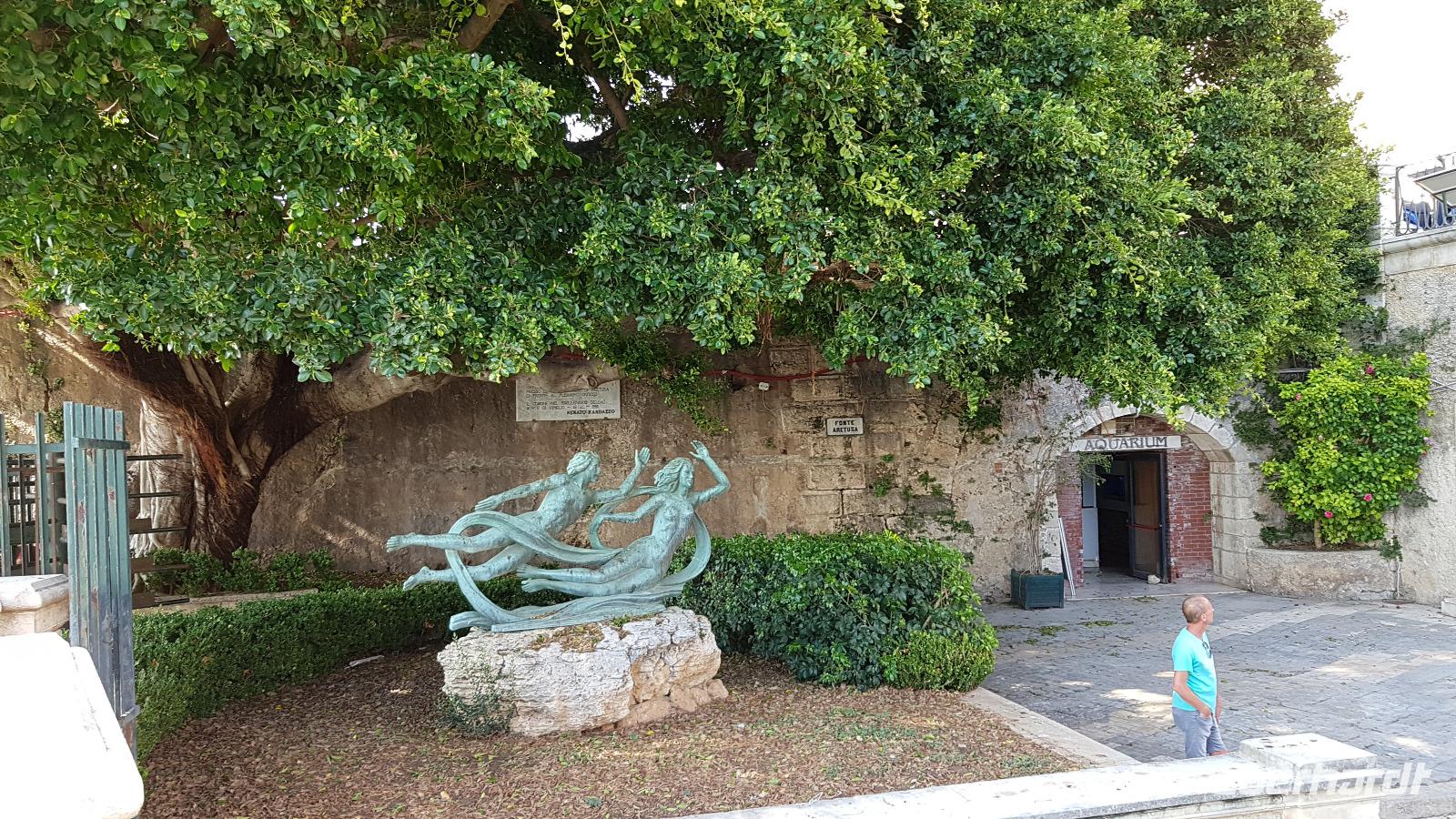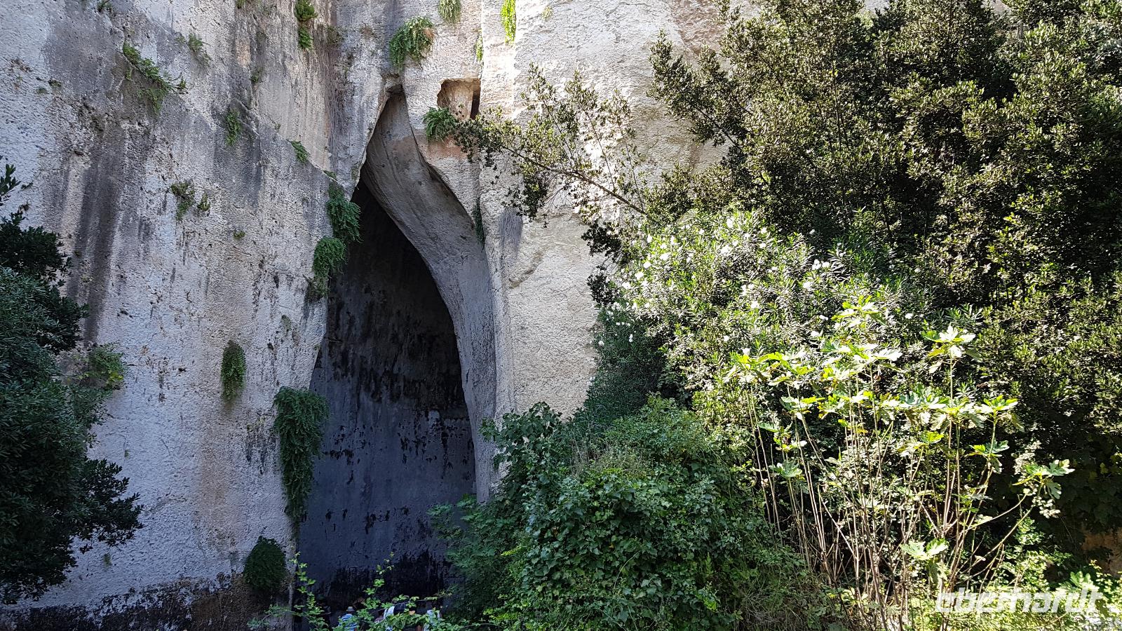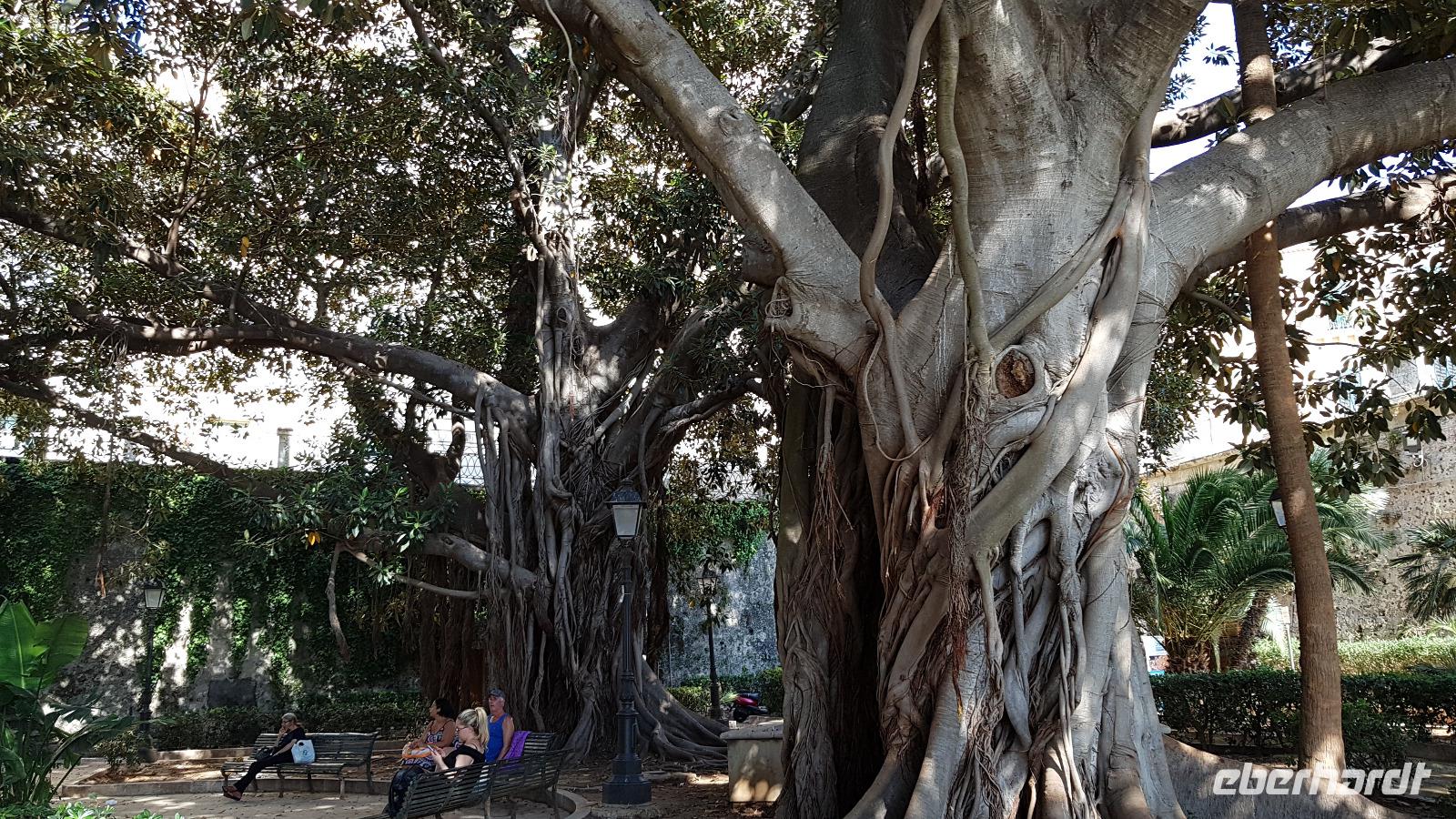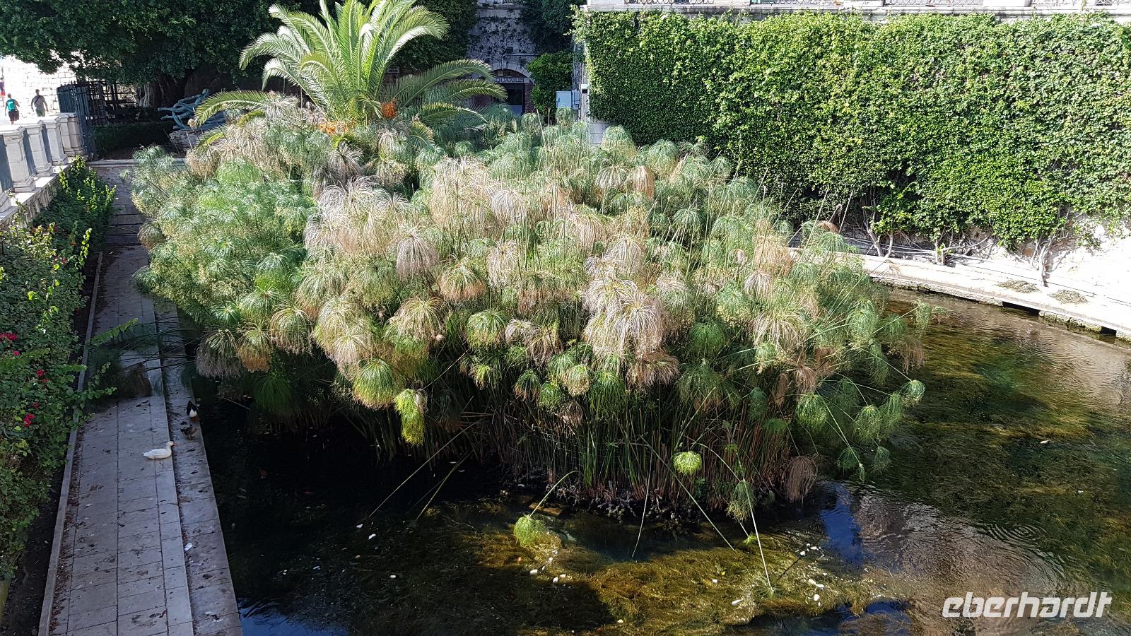 Dann setzten wir unsere Fahrt fort und sahen gegen Mittag schon die Festung Belvedere, bald hatten wir auch unser Ziel erreicht: den archäologischen Park mit dem griechischen Theater. Nachdem alle ihre Wasservorräte aufgefüllt hatten ging es zur Besichtigung, nicht so ganz einfach bei mehr als 35 °C. Doch wir hielten tapfer durch und genossen den Ausblick über das Theater hinunter zum Meer. Da gefiel es uns im alten Steinbruch schon besser, es war schattig und die üppige Vegetation hier brachte ihm den Namen "Paradies" ein. Da konnte man schon mal vergessen, dass hier einmal Sklaven geschuftet haben um die Steine herauszuhauen. Imposant dann die Grotte, das "Ohr des Dionysios" genannt. Die phänomenale Akkustik probierten wir gleich mit einem gemeinsamen Lied aus- es geht doch! Toll gemacht. Dann ging es vorbei am größten Opferaltar, fast 200 Meter lang ist er. Einmal im Jahr wurden hier mehr als 450 Stiere gleichzeitig geopfert- ein Fest für das Volk, denn dann gab es Fleisch für alle. Den Abschluss unseres Rundganges bildete das römische Theater, immerhin das drittgrößte in Italien. Randvoll mit Eindrücken ging es mit dem Bus dann in die Stadt, am Hafen parkten wir und spazierten zum Tempel des Apollo- der älteste aller Tempel hier. Durch malerische Gassen erreichten wir dem Domplatz, das gesamte Ensemble ist Weltkulturerbe der Unesco geworden und so wurden Kathedrale und Rathaus wieder hergerichtet. Die Kathedrale besuchten wir und Renate erzählte uns viel Interessantes über ihre wechselvolle Geschichte- fast 2500 Jahre ist dieses Gebäude nun schon alt und trotzte allen Veränderungen. Hier gibt es auch einen Altar für die heilige Lucretia, eine Märtyrerin, hier in Syrakus geboren, die ihrem Glauben nicht abschwor und der daraufhin die Augen ausgestochen wurden. Heute ist sie Beschützerin aller Menschen mit Augenproblemen. Dann war Zeit für individuelle Erkundungen, eine kleine Pause im Cafe oder einem weiteren Spaziergang die Gassen entlang. Gemeinsam ging es dann zur Arethusa-Quelle und wir erfuhren auch die Sage dahinter, dass Arethusa vom Flußgott begehrt wurde, ihn aber nicht wollte und sich an ihre Schutzgöttin wandte, diese verwandelte sie in diese Quelle. Der Flussgott ließ nicht von ihr ab und floß unter dem Meer zu ihr und hier vereinigten sie sich- heute der perfekte Platz für Liebespaare. Wir bestaunten den Papyrus in der Quelle und die scheinbar uralten Bäume daneben, so bizarr gewachsen! Dann ging es am Hafen entlang zurück zum Bus und der eine oder andere Hut landete noch vom Verkaufstisch auf den Köpfen unserer Gäste- es soll in den nächsten Tagen so heiß bleiben, da ist Schutz vor der Sonne viel wert. Über die neue Autobahn ging es dann zurück nach Giardini Naxos, allerdings ist sie so holperig, dass man meinte, sie müsse gleich wieder repariert werden. Nun ja. Ein leckeres Abend- Buffett entschädigte dann und ließ den Tag mit vielen Genüssen gemütlich ausklingen. Morgen verabschieden wir uns vorerst von diesem Ort, kommen aber am Ende der Woche zurück.