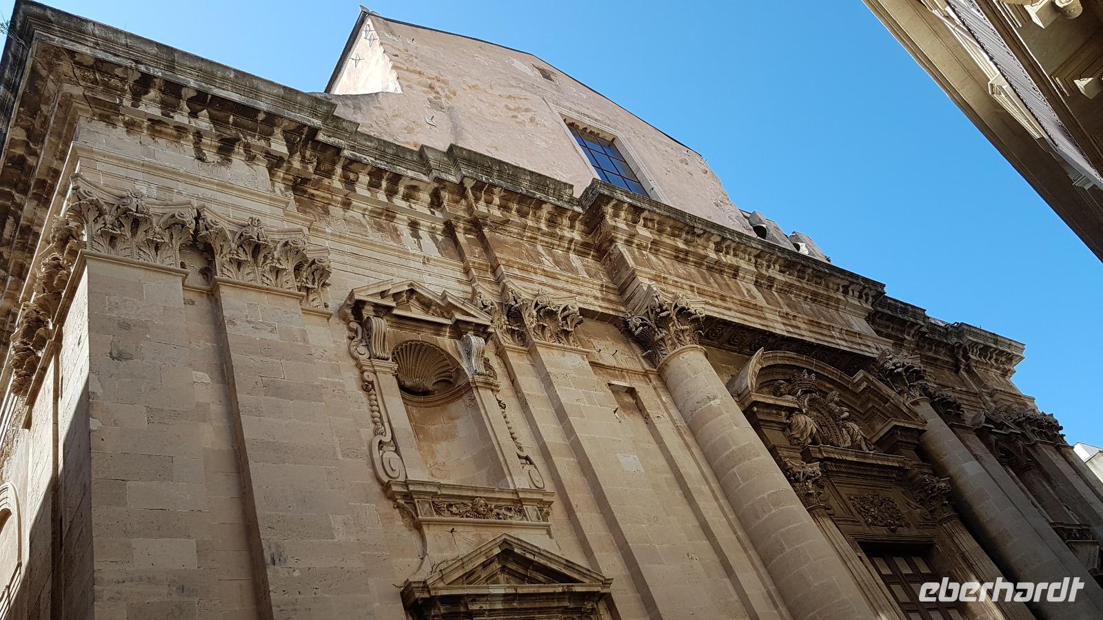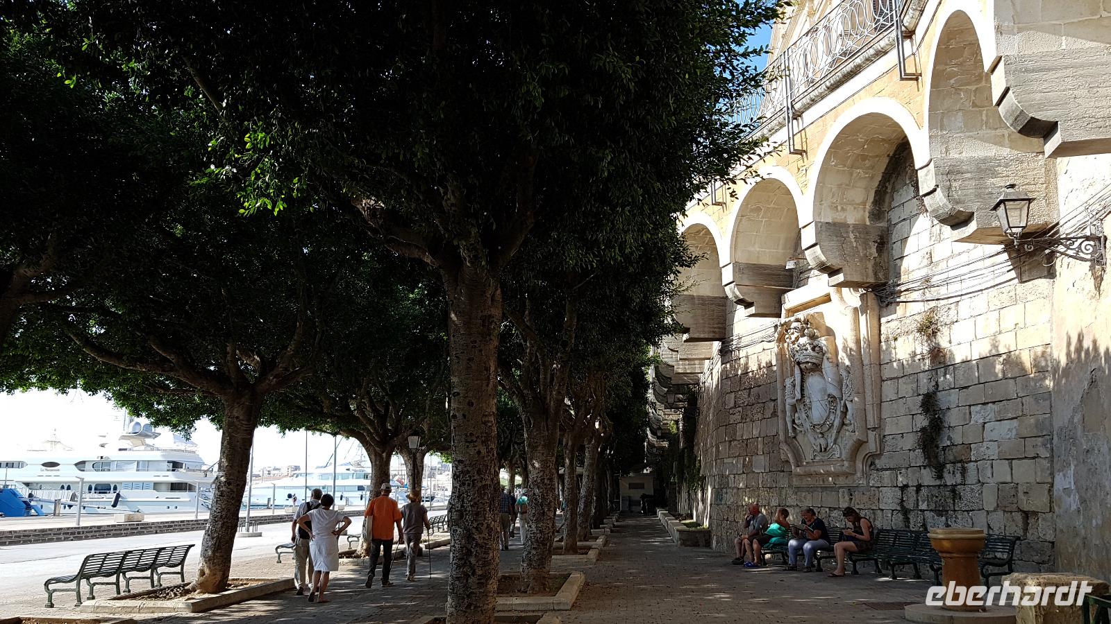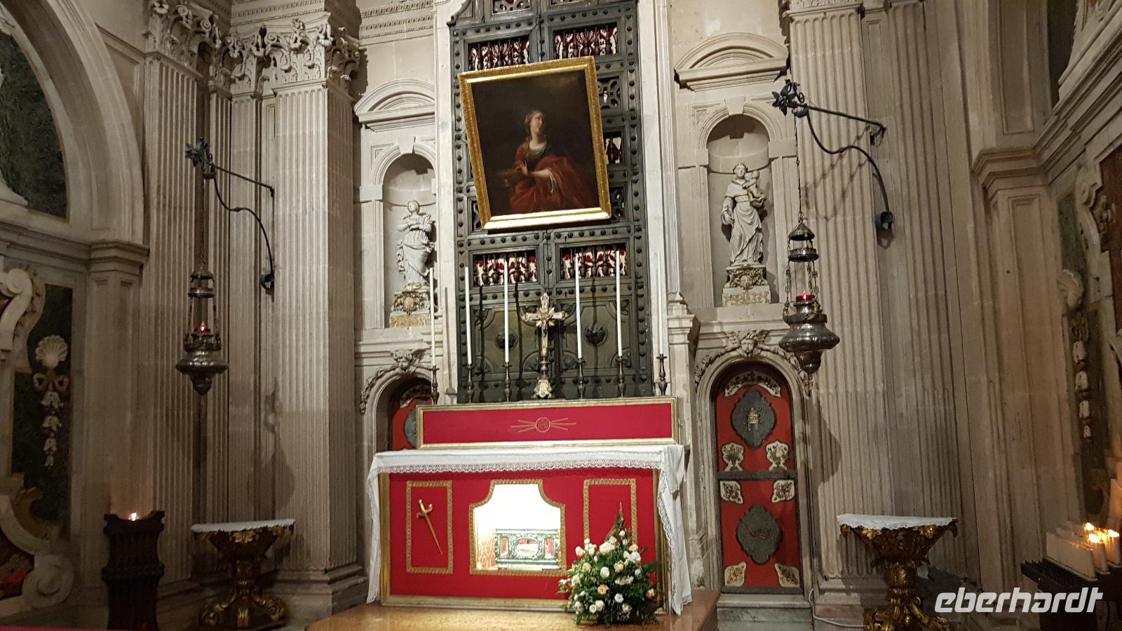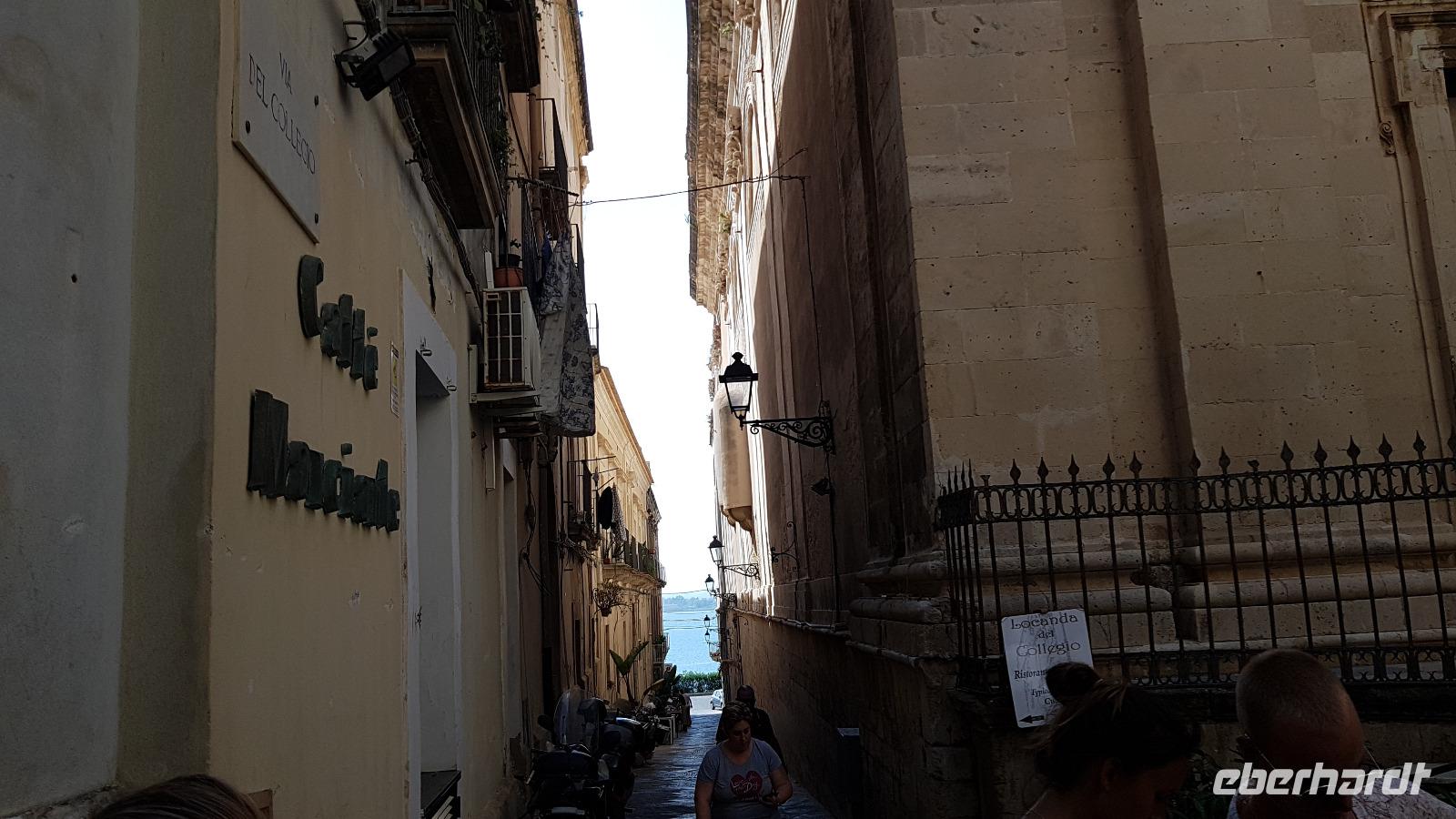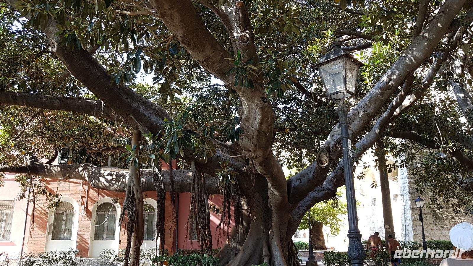 Dann setzten wir unsere Fahrt fort und sahen gegen Mittag schon die Festung Belvedere, bald hatten wir auch unser Ziel erreicht: den archäologischen Park mit dem griechischen Theater. Nachdem alle ihre Wasservorräte aufgefüllt hatten ging es zur Besichtigung, nicht so ganz einfach bei mehr als 35 °C. Doch wir hielten tapfer durch und genossen den Ausblick über das Theater hinunter zum Meer. Da gefiel es uns im alten Steinbruch schon besser, es war schattig und die üppige Vegetation hier brachte ihm den Namen "Paradies" ein. Da konnte man schon mal vergessen, dass hier einmal Sklaven geschuftet haben um die Steine herauszuhauen. Imposant dann die Grotte, das "Ohr des Dionysios" genannt. Die phänomenale Akkustik probierten wir gleich mit einem gemeinsamen Lied aus- es geht doch! Toll gemacht. Dann ging es vorbei am größten Opferaltar, fast 200 Meter lang ist er. Einmal im Jahr wurden hier mehr als 450 Stiere gleichzeitig geopfert- ein Fest für das Volk, denn dann gab es Fleisch für alle. Den Abschluss unseres Rundganges bildete das römische Theater, immerhin das drittgrößte in Italien. Randvoll mit Eindrücken ging es mit dem Bus dann in die Stadt, am Hafen parkten wir und spazierten zum Tempel des Apollo- der älteste aller Tempel hier. Durch malerische Gassen erreichten wir dem Domplatz, das gesamte Ensemble ist Weltkulturerbe der Unesco geworden und so wurden Kathedrale und Rathaus wieder hergerichtet. Die Kathedrale besuchten wir und Renate erzählte uns viel Interessantes über ihre wechselvolle Geschichte- fast 2500 Jahre ist dieses Gebäude nun schon alt und trotzte allen Veränderungen. Hier gibt es auch einen Altar für die heilige Lucretia, eine Märtyrerin, hier in Syrakus geboren, die ihrem Glauben nicht abschwor und der daraufhin die Augen ausgestochen wurden. Heute ist sie Beschützerin aller Menschen mit Augenproblemen. Dann war Zeit für individuelle Erkundungen, eine kleine Pause im Cafe oder einem weiteren Spaziergang die Gassen entlang. Gemeinsam ging es dann zur Arethusa-Quelle und wir erfuhren auch die Sage dahinter, dass Arethusa vom Flußgott begehrt wurde, ihn aber nicht wollte und sich an ihre Schutzgöttin wandte, diese verwandelte sie in diese Quelle. Der Flussgott ließ nicht von ihr ab und floß unter dem Meer zu ihr und hier vereinigten sie sich- heute der perfekte Platz für Liebespaare. Wir bestaunten den Papyrus in der Quelle und die scheinbar uralten Bäume daneben, so bizarr gewachsen! Dann ging es am Hafen entlang zurück zum Bus und der eine oder andere Hut landete noch vom Verkaufstisch auf den Köpfen unserer Gäste- es soll in den nächsten Tagen so heiß bleiben, da ist Schutz vor der Sonne viel wert. Über die neue Autobahn ging es dann zurück nach Giardini Naxos, allerdings ist sie so holperig, dass man meinte, sie müsse gleich wieder repariert werden. Nun ja. Ein leckeres Abend- Buffett entschädigte dann und ließ den Tag mit vielen Genüssen gemütlich ausklingen. Morgen verabschieden wir uns vorerst von diesem Ort, kommen aber am Ende der Woche zurück.