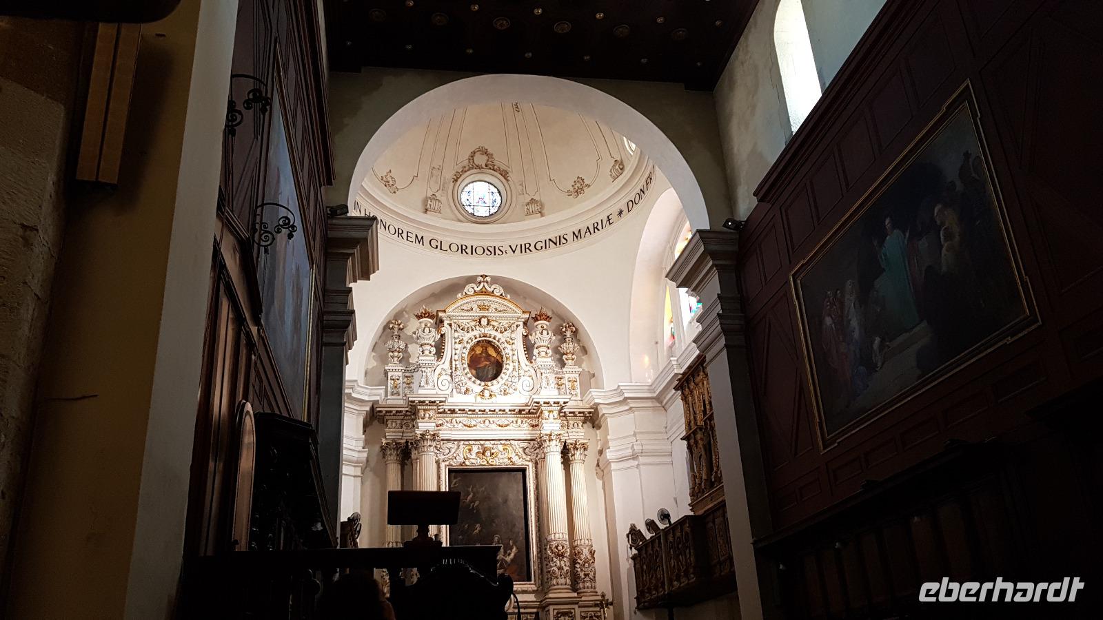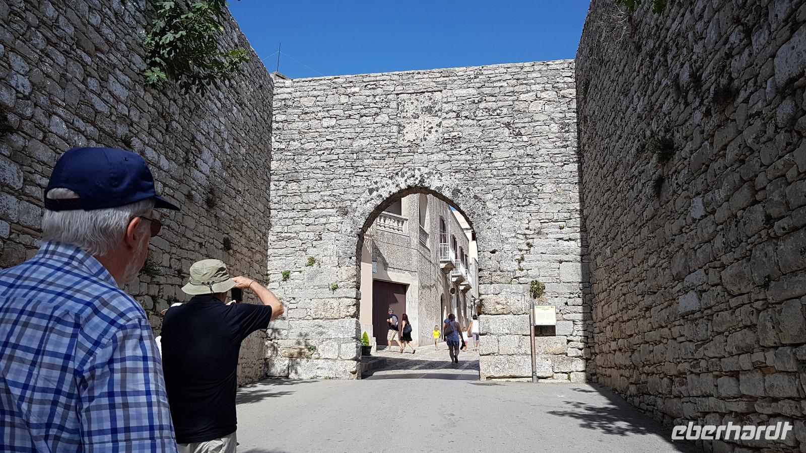 Auf dem Monte Erice in 750 Metern Höhe liegt Erice. Durch die Porta Trapani betreten wir die Stadt und besuchen als erstes den Dom. Die Chiesa Madre S. Maria dell' Assunta, wie sie korrekt heißt wurde restauriert und zeigt sich heute in voller Pracht. Wir staunen über die feine, fast ziselierte Marmordecke und die Ausstattung im Innern, dann spazieren wir durch die Gassen der Stadt. Bei Maria Grammatico stoppen wir und müssen selbstverständlich ihr berühmtes Mandelgebäck probieren. Am Rathaus vorbei geht es dann zu einem tollen Aussichtspunkt am Castello di Venere, der Burg aus dem 13. Jahrhundert. Wir haben einen phantastischen Ausblick und dann kommt noch eine kleine Überraschung: Passend zum Mandelgebäck habe ich Mandelwein besorgt, den wir hier natürlich verkosten. Dann hat jeder Gelegenheit, die Stadt selber zu erkunden und am späten Nachmittag treffen wir uns zur Rückfahrt in unser Agriturismo. Hier erwartet uns wieder ein tolles Abendessen und so klingt ein interessanter und abwechslungsreicher Tag aus.