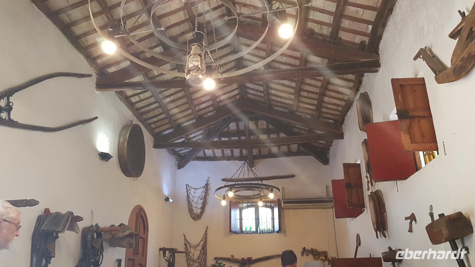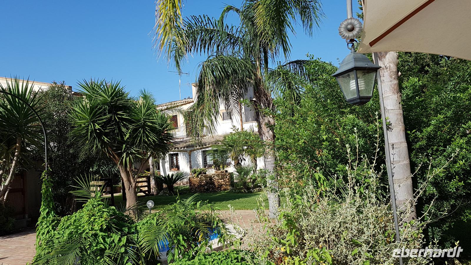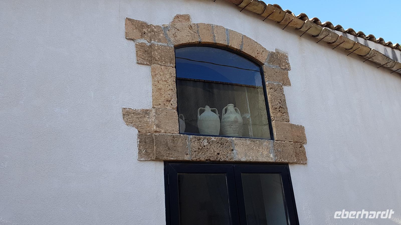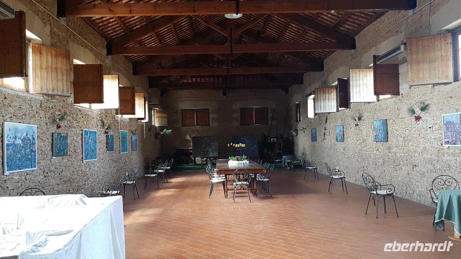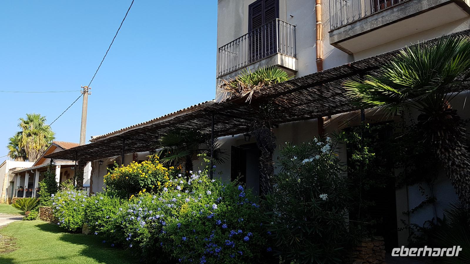 Weiter ging unsere Fahrt nach Agrigent. Hier an der Südküste Siziliens befindet sich eine der bedeutendsten Ausgrabungsstätten, die auch zum Weltkulturerbe der Unesco gehört: das Tal der Tempel. Schon von weitem sahen wir sie über dem Meer auf der Hochebene. Nach einer kurzen Sicherheitskontrolle begannen wir unseren Rundgang beim Tempel der Hera. Er wurde um 450 v.Chr. erbaut, zerstört, wiederaufgebaut und verfiel schließlich, die heute aufrechtstehenden Säulen wurden erst im 18. Jahrhundert wieder errichtet. Im Inneren sieht man noch Teile des Altars für die Opfergaben. Weiter führt unser Rundgang an den Grabstellen in der Mauer entlang zum Concordia- Tempel. Er ist am besten erhalten, das liegt auch daran, dass er einst zu einer christlichen Kirche umgebaut wurde. Das Innere wurde dabei entsprechend angepasst- man sieht noch die Bogengänge. Der größte Tempel war selbstverständlich der des Zeus. Er war riesig, wurde aber wohl nie vollendet. Man sieht heute noch eine der riesigen Figuren, die das Dach des Tempels quasi stützten, Renate erzählte uns, dass dies ein sogenannter Telamon sei. Wir staunten über die technischen Meisterleistungen, die beim damaligen Aufbau erbracht wurden, heute wäre so etwas nur mit Muskelkraft undenkbar. Dann ging unsere Fahrt weiter zu unserem neuen Hotel, das Agriturismo „Case di Latomie" nahe Castelvetrano. Herzlich wurden wir von Michelle begrüßt und konnten unsere Zimmer beziehen. Bis zum Abendessen war es nicht mehr lange und so trafen wir uns alsbald wieder. Das Abendessen war dann ein absolutes Highlight. Zuerst einmal stießen wir mit einem Glas Wein auf die weitere Reise und den Abend hier an. Dann begeisterten uns schon die Vorspeisen, alle erzählten quasi ihre Herkunft hier vom Hof. Wir mussten an uns halten, damit wir die anderen Gänge ebenfalls wenigstens noch kosten konnten. Dann gab es hausgemachte Nudeln mit Tomatensoße und Mandeln und dann Involtinis, gefüllte Schweinsröllchen, und ein leckeres Gebäck als Dessert. Was für ein Abschluss unseres Tages.