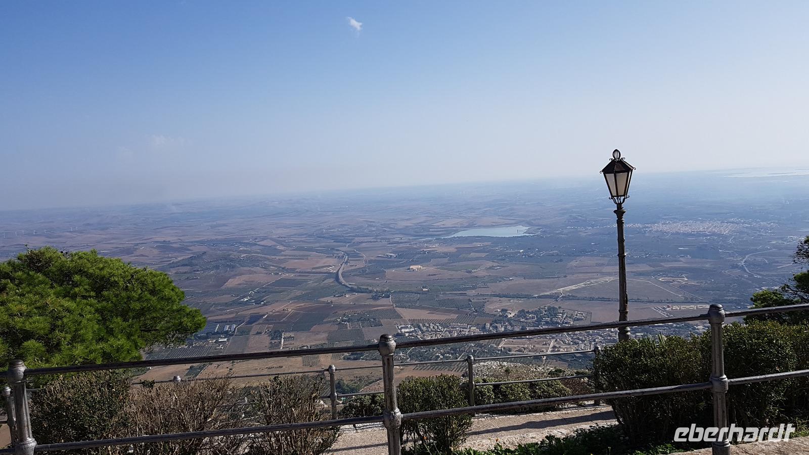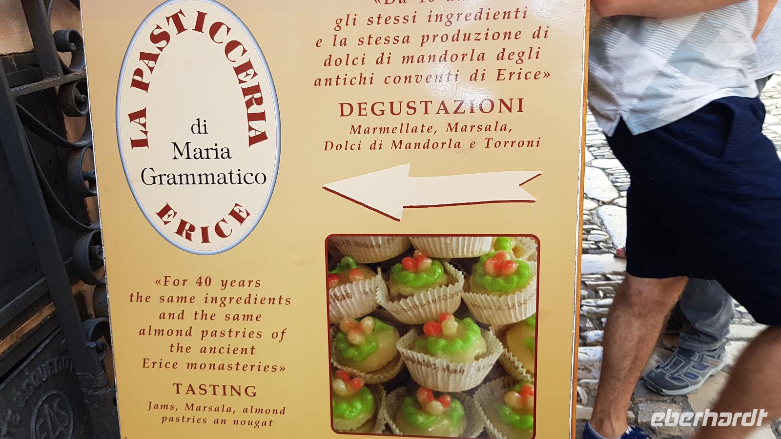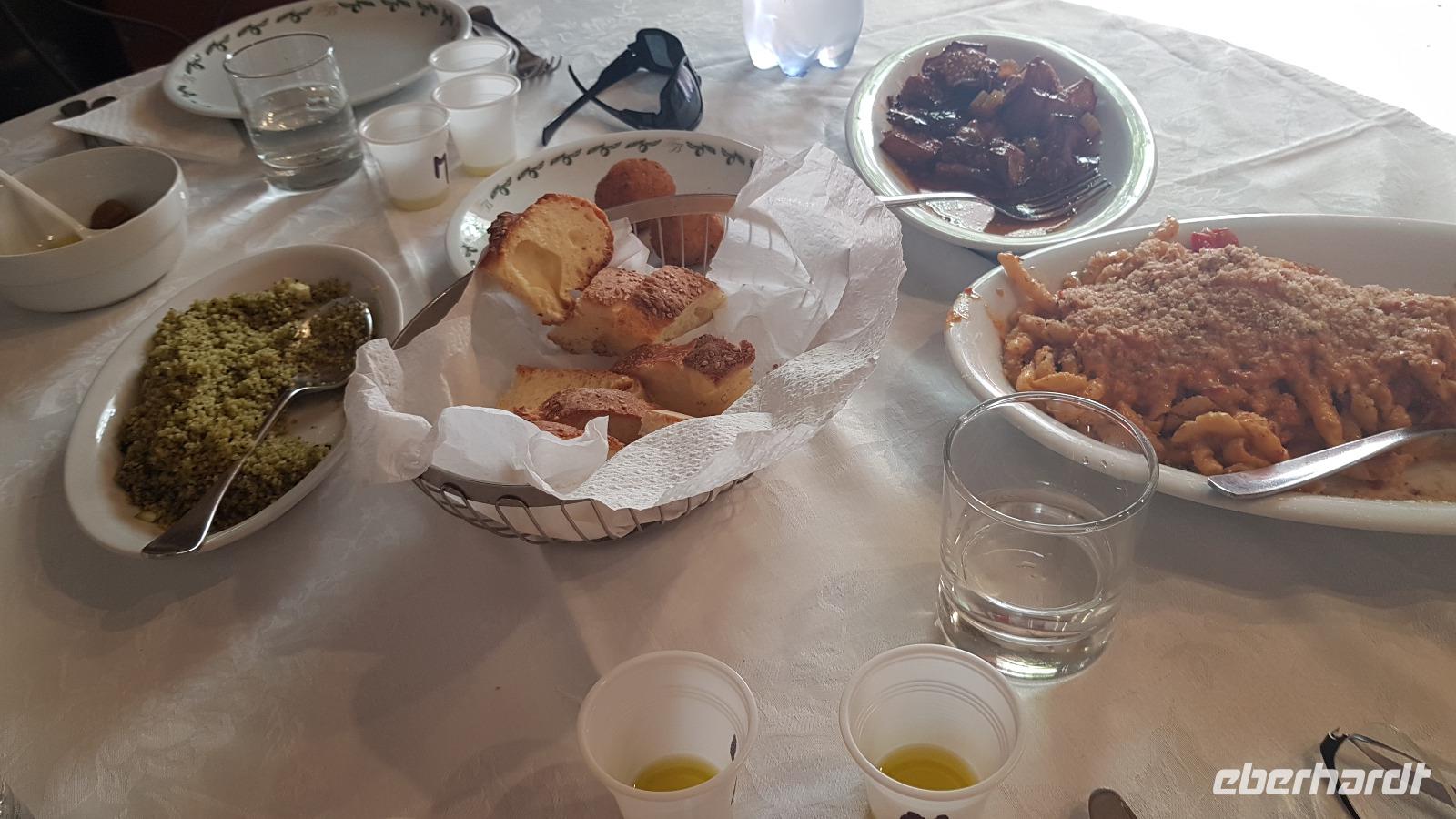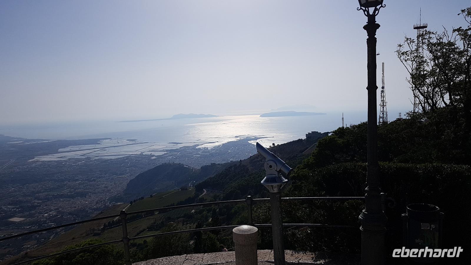 Gegen Mittag erreichen wir die Salinen. Renate erklärt uns, wie das Salz gewonnen wird. In mehreren Etappen (und Becken) verdunstet das Wasser und zurück bleibt die Salzkruste. Diese wird vorsichtig angestochen und dann abgetragen. Dies erfordert viel Aufmerksamkeit, damit man den Boden des Salzbeckens nicht zerstört. Heute ist vieles automatisiert und Maschinen erledigen das mühselige Abstechen, trotzdem ist der Mensch hier immer noch gefordert. Viele Zugvögel wie Flamingos, Kraniche oder Reiher nutzen die Salinen als Rastplatz. Ihr Tisch ist immer reichlich mit Fisch gedeckt, da diese sich in den Becken ansammeln. Nachdem wir uns mit guten Flor de Sale oder auch groben Meersalz bevorratet haben geht unsere Fahrt weiter zum Mittagsimbiss in ein Agriturismo ganz in der Nähe. Hier werden wir bereits erwartet und mit einem besonderen Wasser begrüßt: Lorbeer, Minze und Zitrone ergeben eine tolle erfrischende Note. Zudem bekommen wir ein Ständchen klassisch auf der Gitarre begleitet- was wollen wir mehr. Auf unseren Tischen dann eine weitere Überraschung: 3 kleine Becher stehen hier zur Verkostung bereit: das hauseigene Olivenöl. Da lernten wir gleich, wie man richtig Olivenöl probiert. Dazu frisches Brot und dann die Vorspeisen: Oliven, Salate, eine Art Couscous mit Minze, war das wieder lecker! Bei der obligatorischen Pasta-Vorspeise hatten wir den direkten Vergleich zu gestern Abend und auch die Involtinis waren ähnlich- und auch super lecker. Wieder gab es einige Lieder, mit der Gitarre begleitet und dann setzten wir unsere Fahrt fort. Erice ist nun unser Ziel.