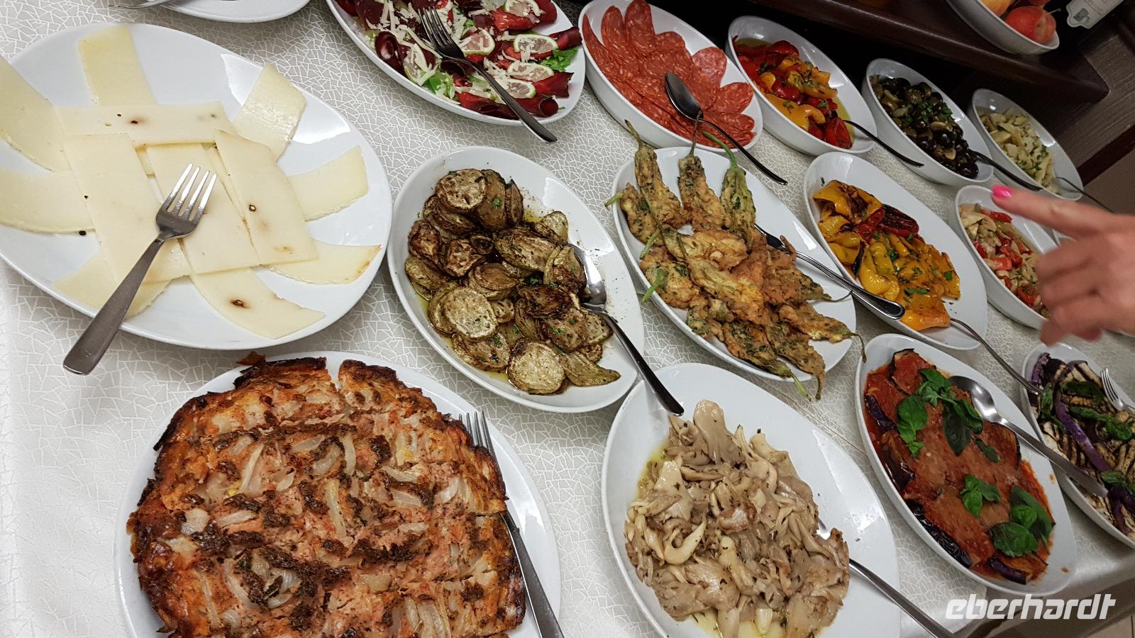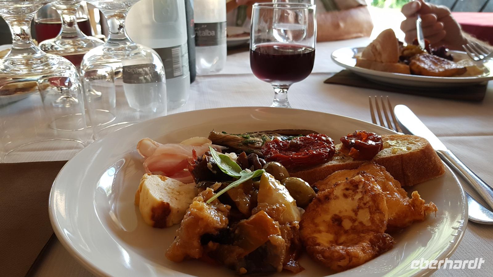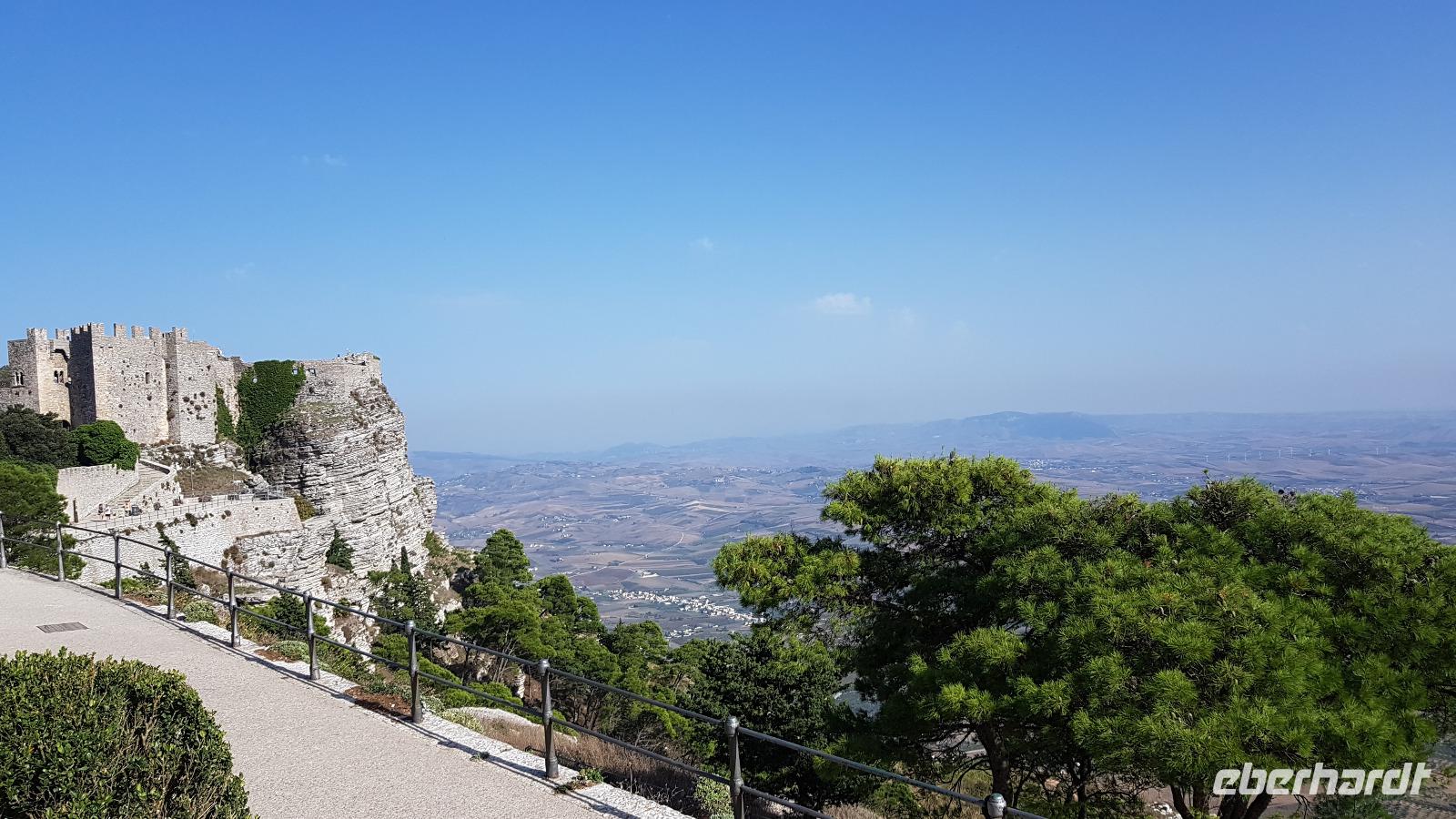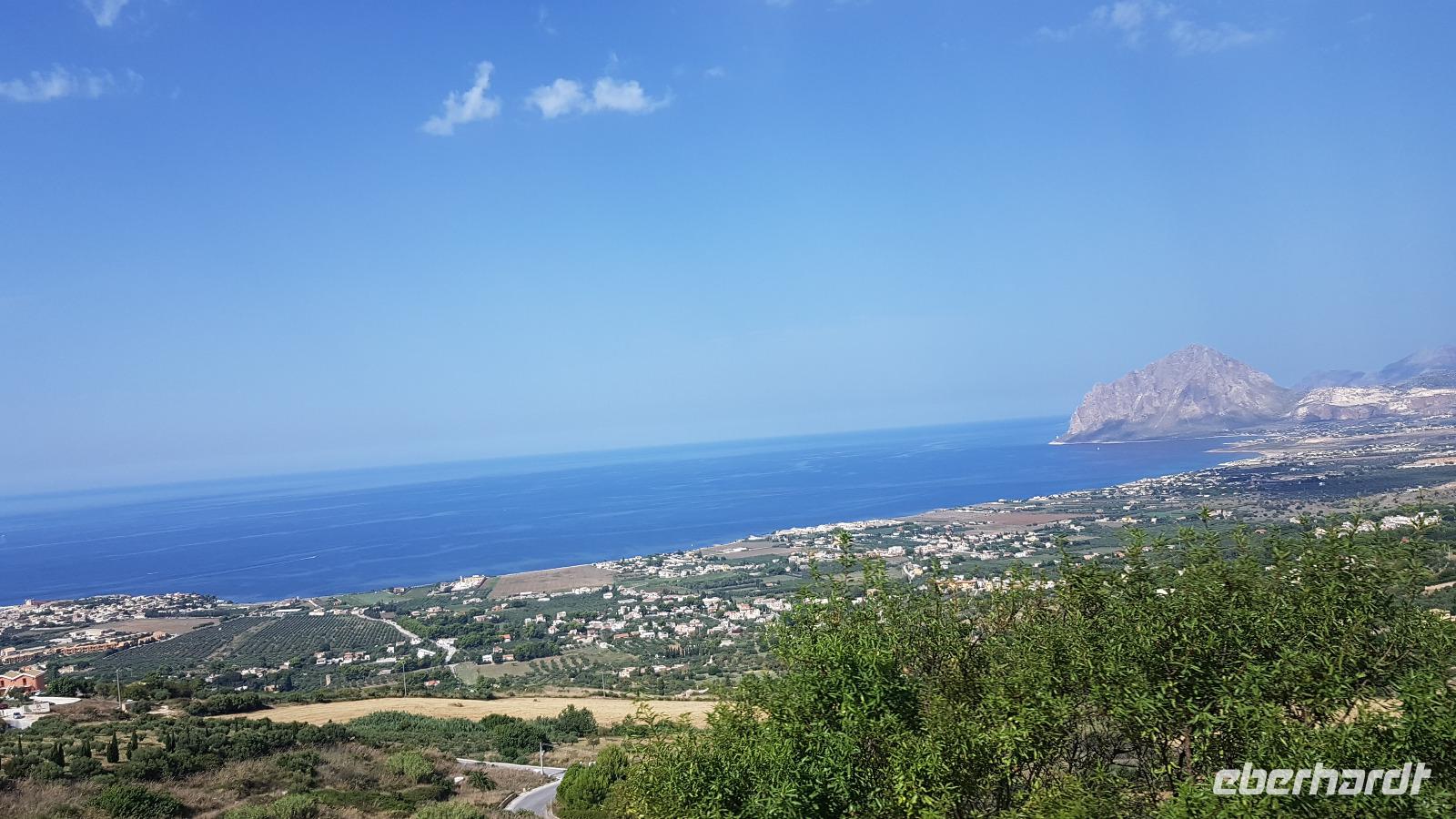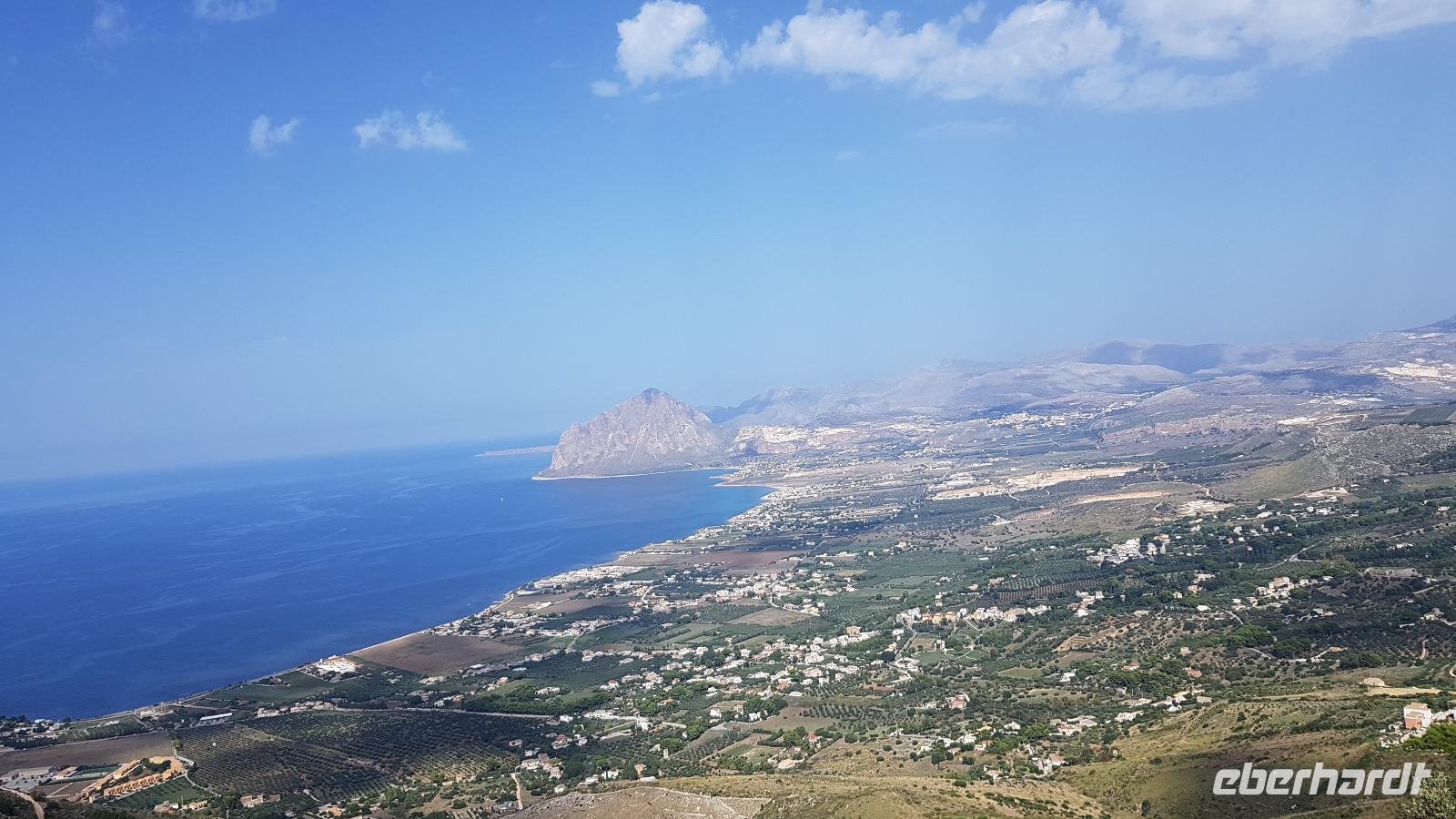 Gegen Mittag erreichen wir die Salinen. Renate erklärt uns, wie das Salz gewonnen wird. In mehreren Etappen (und Becken) verdunstet das Wasser und zurück bleibt die Salzkruste. Diese wird vorsichtig angestochen und dann abgetragen. Dies erfordert viel Aufmerksamkeit, damit man den Boden des Salzbeckens nicht zerstört. Heute ist vieles automatisiert und Maschinen erledigen das mühselige Abstechen, trotzdem ist der Mensch hier immer noch gefordert. Viele Zugvögel wie Flamingos, Kraniche oder Reiher nutzen die Salinen als Rastplatz. Ihr Tisch ist immer reichlich mit Fisch gedeckt, da diese sich in den Becken ansammeln. Nachdem wir uns mit guten Flor de Sale oder auch groben Meersalz bevorratet haben geht unsere Fahrt weiter zum Mittagsimbiss in ein Agriturismo ganz in der Nähe. Hier werden wir bereits erwartet und mit einem besonderen Wasser begrüßt: Lorbeer, Minze und Zitrone ergeben eine tolle erfrischende Note. Zudem bekommen wir ein Ständchen klassisch auf der Gitarre begleitet- was wollen wir mehr. Auf unseren Tischen dann eine weitere Überraschung: 3 kleine Becher stehen hier zur Verkostung bereit: das hauseigene Olivenöl. Da lernten wir gleich, wie man richtig Olivenöl probiert. Dazu frisches Brot und dann die Vorspeisen: Oliven, Salate, eine Art Couscous mit Minze, war das wieder lecker! Bei der obligatorischen Pasta-Vorspeise hatten wir den direkten Vergleich zu gestern Abend und auch die Involtinis waren ähnlich- und auch super lecker. Wieder gab es einige Lieder, mit der Gitarre begleitet und dann setzten wir unsere Fahrt fort. Erice ist nun unser Ziel.