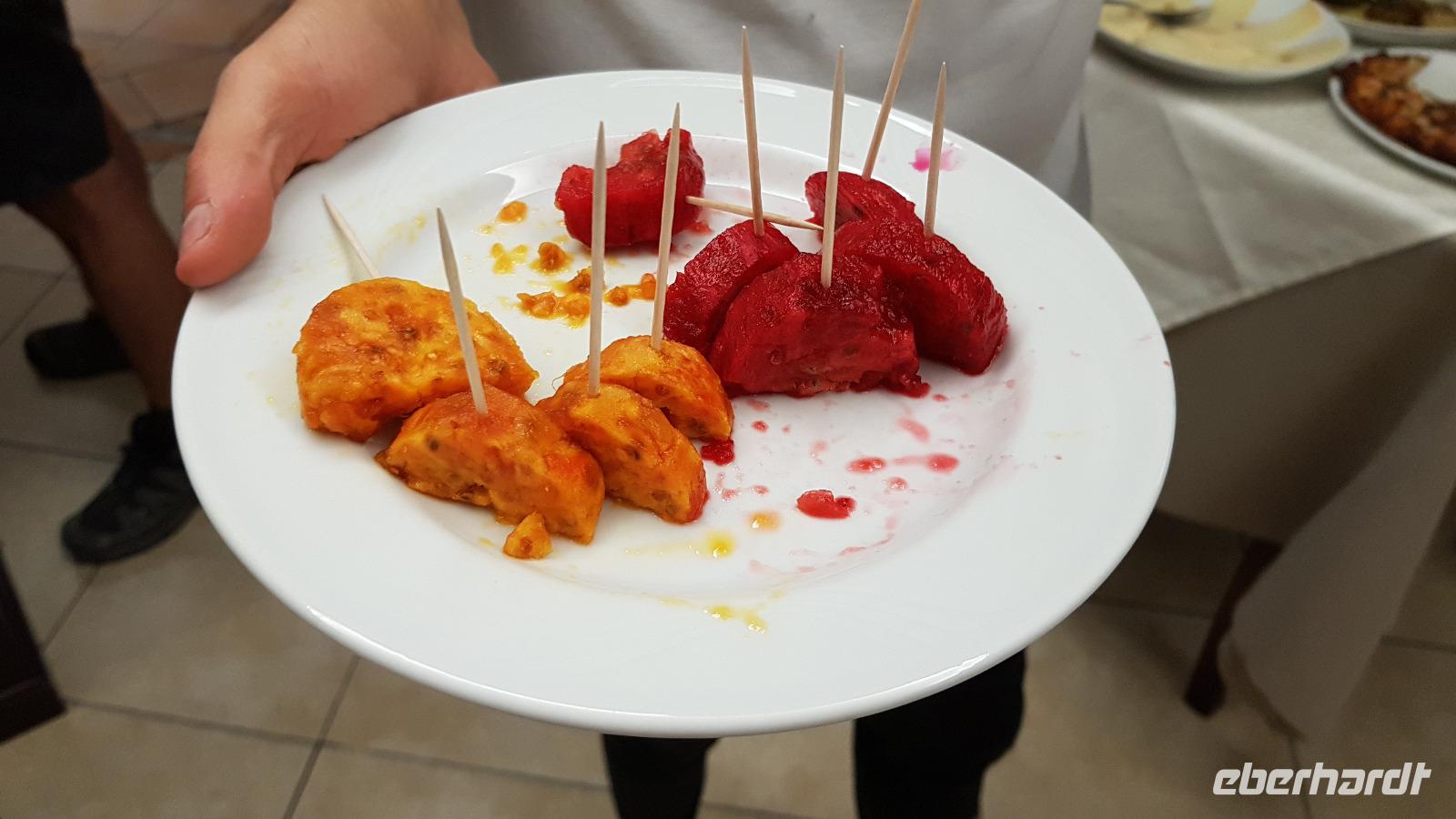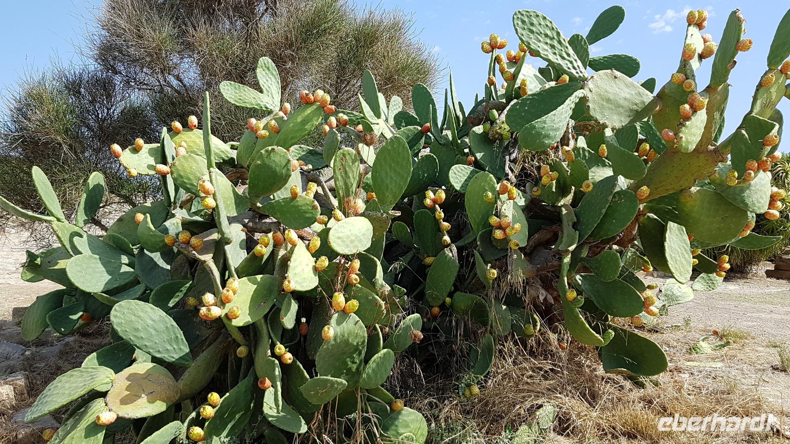 Ein gutes Frühstück ist der beste Start in den Tag, den hatten wir heute allemal. Die Koffer wurden uns vom Zimmer zum Bus gefahren- ein toller Service- und nachdem wir kontrolliert hatten, dass alle Koffer an Bord sind ging es los. Unser erstes Ziel heißt Piazza Armerina, die dortige römische Villa. Der Ätna begleitete uns noch ein ganzes Stück des Weges, wir fuhren durch eine tolle Landschaft. Etwas außerhalb des Ortes lag dann die Ausgrabungsstätte der römischen Villa. Man geht davon aus, dass sie einem römischen Staatsmann gehörte, der hier Gäste empfing und vermutlich seinen Alters-Wohnsitz hatte. Berühmt ist die Villa für ihre gut erhaltenen Mosaik-Böden. Jahrhundertelang war die Villa nämlich verschüttet gewesen, das hat die Mosaiken quasi konserviert. Renate erläutert uns die einzelnen Räume, die Bäder, die beheizt waren, den Empfangsraum, der Tanzsaal und natürlich die Räume, die mit der sogenannten „Kleinen Jagd" ausgelegt waren, Jagdszenen, auf denen der Fang von Tieren dargestellt war, die es in Sizilien tatsächlich (einmal) gab. Und dann die „große Jagd": eine umwerfende Darstellung der Jagd auf afrikanische Tiere, auf Tiger, Strauße, Elefanten...Dann folgten noch Räume mit der Darstellung der „Bikini-Mädchen", junge Frauen, die sich im Fünfkampf maßen, die Räume der Kinder, in denen tatsächlich Jagdszenen für Kinder dargestellt sind- mit Streitwagen, die von Tauben und Gänsen gezogen wurden z.B. Und schlußendlich, die Räume des Hausherrn, der Saal für politische Gespräche, seine Schlafgemächer ...Wir waren absolut beeindruckt. Nach einer kleinen Freizeit, sich noch individuell umzuschauen ging es zurück in die Stadt Piazza Armerina. Hier hatte uns Renate in einem tollen Lokal angemeldet. Bei Toto erwartete uns ein leckeres Mittagsmahl, dass sich jeder a la Card aussuchen konnte. Da wunderte es nicht, dass sich viele für die Nudeln entschieden- leckere hausgemachte Nudeln mit Tomaten oder Pilzen - hmm. Als Wow gab es dann eine kleine Vorführung, wir Kaktusfeigen aufgeschnitten werden und dann konnten wir sie auch verkosten.
