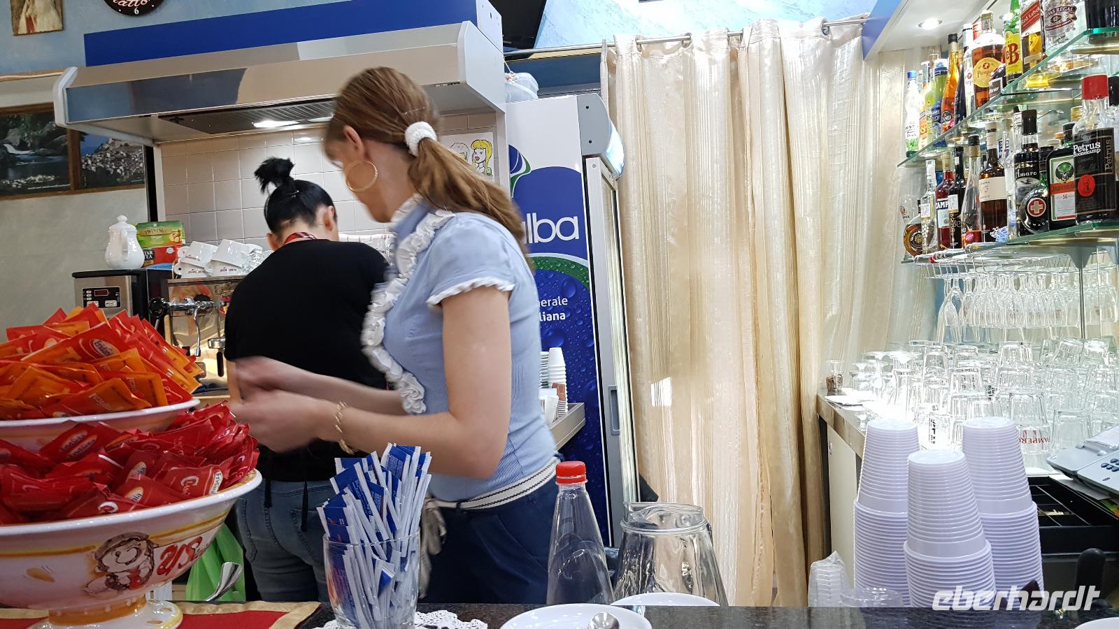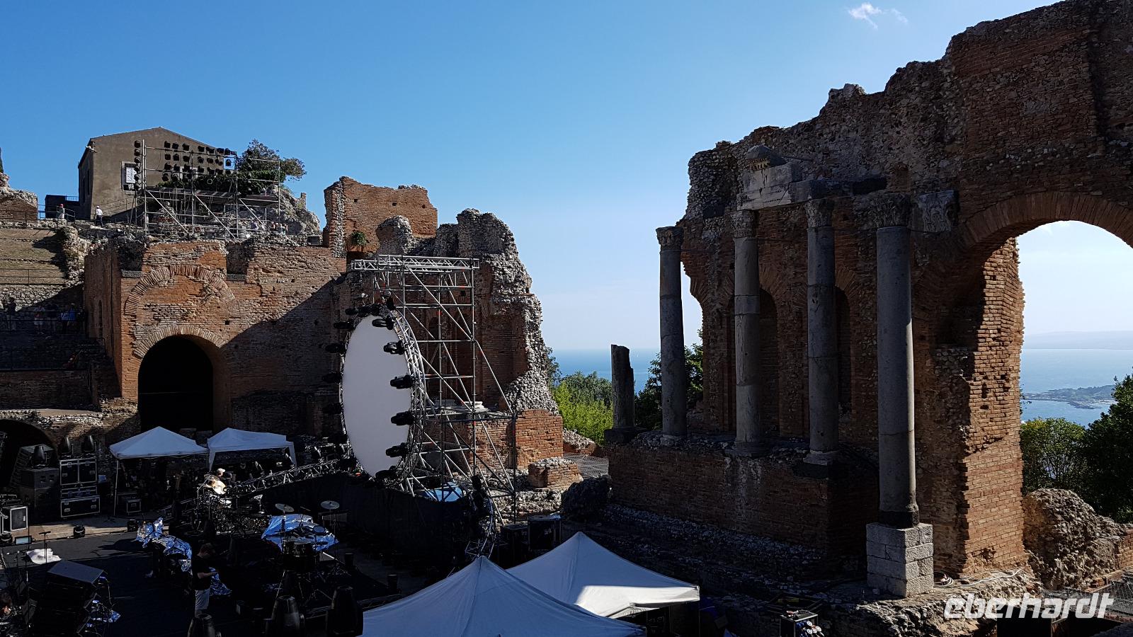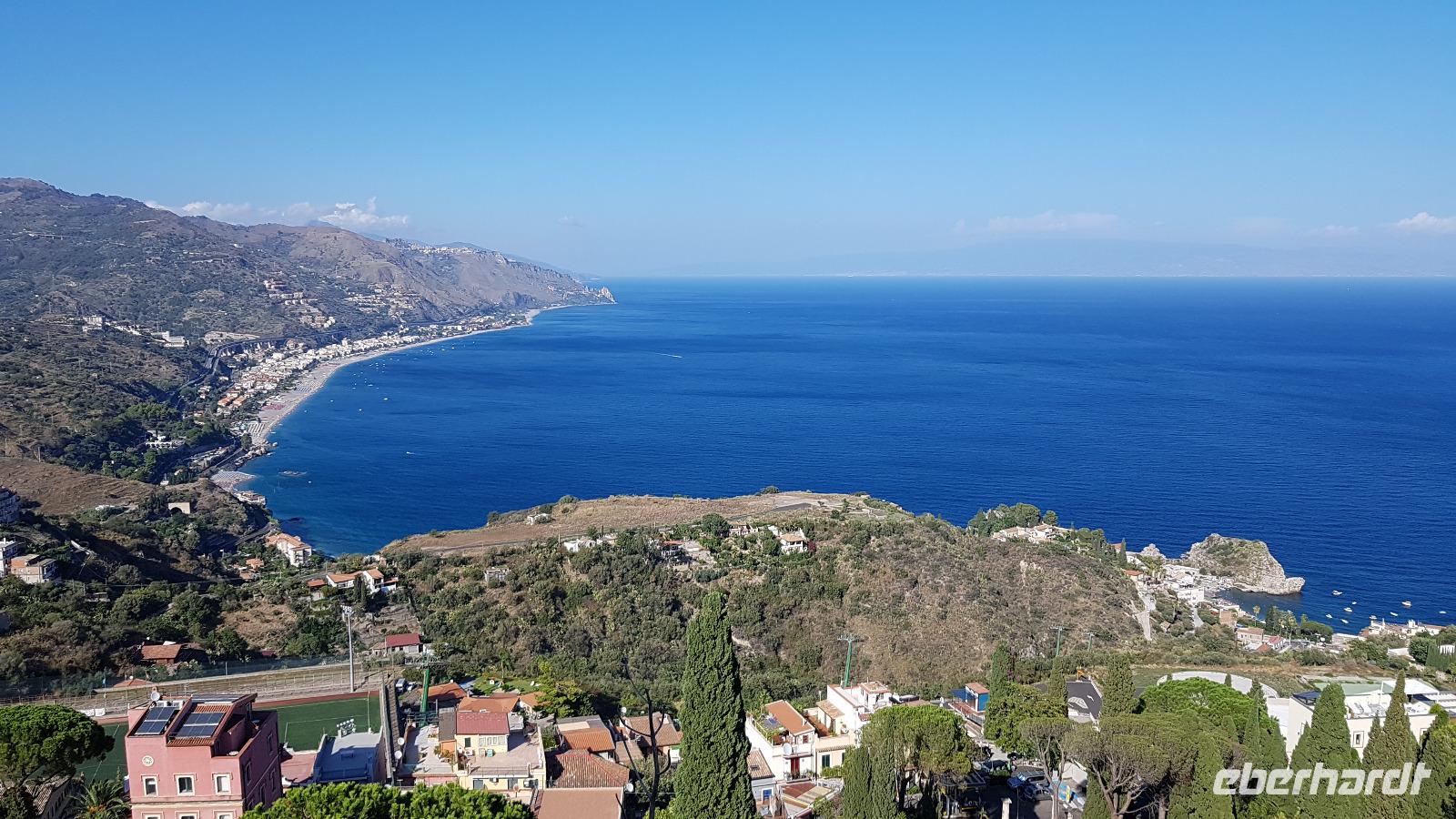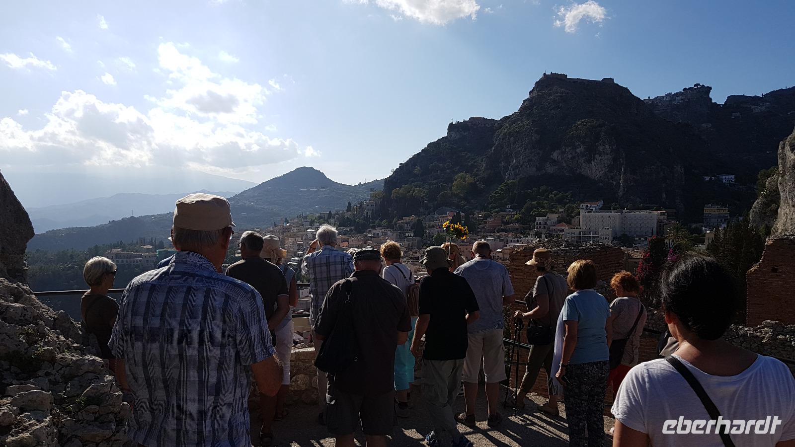 Eine der schönsten Städte Siziliens (und die teuerste) wartete auf uns zum Abschluss unserer Reise. Hoch oben auf dem Berg gelegen wird sie nur von Castelmola überragt. Luca darf mit seinem Bus nicht hinauffahren, also geht es mit einem Shuttle-Bus hinauf in die Stadt. An der Porta Messina betreten wir den Umberto Corso, die Flaniermeile der Stadt. Wir orientieren uns kurz und spazieren dann zum griechischen Theater. Rasch haben wir unsere Tickets und dann schauen wir uns auf den Bildschirmen die Darstellung des Theaters an, wie es einmal aussah und wie es erbaut wurde. Absolut interessant. Schließlich gehen wir hinein und sind beeindruckt. Eine solche Größe hatten wir nicht erwartet, mehr als 100 Meter ist es breit, viele Sitzplätze sind wieder für die aktuelle Saison aufgebaut, denn das Theater wird immer noch für Konzerte und Veranstaltungen genutzt. Gerade wird eine Bühne aufgebaut, ein Pop-Konzert findet heute Abend statt. Von ganz oben haben wir dann einen grandiosen Blick auf die Bucht von Messina und auf der anderen Seite auf die Bucht und Taormina und Giardini Naxos. Nur der Ätna spielt nicht mit, er verhüllt sich mit Wolken. Wir sollen wohl doch noch einmal wiederkommen, um ihn richtig zu sehen. :-)) Gemeinsam spazieren wir dann hinunter zum römischen Odeon und ab da haben wir wieder Freizeit und Gelegenheit, dieses schöne Städtchen zu erkunden. In der Marienkirche findet gerade eine Hochzeit statt- das wollen sich viele doch nicht entgehen lassen und genießen im gegenüberliegenden Cafe die Zeit bei einer Granita oder einem Eis. Dann geht es mit den Shuttlebussen zurück zum Parkhaus Lumbi wo Luca bereits mit seinem Bus auf uns wartet. Ein letztes Mal freuen wir uns über den tollen Blick auf die Bucht und Giardini Naxos, dann sind wir bereits am Hotel angekommen. Hier müssen wir uns von unserem Fahrer Luca verabschieden, wir wissen noch nicht, wer uns morgen zum Flughafen fahren wird. Also bekommt Luca einen Riesen-Applaus und viel Dank für sein sicheres Fahren. Wir checken ein und unsere Koffer werden wieder zur Vilette gefahren. Zum Abendessen treffen wir uns wieder- die letzte gemeinsame Mahlzeit, einige Gäste verlängern ihren Urlaub und bleiben noch, alle anderen fliegen morgen zurück nach Hause. Nach dem Abendessen müssen wir uns dann noch um die restlichen Bestände von Limoncello und Mandelwein kümmern und treffen uns kurzentschlossen vor meiner Vilette. Mit viel Lachen und Spass lassen wir unsere Reise Revue passieren und der Höhepunkt war dann das Gedicht, dass unser Herr N. verfasst hatte und vortrug: