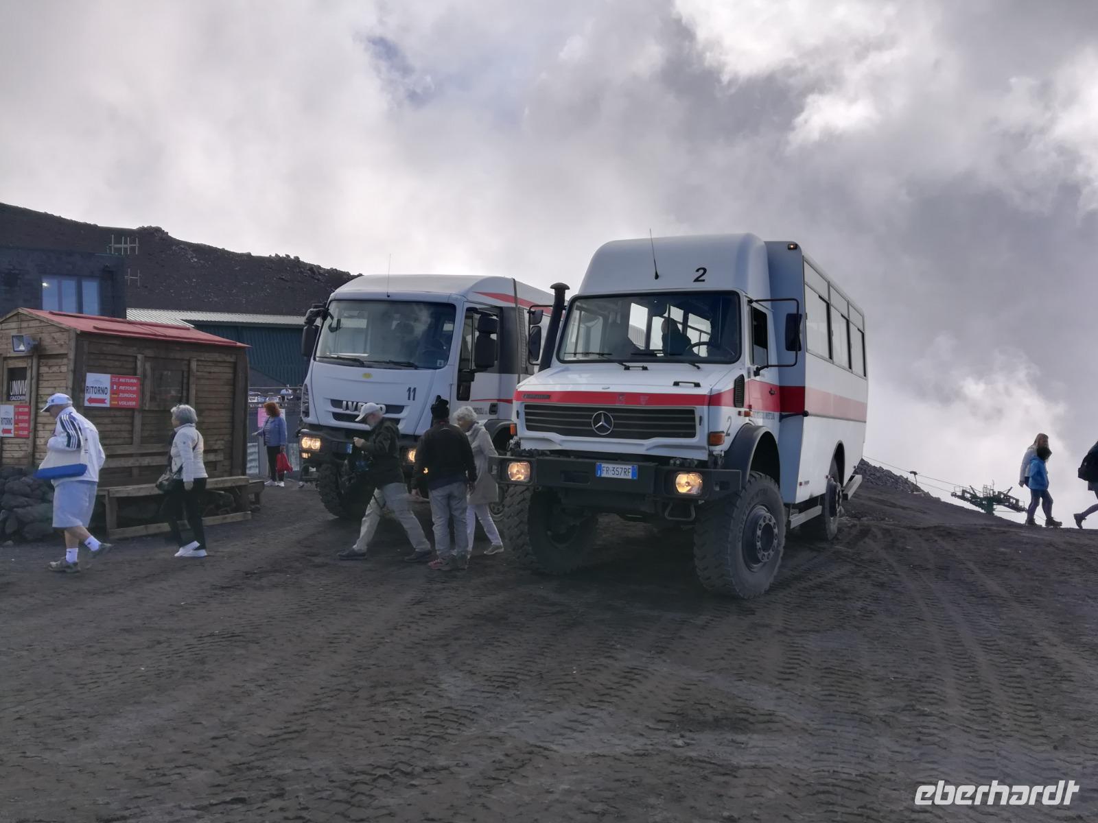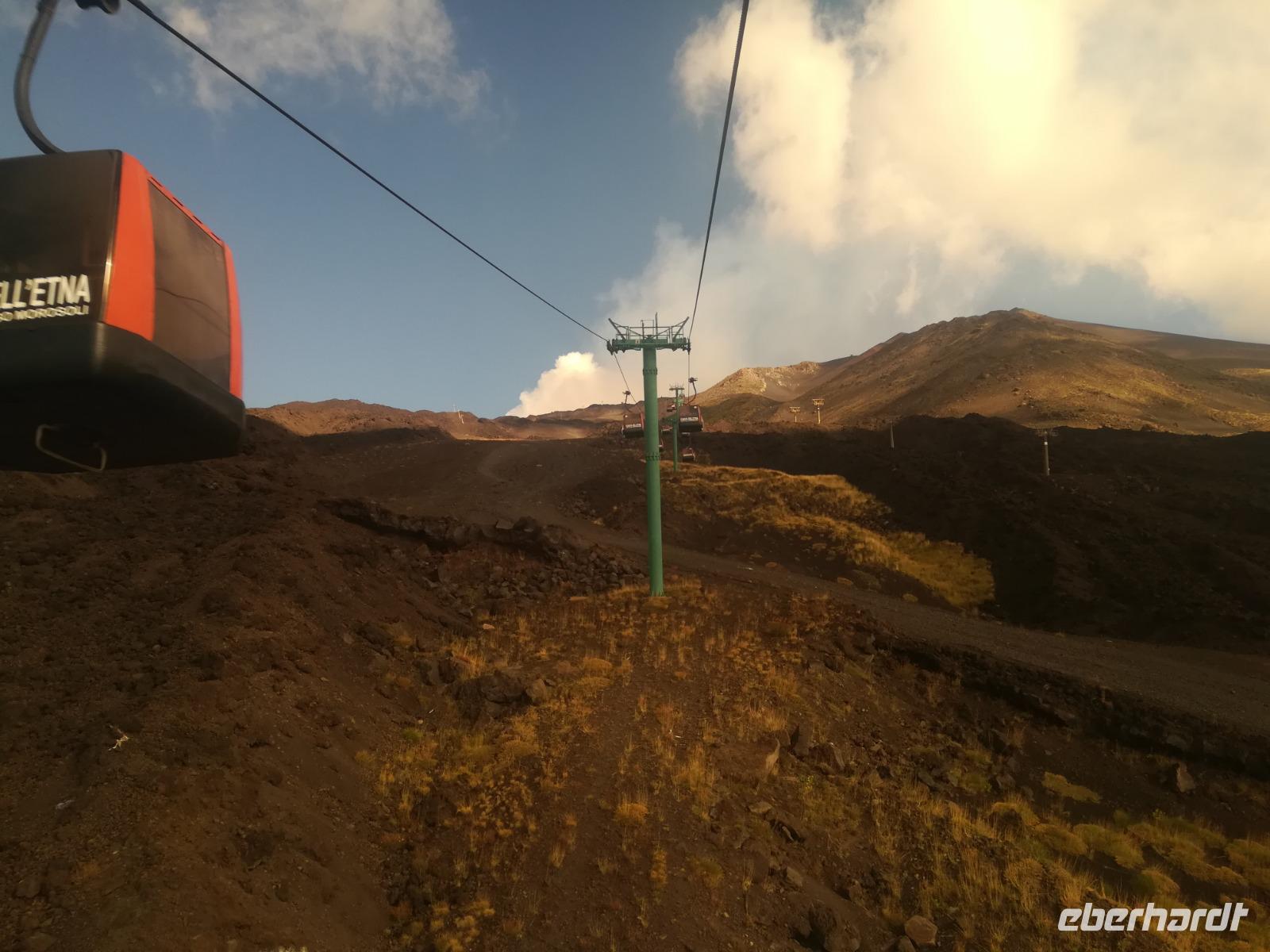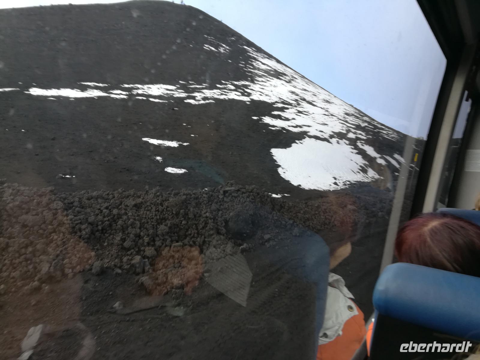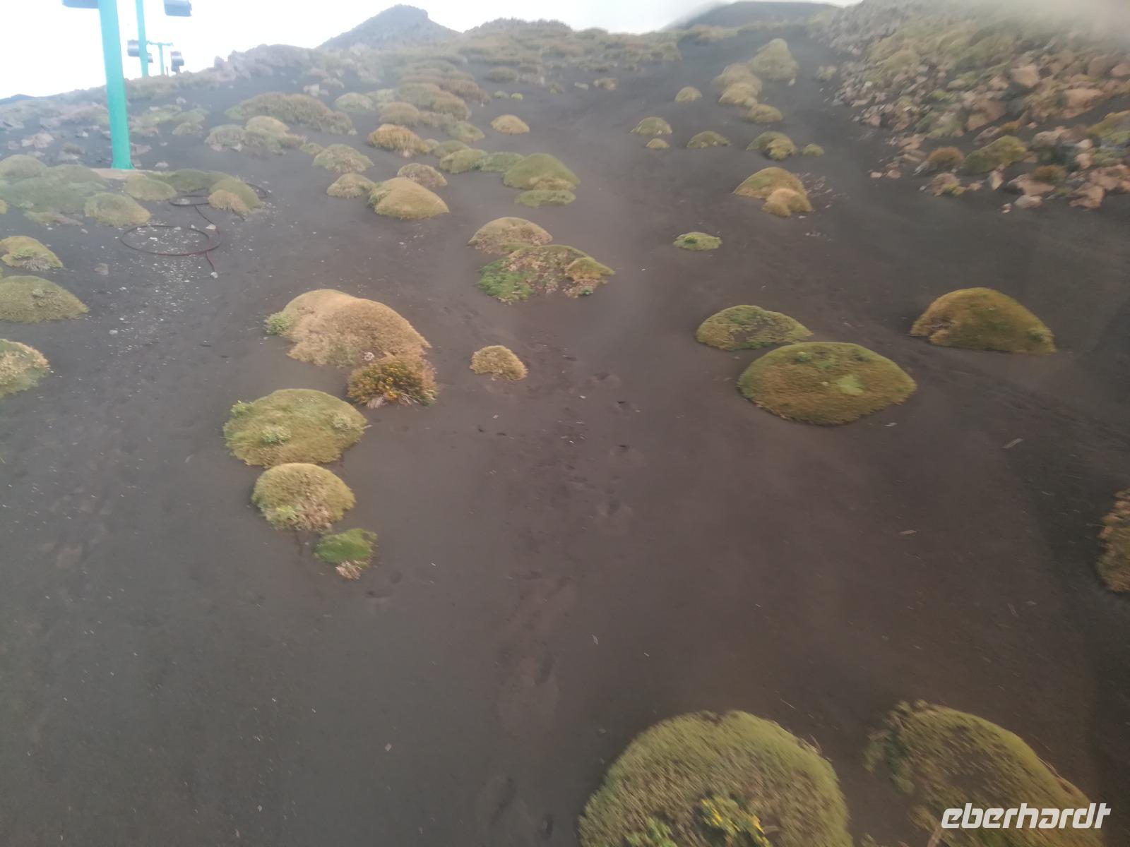Unser Bus bringt uns auf eine Höhe von 1923 m und beim Ausstieg am Rifugio Sapienza sind wir umgeben von den Silvesterkratern, erloschene Krater, auf denen man gut spazieren gehen könnte. Wir aber wollen höher hinauf und nehmen die Seilbahn an der südlichen Zufahrt zum Ätna. Diese wiederum bringt uns auf eine Höhe von 2504 m. Während der Seilfahrt blicken wir auf das schwarze Lavagestein, das sich unter uns auftürmt und wir erkennen gut den Übergang von mediterran-alpinem Bewuchs in Form von Büschen, Sträuchern und dem charakteristischen Ätna-Ginster, sowie das Erreichen der Waldgrenze mit fortan typischen, dornigen Kissenpolstern. Die Bergstation ist erreicht und hier warten, bestens organisiert, bereits geländegängige Kleinbusse auf uns, um mit uns auf abenteuerlichem Lavagestein in Serpentinenform auf 2913 m hoch zu fahren.