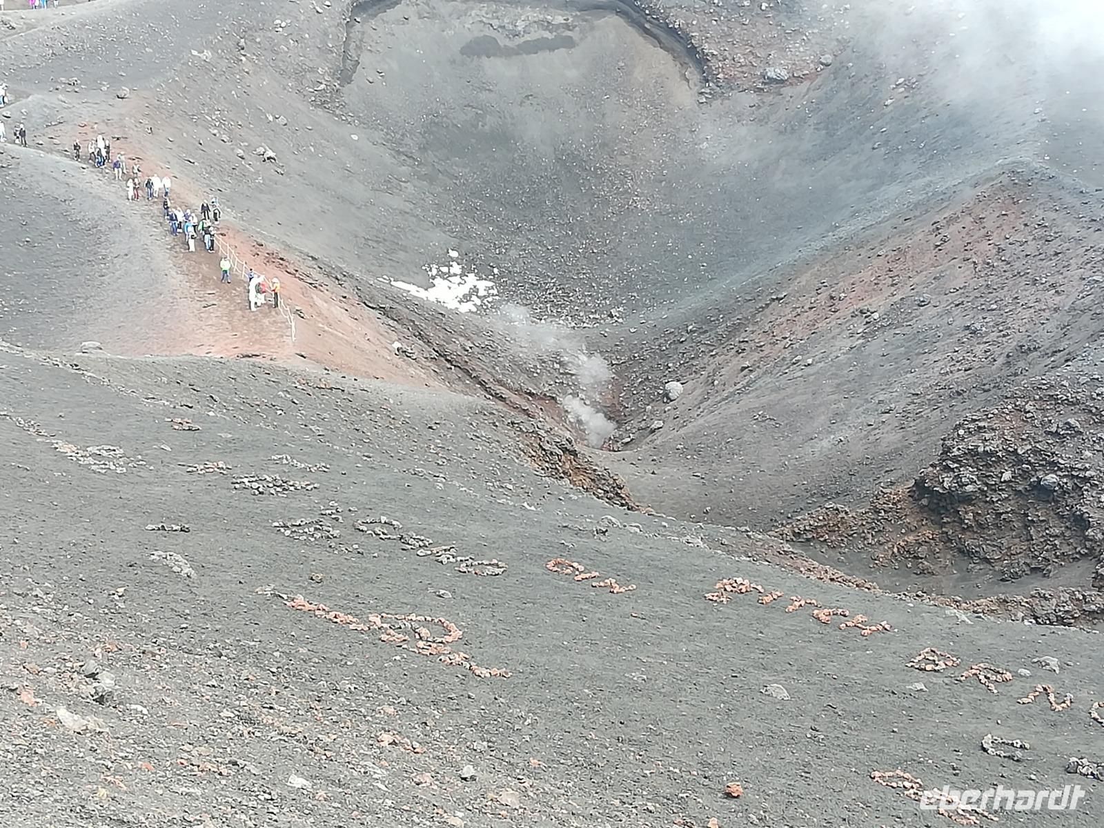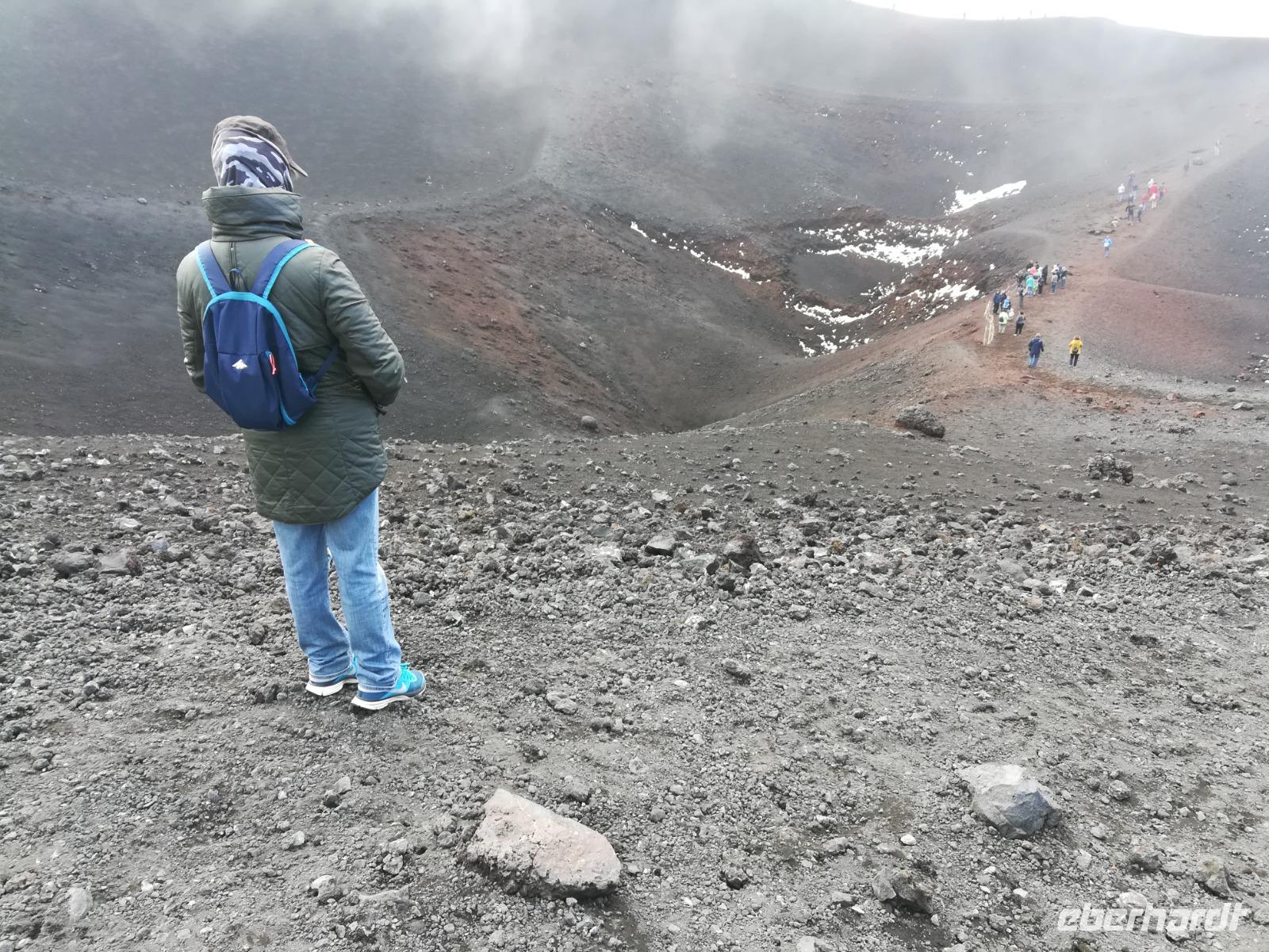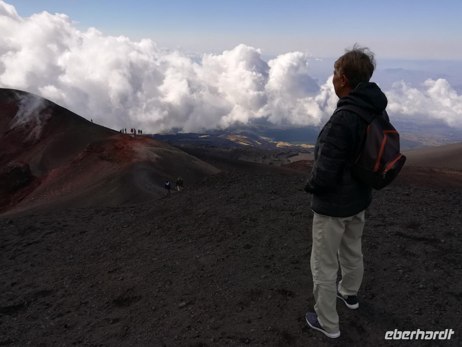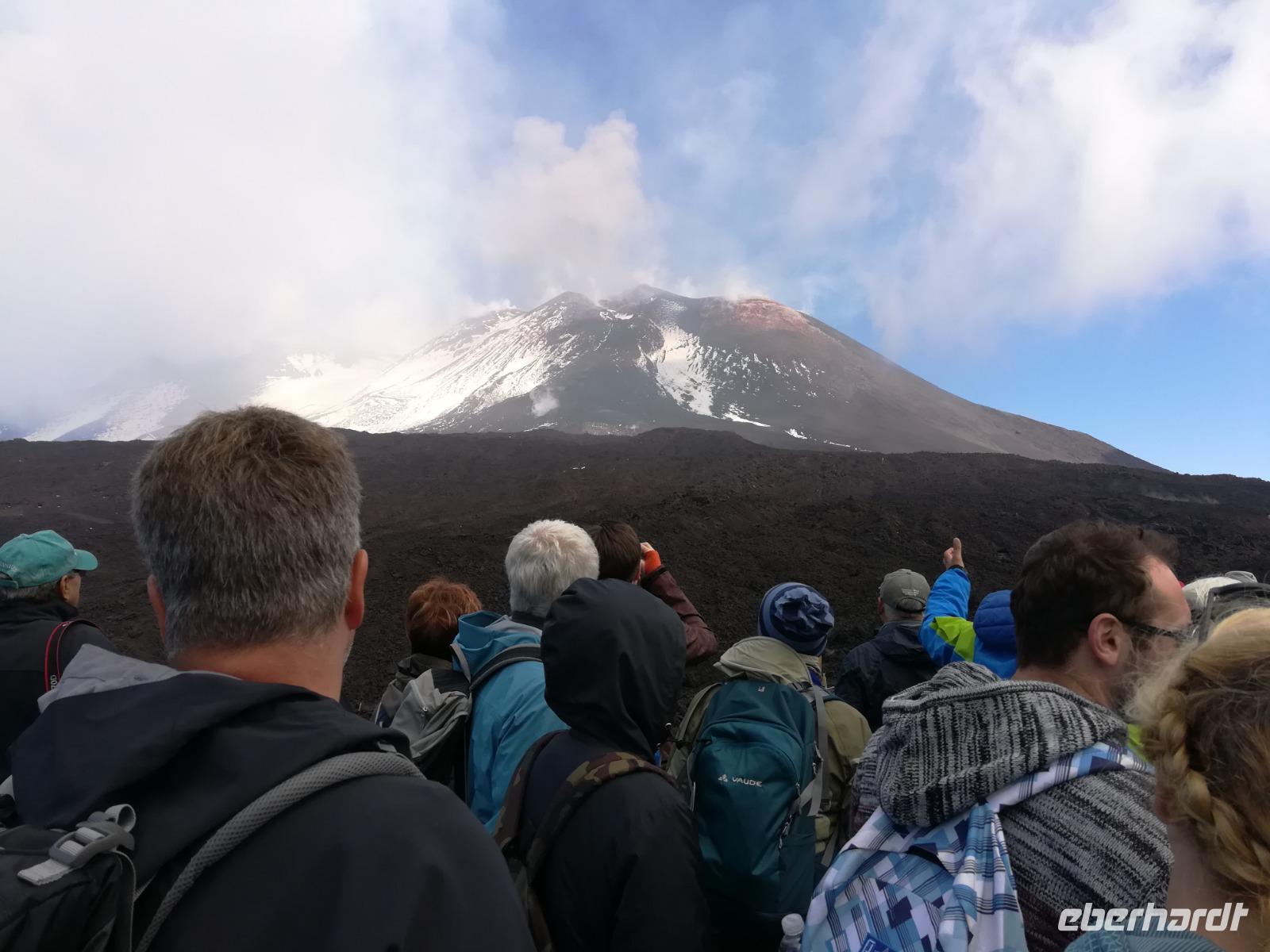 Von hier haben wir einen großartigen Blick zum Ätnakegel, der etwa 300 m höher liegt. Wir sehen aus dem Kegel Dampf aufsteigen. Wir können bestens ausgerüstete Wandergruppen beobachten, die mit Helm und von Bergführern begleitet, diese 5 Stunden andauernde Tour zum Gipfel wagen.