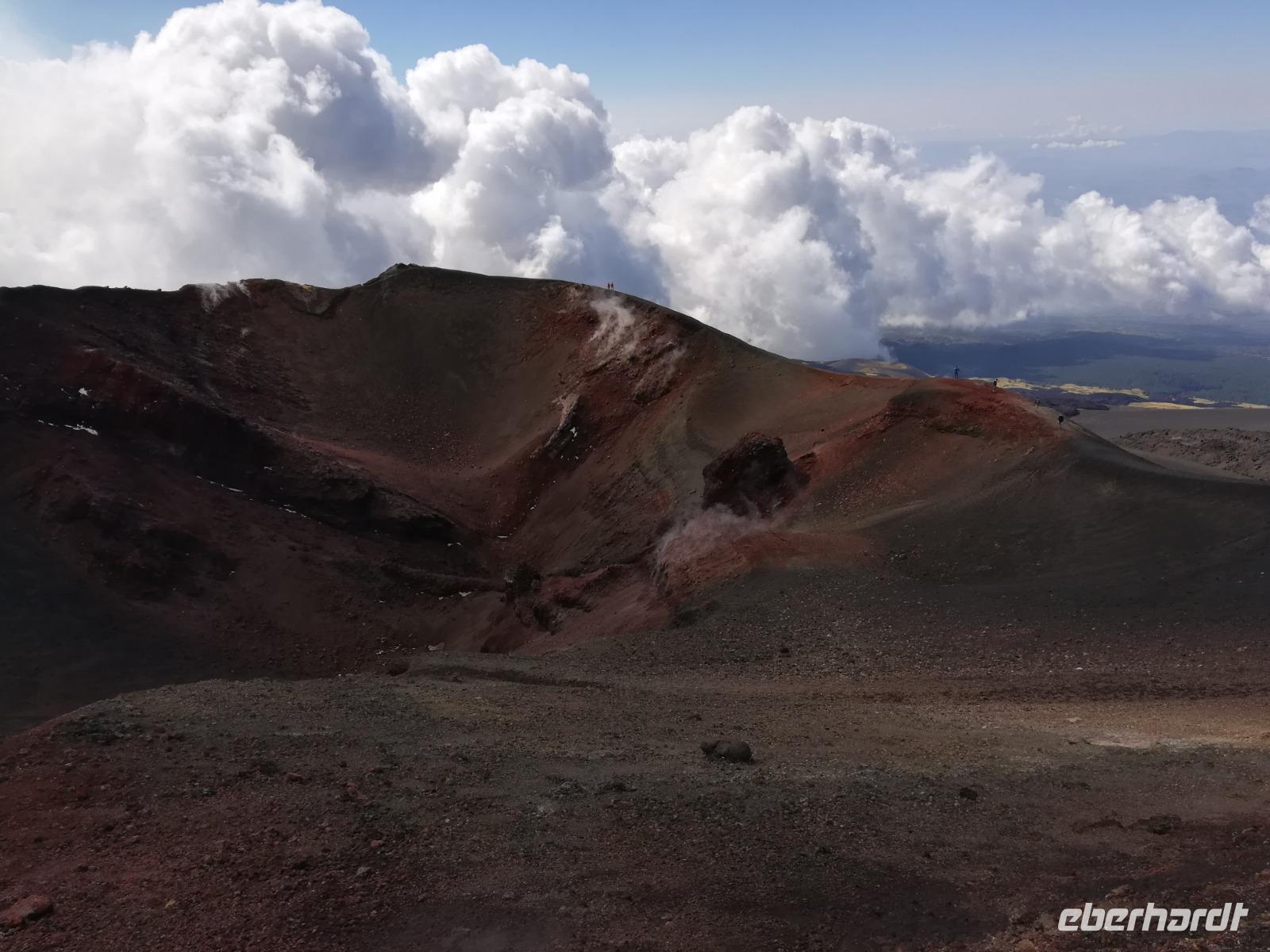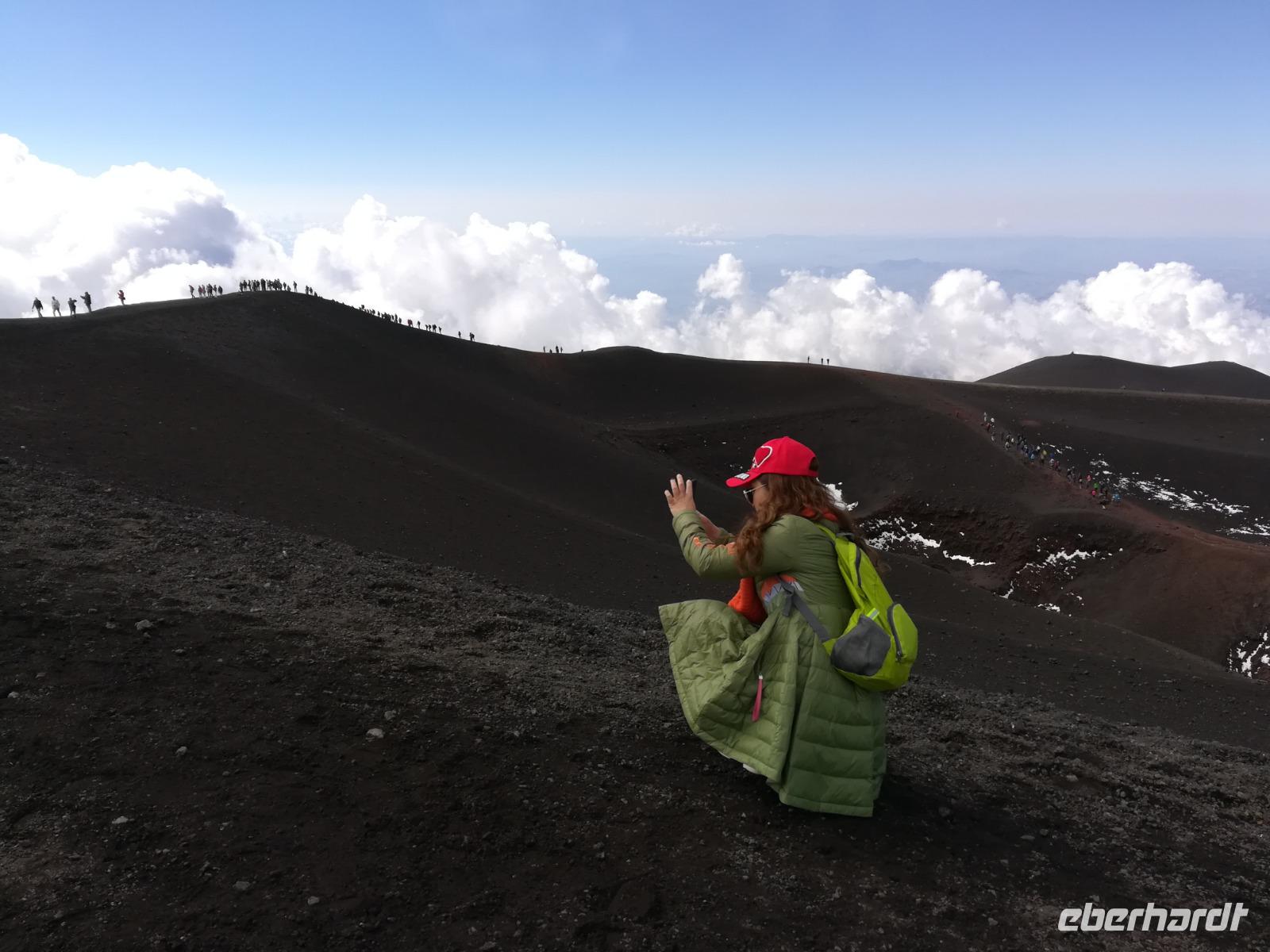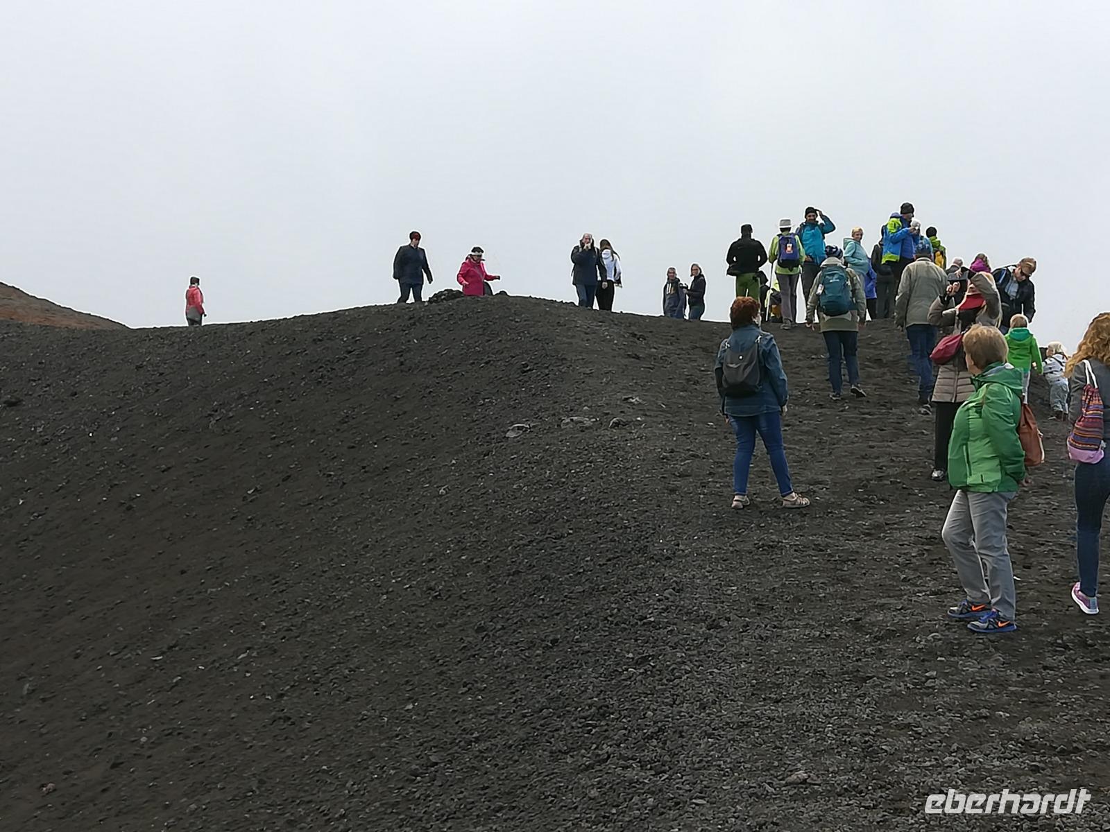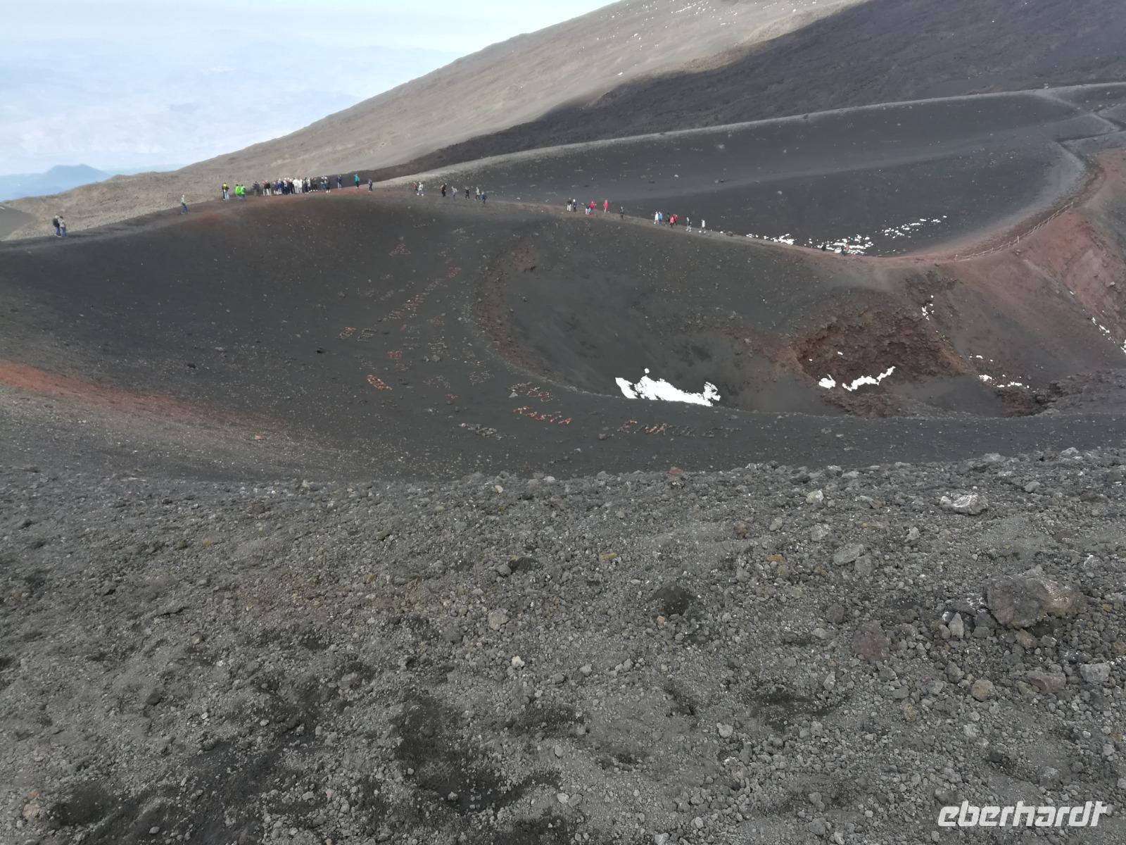 Von hier haben wir einen großartigen Blick zum Ätnakegel, der etwa 300 m höher liegt. Wir sehen aus dem Kegel Dampf aufsteigen. Wir können bestens ausgerüstete Wandergruppen beobachten, die mit Helm und von Bergführern begleitet, diese 5 Stunden andauernde Tour zum Gipfel wagen.