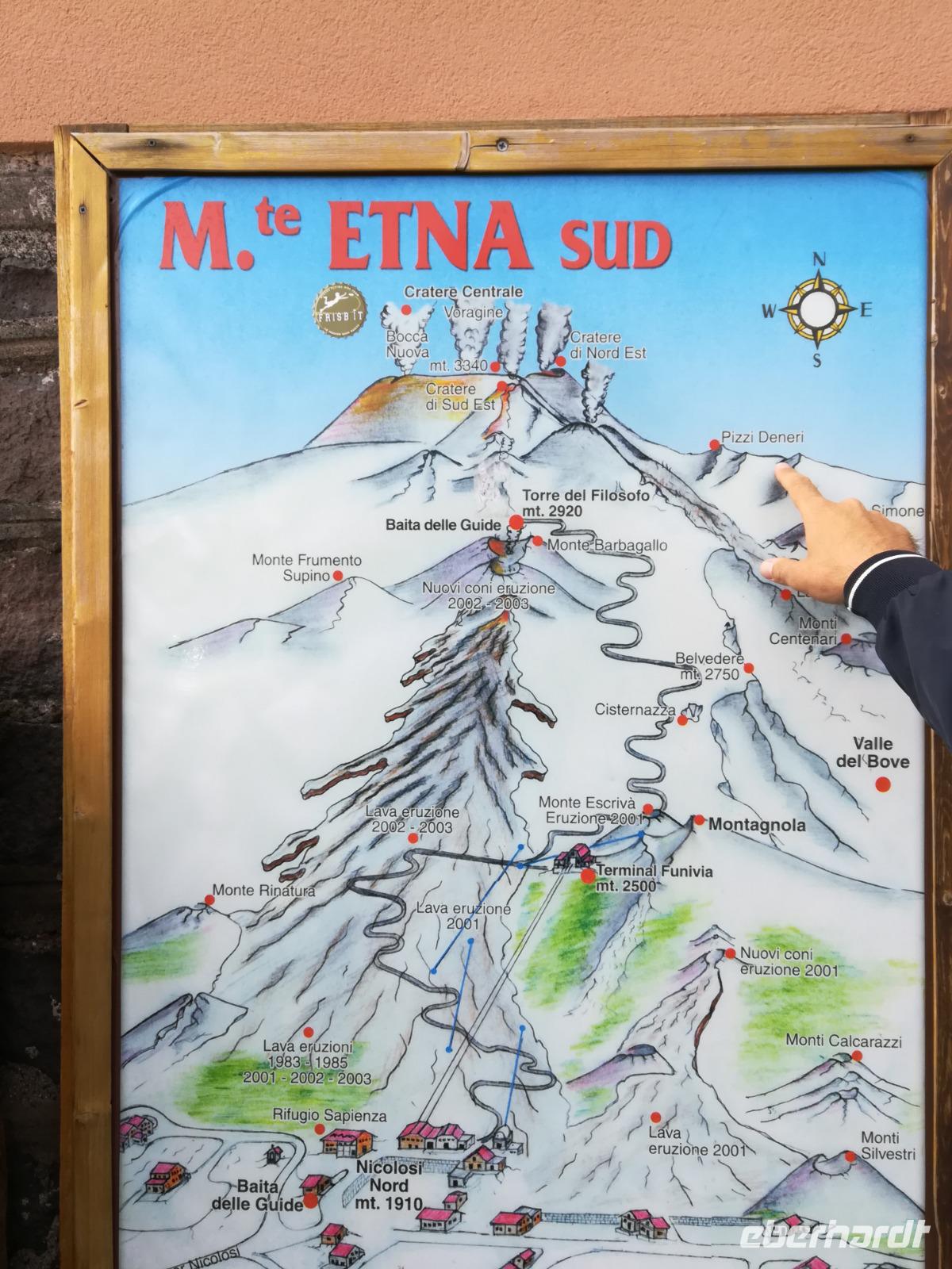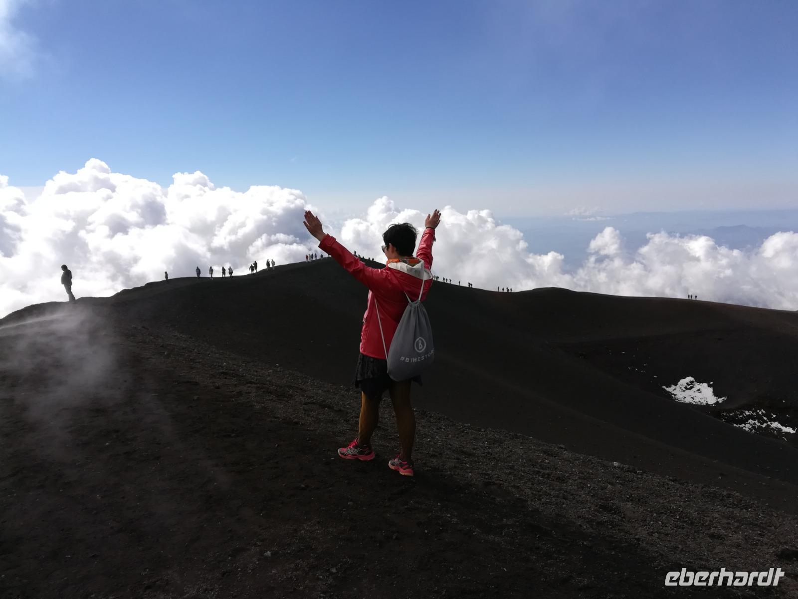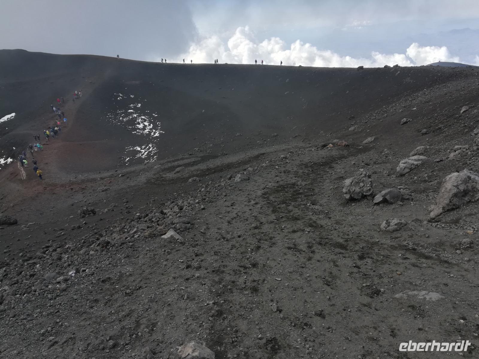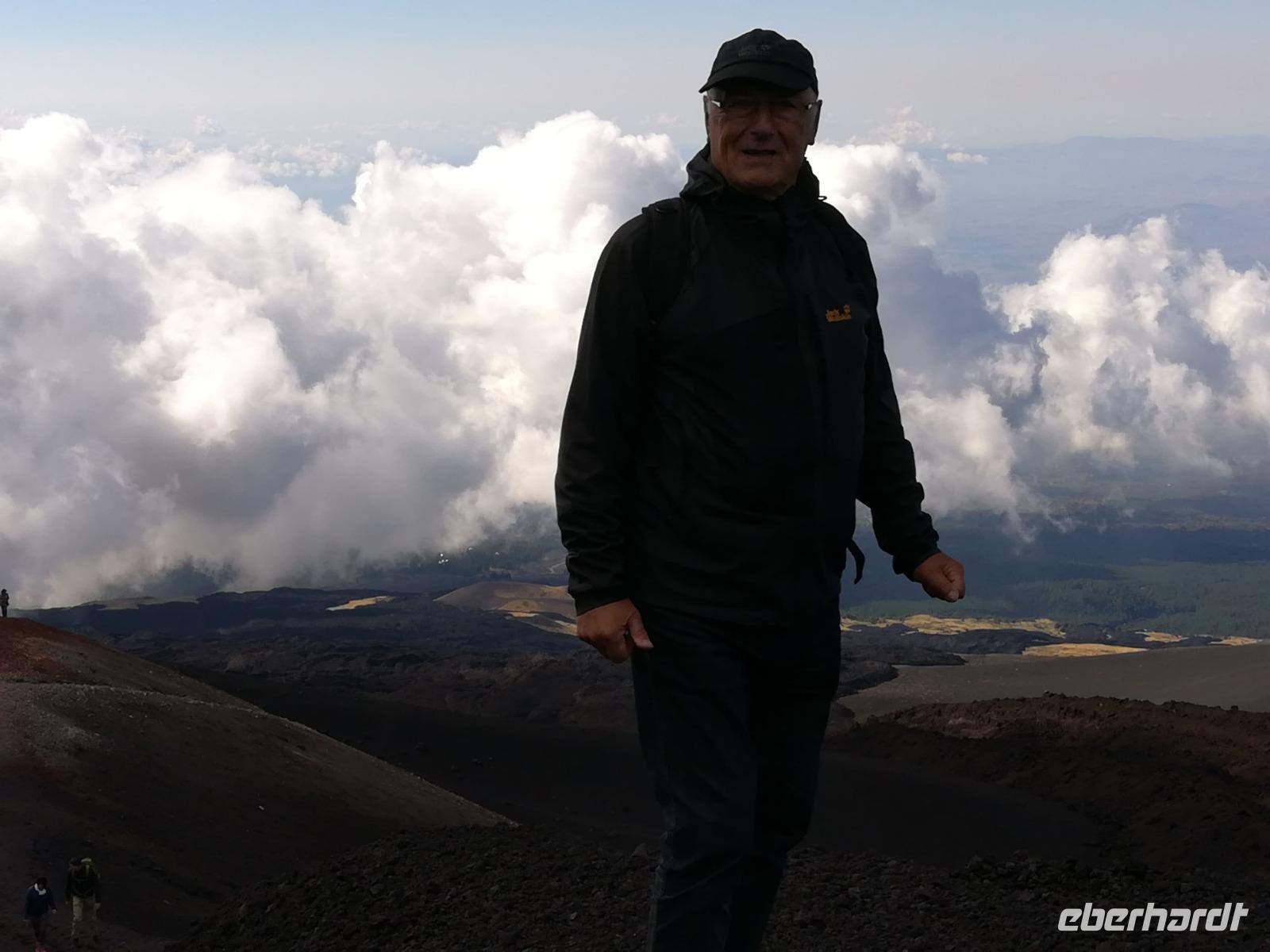 Von hier haben wir einen großartigen Blick zum Ätnakegel, der etwa 300 m höher liegt. Wir sehen aus dem Kegel Dampf aufsteigen. Wir können bestens ausgerüstete Wandergruppen beobachten, die mit Helm und von Bergführern begleitet, diese 5 Stunden andauernde Tour zum Gipfel wagen.
