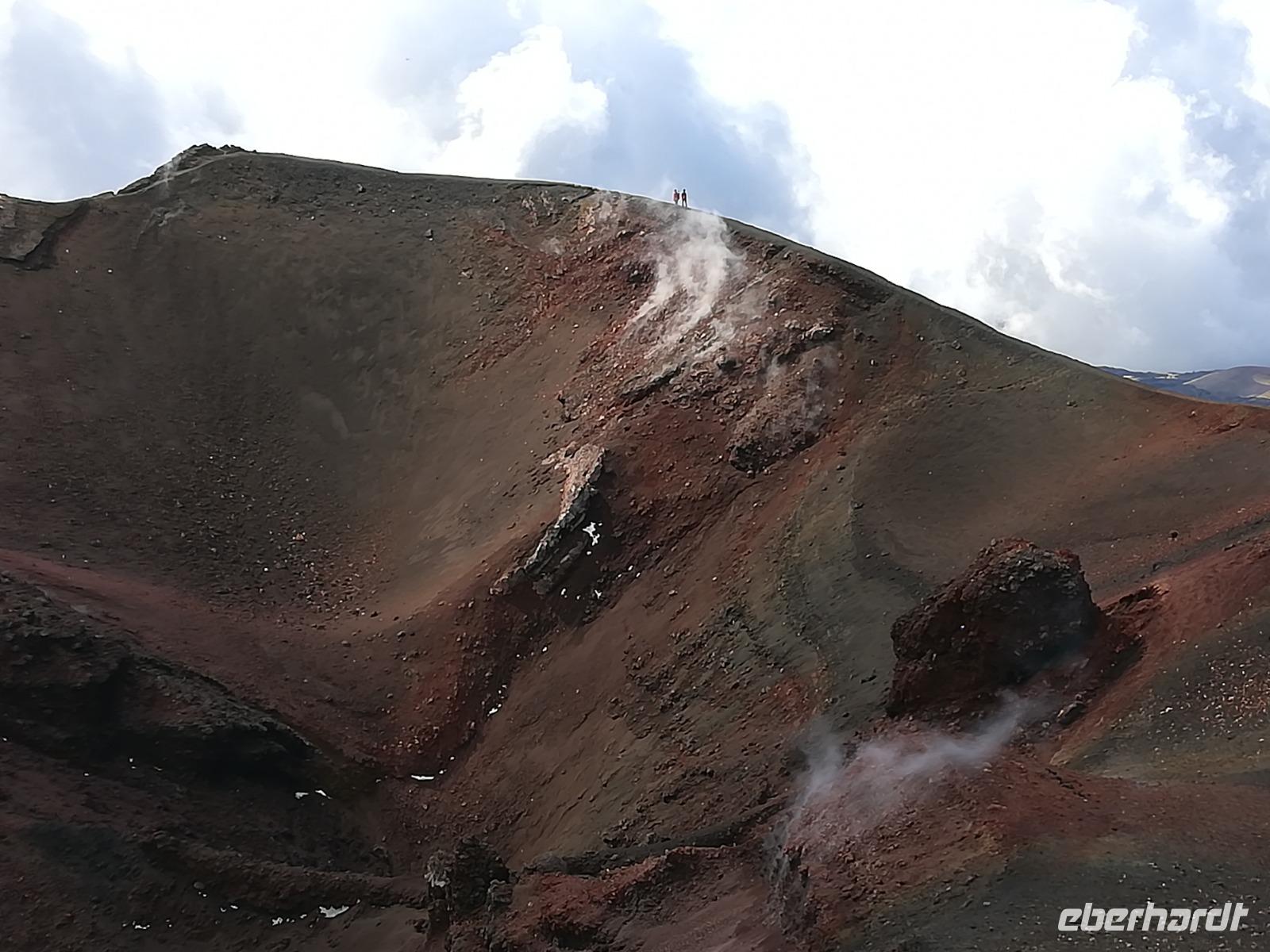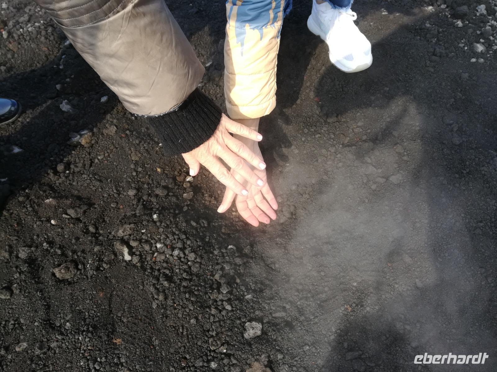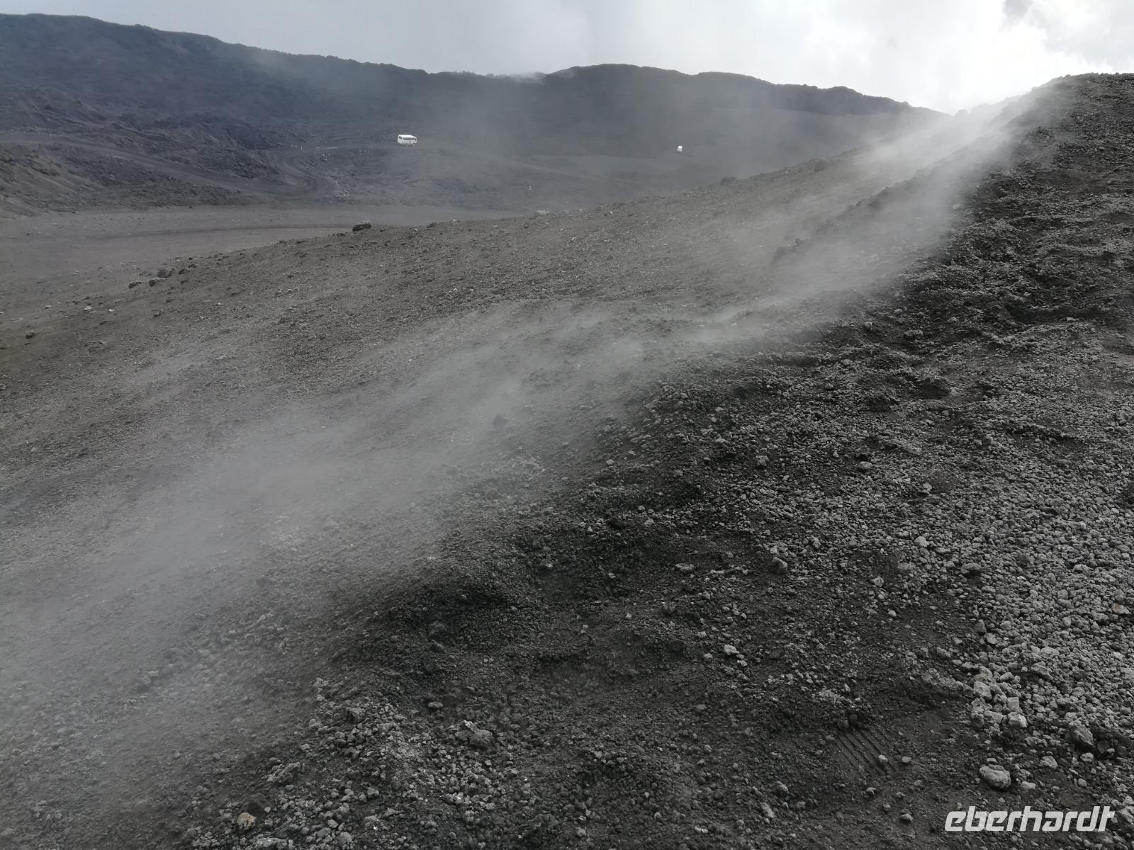 Der Boden, auf dem wir laufen, ist teilweise warm und wir können unsere Hand in kleine Wasserdampfwölkchen halten, für uns "Hobbyvulkanologen" der sichere Beweis dafür, dass der Vulkan noch aktiv ist.