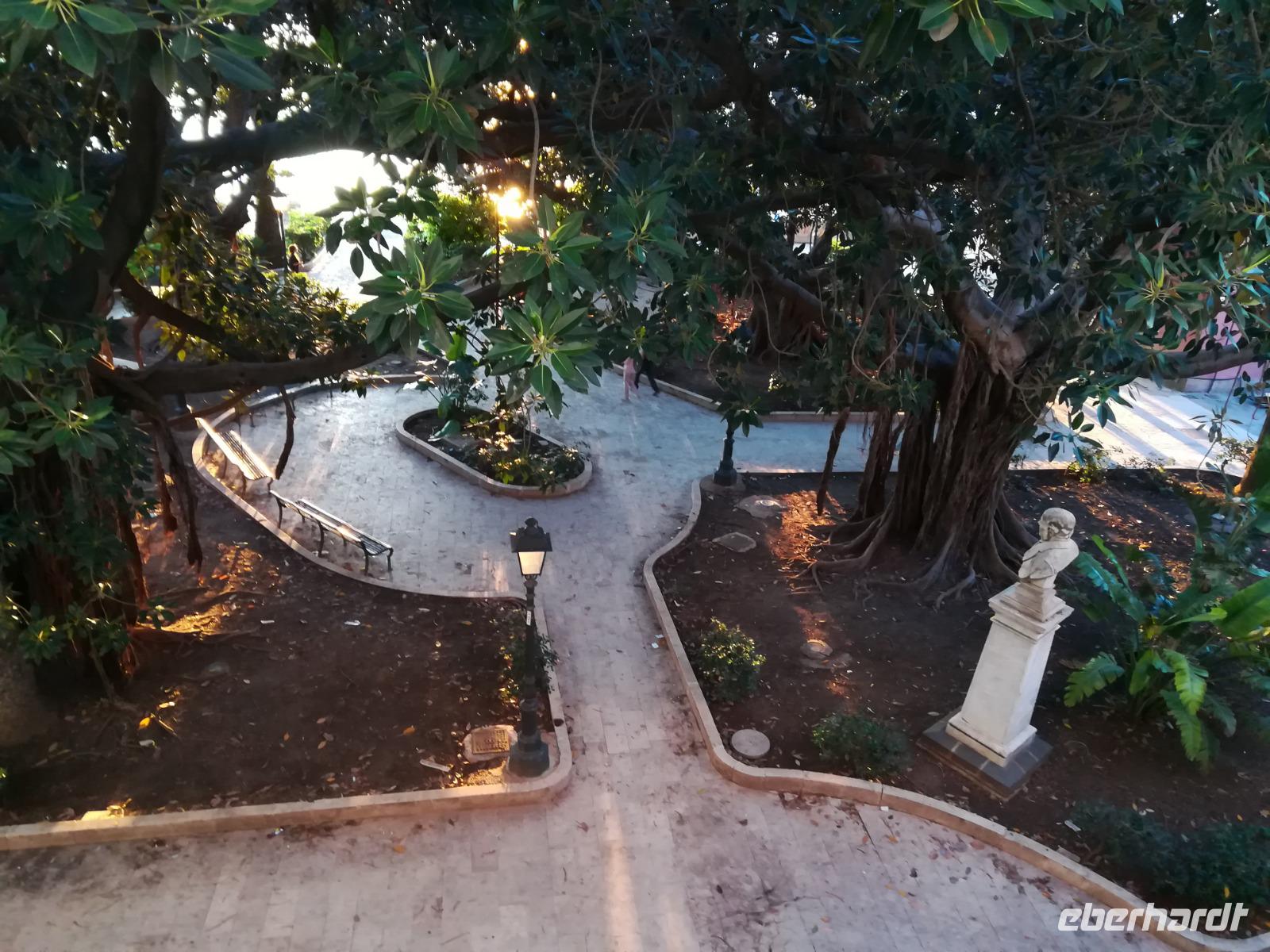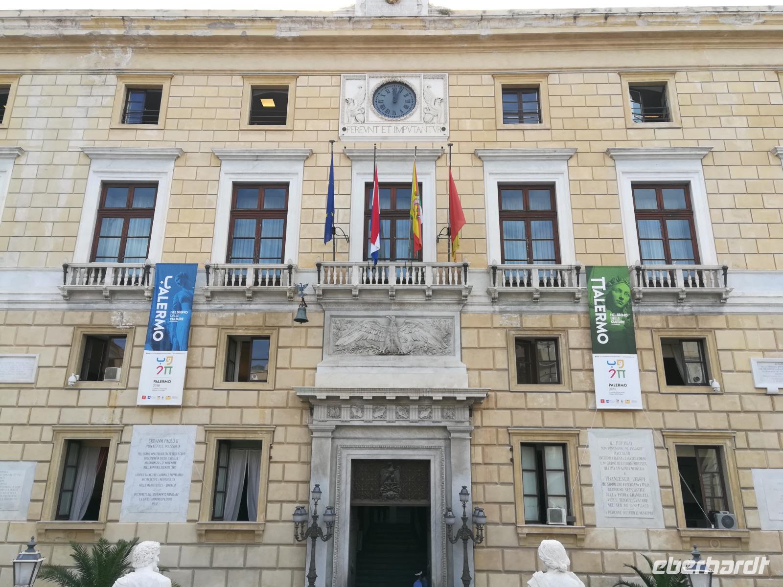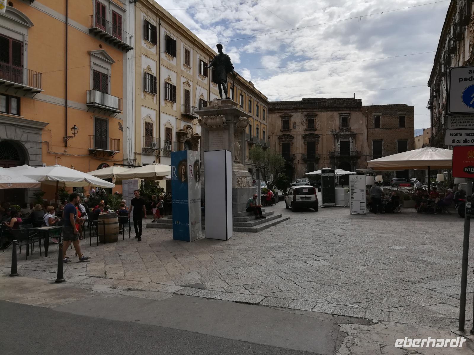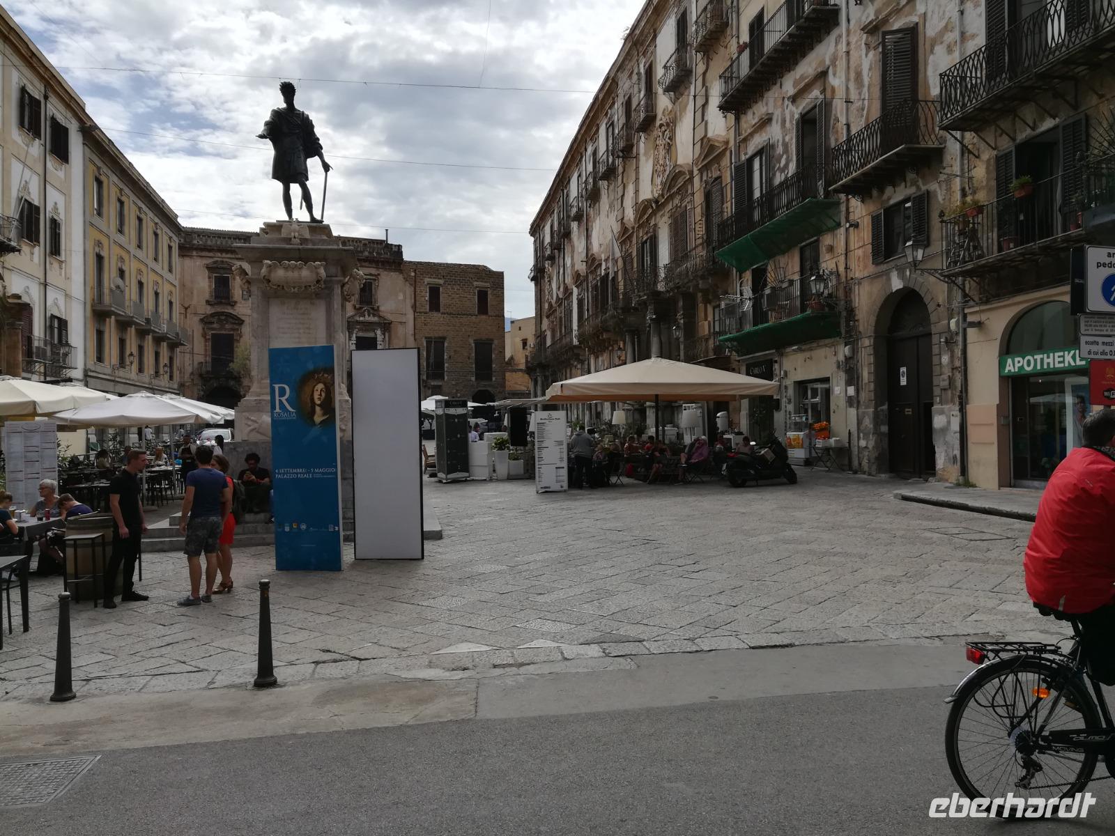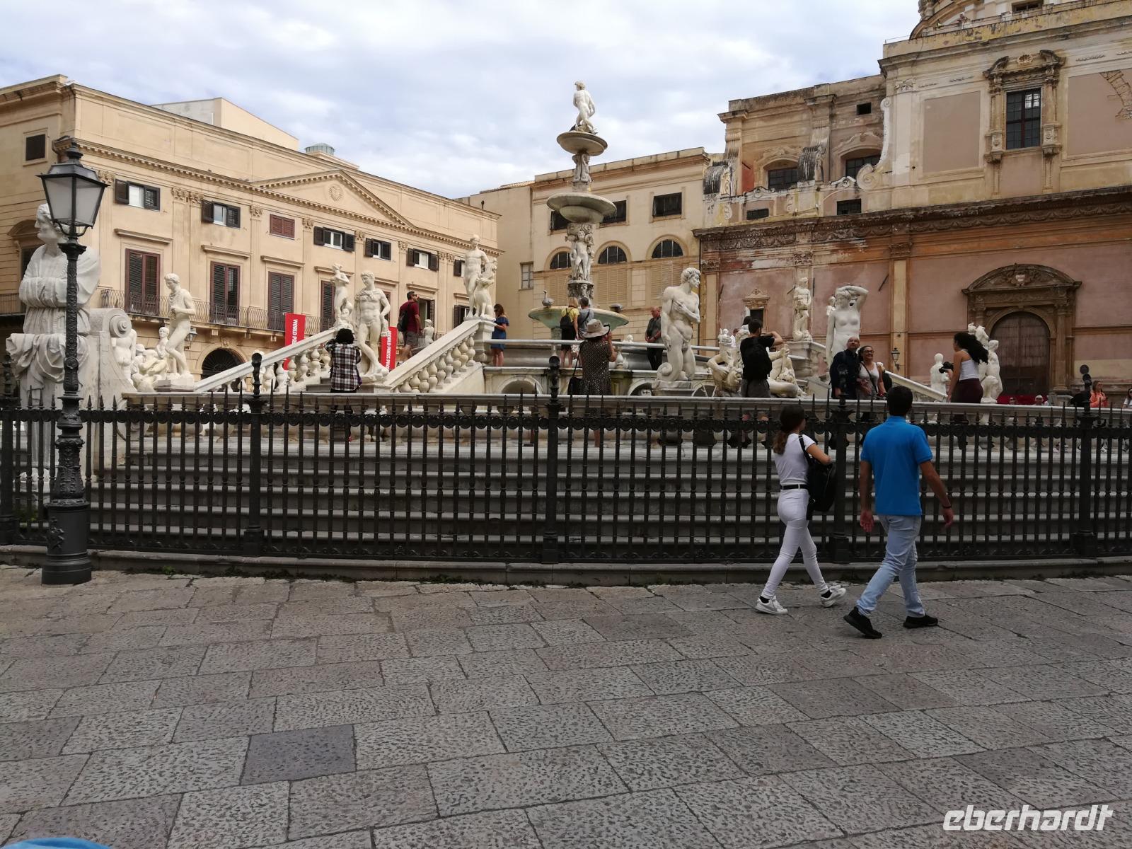 Unser Ziel ist der Rathausplatz mit der berühmten Fontana Pretoria, im Volksmund Brunnen der Schande genannt. Deshalb so genannt, weil Statuen stehend und liegend überwiegend nackt dargestellt wurden. Der Brunnenumfang umfaßt 133 m und in die Höhe ragt die Statue des Genius von Palermo, des Schutzpatrons der Stadt.