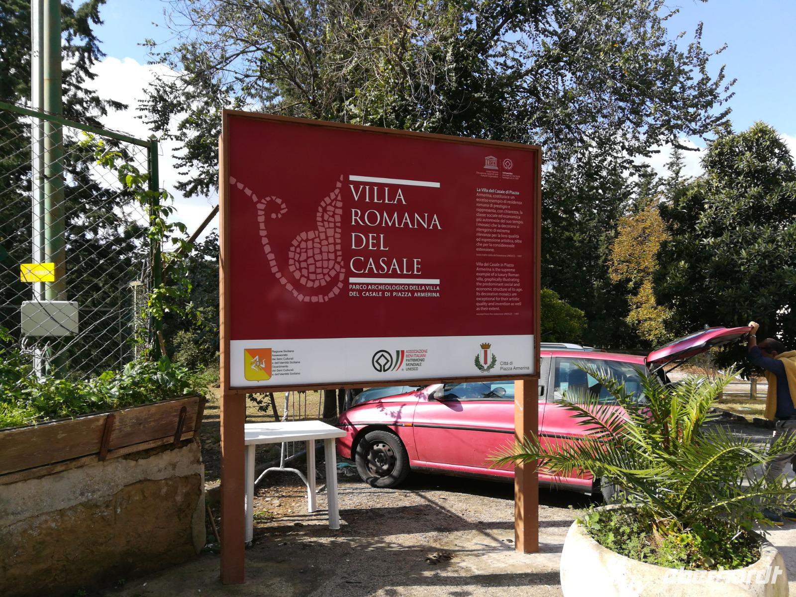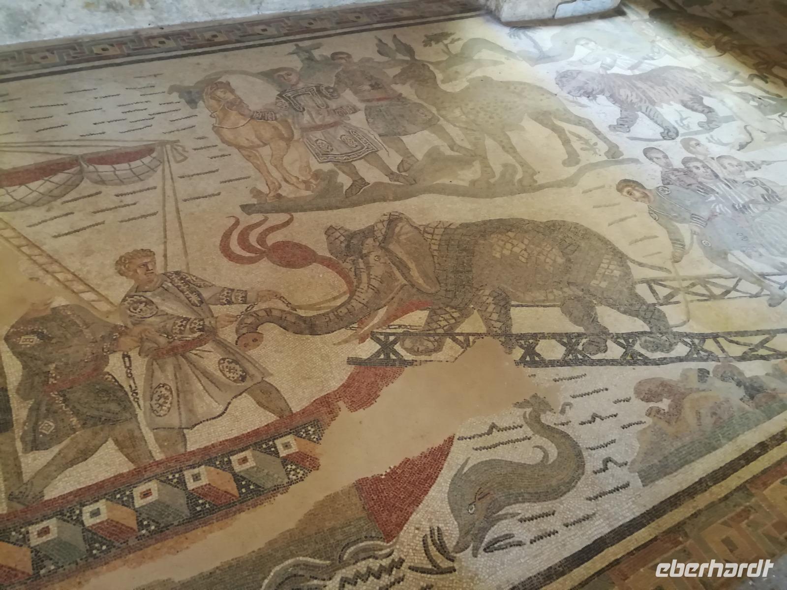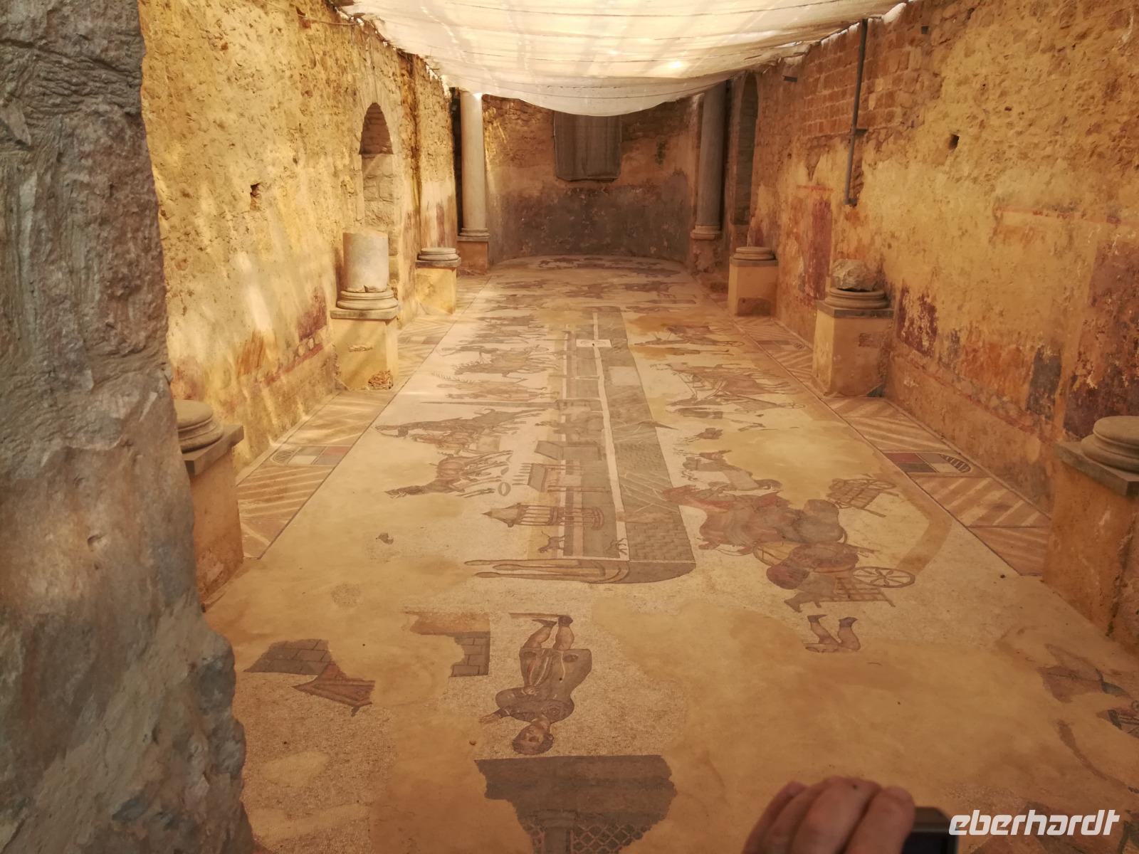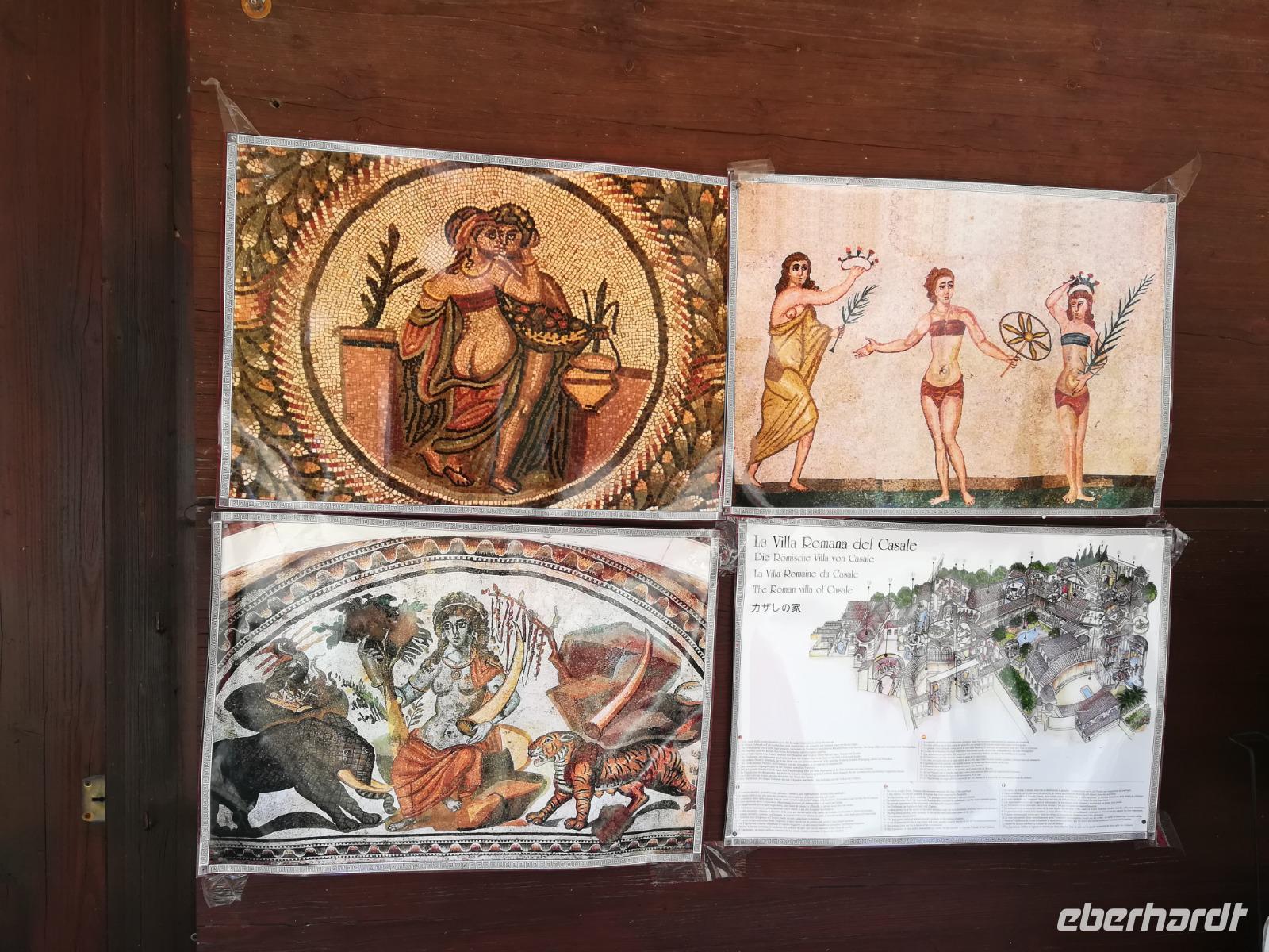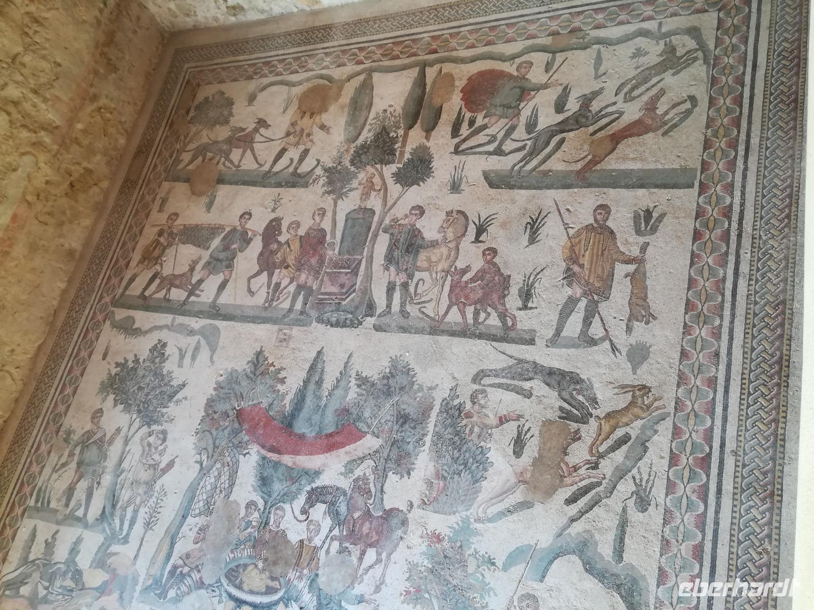 Unser Ziel ist die römische Villa del Casale aus dem 4.Jh., die damals Sitz einer römischen Adelsfamilie war. Der Charme dieser Villa ergibt sich vor allem dadurch, dass zauberhafte Mosaiken in erstaunlich gutem Zustand zu bewundern sind. Diese zeigen uns anschaulich den Lebenstil einer aristokratischen Familie der Antike, wahrscheinlich eines Gouverneurs aus Rom.