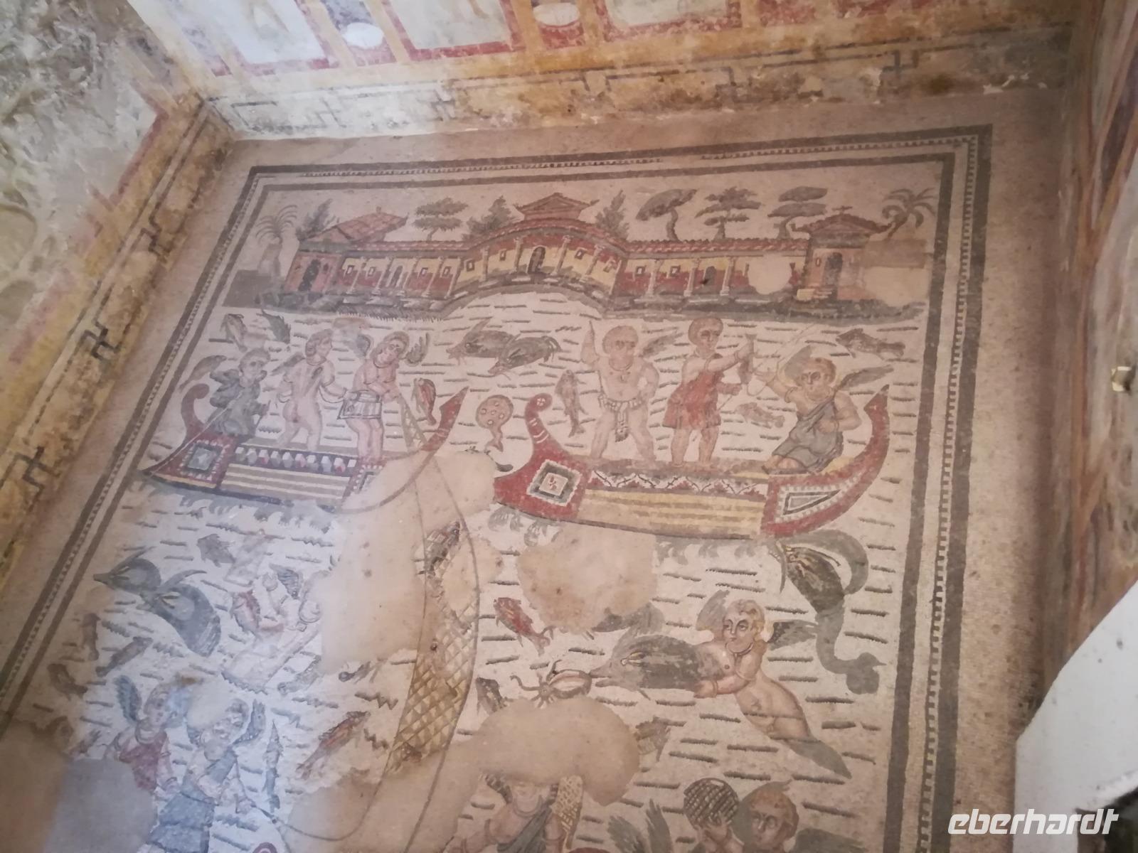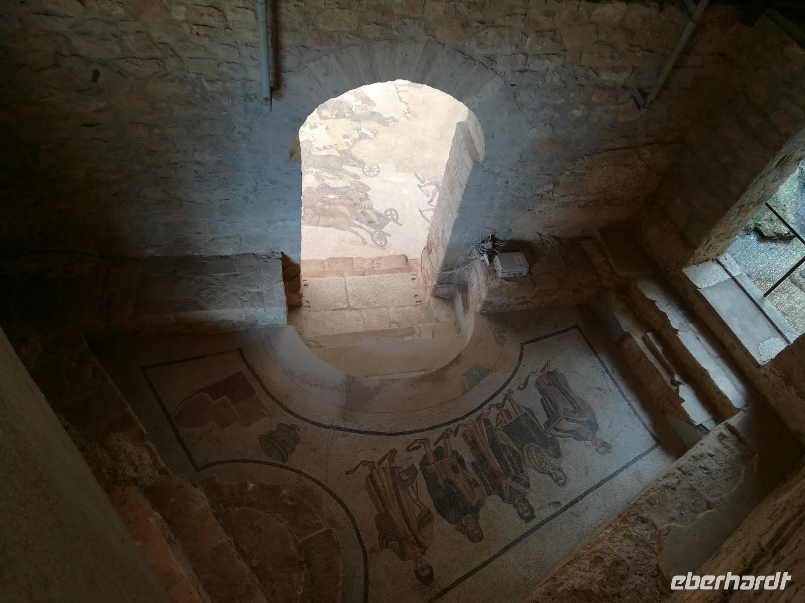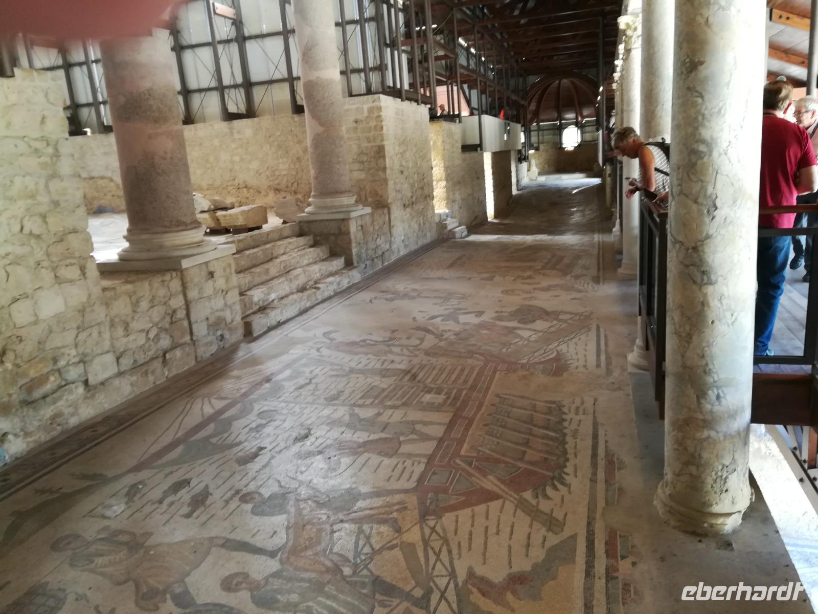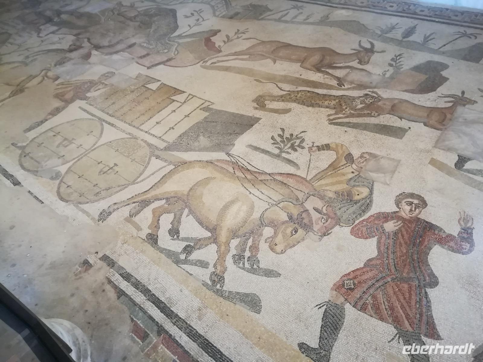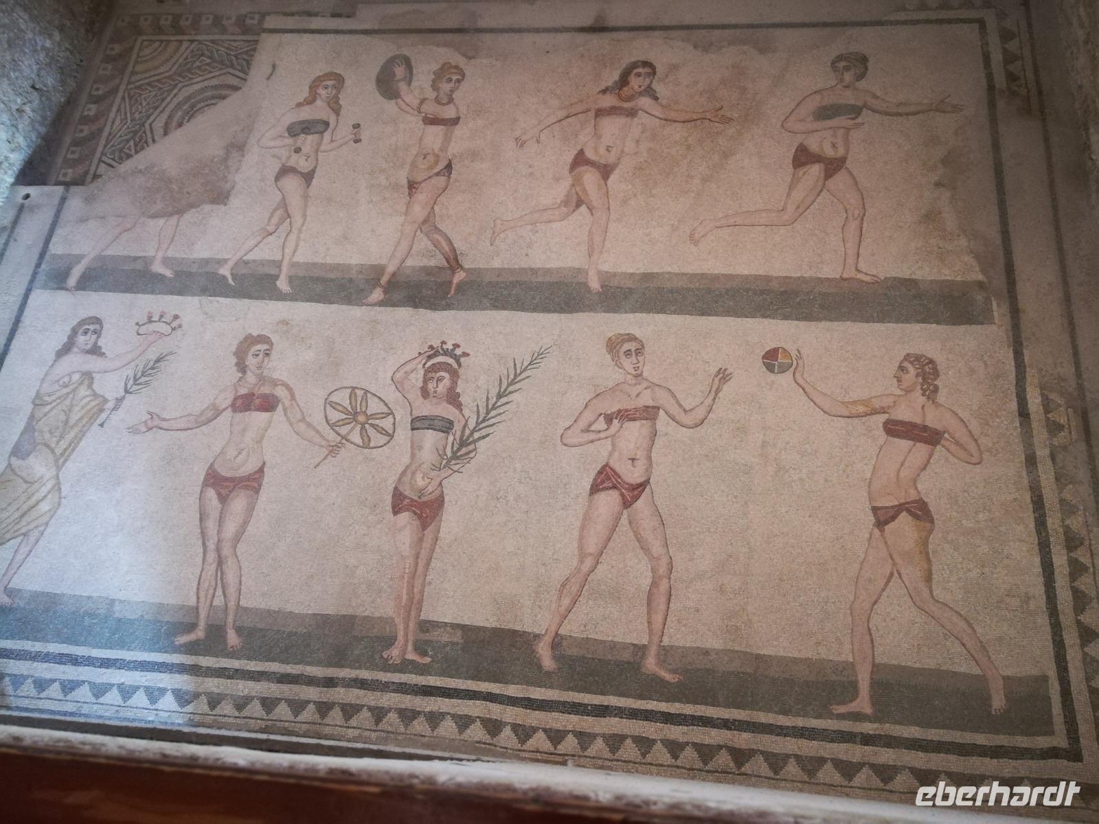 In diesen Mosaiken werden Geschichten aus Jagd- und Alltagsszenen erzählt, sogenannte Narrativ-Zyklen. Für uns alle wohl ganz besonders interessant waren die Bikinimosaiken zu sehen, die Sportlerinnen in der Antike zeigten. Dass es sowas damals gab ...