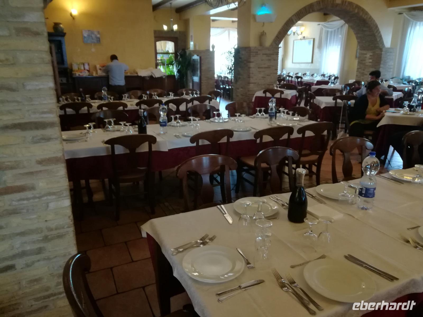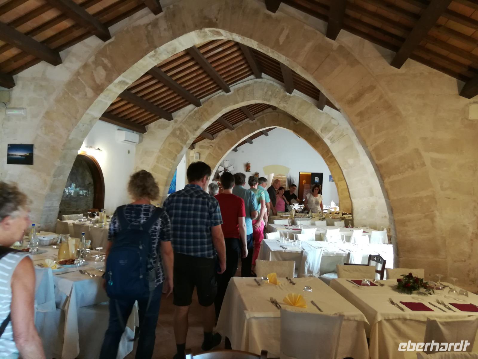 Hier ist nun Mittagessen vorgesehen und zwar in der "Trattoria del Sale", einem rustikalen Restaurant, wo wir Produkte der einheimischen Region wie Oliven, Käse, Sardellen auf Bruschetto genießen können, dazu Wasser und Wein.