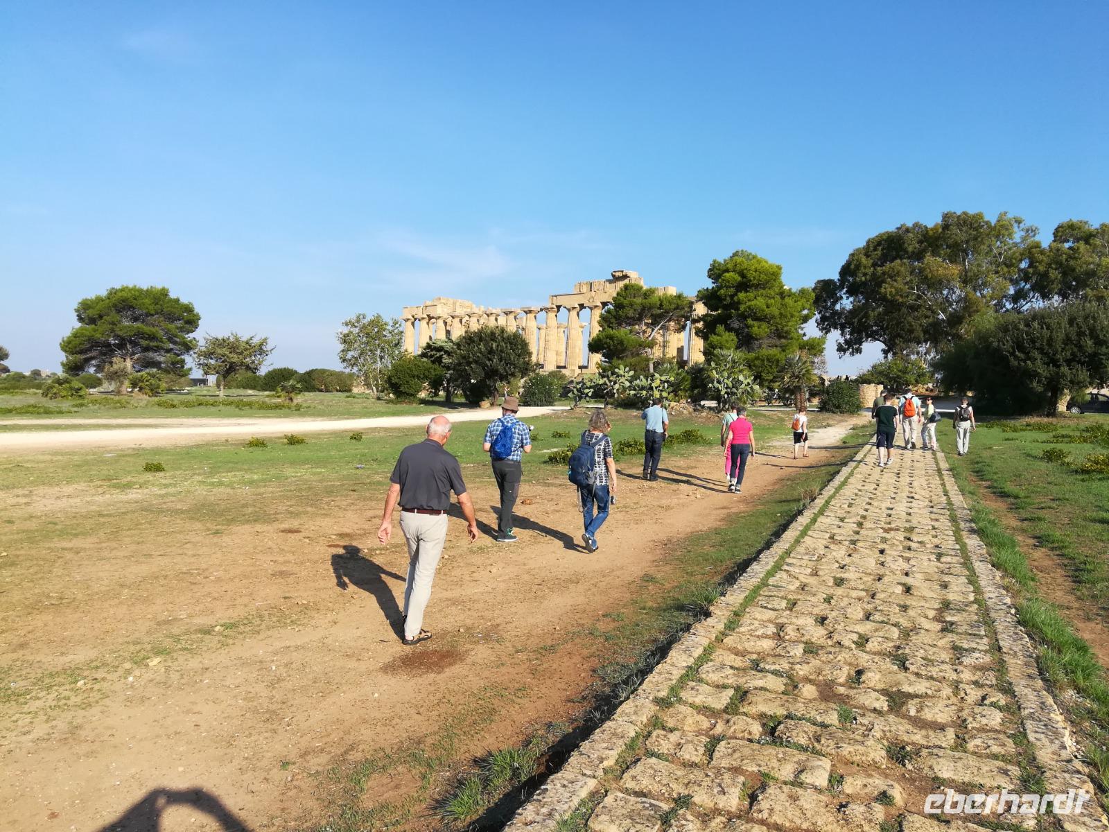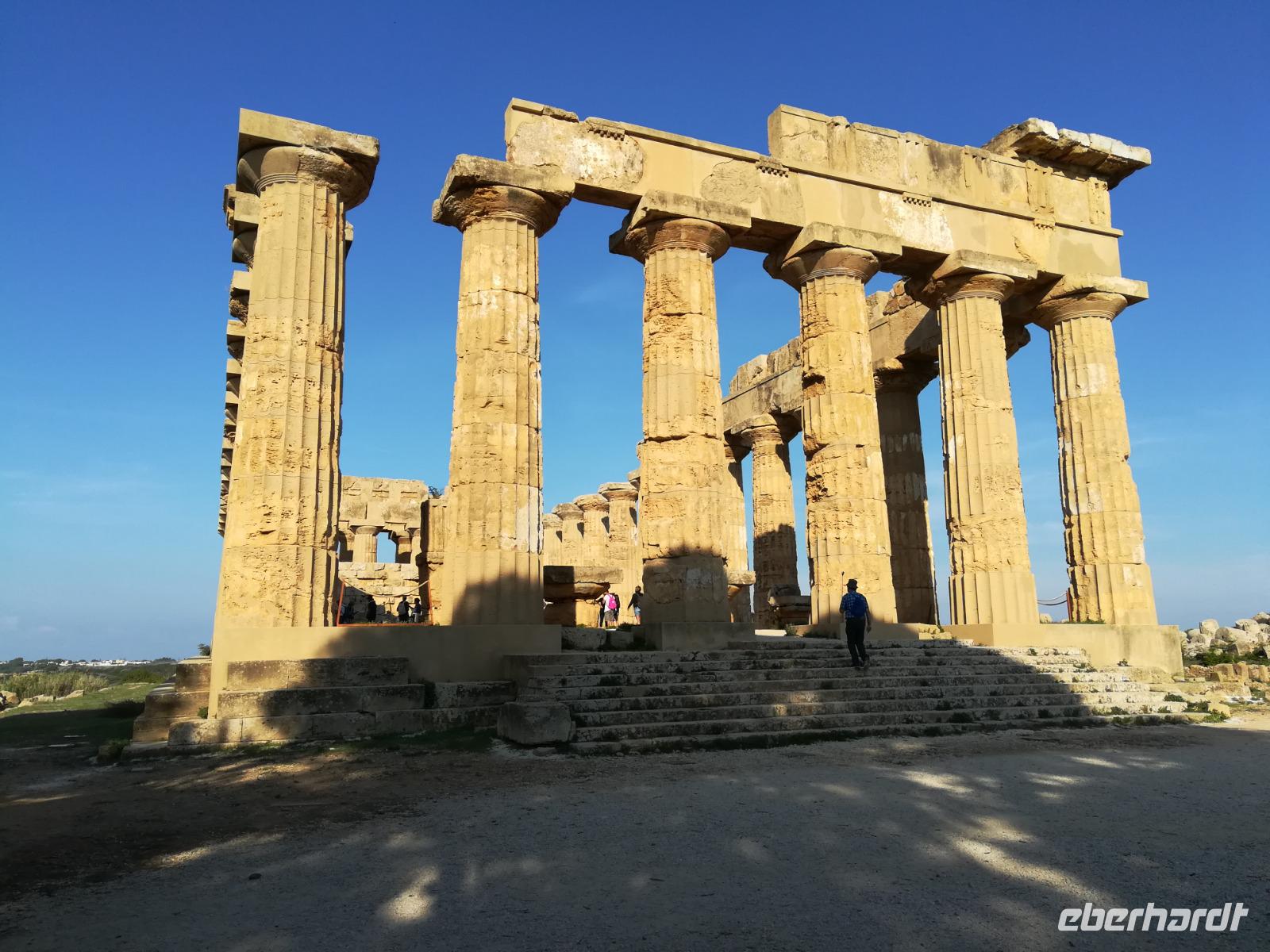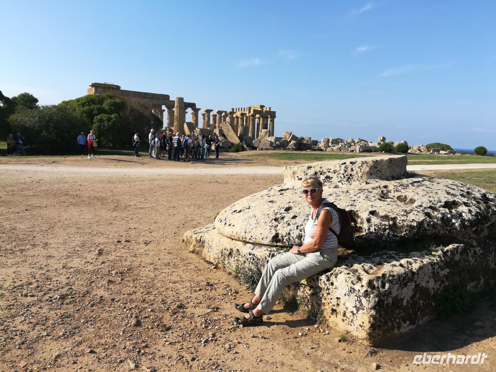 Heute erleben wir den Westen der Insel. Unser Ziel ist Castelvetrano und besonders dabei der antike Teil, die Siedlung Selinunte mit den faszinierenden Ausgrabungsstätten nahe dem Mittelmeer gelegen. Allein der Ausblick von den Hügeln, auf denen die Tempel stehen auf das blau schimmernde Meer ist den Besuch allemal wert. Wir erfahren von Franco, dass die 8 griechischen Tempel immer wieder Erdbeben zum Opfer gefallen sind und um sie der Nachwelt zu erhalten, sind sie zum Teil wiederaufgebaut worden, so der Tempel E.