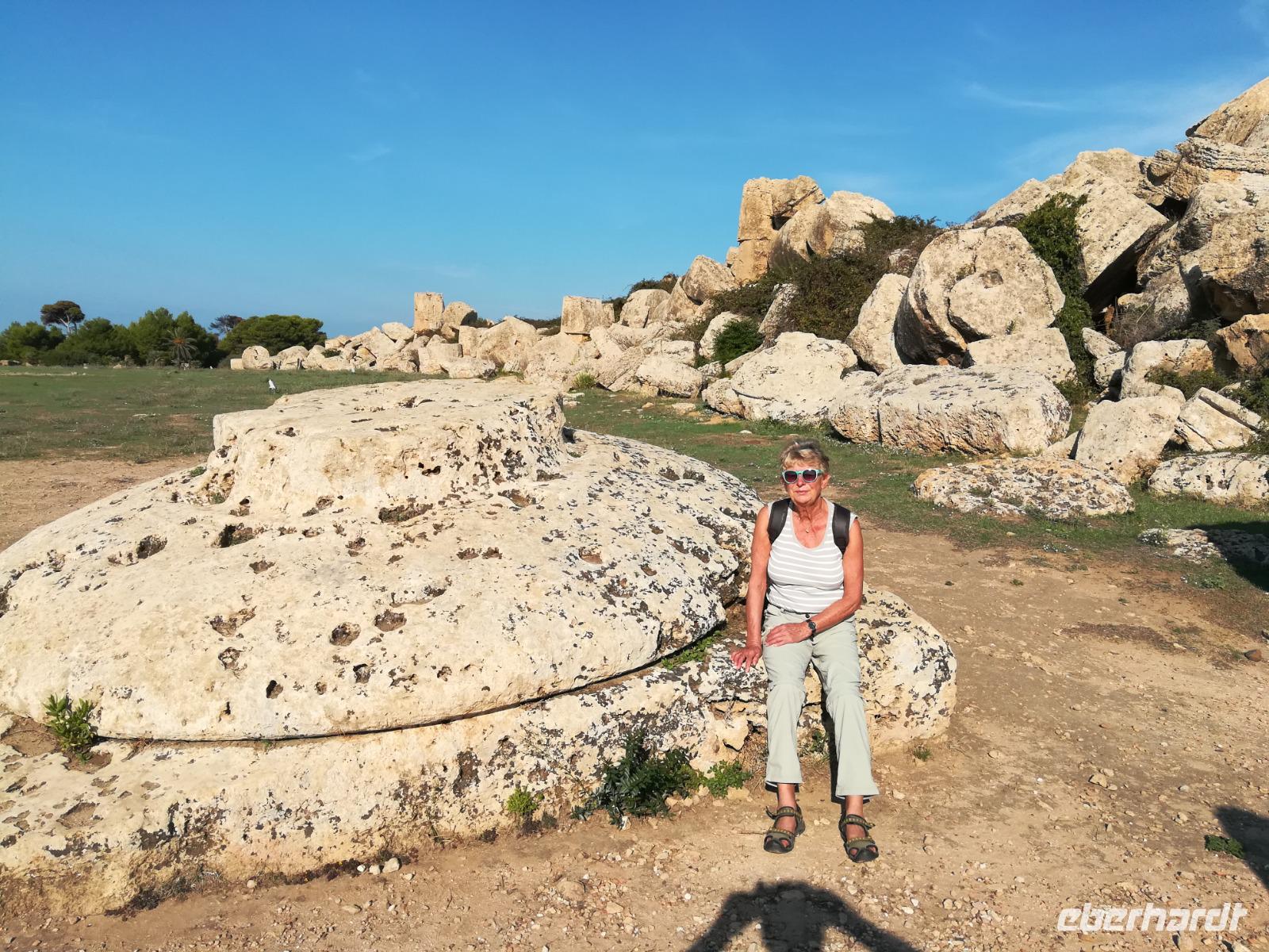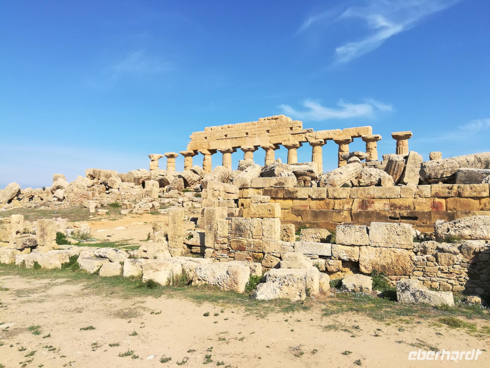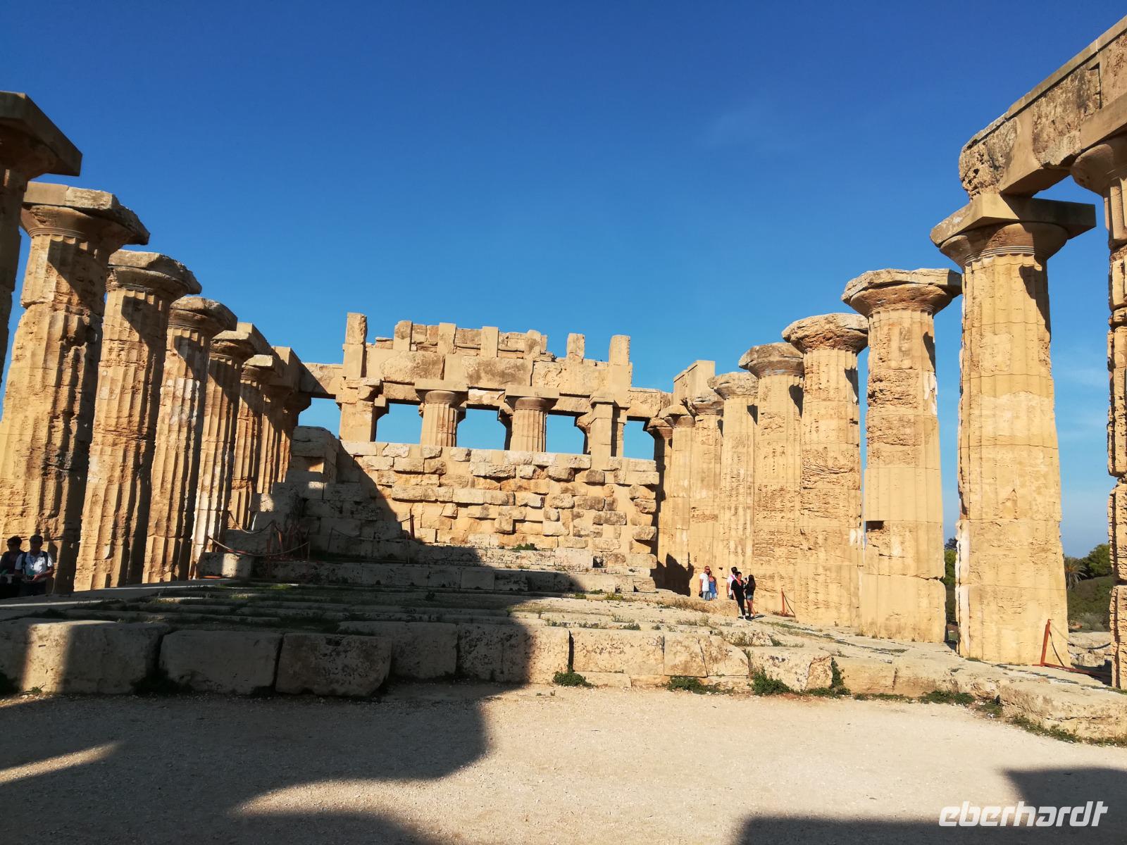 Heute erleben wir den Westen der Insel. Unser Ziel ist Castelvetrano und besonders dabei der antike Teil, die Siedlung Selinunte mit den faszinierenden Ausgrabungsstätten nahe dem Mittelmeer gelegen. Allein der Ausblick von den Hügeln, auf denen die Tempel stehen auf das blau schimmernde Meer ist den Besuch allemal wert. Wir erfahren von Franco, dass die 8 griechischen Tempel immer wieder Erdbeben zum Opfer gefallen sind und um sie der Nachwelt zu erhalten, sind sie zum Teil wiederaufgebaut worden, so der Tempel E.