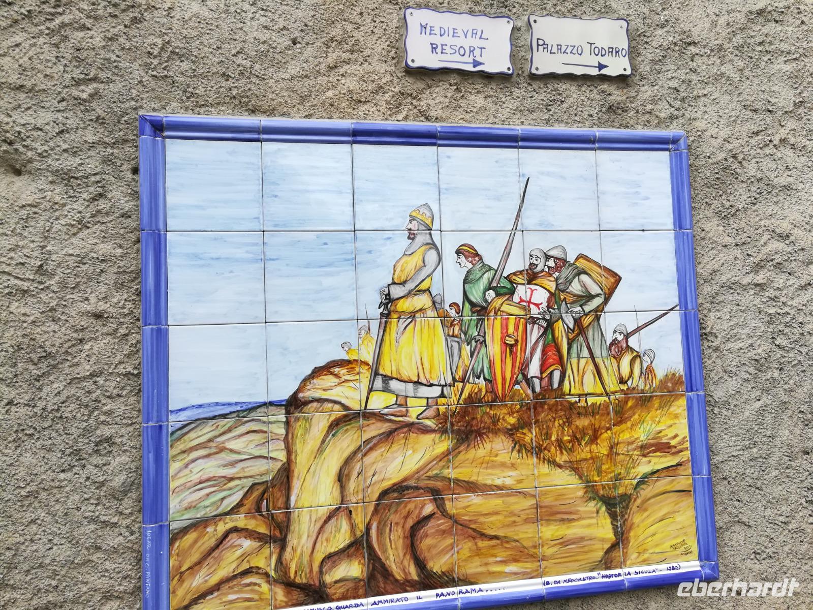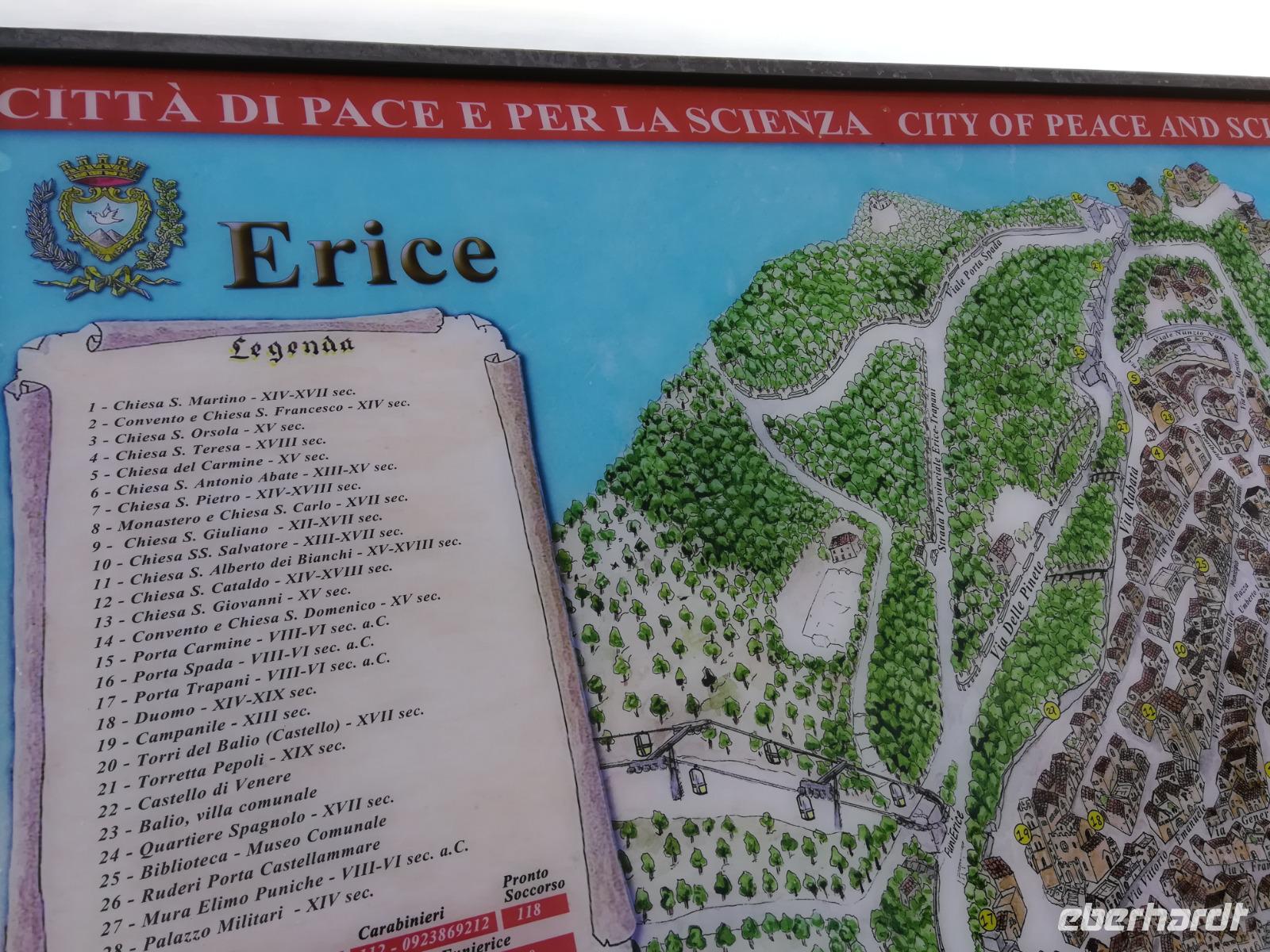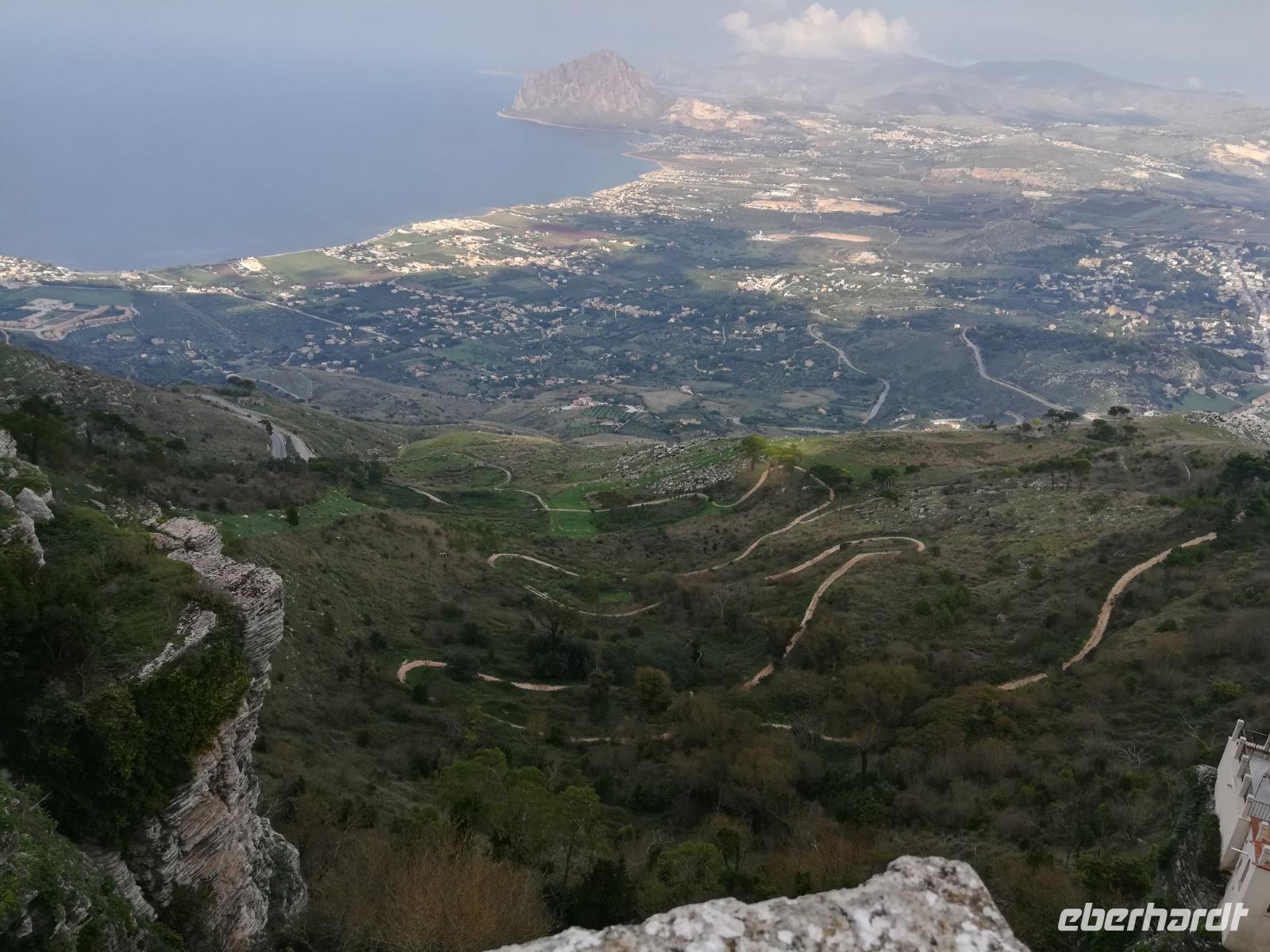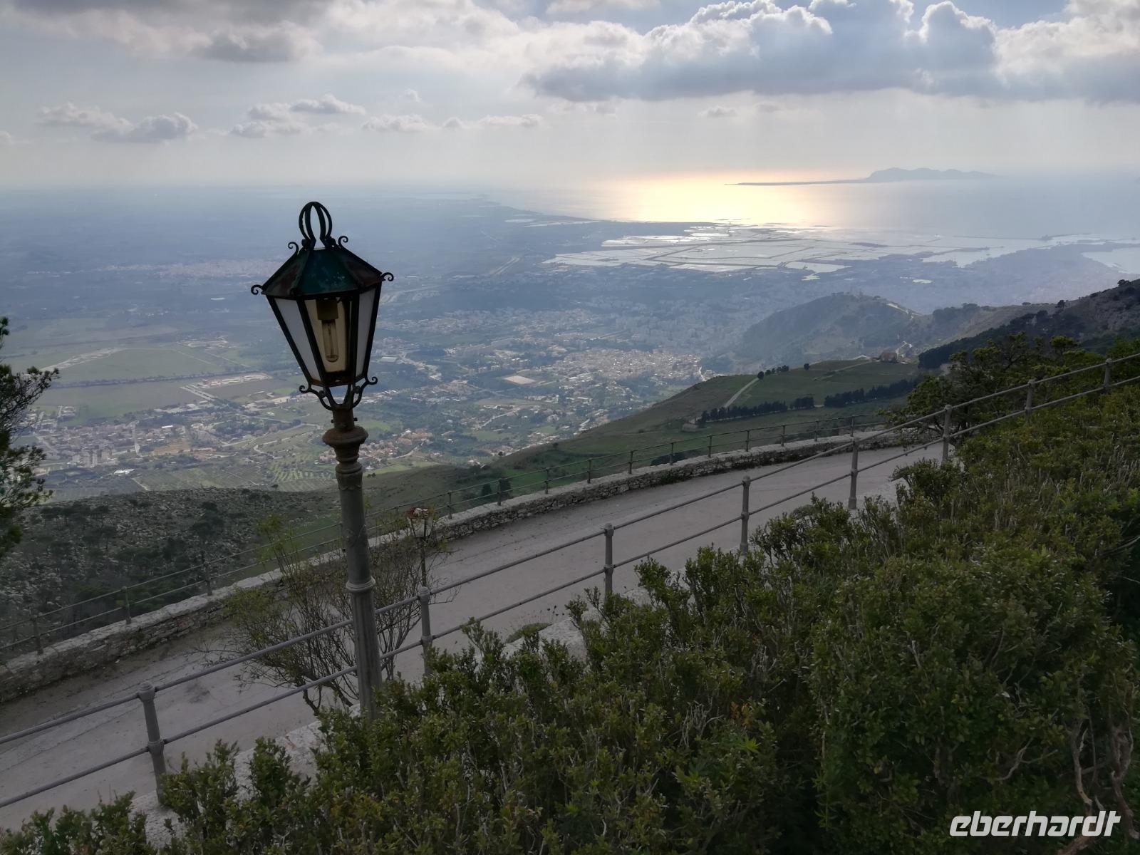 Nach dem Mittagessen geht die Reise weiter in ein malerisches Bergdorf, nach Erice, in eine mittelalterliche Stadt mit engen Gasse und z.T. Treppenstufen, über die man zum Dom dell Assunta hinaufsteigen kann. Dessen romanischer Turm wurde einst von dem Stauferkönig Friedrich II. erbaut. Von hier aus haben wir einmal wieder ein atemberaubendes Panorama über die Insel hinweg bis hin zum Mittelmeer, hier Tyrrhenisches Meer genannt. Und, Überraschung, wir kehren ein in die berühmte Konditorei von Maria Grammatico, wo es feinste sizilianische Köstlichkeiten gibt. Hier läßt Gerd, unser Reisebegleiter, einen feinen Teller mit Mandelgebäck für uns alle anrichten, was die ohnehin schon gute Stimmung weiter anhebt.