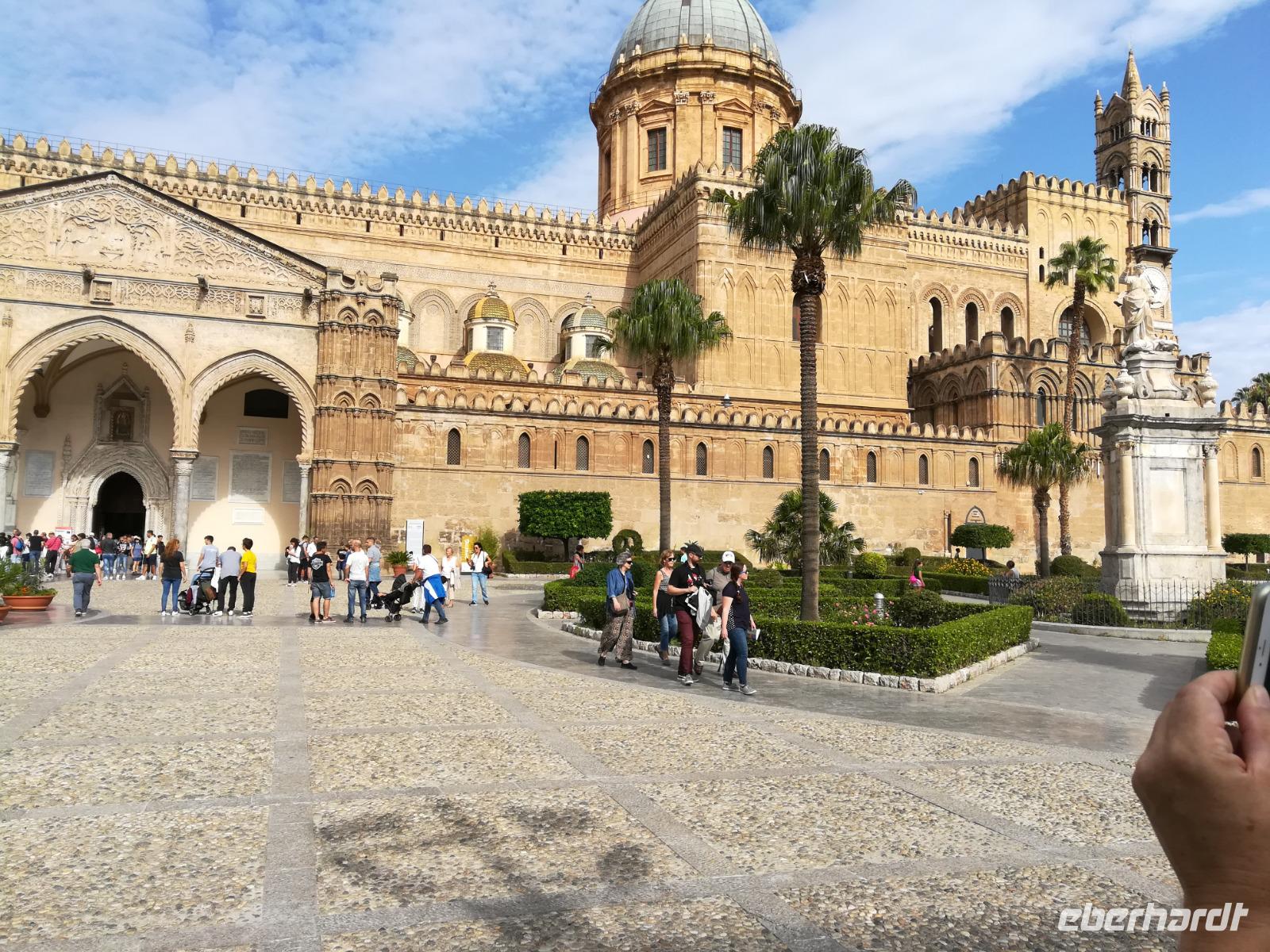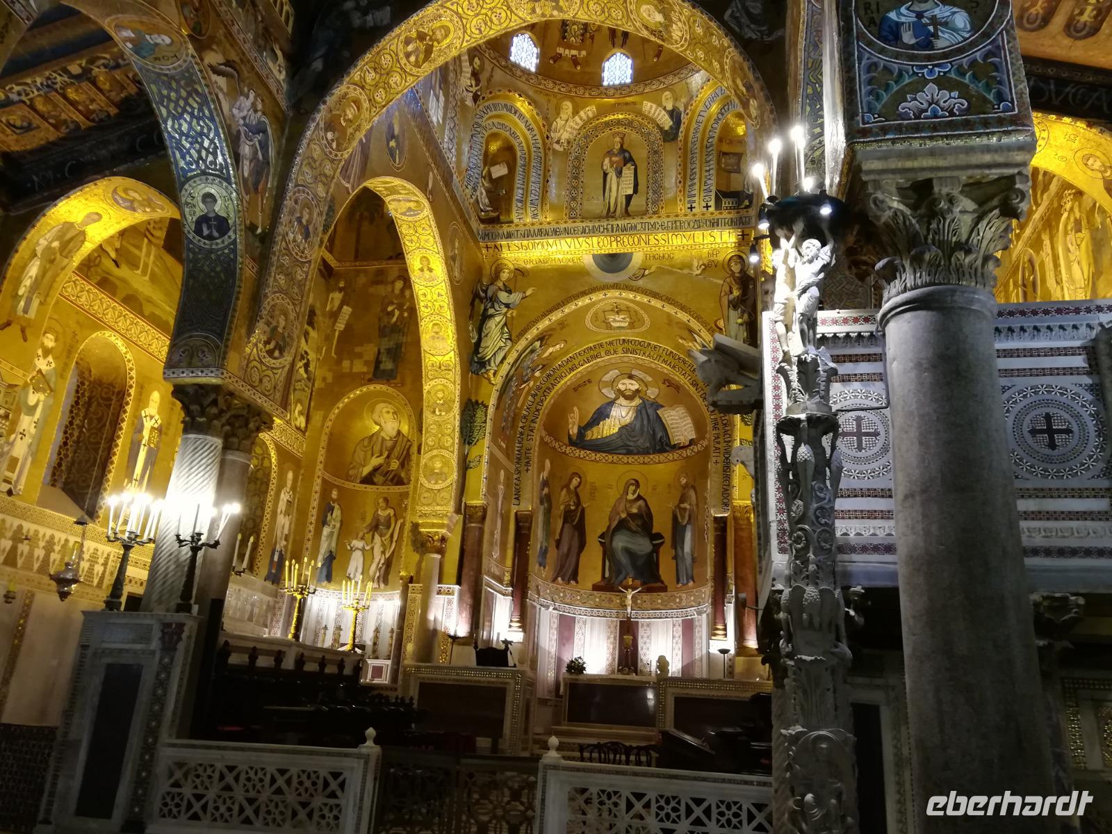 Nach dem Frühstück besteigen wir unseren Bus, um zur Inselhauptstadt Palermo zu fahren. Hier angekommen besuchen wir als Erstes den Normannenpalast, der unter Friedrich II., einem Enkel Barbarossas, Anfang des 13. Jh. als seine Residenz den höchsten Glanz entfaltete. Unsere Reisegruppe hat zum Ziel die Capella Palatina (Palastkapelle), die im 12.Jh. im normannisch-arabisch-byzantinischem Stil errichtet wurde und durch ihre außergewöhnliche Schönheit beeindruckt. Als Hofkapelle genutzt, beeindruckt besonders der Fußboden geschmückt mit kunstvollem Marmor und Porphyr. Die Mosaiken an Wänden und Decken, die Szenen aus dem Leben Christi und Paulus darstellen, sind kunsthistorisch besonders wertvoll. Im Ergebnis all dieser Kunstschätze ist der Normannenpalast ins UNESCO Weltkulturerbe aufgenommen worden.