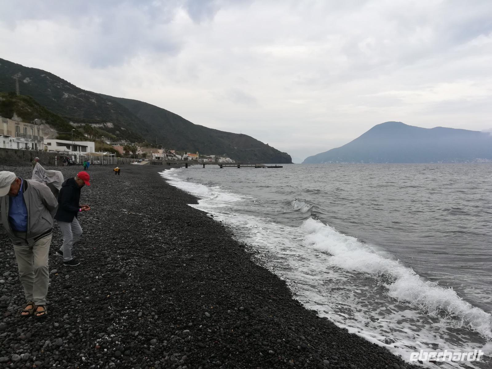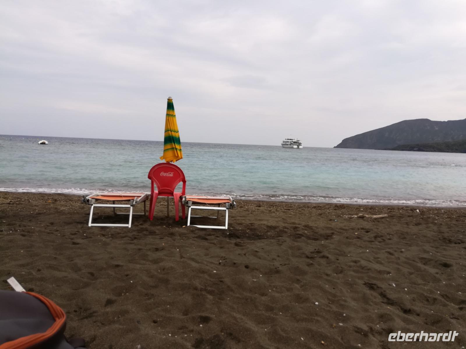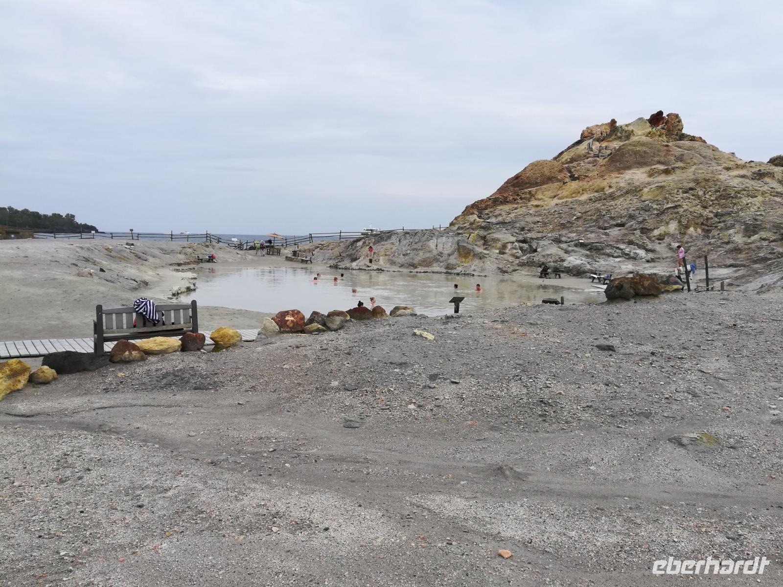 Diese Insel besteht dem Grund nach nur aus dem 391 m hohen Vulkan, den man besteigen könnte aber unsere 2 Stunden Aufenthalt reichen dafür kaum aus. Eine Besonderheit aber wird von ein paar unserer Gäste genutzt, ein Schlammbad nämlich, dessen schwefelhaltige Substanzen dem menschlichen Körper gut tun sollen. Freilich müßte man für solch positive gesundheitliche Effekte ein paar Tage diese Anwendungen genießen. Jedenfalls haben auch wir, die wir nicht ins Bad eingetaucht sind, bereits bei der Ankunft den schwefelhaltigen Geruch riechen können, der uns beim Verlassen des Schiffes entgegenwabert. Wer nicht badet, bummelt durch die eine Strasse, trinkt einen Espresso oder bummelt am lavaschwarzen Strand entlang.