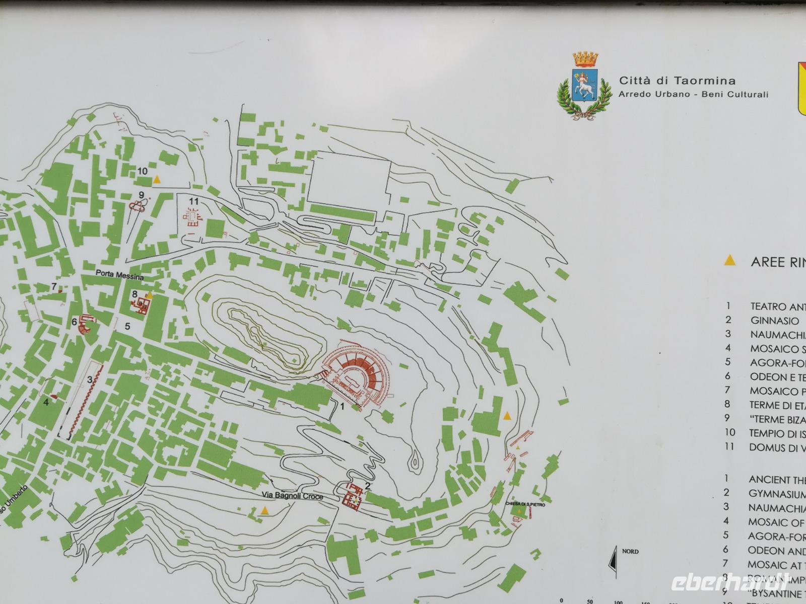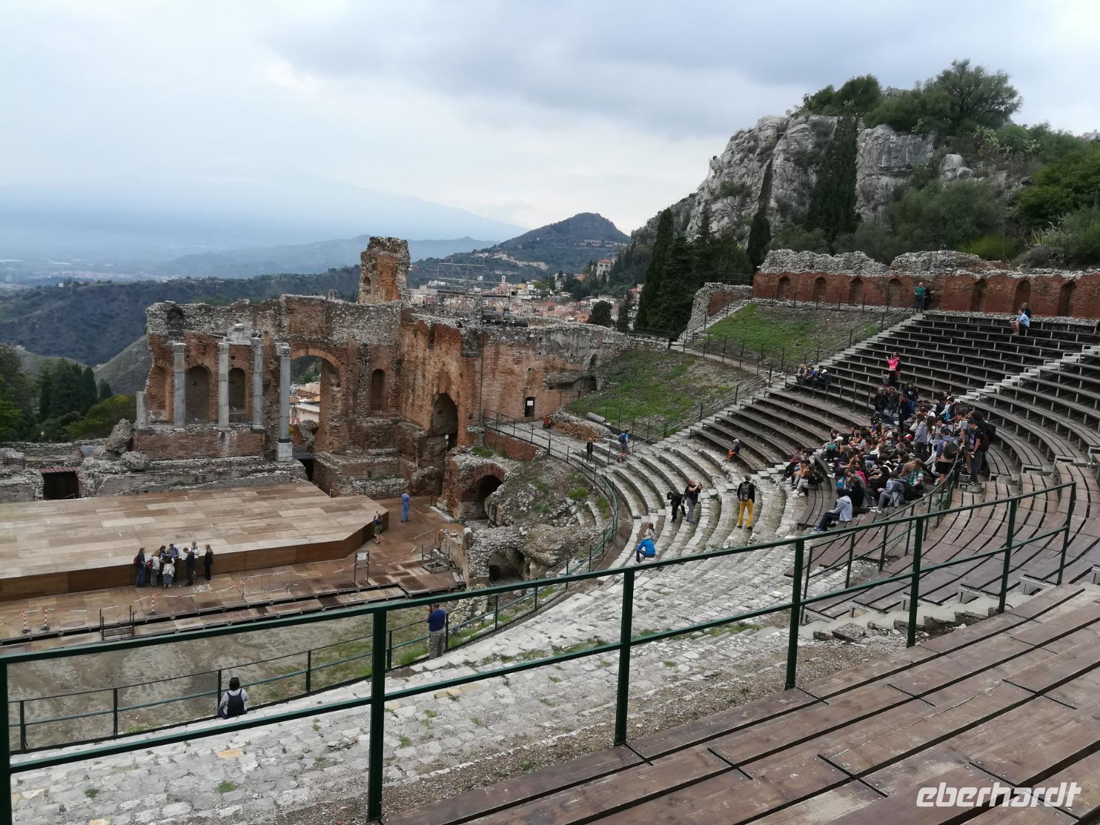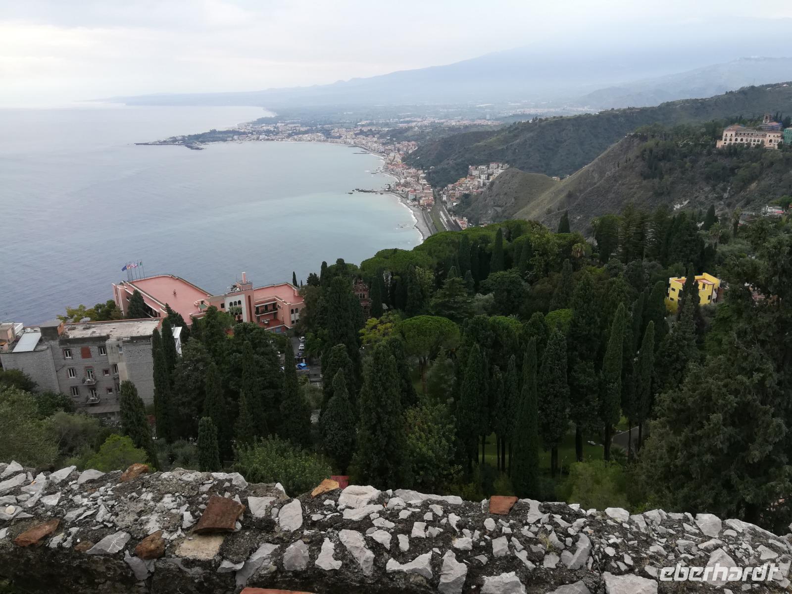 Berühmt und weltbekannt ist das Teatro Greco, was trotz des Namens ein römisches Bauwerk ist. Es ist noch so gut erhalten, dass auch heute bedeutende Veranstaltungen dort stattfinden. Von hier oben kann man auf die Strasse von Messina und damit zum italienischen Festland hinüber schauen.