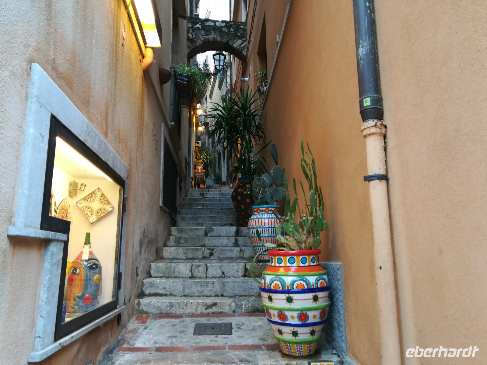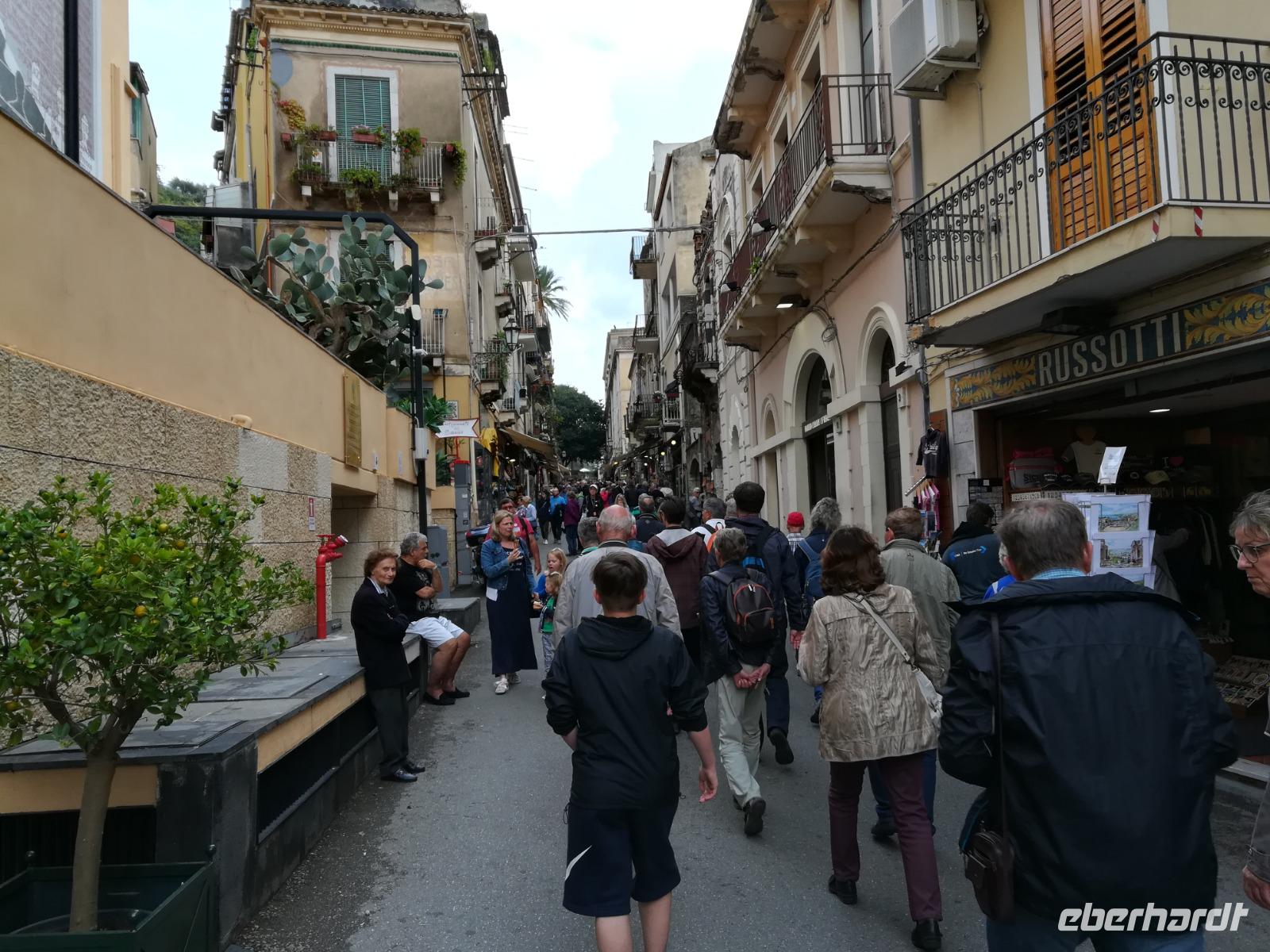 Ein letzter Höhepunkt erwartete uns noch: der Besuch von Taormina, eines Ortes, der, man möchte sagen, auf einer Felsnadel erbaut wurde. Steil geht es schon mit dem Bus bis zum Parkplatz und dann weiter steil von dort weg per pedes bis ganz nach oben.