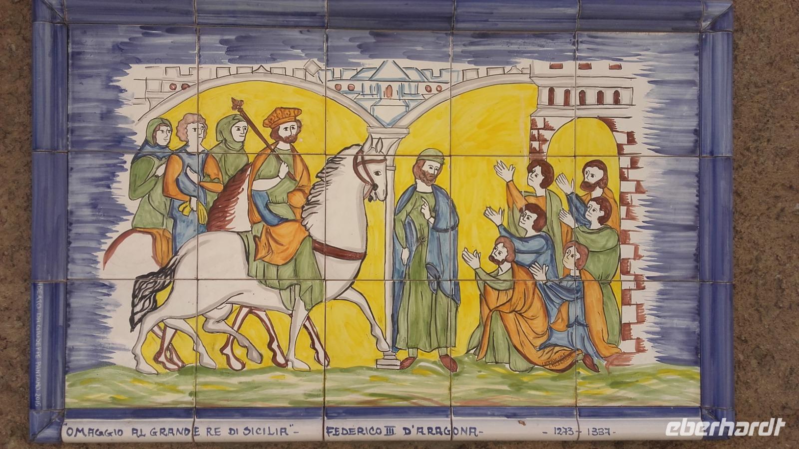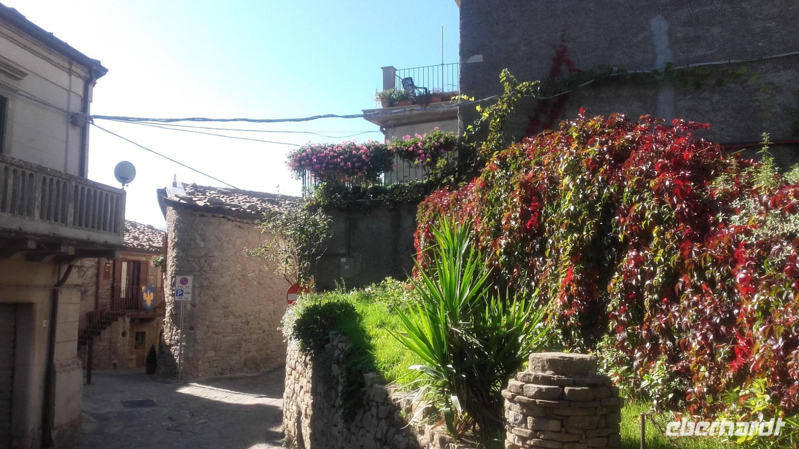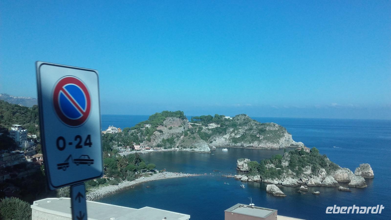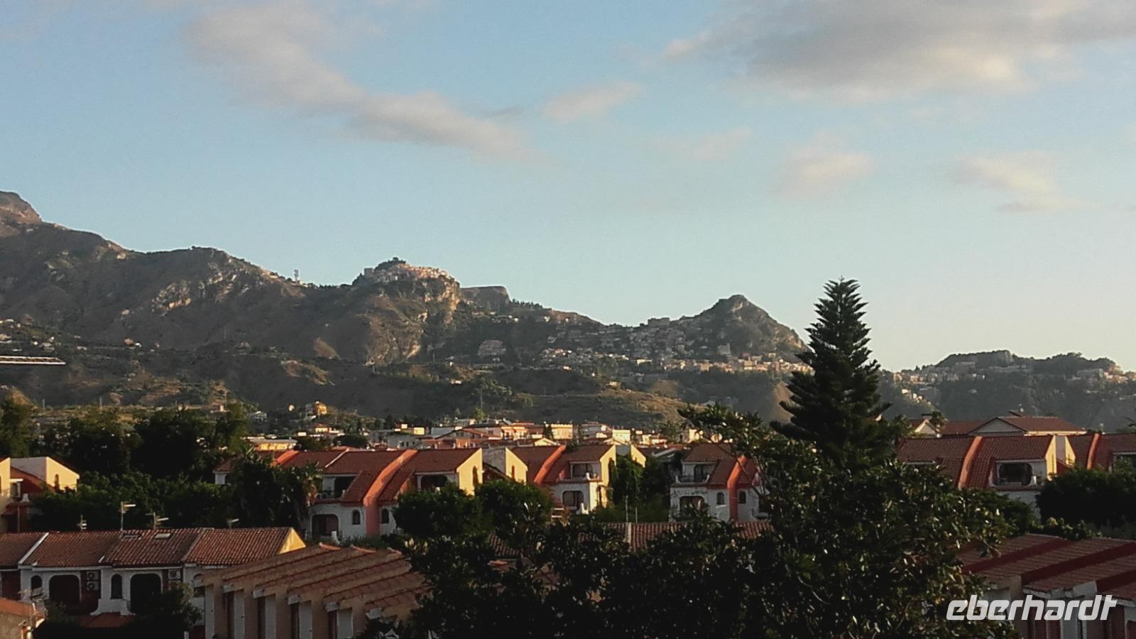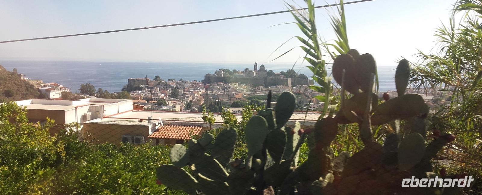 Nach dem Frühstück geht es von Milazzo aus, in die Berge Siziliens. Enza erklärt uns anschaulich, wie sich die Landwirtschaft, der Tourismus und die heimische Industrie die Insel maßgeblich verändern. Als wir an der Kirche der schwarzen Madonna vorbeiziehen, erzählt Sie uns, wie sich Kirchen bildeten und sich ihre Geschichten manifestierten. Nun verlassen wir die Autobahn und fahren auf einer kleinen Serpentine entlang, immer höher auf die Nebrodikette. Was die Nebrodikette ist und was diese, die Madoniekette und die Peloritanikette mit dem Appenninen zu tun hat, erklärt Sie uns ausführlich und kurz darauf erreichen wir auch schon das idyllische Bergdorf Montalbano. Als eines der schönsten Dörfer Italiens gekürt, verzaubert es uns mit seinen mittelalterlichen Straßen und Häusern. Auf der Spitze Montalbanos, lag das über 600 Jahre alte Schloss, in welchem Friedrich II von Aragon wohnte und mit einer ebenso alten Kirche, bietet es viele Eindrücke aus der Geschichte. Wir besichtigen den älteren Teil der Stadt und schnell fällt uns auf: Auch wenn überall blühende Blumenkästen das Sadtbild verschönern, hier scheint kaum einer zu wohnen... Wir sehen wunderschöne Kirchen- und Königsmalereien an den Häusern, gefertigt auf Keramikplatten und mancherorts scheint die Natur schon die Überhand über die kleinen Gassen zu gewinnen. Trotzdem sind wir nicht allein. Überall streunern Katzen und Hunde umher, welche überaus freundlich gesinnt scheinen. Wir erreichen einen der höheren Punkte der Stadt und können von ihm aus über einen Teil der Nebrodiebene schauen. Anschließend besuchen wir die 2 Kirchen des Dorfes und wer wollte, gegen einen kleinen Aufpreis, eine kleine Bildergalerie des Dorfes. Nun geht es aber weiter und wir fahren die Nebrodiebene entlang zu den Megaliten. Hier besichtigten wir die beeindruckenden Felsformationen, welche laut den Sizilianern nicht von Wettereinflüssen, sondern als frühzeitliche Werke des Menschen gebildet worden. Beweise hierfür gibt es nicht, weshalb das Reservat bis heute kein Weltkulturerbe ist. Für die Sizilianer aber bleibt es das italienische Stonehedge. Wir besichtigen das Gelände und versuchen mit Enzas Hilfe die Interpretationen und Hintergründe zu verstehen. Wir sehen die Formation des Adlers, des Mammuts und die Löwenberge. Unser Mittagessen verbringen wir nach kurzer Weiterfahrt, im unvergleichlichen Agritourismo. Es gibt ein wunderbares Vorspeisenbuffet mit Wein, einer kleinen Nachspeise und einem Schluck Mandarinenlikör. Das Essen scheint allen zu schmecken und einige sagen sogar, es wäre das beste Mittagessen, welches Sie auf der Insel genossen haben. Im Anschluss machen wir einen kleinen Rundgang auf dem Gelände des Agritiurismo, bei welchem wir, Dank des Wirtes und Enzas Hilfe, Erklärungen zur damaligen Weinverarbeitung, sowie im Stall zur Tierhaltung und letztendlich im Lagerraum zur Käseherstellung und Lagerung bekamen. Im Stall sehen wir unterschiedlichste Tiere, wie Pferde, Ziegen, Kaninchen, Hühner und sogar Pfauen. Im umliegenden Gelände stoßen wir auf reichlich bestückte Olivenbäume, Esskastanien und sogar Weinfelder. Danach erhalten wir kurz Zeit um, wenn gewünscht, die Produkte der Agritourismo zu kaufen, bevor es mit Taormina zur Perle des Mittelmeers geht.