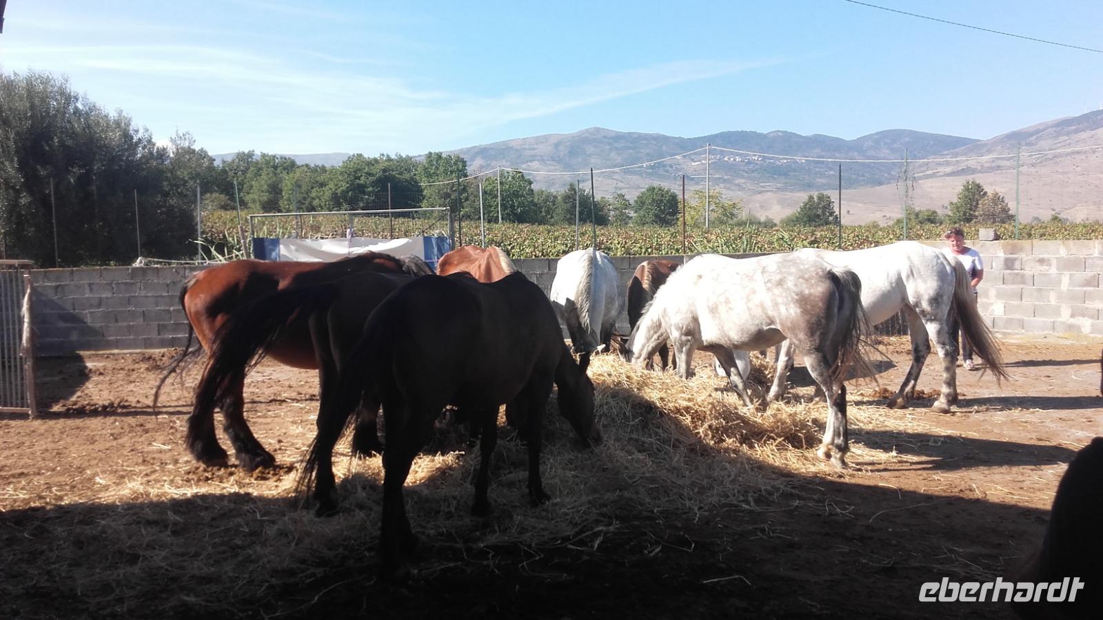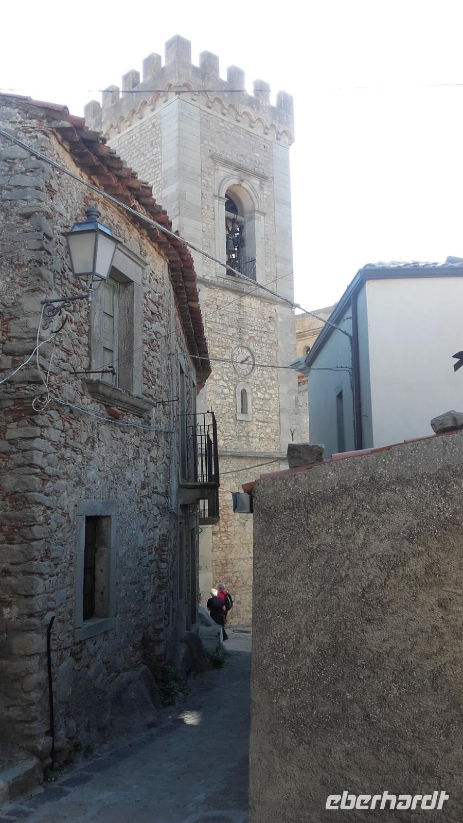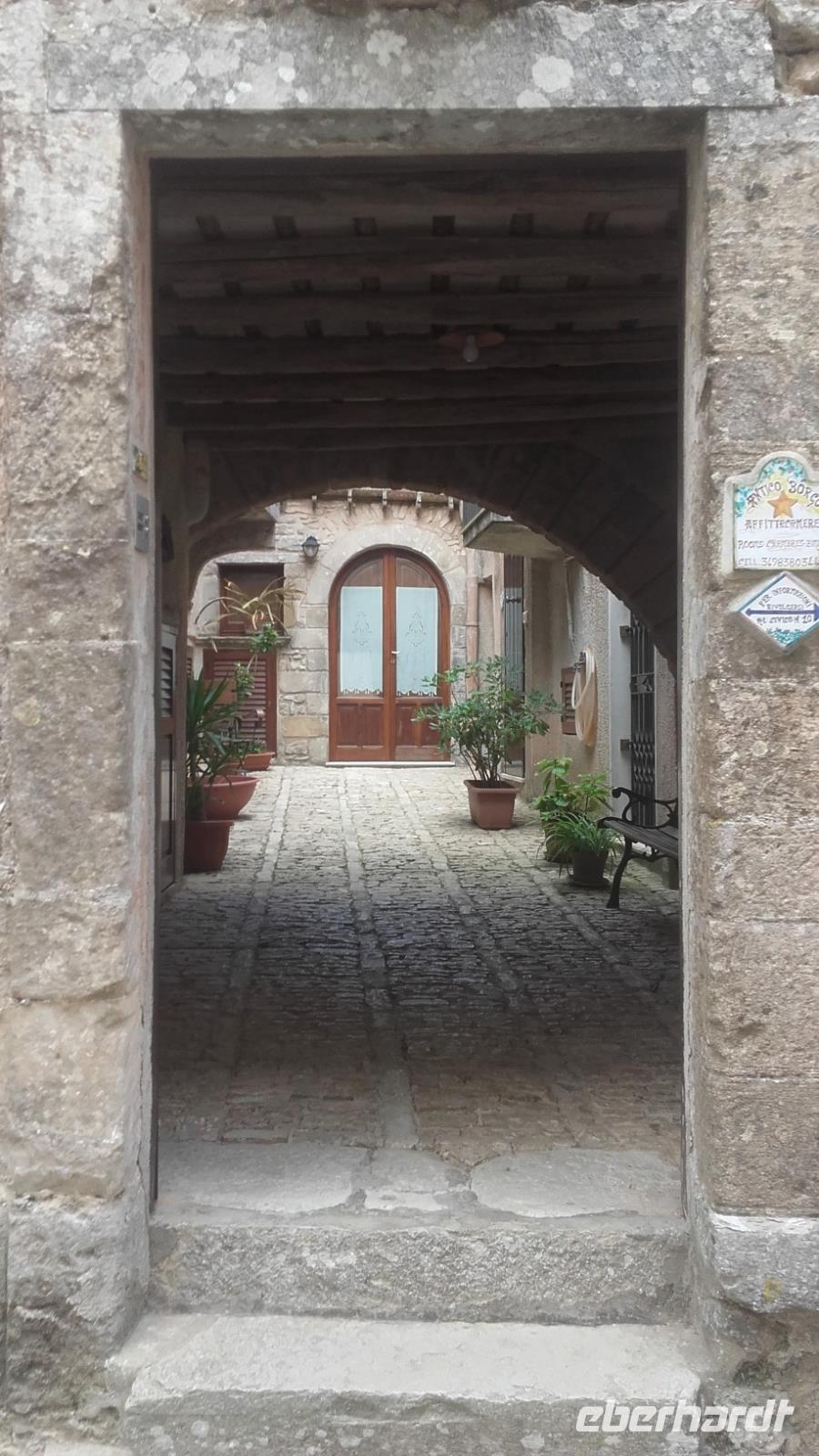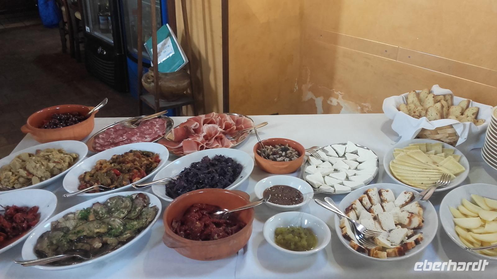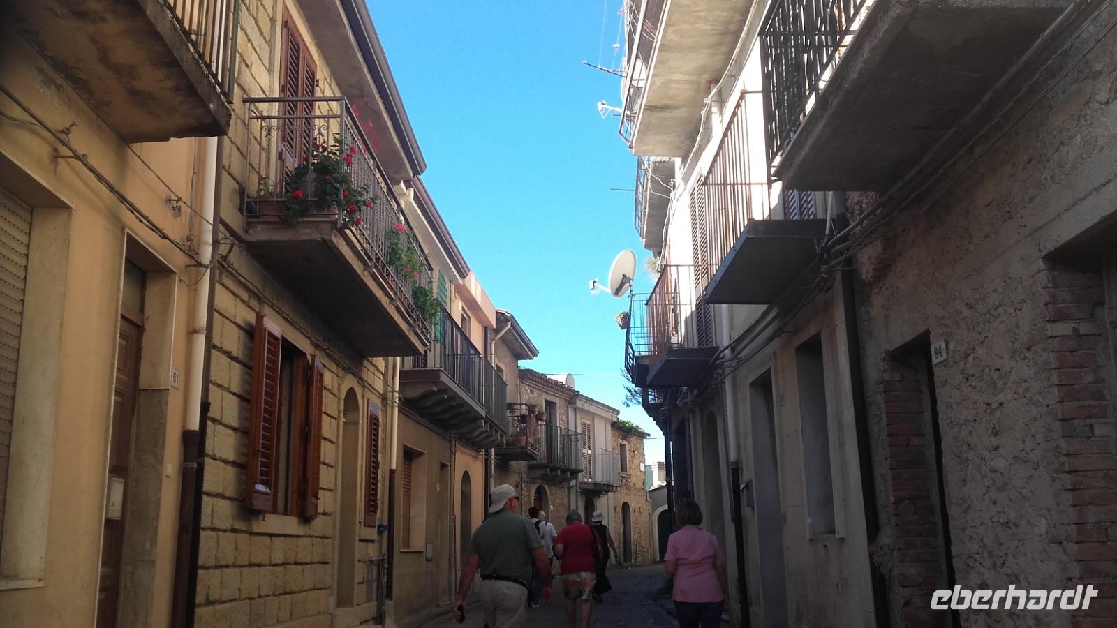 Nach dem Frühstück geht es von Milazzo aus, in die Berge Siziliens. Enza erklärt uns anschaulich, wie sich die Landwirtschaft, der Tourismus und die heimische Industrie die Insel maßgeblich verändern. Als wir an der Kirche der schwarzen Madonna vorbeiziehen, erzählt Sie uns, wie sich Kirchen bildeten und sich ihre Geschichten manifestierten. Nun verlassen wir die Autobahn und fahren auf einer kleinen Serpentine entlang, immer höher auf die Nebrodikette. Was die Nebrodikette ist und was diese, die Madoniekette und die Peloritanikette mit dem Appenninen zu tun hat, erklärt Sie uns ausführlich und kurz darauf erreichen wir auch schon das idyllische Bergdorf Montalbano. Als eines der schönsten Dörfer Italiens gekürt, verzaubert es uns mit seinen mittelalterlichen Straßen und Häusern. Auf der Spitze Montalbanos, lag das über 600 Jahre alte Schloss, in welchem Friedrich II von Aragon wohnte und mit einer ebenso alten Kirche, bietet es viele Eindrücke aus der Geschichte. Wir besichtigen den älteren Teil der Stadt und schnell fällt uns auf: Auch wenn überall blühende Blumenkästen das Sadtbild verschönern, hier scheint kaum einer zu wohnen... Wir sehen wunderschöne Kirchen- und Königsmalereien an den Häusern, gefertigt auf Keramikplatten und mancherorts scheint die Natur schon die Überhand über die kleinen Gassen zu gewinnen. Trotzdem sind wir nicht allein. Überall streunern Katzen und Hunde umher, welche überaus freundlich gesinnt scheinen. Wir erreichen einen der höheren Punkte der Stadt und können von ihm aus über einen Teil der Nebrodiebene schauen. Anschließend besuchen wir die 2 Kirchen des Dorfes und wer wollte, gegen einen kleinen Aufpreis, eine kleine Bildergalerie des Dorfes. Nun geht es aber weiter und wir fahren die Nebrodiebene entlang zu den Megaliten. Hier besichtigten wir die beeindruckenden Felsformationen, welche laut den Sizilianern nicht von Wettereinflüssen, sondern als frühzeitliche Werke des Menschen gebildet worden. Beweise hierfür gibt es nicht, weshalb das Reservat bis heute kein Weltkulturerbe ist. Für die Sizilianer aber bleibt es das italienische Stonehedge. Wir besichtigen das Gelände und versuchen mit Enzas Hilfe die Interpretationen und Hintergründe zu verstehen. Wir sehen die Formation des Adlers, des Mammuts und die Löwenberge. Unser Mittagessen verbringen wir nach kurzer Weiterfahrt, im unvergleichlichen Agritourismo. Es gibt ein wunderbares Vorspeisenbuffet mit Wein, einer kleinen Nachspeise und einem Schluck Mandarinenlikör. Das Essen scheint allen zu schmecken und einige sagen sogar, es wäre das beste Mittagessen, welches Sie auf der Insel genossen haben. Im Anschluss machen wir einen kleinen Rundgang auf dem Gelände des Agritiurismo, bei welchem wir, Dank des Wirtes und Enzas Hilfe, Erklärungen zur damaligen Weinverarbeitung, sowie im Stall zur Tierhaltung und letztendlich im Lagerraum zur Käseherstellung und Lagerung bekamen. Im Stall sehen wir unterschiedlichste Tiere, wie Pferde, Ziegen, Kaninchen, Hühner und sogar Pfauen. Im umliegenden Gelände stoßen wir auf reichlich bestückte Olivenbäume, Esskastanien und sogar Weinfelder. Danach erhalten wir kurz Zeit um, wenn gewünscht, die Produkte der Agritourismo zu kaufen, bevor es mit Taormina zur Perle des Mittelmeers geht.