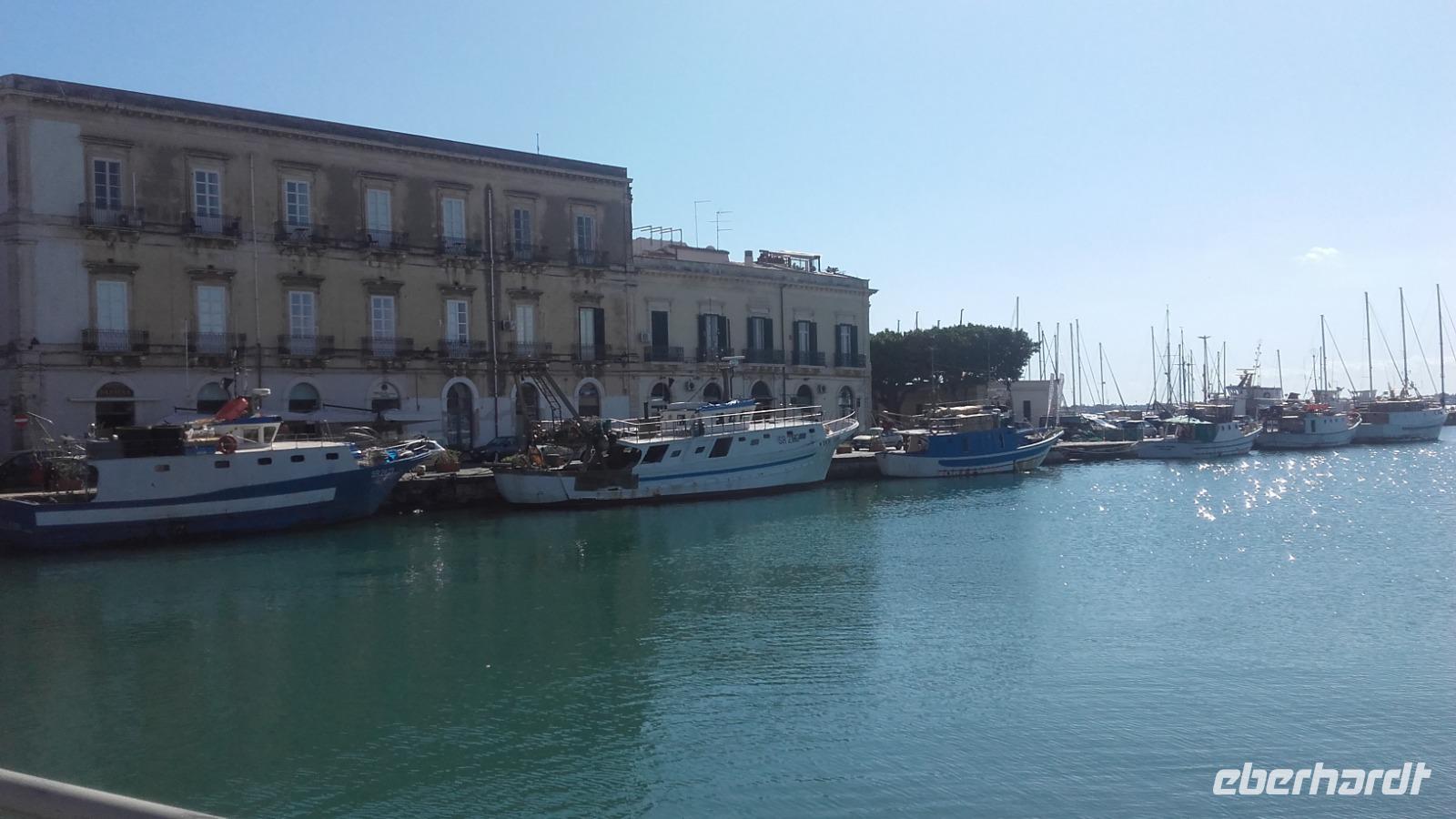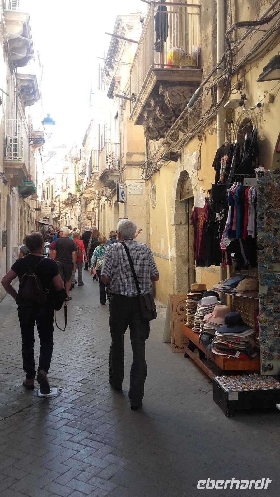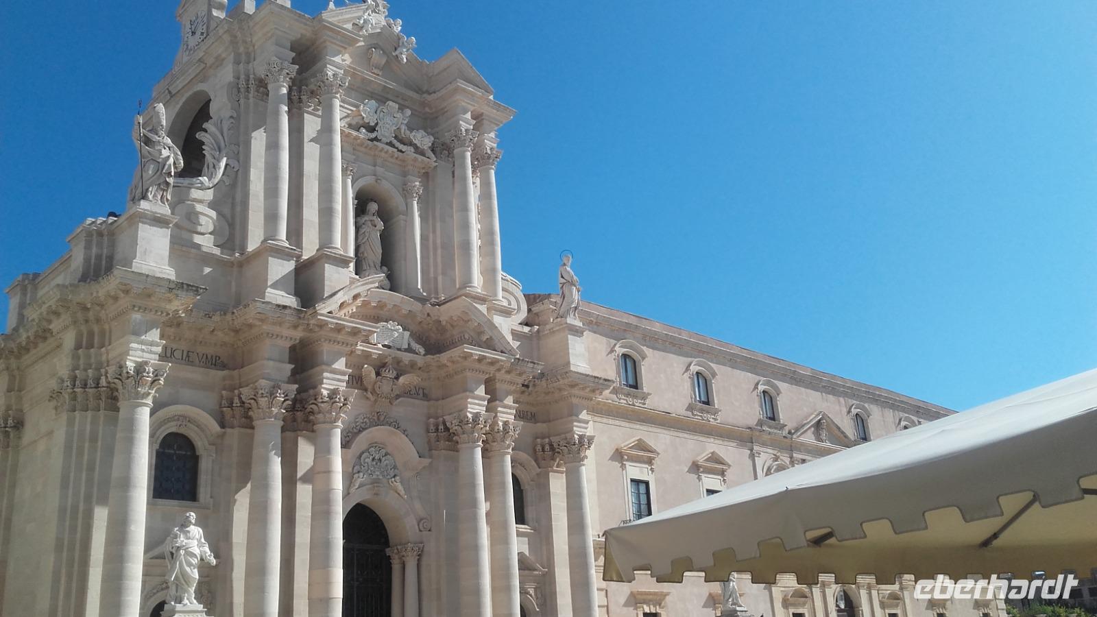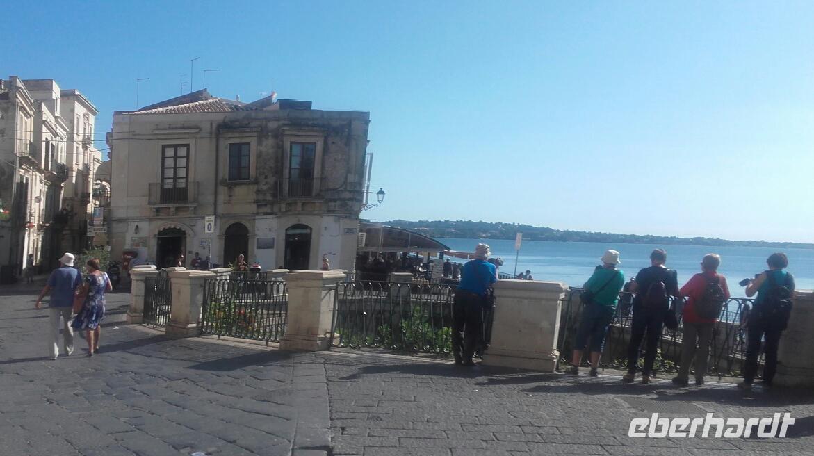 Am späten Morgen erreichen wir dann den imposanten Vulkan und fahren in kleinen Gondeln bis auf 2500 m in die Höhe. Auf der Zwischenstation angelangt, stehen wir vor der Entscheidung, ob wir mit Enza auf der Ebene verweilen oder mit den Jeeps bis nach ganz oben weiterreisen möchten. Mit dezimierter Anzahl geht es nun mit den Jeeps durch die graue Mondlandschaft bis auf 3000 m Höhe. Oben angekommen, können wir den beeindruckenden Hauptkrater so nahe wie nie wahrnehmen, welcher nun auch beginnt graue Wolken auszuspeien. Aufgrund der plötzlichen Aktivität des Kraters, ist es uns nicht mehr möglich den Vulkan noch weiter zu erklimmen. Zu unserem Glück zeigt uns ein englischsprachiger Guide stattdessen einen kleineren Seitenkrater, von wo aus man die austretende Wärme förmlich spüren kann. Dank der guten Sicht bietet sich uns ein wunderschöner Blick über die zahlreichen Krater und selbst die Südküste der Insel lässt sich in der Ferne ausmachen. Wieder sicher unten angekommen, geht es nun weiter Richtung Syrakus. Ausgestattet mit Audiogeräten und nach einer kurzen Einweisung, bringt uns Enza die Geschichte der Eruptionen nahe. Immer entlang der Südküste, fahren wir vorbei an einer Olivenölraffinerie und erreichen am frühen Nachmitag schließlich Syrakus. Unser Weg führt uns durch die bunten Einkaufsstraßen, am Hafen vorbei, bis zur Kathedrale der heiligen Lucia. Der Domplatz blendet uns mit dem durchdringenden Weiß der Villen und Kirchen rundum. Enza erzählt uns auf der Tour mehr über die Geschichte des Marktplatzes und der kleinen feinen Einkaufsstraße, die wir durchqueren. An der Kathedrale von Syrakus erfahren wir näheres über die Historie des antiken Bauwerks und der Heiligen Lucie. Wir erkunden die prächtigen Glasmosaike, die Kammern der Heiligen sowie ihrer Statuen, die Linke Absyss, den verzierten Altar und die alten Reliquien. Anschließend bleibt Zeit für eine kleine Mittagspause. Gestärkt geht es weiter per Bus quer durch die weiße Küstenstadt bis hin zur archäologischen Zone. Beherrschend ragt über der Stadt die Wallfahrtskirche der Tränenmadonna auf, welche ihren Namen anhand der pechschwarz weinenden Madonnastatue erhielt. Heute ist die weinende Madonna hinter einer Glasvitrine verwahrt. Unser Weg führt uns durch einen magischen Tunnel der Natur, auf dem wir mehr über die Person des Caravaggio und die Sage vom Ohr des Dionysius kennenlernen. Natürlich betreten wir auch die imposante Gruft, welche mit der verriegelten Seilagrotte die einzigen des Ortes waren. Im Anschluss führt uns Enza entlang des 'kleinen Paradieses' vorbei an Orangenbäumen zum griechischen Theater. Geschafft geht es nun per Bus wieder entlang der sprießenden Südküste zurück zum Hotel, in welchem schon ein leckeres 3-Gänge Abendessen auf uns wartet...
