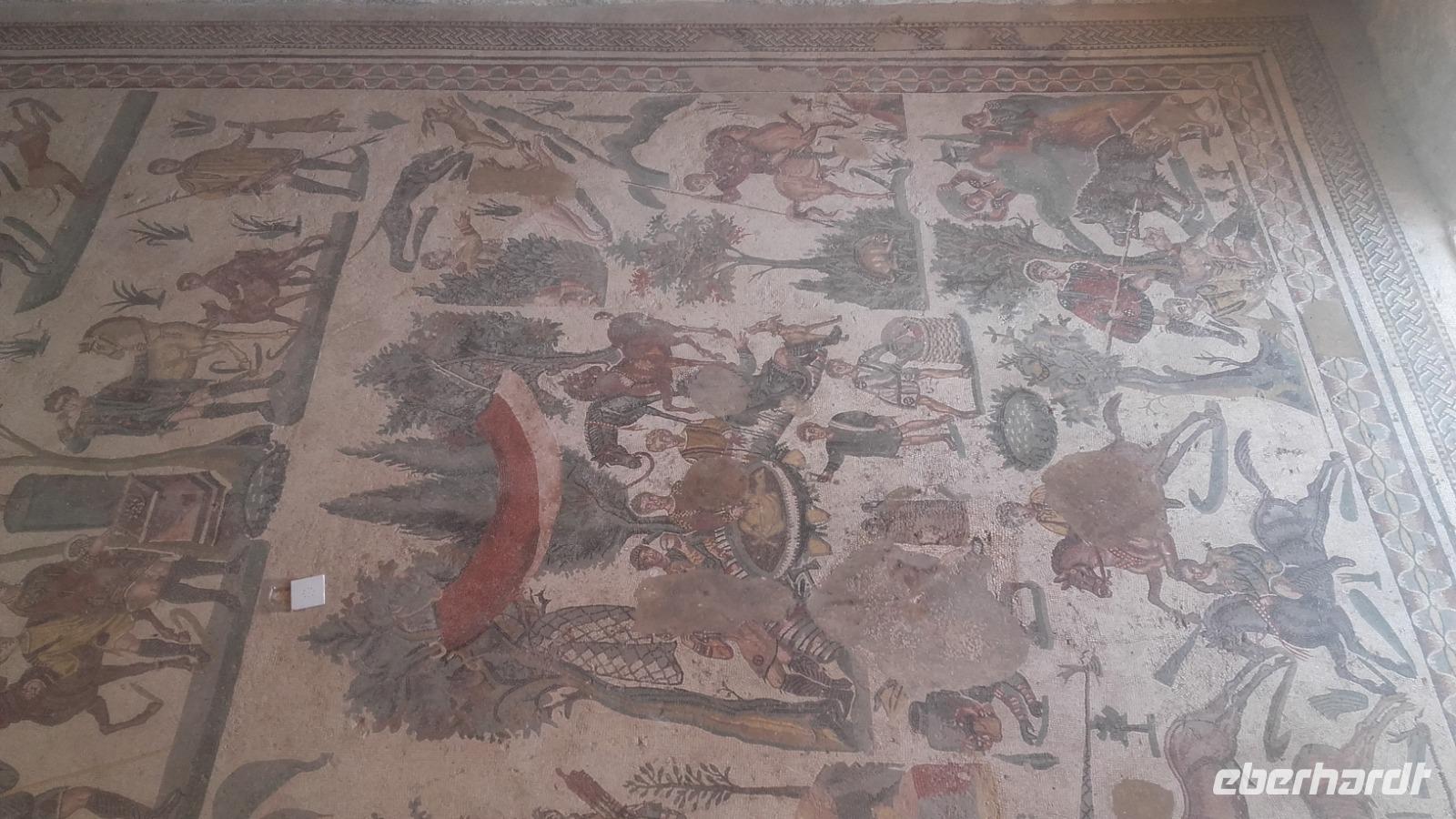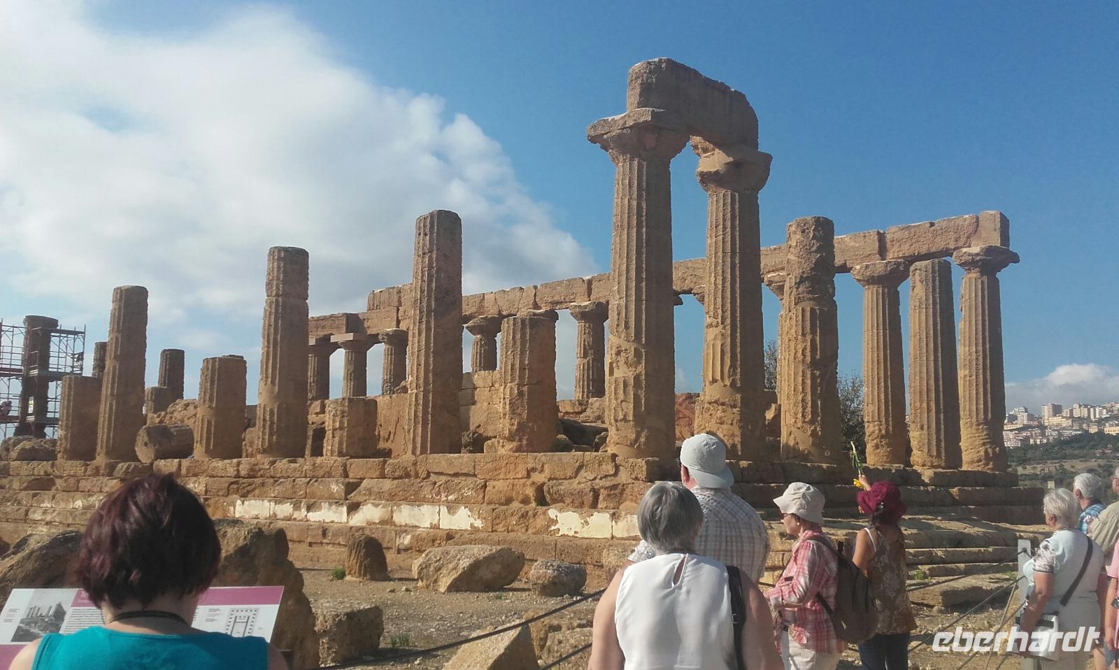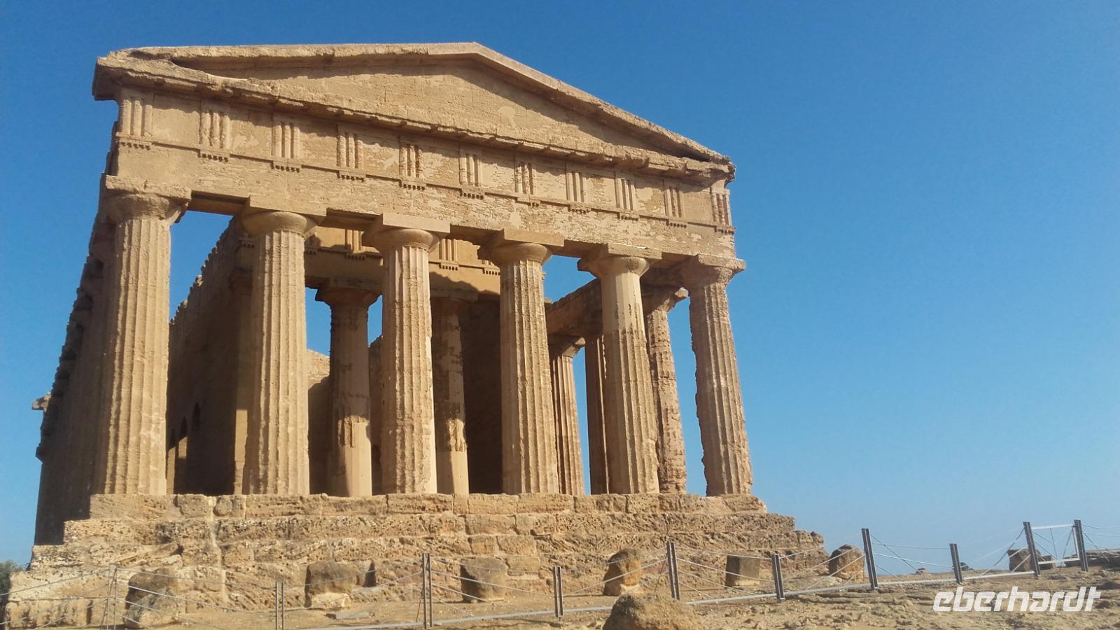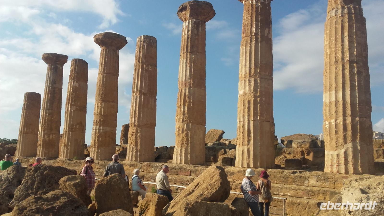 Um auch die entlegensten Winkel der Insel zu erkunden, ist es heute an der Zeit unser Hotel zu wechseln und so geht es nach dem Frühstück voll bepackt weiter nach Agrigent an der Südostküste. Ein letztes Mal für die nächsten Tage bietet sich uns die Gelegnheit den Ätna in all seiner Pracht, mitsamt hellgrauer Aschewolke, zu bestaunen. Auf der Weiterfahrt vermittelt uns Enza ihr umfangreiches Wissen über Sizilien; angefangen von der Bildung der Kultur, über Flora und Fauna, bis hin zu den Lebensbedingungen der Minderheiten in Italien. Schon eine Vielzahl von Völkern lebte auf der Insel: ob Normannen, Spanier oder Araber. Anschaulich zeigt sie uns, wie die Vegetation von all diesen verschiedenen Kulturen profitiert hat. So sind neben ursprünglich aus Australien stammenden Eukalyptusbäumen, auch Ziegenböcke aus dem Fernost zu bewundern. Je weiter wir in den Osten vordringen, desto häufiger stoßen wir auf den Anblick großer Zitronen- und Orangenplantagen und auch Granatäpfel können, so Enza, aufgrund der klimatischen Bedingungen zahlreich gedeihen. Nach einer kleinen Pause an einem idyllischen Bahnhof, erreichen wir gegen Mittag die Villa Romana del Casale. Durch Enza erhalten wir Einblicke in das damalige Leben des Hauherren mit seiner Familie und den Sklaven. Die Mosaike des Hauses werden nach und nach immer mächtiger und wir erfahren die Geschichten und Mythen, welche hinter der Genialität dieser langwierigen Kunstwerke stecken. Nachdem alle Mosaike besichtigt sind, bleibt Zeit für einen kurzen Bummel in den Geschäften vor Ort. Während der Weiterfahrt nach Agrigent, ließt uns Enza Zitate über den sizilianischen Kindsbergbau und zeigt uns damit die beschwerliche Arbeit unter Tage. Bevor wir Agrigent erreichen, machen wir noch einen kleinen Halt für eine Mittagspause an einer nahegelegenen Raststätte. Vor Ort müssen wir, aufgrund vorangegangener Vorfälle, noch eine kurze Sicherheitskontrolle über uns ergehen lassen, bevor oben auf dem Berg den wiederhergestellten Heratempel bewundern können. Die weite Sicht über das Land bis hin zum Meer entschädigt allemal für alle Unannehmlichkeiten. Während wir den Tempel und die Grabkammer erkunden, erzählt uns Enza mehr über deren Geschichte und Bauweise sowie über die Bestattungsrituale der Agrigenter. Auf unserer Tour sehen wir den pompösen, originalen Concordiatempel, den Heraklestempel sowie die Überbleibsel des formidablen olympischen Tempel des Zeus. Im Anschluss geht es zurück in unser neues, Bungalow-ähnliches Hotel, welches sich besonders durch das schöne, rustikale Ambiente definiert. Auf dem Weg dahin lernen wir viel über den heimischen Oliven- und Weinanbau der Südküste und fahren vorbei an Küstenstädten wie Siculiana. Nach der Zimmerübergabe genießen wir am Abend ein köstliches 3-Gänge Menü im rustikalen Restaurant des Hotels.
