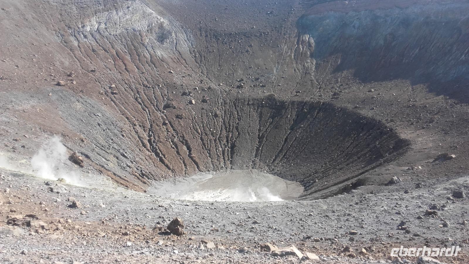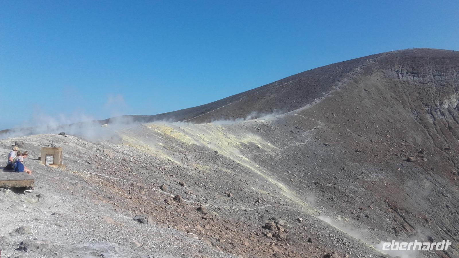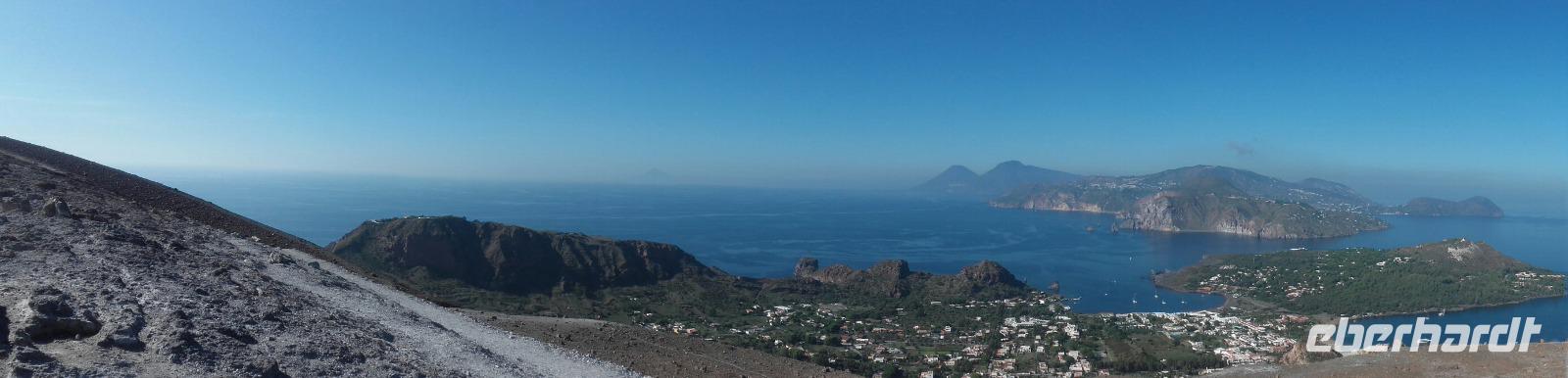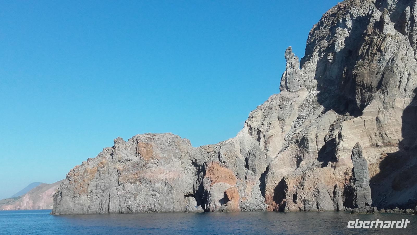 Heute steht die Überfährt auf die Liparischen Inseln auf dem Programm. Dies betrifft die Hauptinsel Lipari und die etwas kleinere Vulkaninsel Vulcano. Unser Reisetag beginnt nach dem reichhaltigen Frühstück im Hotel und führt uns, dank unserem Busfahrer Gaetano, erst einmal zur Hafenpromenade der Stadt. Hier steigen wir auf ein kleines Tourboot um und fahren nach kurzer Wartezeit aus dem Hafen Milazzos aus. An Board treffen wir auch auf die Gruppen der anderen Eberhardt Reisenden. Langsam verschwindet der Hafen Milazzos hinter uns und wir können aufgrund der sehr klaren Sicht die Gebirge bis zum qualmenden Ätna heraufschauen. Als wir an der Küste Vulcanos vorbeifahren, sehen wir fantastische Felsformationen, wie die Pferdegruft oder den Löwenkopf. Auch entlang Liparis erhalten wir Wissen zu den speziellen Felsformationen, wie der des thronenden Papstes und einer Mumie. Kurz darauf erreichen wir den Hafen von Lipari. Nun geht es, unter der Führung von Enza, weiter den Hafen und die knallbunten Einkaufsstraßen entlang, zum Verkehrshafen der Stadt, um einer kleinen Inselrundfahrt beizuwohnen. Enza zeigt uns dabei auch den sicheren Rückweg in den Hafen, in welchem unser Tourboot wieder auf uns warten würde. Mit einem familiären Kleinbus geht es die Berge Liparis entlang und Enza vermittelt uns auf dem Weg das Verwaltungssystem Liparis, bevor wir einen Fotostopp erreichen, von welchem es möglich ist, die Berg- und Küstenregionen Liparis und Vulcanos, bis hin zum qualmenden Ätna zu sehen. Wie aktiv sind die Vulkane der Inseln und wie gingen die Einwohner mit der bedrohlichen Situation um? Enza erzählt uns hierüber auf der Weiterfahrt, sowie über den regionalen Kapernanbau und die Obsidian- und Bimsverarbeitung. Die kurze Reise führt uns an bewachsenen Bimsfelsen und natürlichen Obsidianeinschlüssen, entlang der tiefblauen Küste, zu einem kleinen Canyon und veralteter Industrierückständen. Wieder angekommen in Lipari, dürfen wir die größte Stadt der Liparischen Inseln nun selbst erkunden, einkaufen oder die heimischen Kapern probieren. Nach dem Stadtbummel, geht es dann weiter nach Vulcano, die Insel, welche besonders markant durch ihren ständig rauchenden Vulkan auffällt. Auf Vulcano haben wir Freizeit und können somit der Insel nach unseren Wünschen nachfühlen, indem wir in den einzigartigen Schwefelquellen baden, den pechschwarzen Sandstrand aufsuchen, die Natur erkunden, einkaufen, örtliche Spezialitäten genießen oder uns die Zeit nehmen den örtlichen Vulcano zu erklimmen. Ich nutze die Freizeit, um den Vulcano zu besteigen. Der Weg ist recht steil und durchaus sehr intensiv, doch der Ausblick von dem über 400 m hohen, rauchenden Vulkan war unbeschreiblich und ermöglicht die Sicht auf 4 weitere der 7 Liparischen Inseln. Anschließend geht es am Nachmittag wieder zurück nach Milazzo, in welchem schon unser Bus wartet, um uns wieder zum Hotel zu bringen. In der Unterkunft angekommen, können wir über unsere Zeit frei verfügen, bis man sich wieder um 19:30 Uhr zum gemeinsamen Abendessen trifft.