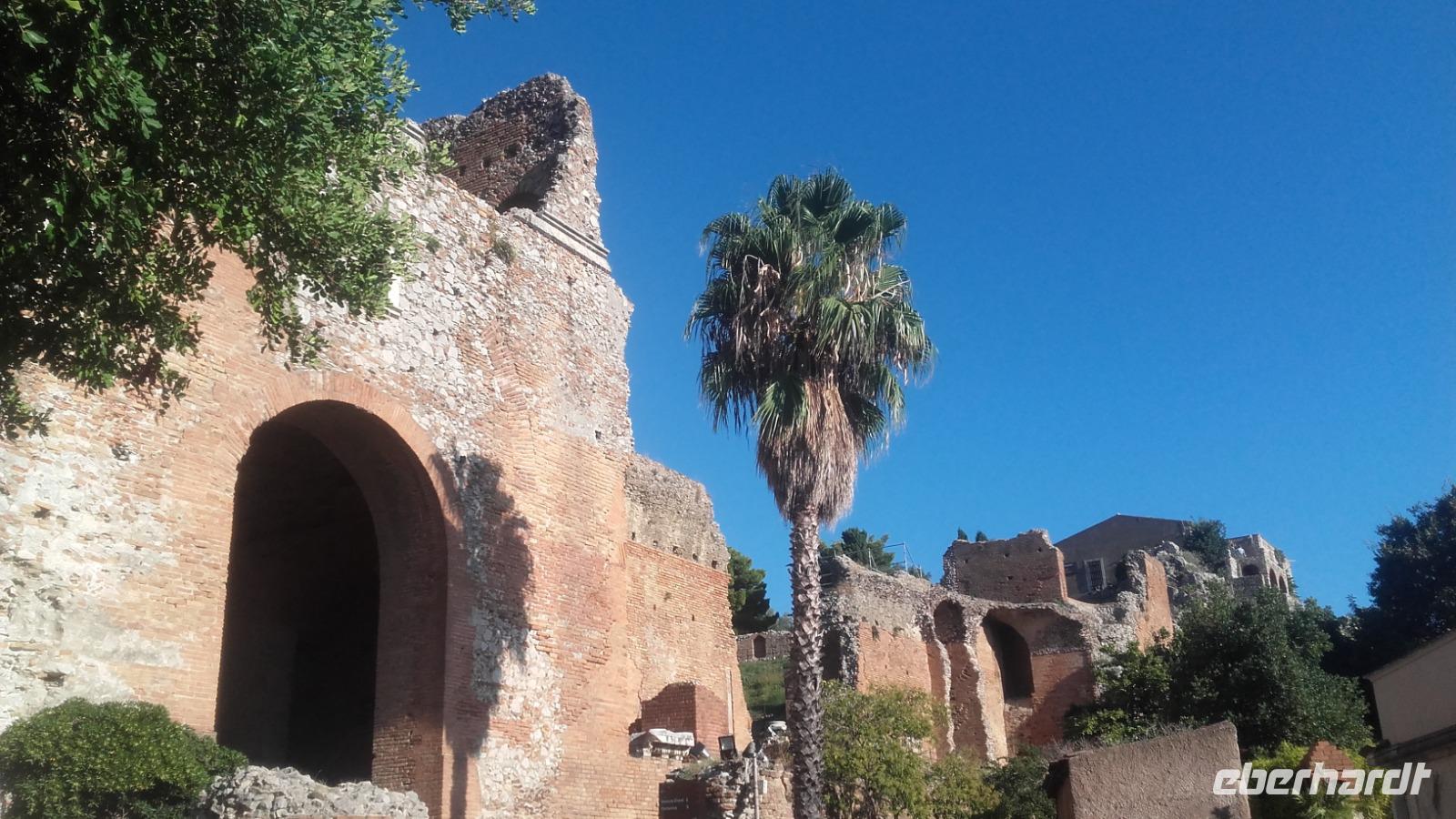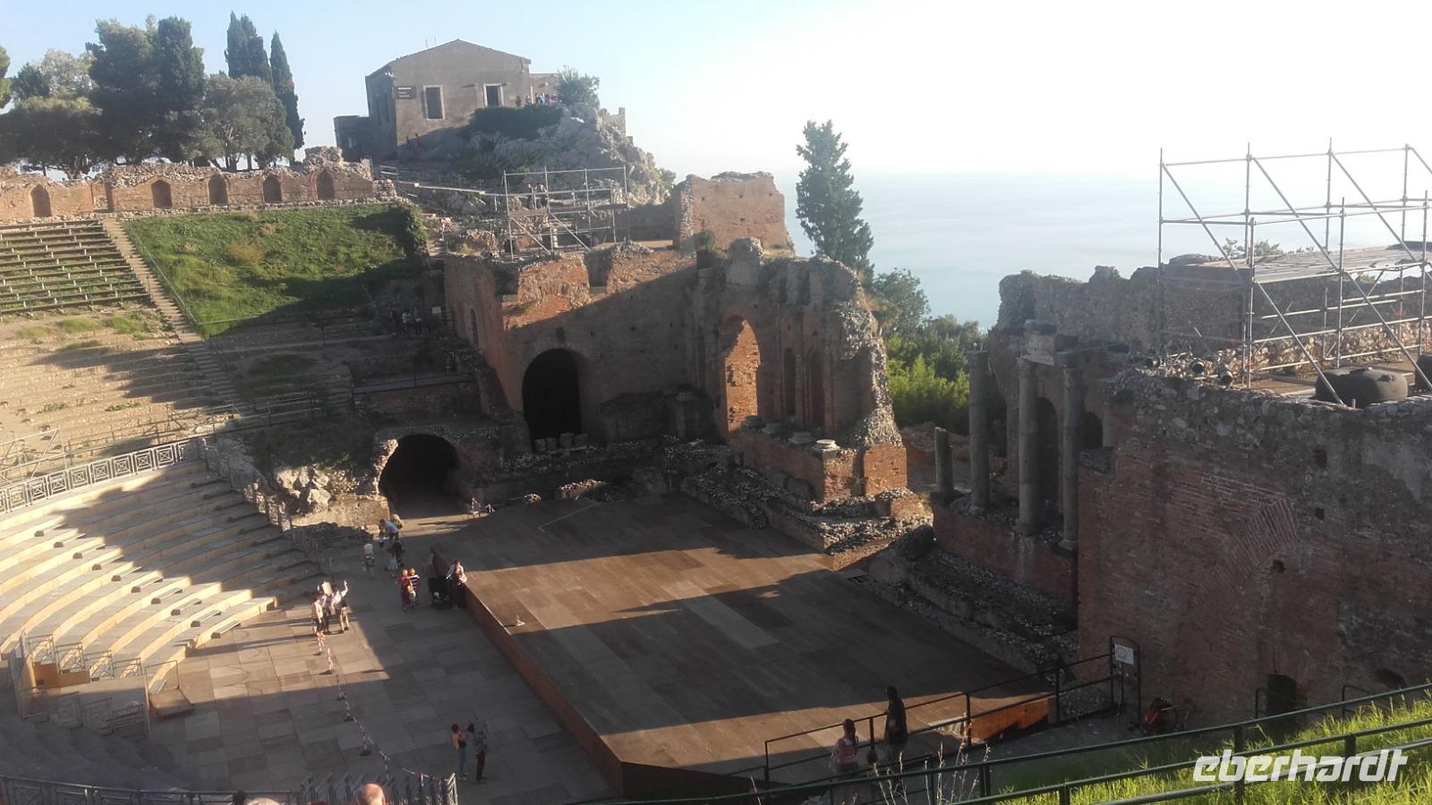 Wir durchqueren auf der Hinfahrt mehrere kleine Städte und Enza erzählt uns deren Geschichte und Besonderheiten, bevor wir 16:00 Uhr über die zahlreichen Serpentinen, mit ästhetischem Blick auf das Meer, Taormina erreichen. Nach einem kleinen Fußmarsch gelangen wir an das Stadttor und gehen vor hier zu unserem festgelegten Treffpunkt zum griechisch-römischen Theater der Stadt. Wir besichtigen dieses beeindruckende Bauwerk, während uns Enza über die Theatereigenschaften der Römer und Griechen erzählt. Auch zeigt Sie uns, wie es gebaut wurde und welche der Bauarten römisch und griechisch sind, wie es benutzt wurde und heute noch für zahlreiche Events wie Konzerte, Theater und Kino zur Verfügung steht.